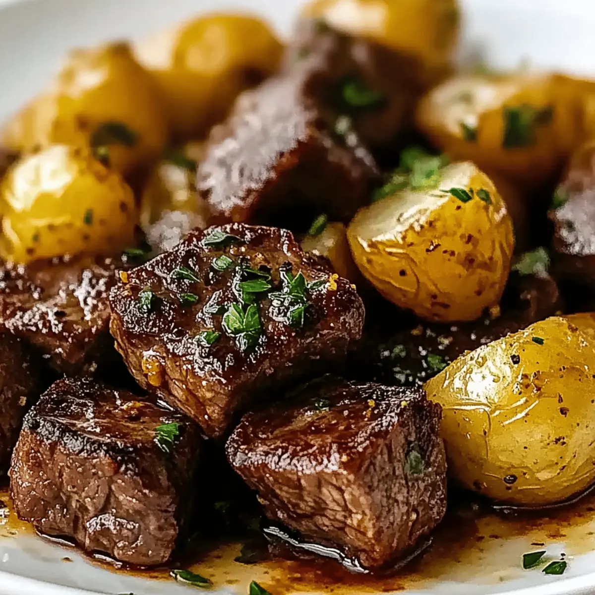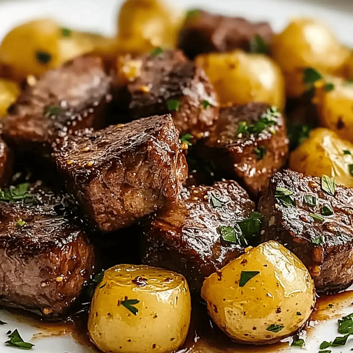 Jump to Recipe Print RecipeThe sizzle of steak meeting a hot skillet is one of life’s little joys. If you’re on the hunt for a dinner that packs a punch without draining your time, then look no further than these Garlic Butter Steak Bites and Potatoes! This dish is a true crowd-pleaser that takes minimal effort and turns it into maximum flavor, making it ideal for quick weeknight meals or special occasions alike. With tender steak and crispy potatoes bathed in a rich garlic butter sauce, you’ll serve up a plate that disappears faster than you can say “seconds, please!” And guess what? There are even adaptable options for those looking to cater to different diets. Intrigued? Let’s dive into the details and get cooking! Why are Garlic Butter Steak Bites irresistible? Easy and Quick: This recipe transforms dinner into a breeze, taking only 30 minutes to prepare, making it perfect for busy weeknights. Flavor Explosion: The garlic butter sauce elevates the dish with a luscious richness that complements the satisfying crunch of crispy potatoes. Crowd-Pleaser: Whether you’re cooking for family or friends, this dish impresses everyone, ensuring that no plate goes back to the kitchen untouched. Versatile Options: With the ability to swap ingredients, you can easily customize it to suit various dietary needs, just like our Garlic Butter Steak or Indian Butter Chicken. Gourmet Feel: Serve it with a fresh salad or crusty bread, and you’ll have a meal that feels fancy without the fuss! Garlic Butter Steak Bites and Potatoes Ingredients For the Steak Bites Steak (Sirloin or Ribeye) – Choose ribeye for an extra boost of flavor; it delivers delicious tenderness. Garlic – Freshly minced for the best flavor impact; you can substitute garlic powder in a pinch. For the Potatoes Baby Potatoes – Their thin skin means no peeling is needed, offering both ease and delightful texture. Olive Oil – Use this to achieve the perfect crispness while preventing the potatoes from sticking. Salt & Pepper – Essential for seasoning; these basic elements bring out the rich flavors of the steak bites and potatoes. Dried Rosemary and Thyme – These herbs add aromatic depth and complement the garlic butter beautifully. For the Garlic Butter Sauce Butter – Provides richness and decadence; vegan butter or olive oil can be used for a lighter alternative. Fresh Parsley – Sprinkle this on top for a burst of freshness and a pop of color. Step‑by‑Step Instructions for Garlic Butter Steak Bites and Potatoes Step 1: Preheat and Prepare Start by heating a large skillet over medium heat. Add 1 tablespoon of butter along with a splash of olive oil to prevent sticking. Allow the butter to melt and begin to bubble, creating a flavorful base for your Garlic Butter Steak Bites and Potatoes. This combination will add richness and help achieve a beautiful golden finish on the potatoes. Step 2: Cook the Potatoes Once the skillet is hot, toss in the diced baby potatoes, ensuring they’re evenly spaced. Sprinkle them with salt, pepper, and a sprinkle of dried rosemary and thyme for a burst of flavor. Allow the potatoes to cook undisturbed for about 10-12 minutes, stirring occasionally. You’ll know they’re ready when they’ve turned golden and are fork-tender, showcasing that delicious crispy exterior. Step 3: Set Potatoes Aside After cooking the potatoes, carefully remove them from the skillet and transfer them to a warm plate to keep cozy. This will prevent them from getting cold while you focus on searing the steak bites. The skillet will still be warm and ready for the next step—where the real magic happens with the steak! Step 4: Sear the Steak Bites In the same skillet, add the remaining tablespoon of butter and let it melt for a moment. Once bubbling, add your steak bites in a single layer, ensuring they aren’t overcrowded. Sear them for about 2-3 minutes on each side until they achieve a beautiful crust. Look for a rich brown color that signals they’re seared to perfection for your Garlic Butter Steak Bites. Step 5: Flavor with Garlic Once the steak bites are seared, remove them from the skillet and lower the heat slightly. Add the remaining butter and the minced garlic to the pan, stirring quickly for about 1 minute until fragrant but not burnt. This flavorful garlic infusion will elevate your dish and create the perfect sauce to coat the steak and potatoes in the next step. Step 6: Combine and Serve Return the seared steak bites and the warm potatoes to the skillet, tossing to coat them in the luscious garlic butter sauce. Stir gently for a minute to combine all flavors. Once everything is well coated, turn off the heat and garnish generously with fresh parsley for a pop of color and freshness. Your Garlic Butter Steak Bites and Potatoes are now ready to serve! What to Serve with Garlic Butter Steak Bites and Potatoes Elevate your meal with tantalizing sides that perfectly complement the rich, savory flavors of steak bites and crispy potatoes. Creamy Mac and Cheese: This indulgent side adds a velvety texture that contrasts beautifully with the juicy steak and crunchy potatoes. Garlic Green Beans: Sautéed green beans tossed in garlic maintain a fresh and crisp taste, providing a lovely balance to the richness of the garlic butter sauce. Crisp Caesar Salad: A Caesar salad with crunchy romaine and creamy dressing adds a refreshing element, cutting through the savory richness of the main dish. Buttery Corn on the Cob: Sweet corn brushed with melted butter is a delightful summer side, bringing both sweetness and crunch to your plate. Herb-Infused Rice: Fluffy rice seasoned with fresh herbs enhances the meal’s flavor profile and absorbs the delicious garlic butter sauce perfectly. Roasted Brussels Sprouts: These crispy sprouts, seasoned with olive oil and balsamic vinegar, add a hint of bitterness that complements the dish’s savory notes. Sparkling Lemonade: This crisp, refreshing drink is the 