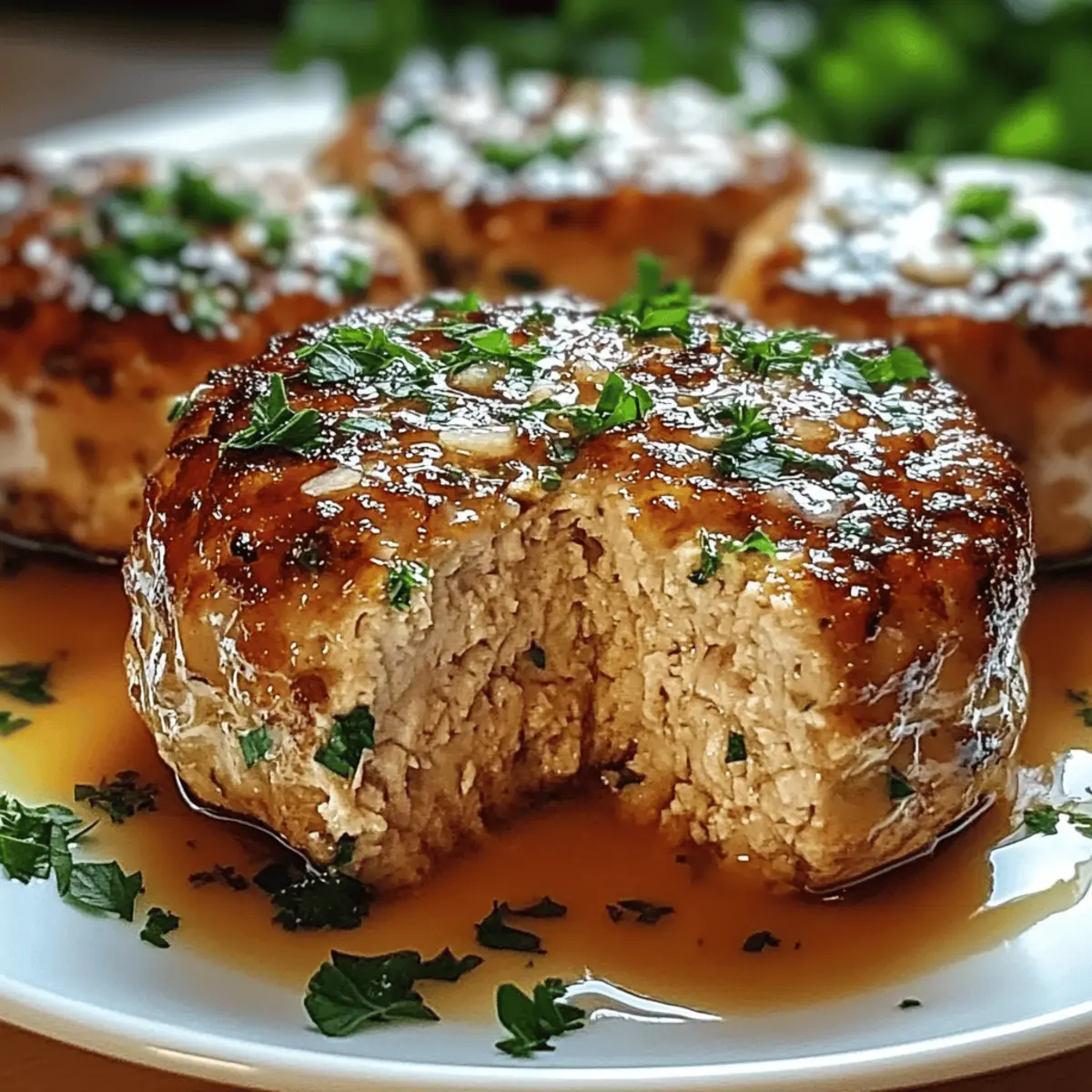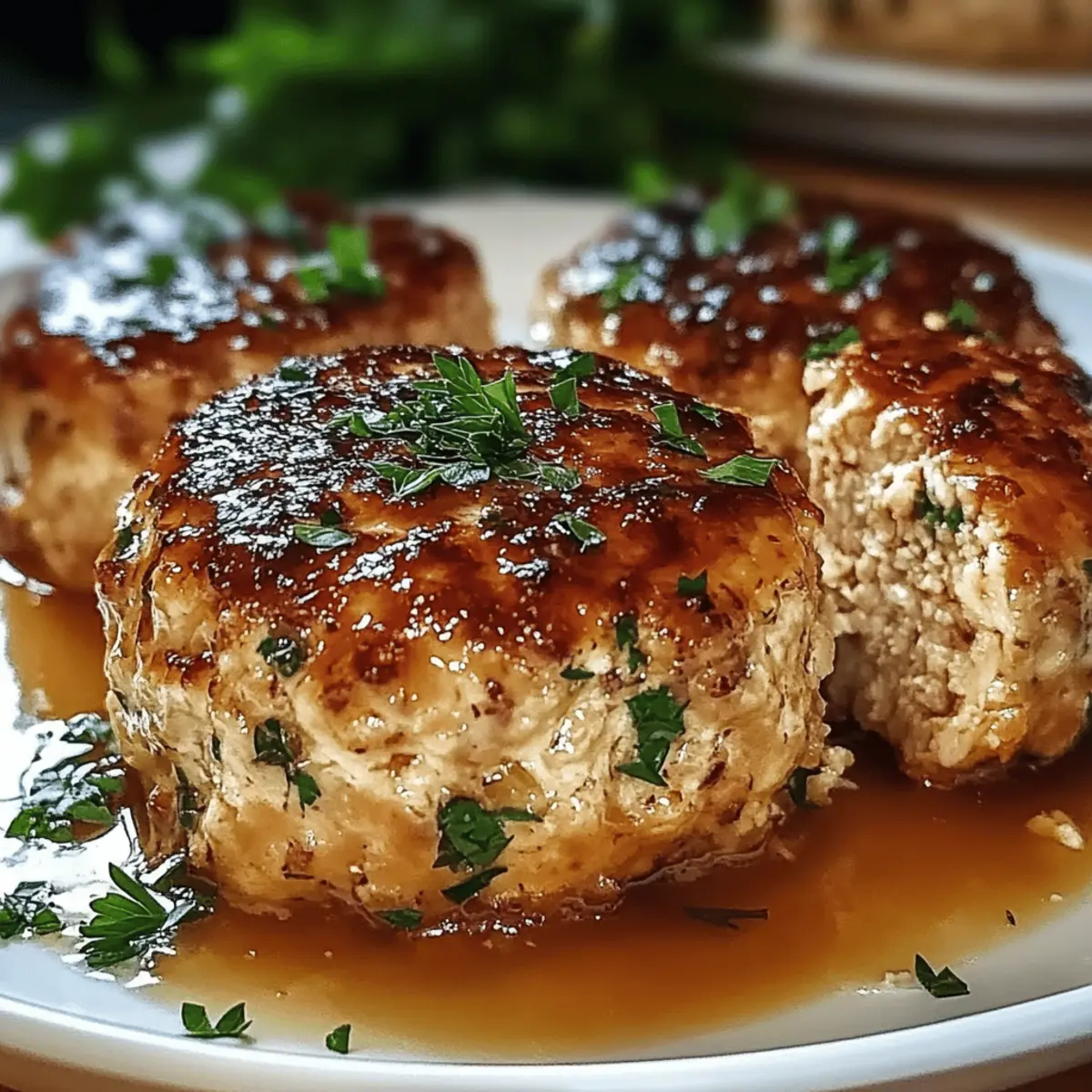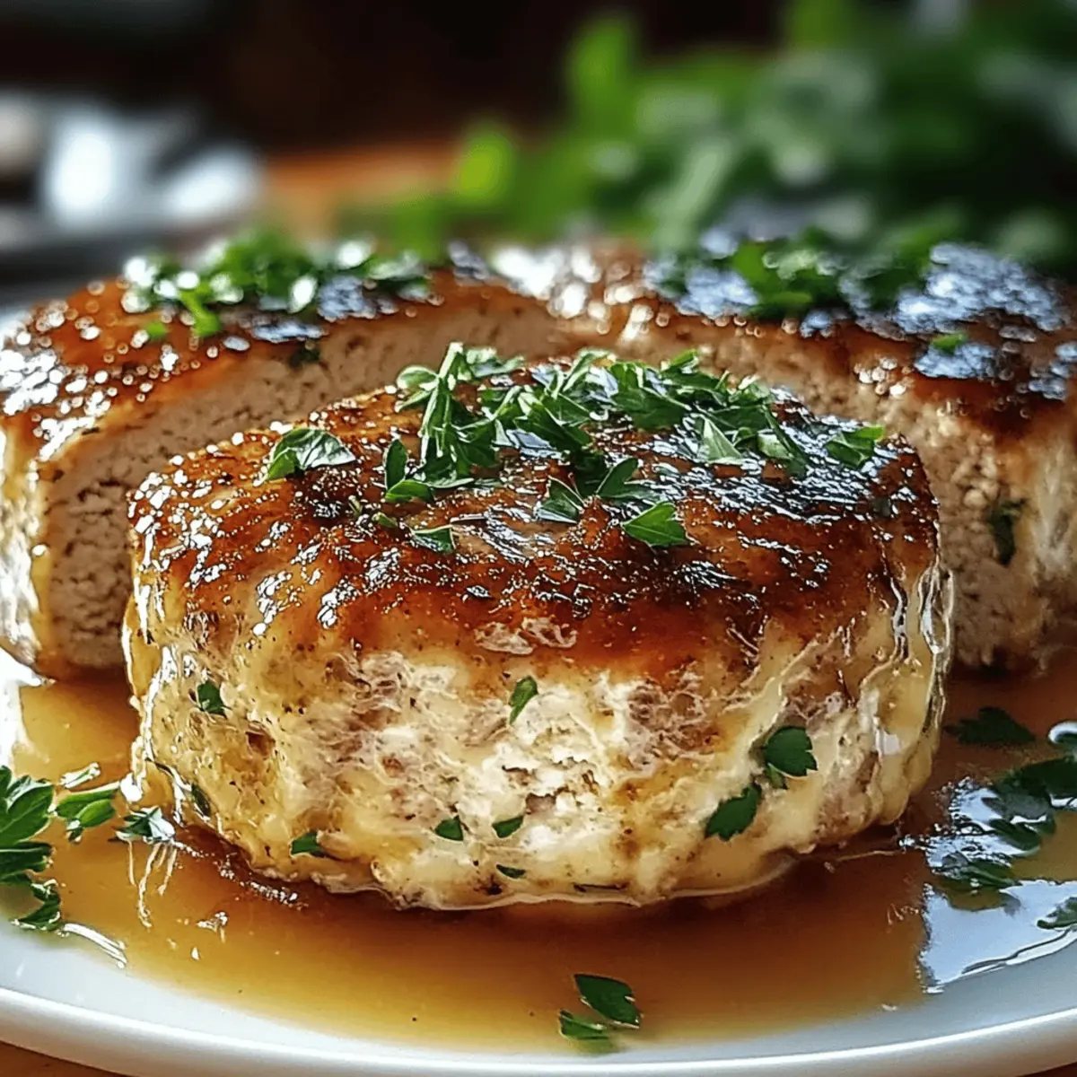 Jump to Recipe Print RecipeAs the enticing aroma of garlic wafts through my kitchen, I can’t help but feel a wave of nostalgia wash over me. This Garlic Parmesan Chicken Meatloaf is my modern twist on the iconic comfort dish; think of it as your family’s new favorite weeknight treat! With a tender, juicy interior paired with the irresistible flavors of garlic and Parmesan, this recipe is not only easy to whip up but also packed with protein to keep everyone satisfied. It’s the kind of meal that turns dinner into a cozy gathering, with seconds eagerly requested. Ready to impress your loved ones at the dinner table with a delightful recipe that’s both comforting and wholesome? Let’s get started! Why is this meatloaf so special? Comfort food redefined: This Garlic Parmesan Chicken Meatloaf takes a classic dish to new heights with its mouthwatering garlic and cheese infusion. Family-friendly delight: With high protein and tender texture, it’s a dish everyone will love, making dinner time stress-free! Customizable creativity: Try mini meatloaves or stuffed peppers for an exciting twist, just like my Garlic Parmesan Cheeseburger. Quick prep: Get it ready in no time for an easy weeknight dinner that doesn’t sacrifice flavor or quality. Leftover bliss: It stores well, ensuring delicious lunches throughout the week – you’ll find it just as tasty the next day! Garlic Parmesan Chicken Meatloaf Ingredients • For the Meatloaf Ground Chicken – This lean protein forms the delicious base; you could also use ground turkey for a lighter option. Panko Bread Crumbs – These provide a great texture and moisture; if unavailable, opt for regular breadcrumbs but expect a denser result. Parmesan Cheese – Adds a savory kick; for a sharper taste, you can substitute with grated Pecorino Romano. Milk – Keeps the meatloaf moist; any milk variation will work, including almond milk for a dairy-free choice. Eggs – Essential for binding the meatloaf together without making it dense. Garlic (minced) – The star ingredient; fresh garlic infuses fantastic flavor into every bite. Olive Oil – Used to sauté the garlic, adding richness; feel free to swap with canola oil or any neutral oil. Dried Italian Seasoning – This blend of herbs elevates flavor; consider fresh herbs for a fresher taste. Salt and Black Pepper – Fundamental seasonings; always adjust according to your taste preferences. Fresh Parsley (chopped) – Brings a pop of freshness and color; basil or cilantro can work as tasty alternatives. Chicken Broth – Enhances moisture during baking; for a vegetarian option, opt for vegetable broth. Butter (melted) – For the garlic topping, it adds flavor and moisture to the top layer. Garlic Powder – Compliments fresh garlic in the mix, turning up the garlic goodness. This Garlic Parmesan Chicken Meatloaf is not just a meal; it’s a family gathering in a dish—comfort food redefined! Enjoy creating this delightful recipe right in your kitchen. Step‑by‑Step Instructions for Garlic Parmesan Chicken Meatloaf Step 1: Prepare Your Ingredients Start by gathering all the ingredients for the Garlic Parmesan Chicken Meatloaf. Chop fresh parsley, mince garlic, and ensure your ground chicken is ready. Preheat your oven to 350°F (175°C) and grease a loaf pan with a touch of olive oil or cooking spray for easy removal later on. Step 2: Whisk Wet Ingredients In a large mixing bowl, whisk together the milk and lightly beaten eggs. This mixture will bind the meatloaf, so mix well until fully combined. It should form a smooth liquid base that will blend perfectly with the dry ingredients in the next step. Step 3: Add Dry Ingredients Into the bowl with your wet ingredients, mix in the panko bread crumbs, Parmesan cheese, dried Italian seasoning, salt, and black pepper. Stir everything together until well combined, ensuring an even distribution of flavors and textures throughout the Garlic Parmesan Chicken Meatloaf mixture. Step 4: Sauté the Garlic In a small skillet, heat olive oil over medium heat. Add the minced garlic and sauté for about 1-2 minutes, or until it becomes fragrant and slightly golden. This step enhances the garlic’s flavor, setting a delicious base for your meatloaf mix. Step 5: Incorporate Garlic and Parsley Once the garlic is sautéed, add it to the mixing bowl along with the chopped parsley. Stir gently to incorporate these fresh flavors into the meatloaf mixture, making sure that the garlic and parsley are evenly distributed for maximum taste in each bite. Step 6: Add Ground Chicken Gently fold in the ground chicken into the mixture. Be careful not to overmix, as this can result in a tough meatloaf. Mix just until everything is combined, ensuring the chicken, bread crumbs, and flavorings are evenly dispersed. Step 7: Complete the Meatloaf Shape Transfer the combined mixture into your prepared loaf pan, using a spatula to evenly distribute it. Shape the mixture so it has a smooth top and evenly fills the pan, ensuring a uniform cook and that it slices beautifully later on. Step 8: Prepare the Garlic Topping In a small bowl, mix the melted butter with garlic powder. This will serve as a tasty topping for your meatloaf. Brush this mixture generously over the top of the meatloaf to enhance its flavor and ensure a golden crust during baking. Step 9: Brush and Add Broth After applying the garlic butter, sprinkle additional Parmesan cheese on top of the meatloaf for a savory finish. Carefully pour chicken broth around the edges of the meatloaf in the pan—this helps keep it moist during the cooking process. Step 10: Bake to Perfection Place the loaf pan in the preheated oven and bake for about 60-70 minutes. The meatloaf is done when it reaches an internal temperature of 165°F (74°C), and its surface should appear nicely browned. Keep an eye on it towards the end for perfect doneness. Step 11: Rest and Slice Once baked, remove the Garlic Parmesan Chicken Meatloaf from the 
