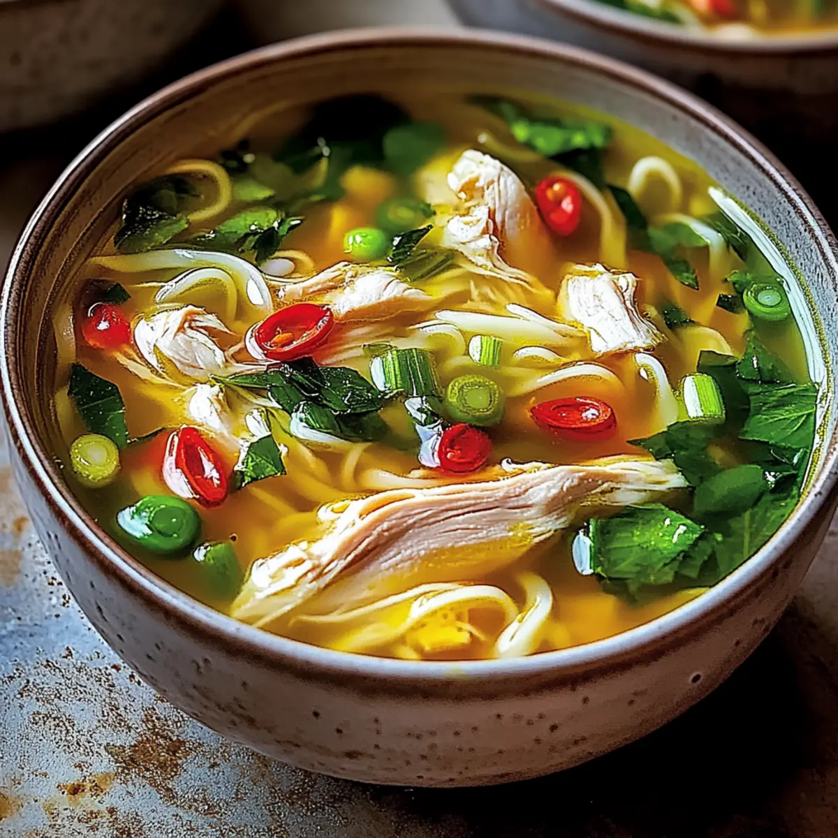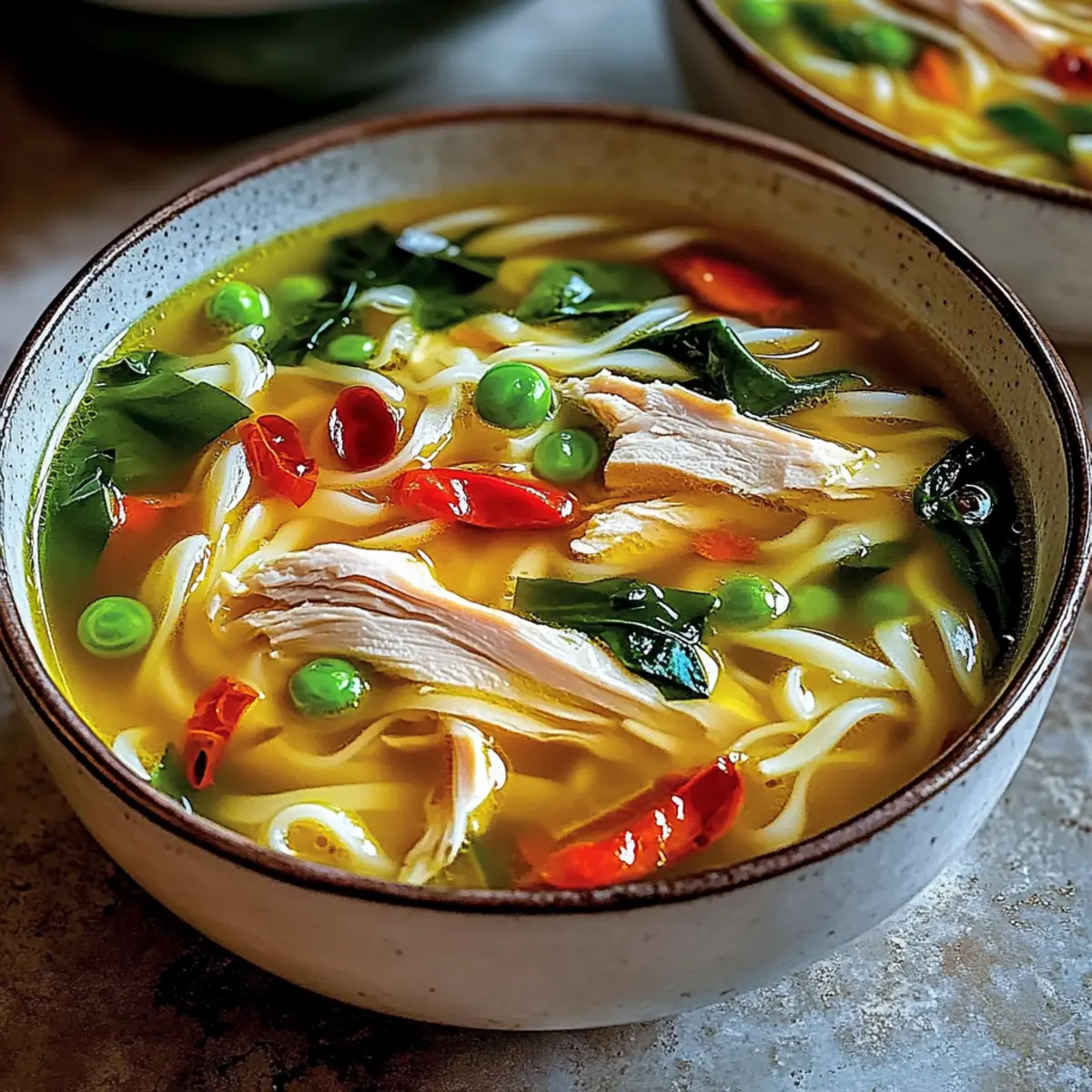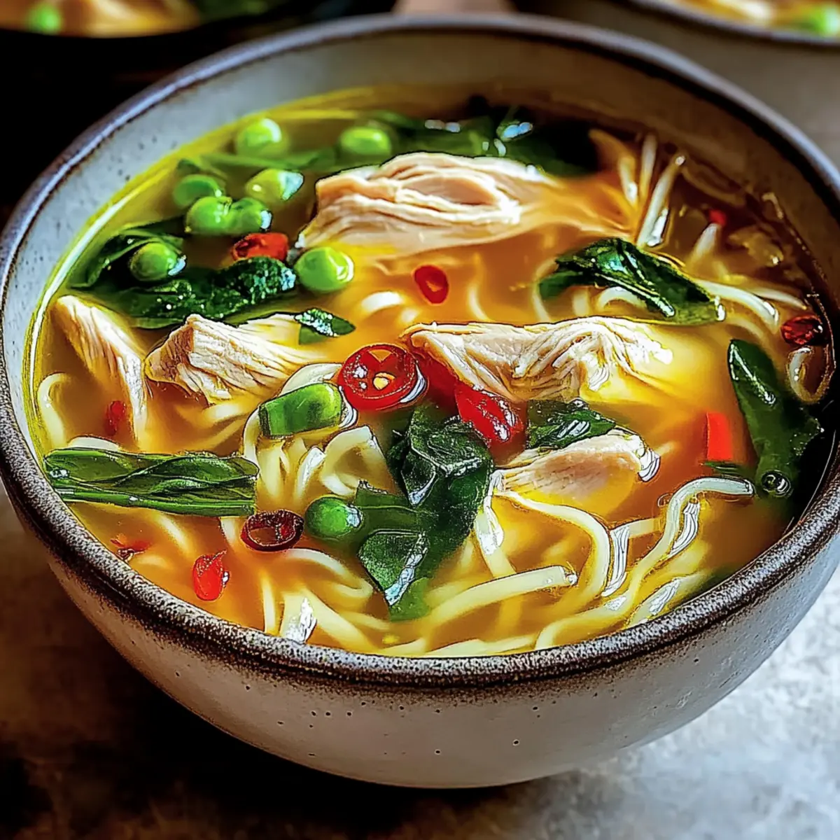 Jump to Recipe Print RecipeAs the chilly air wraps around my home, I often find myself craving something warm, comforting, and quick to prepare. That’s when my Ginger Garlic Chicken Noodle Soup comes to the rescue—like a cozy hug in a bowl! This delightful recipe combines tender chicken, hearty noodles, and colorful vegetables, all infused with the zesty goodness of ginger and garlic. Not only is it a super quick meal to whip up on busy evenings, but it also delivers a nourishing blend that makes you feel oh-so-good inside. With every spoonful, you’re treated to a moment of comfort that’s perfect for chasing away the dreary day. Ready to dive into a bowl of warmth? Let’s get cooking! Why Is This Soup So Comforting? Warm, Cozy Vibes: The Ginger Garlic Chicken Noodle Soup embraces you like your favorite throw blanket on a chilly night. Quick and Easy: With just a handful of ingredients and simple steps, you can have a delicious homemade meal ready in no time—perfect for busy weeknights! Bold Flavors: The aromatic ginger and garlic not only provide warmth but also elevate the taste, making every spoonful exciting and flavorful. Nourishing Goodness: Packed with protein, vibrant vegetables, and wholesome noodles, this soup ensures you delight in both comfort and nutrition. Versatile Inspirations: Feel free to explore different proteins like shrimp or tofu, or throw in veggies you love. Just like my Garlic Butter Steak or Bbq Chicken Sweet, the possibilities are endless! Crowd-Pleasing Favorite: Whether you’re serving family or a group of friends, this soup is bound to warm hearts and satisfy appetites. Ginger Garlic Chicken Noodle Soup Ingredients For the Soup Base • Vegetable Oil – Ideal for sautéing; you can substitute it with olive oil for a different flavor profile. • Boneless, Skinless Chicken Breast – Provides protein and heartiness; feel free to use tofu for a vegetarian alternative. • Chicken Broth – The flavorful foundation of the soup; vegetable broth works well for a vegetarian option. • Water – Used to adjust the soup’s consistency; use less for a richer, thicker broth. For the Aromatics • Fresh Ginger – Adds a warm, spicy depth; ground ginger can be used, just cut back on the amount. • Garlic Cloves – Elevates the flavor profile; garlic powder is a quick substitute, but use half the amount. • Medium Onion – Provides sweetness and depth; shallots are a lovely alternative. For the Vegetables • Carrots – Sweet and vibrant, adding color; parsnips are a great substitute if desired. • Bell Pepper – Brings a crunchy texture and extra flavor; any color can be used, or omit for simplicity. • Bok Choy or Spinach – For a fresh, nutritional boost; kale or Swiss chard also make excellent substitutes. For the Noodles and Garnish • Egg Noodles or Rice Noodles – Your main source of carbs; opt for gluten-free noodles if needed. • Green Onions – Adds freshness when garnished on top; replace with parsley or cilantro if preferred. • Salt and Pepper – For seasoning; always adjust to taste once your soup is cooked. Make sure to gather all these ingredients for a delightful bowl of Ginger Garlic Chicken Noodle Soup that will warm your soul! Step‑by‑Step Instructions for Ginger Garlic Chicken Noodle Soup Step 1: Heat Oil In a large pot or Dutch oven, heat 2 tablespoons of vegetable oil over medium heat until shimmering. This should take about 2 minutes. The oil will be ready when it starts to glisten. Step 2: Cook Chicken Add 1 pound of sliced boneless, skinless chicken breast to the hot oil. Season with salt and pepper as desired. Sauté the chicken for about 5-7 minutes, stirring occasionally, until the pieces are golden brown and fully cooked through. Step 3: Sauté Aromatics Once the chicken is cooked, add 1 diced medium onion, 4 minced garlic cloves, and 1 tablespoon of freshly grated ginger to the pot. Stir for about 2-3 minutes, cooking until the mixture is fragrant and the onion becomes translucent, imparting a lovely aroma to your Ginger Garlic Chicken Noodle Soup. Step 4: Add Liquid Pour in 4 cups of chicken broth and 2 cups of water, stirring as you do. Increase the heat to high and bring the mixture to a gentle boil. This should take about 3-4 minutes. The steam and bubbling surface are signs that your base is ready for the next step. Step 5: Incorporate Vegetables Add 2 sliced carrots and 1 diced bell pepper to the pot. Reduce the heat to medium and allow them to simmer for approximately 5 minutes, or until they become tender. The carrots should be vibrant in color and fork-tender to ensure a lovely texture in your soup. Step 6: Add Noodles Stir in 8 ounces of egg noodles or rice noodles, ensuring they are evenly distributed in the broth. Cook according to the package instructions, which typically takes 5-7 minutes. You’ll want the noodles to be chewy but tender, soaking up all that delicious flavor from the soup. Step 7: Finish with Greens When the noodles are almost done, gently fold in 4 cups of chopped bok choy or spinach, allowing them to wilt for about 2 minutes. The greens should be bright and tender but not overcooked, adding a beautiful pop of color and freshness to your Ginger Garlic Chicken Noodle Soup. Step 8: Taste and Adjust Before serving, taste your soup and adjust the seasoning with additional salt and pepper to suit your preference. This step is crucial to enhancing the flavors of the chicken, vegetables, and broth, ensuring a delicious meal. Step 9: Serve Hot Ladle the hot soup into bowls, garnishing each serving with chopped green onions for added freshness and color. Serve your comforting Ginger Garlic Chicken Noodle Soup immediately for a warm, nourishing meal that embodies cozy nights in. What to Serve with Ginger Garlic Chicken Noodle Soup Pairing your soup with the right sides creates a fulfilling meal experience that delights the senses. Crusty Bread: The perfect companion for dipping, its t