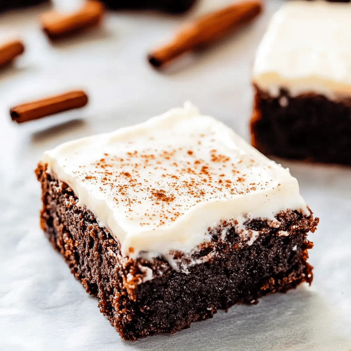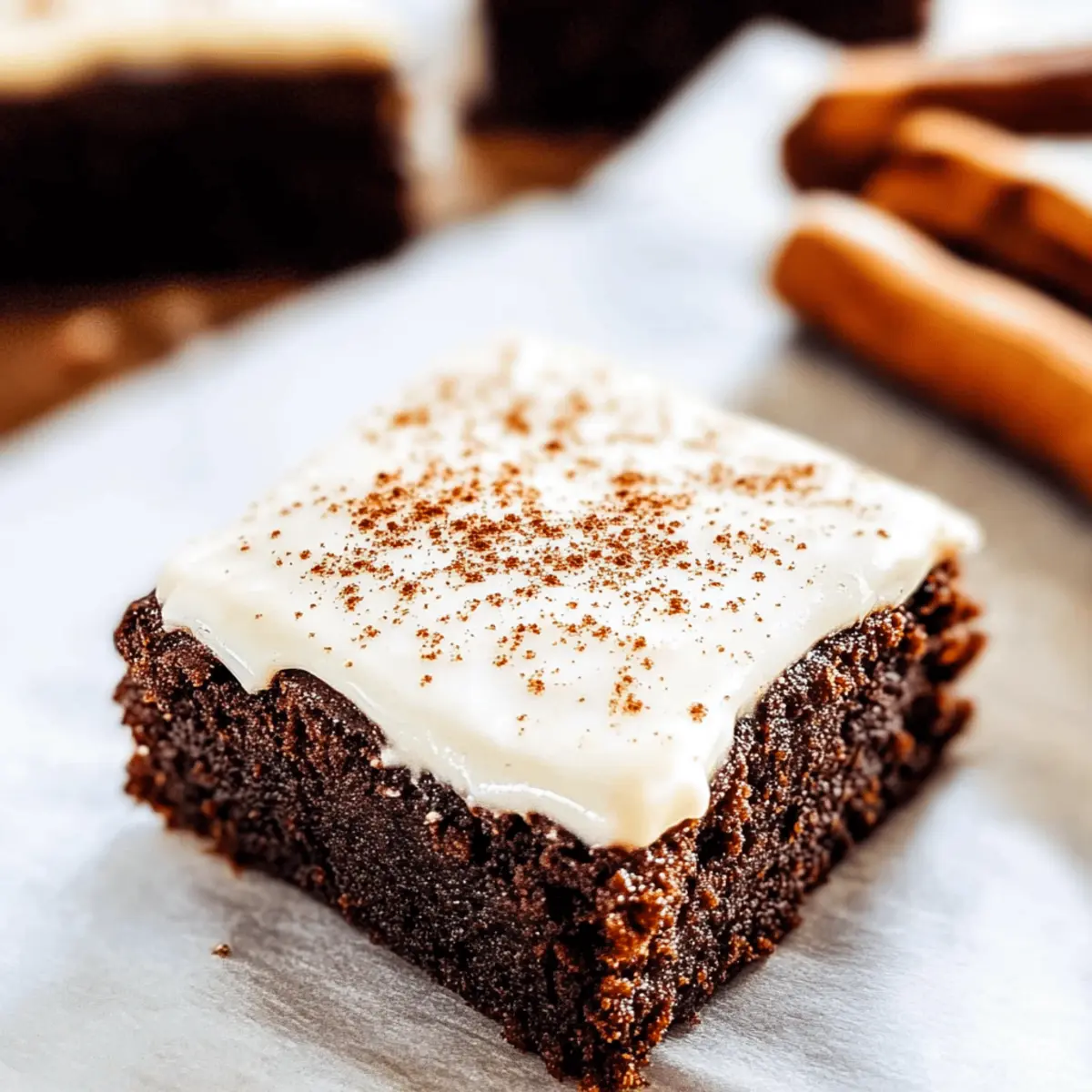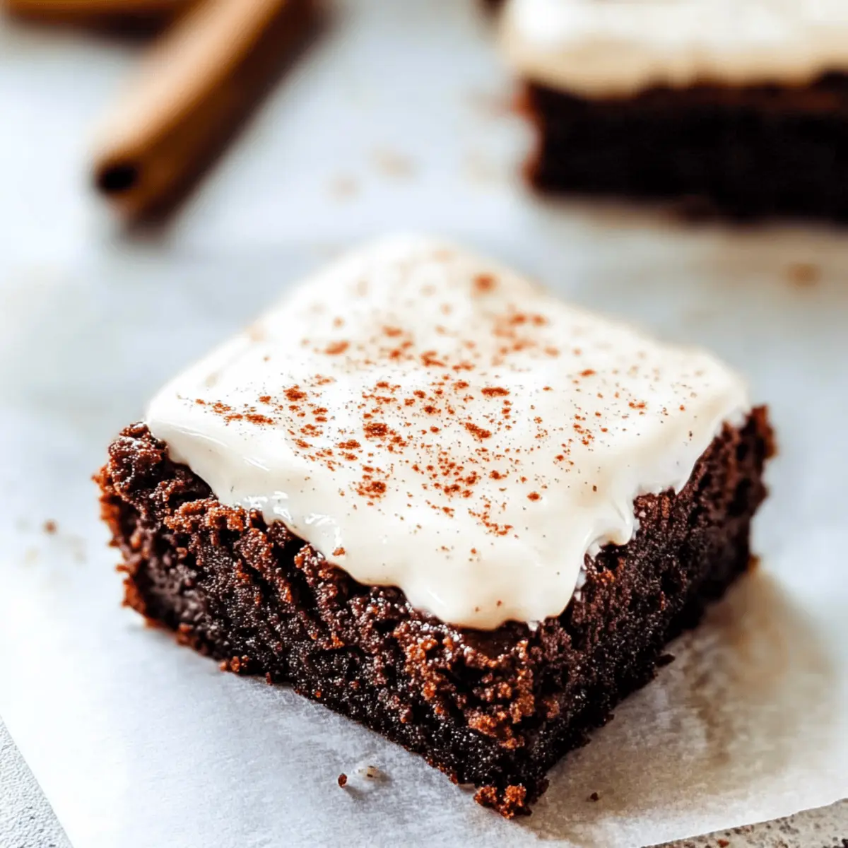 Jump to Recipe Print RecipeAs the scent of cinnamon and ginger wafts through my kitchen, I can’t help but smile, knowing the magic that’s about to happen. These Chewy Gingerbread Brownies with Eggnog Cream Cheese Frosting are my go-to whenever the holiday spirit strikes! With an effortless prep and a lush, chewy consistency, this recipe makes the perfect alternative to traditional cookies—ideal for those festive gatherings or cozy nights in. The addition of crystallized ginger elevates the warmth of spices, while the velvety eggnog frosting adds a creamy twist that’s simply irresistible. Trust me, this dessert will not only delight your taste buds but also make you the star of any holiday celebration. Curious about how to bring this deliciousness to your table? Let’s dive in! Why Are These Brownies So Special? Irresistible Flavor: The blend of warm spices and rich chocolate creates a unique taste experience perfect for the holidays. Effortless Preparation: With minimal steps, it’s easier than baking traditional cookies, making it a go-to for busy hosts. Unique Texture: Moist and chewy, the brownies offer a delightful contrast to the creamy Eggnog Cream Cheese Frosting. Make-Ahead Friendly: Prepare these brownies in advance, letting the flavors develop overnight for a more delicious treat. Crowd-Pleasing Appeal: They’re a guaranteed hit at any gathering, perfect for sharing or gifting, just like my Lemon Raspberry Cookies. Once you try these Gingerbread Brownies with Eggnog Frosting, they’ll become your holiday must-have! Gingerbread Brownies with Eggnog Frosting Ingredients • Let’s gather everything you need to make these delightful Gingerbread Brownies with Eggnog Frosting! For the Brownies Semisweet Chocolate – Adds rich flavor and moist texture; dark chocolate can deepen the taste. Unsalted Butter – Provides richness; margarine serves as a dairy-free alternative. All-purpose Flour – Gives structure; swap for gluten-free flour for a gluten-free version. Unsweetened Cocoa Powder – Enhances chocolate flavor; Dutch-processed offers a smoother profile. Ground Spices (Cinnamon, Ground Ginger, Ground Nutmeg, Ground Cloves) – Infuses warmth; adjust to match your spice preference. Baking Powder & Baking Soda – Key for rising; double-check freshness for best results. Eggs – Ensure structure and moisture; flax eggs work well for a vegan choice. Light Brown Sugar – Contributes sweetness and moisture; granulated sugar can be used but changes texture. Molasses – Essential for that gingerbread flavor; dark corn syrup makes a sweet substitute. Crystallized Ginger – Adds spicy sweetness and chewiness; reduce for a milder taste or swap for ground ginger. Vanilla Extract – Enhances overall flavor; opt for pure extract for maximum impact. For the Eggnog Cream Cheese Frosting Cream Cheese – Forms the frosting base, adding creaminess; vegan alternatives are available. Powdered Sugar – Sweetens the frosting; can reduce or use coconut sugar for a lighter option. Eggnog – Infuses festive flavor; milk or dairy-free options can change the flavor profile slightly. Ground Nutmeg – Adds an extra holiday touch; sprinkle on top for added flair. Now that you have your ingredients ready, get excited to create these delightful Gingerbread Brownies with Eggnog Frosting! Step‑by‑Step Instructions for Gingerbread Brownies with Eggnog Frosting Step 1: Preheat and Prepare Pan Begin by preheating your oven to 350°F (175°C). While it’s warming up, grease a 9×13-inch baking pan with butter or line it with parchment paper for easy removal later. This will ensure your Gingerbread Brownies bake evenly and slide out of the pan effortlessly when they’re ready. Step 2: Melt Chocolate and Butter In a medium saucepan over low heat, combine the semisweet chocolate and unsalted butter. Stir continuously until the mixture is completely melted and smooth, taking about 5-7 minutes. Once melted, remove from heat and let it cool slightly while you gather your dry ingredients. Step 3: Mix Dry Ingredients In a separate large bowl, whisk together the all-purpose flour, unsweetened cocoa powder, baking powder, baking soda, ground cinnamon, ground ginger, ground nutmeg, and ground cloves. This mix of spices will create the warm, festive flavor profile of your Gingerbread Brownies. Be sure to blend well, so there are no lumps. Step 4: Combine Wet Ingredients In the bowl with the melted chocolate and butter, add the light brown sugar, molasses, eggs, and vanilla extract. Whisk the mixture until it is glossy and well combined, which should take about 2-3 minutes. This creamy blend is the base for your brownies, infusing them with moisture and flavor. Step 5: Mix Dry and Wet Ingredients Gradually add the dry ingredients into the wet mixture, folding gently until just combined. Take care not to overmix, as this can lead to denser brownies. You want the batter for your Gingerbread Brownies to be thick and fudgy, with some streaks of flour remaining visible. Step 6: Add Crystallized Ginger Fold in the chopped crystallized ginger and mix just until evenly distributed throughout the brownie batter. This adds a delightful chewy texture and a touch of spicy sweetness, enhancing the overall flavor of your brownies. Step 7: Bake the Brownies Pour the brownie batter into the prepared pan, spreading it evenly with a spatula. Place the pan in the preheated oven and bake for 25-30 minutes. The brownies are done when a toothpick inserted into the center comes out with a few moist crumbs, signaling their gooey texture. Step 8: Cool Completely Once baked, remove the pan from the oven and allow the brownies to cool in the pan for about 15 minutes. Then, transfer them to a wire rack to cool fully. This step is essential before frosting; it helps maintain the brownies’ chewy texture. Step 9: Prepare the Eggnog Frosting In a mixing bowl, beat together the cream cheese and softened butter until fluffy and smo