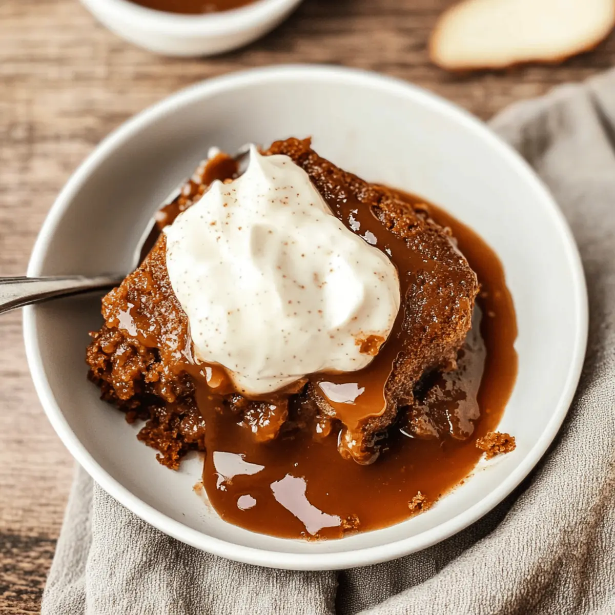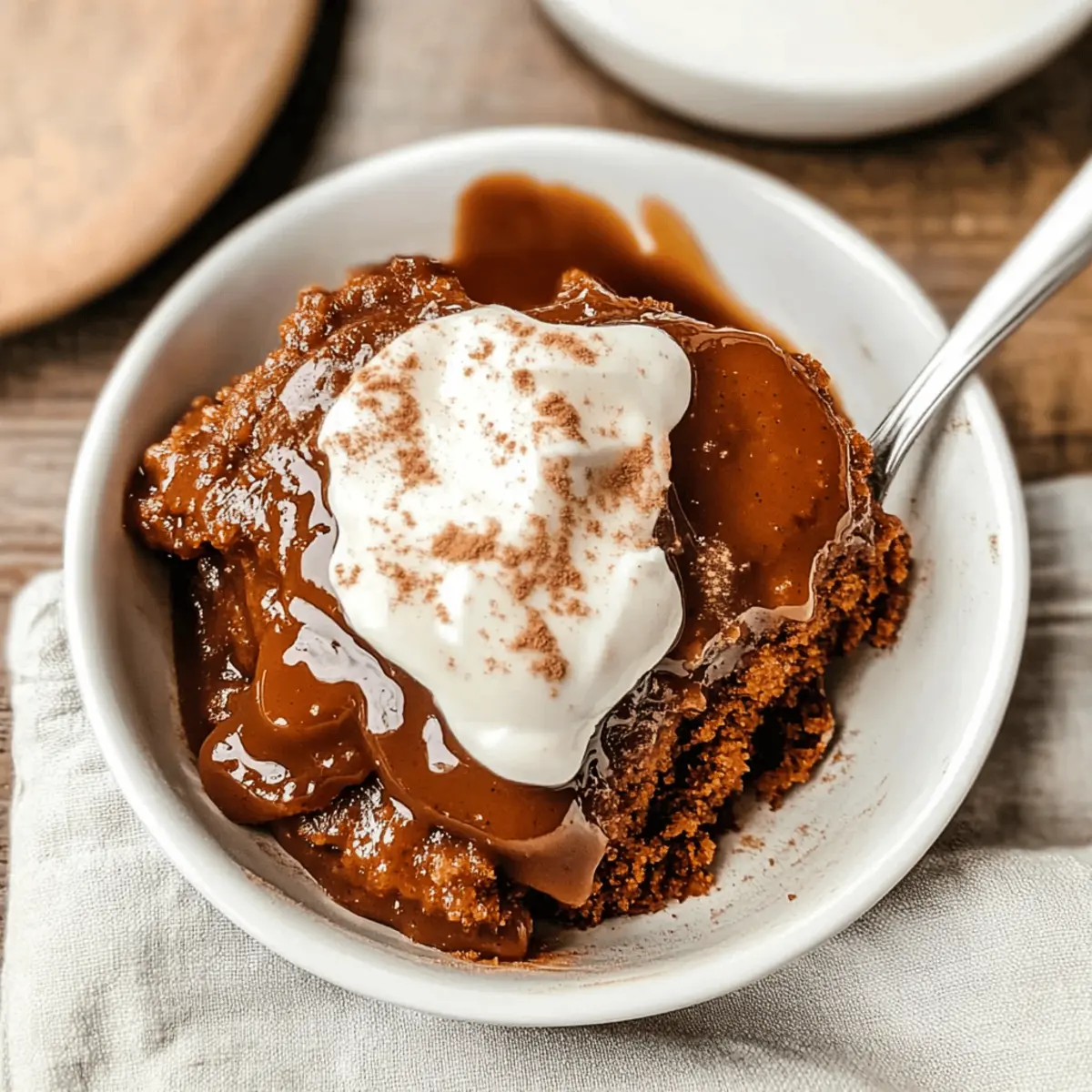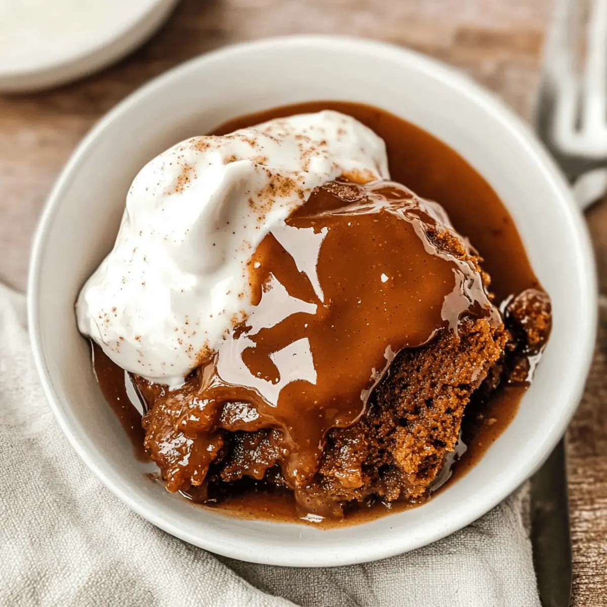 Jump to Recipe Print RecipeAs the scent of warm spices wafts through my kitchen, I can’t help but feel transported to holiday celebrations filled with laughter and love. This Easy Homemade Gingerbread Pudding Cake is my go-to dessert during this magical time of year, effortlessly blending the flavors of ginger, cinnamon, and molasses into a moist, comforting treat. What makes it even better? It creates its own caramel sauce right while it bakes, offering a sweet surprise with each bite. Perfect for novice bakers, this delight promises a crowd-pleasing finish in just 50 minutes—a fantastic way to savor the holiday spirit without the stress. Ready to indulge in a slice of nostalgia that warms your heart? Let’s get baking! Why is Gingerbread Pudding Cake So Special? Warm, Inviting Flavors: The combination of ginger, cinnamon, and molasses brings a sense of nostalgia, making every bite a cozy experience perfect for the holidays. Magically Moist: This cake bakes to fluffy perfection and creates its own luscious caramel sauce, combining two delightful textures in one dish. Easy to Make: With simple ingredients and straightforward steps, even beginner bakers can nail this dessert. Crowd-Pleasing Delight: Serve it warm with a scoop of ice cream or a dollop of whipped cream for an unforgettable finish. Versatile Variations: Feel free to customize with ingredients like cranberries or swap in almond milk for a dairy-free option. Try pairing with delightful treats like Honey Cheesecake Salted or the comforting Zucchini Coffee Cake for a perfect dessert spread! Gingerbread Pudding Cake Ingredients For the Cake All-purpose flour – Creates a sturdy base; can substitute with gluten-free flour for a gluten-free option. Baking powder – Ensures the cake rises beautifully for that light and fluffy texture. Salt – Enhances all flavors and balances the sweetness perfectly. Granulated sugar – Sweetens the cake; try swapping it with brown sugar for a richer flavor. Ground cinnamon – Infuses warmth into the cake; feel free to add extra for a spicier kick. Ground ginger – The star spice that gives gingerbread its distinctive flavor; doubling it deepens the taste. Molasses – Adds moisture and that signature gingerbread richness. Unsweetened applesauce – Keeps the cake moist and adds a hint of natural sweetness; can be a pureed pumpkin substitute. Vegetable oil – Ensures a tender cake; can be switched for canola or olive oil. Milk – Moisturizes the batter; swap for almond or coconut milk to make it dairy-free. Vanilla extract – Adds a wonderful depth of flavor; optional but recommended. For the Topping Brown sugar – Creates a luscious caramel-like flavor; choose light or dark based on preference. Apple cider – Essential for that mouthwatering caramel sauce; never use vinegar! Apple juice can be a handy substitute. Water – Helps in forming the magical topping sauce that pools at the bottom. Dive into this Gingerbread Pudding Cake and let those comforting flavors brighten up your holidays! Step‑by‑Step Instructions for Gingerbread Pudding Cake Step 1: Preheat Your Oven Begin by preheating your oven to 350°F (175°C). This step is crucial as it prepares the environment for the Gingerbread Pudding Cake to bake evenly and rise properly. Once the oven reaches the desired temperature, gently grease an 8×11-inch baking dish with butter or non-stick spray, ensuring an easy release once baked. Step 2: Combine Dry Ingredients In a medium bowl, whisk together the all-purpose flour, baking powder, salt, granulated sugar, ground cinnamon, and ground ginger. This mixture forms the dry base of your cake, so be sure the ingredients are well combined. Continue mixing until there are no visible clumps, creating a uniform blend that will help the gingerbread rise beautifully. Step 3: Mix Wet Ingredients In a large bowl, combine the unsweetened applesauce, milk, vegetable oil, molasses, and vanilla extract. Stir these ingredients together until they are fully blended and smooth, creating a moist base for your Gingerbread Pudding Cake. The golden hue of the molasses should incorporate well, highlighting the mixture’s luscious consistency. Step 4: Combine Wet and Dry Mixtures Gradually add the dry mixture to the wet ingredients, folding the ingredients together until just combined. Be careful not to over-mix; a few lumps are perfectly fine. You’ll notice the batter thickening beautifully, ready for the next step in creating your comforting dessert. Step 5: Pour Batter into Dish Pour the batter into the greased 8×11-inch baking dish, spreading it evenly with a spatula. This should create a smooth surface to bake against, which is essential for that perfect rise and consistent texture. Set your baking dish aside as we prepare the delightful topping for the cake. Step 6: Prepare the Topping In a separate bowl, mix together the brown sugar, granulated sugar, and a sprinkle of ground cinnamon. This topping will create a caramel-like flavor and texture as the cake bakes. Sprinkle the mixture evenly over the cake batter, ensuring every bite is sweet and flavorful. Step 7: Add Liquid for Caramel Sauce Carefully pour the apple cider and water over the topping mixture without stirring. This magical step allows the liquids to seep through to the bottom, creating a luscious caramel sauce as the Gingerbread Pudding Cake bakes. Make sure to cover all the sugar but let it remain untouched on top of the batter. Step 8: Bake Place the baking dish in the preheated oven and bake for 40 minutes, or until the center is set. During this time, your kitchen will be filled with the warm, inviting aroma of gingerbread. Check for doneness by inserting a toothpick in the center; it should come out clean when the cake is perfectly baked. Step 9: Cool Before Serving Once baked, remove the dish from the oven and let the cake cool for 5-10 minutes. This short cooling period allows the flavors to meld and the cake to set, mak