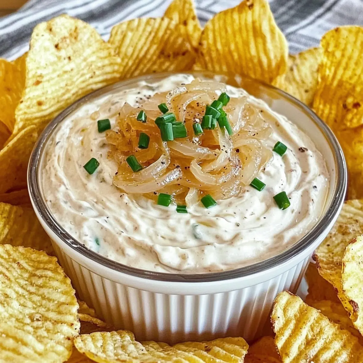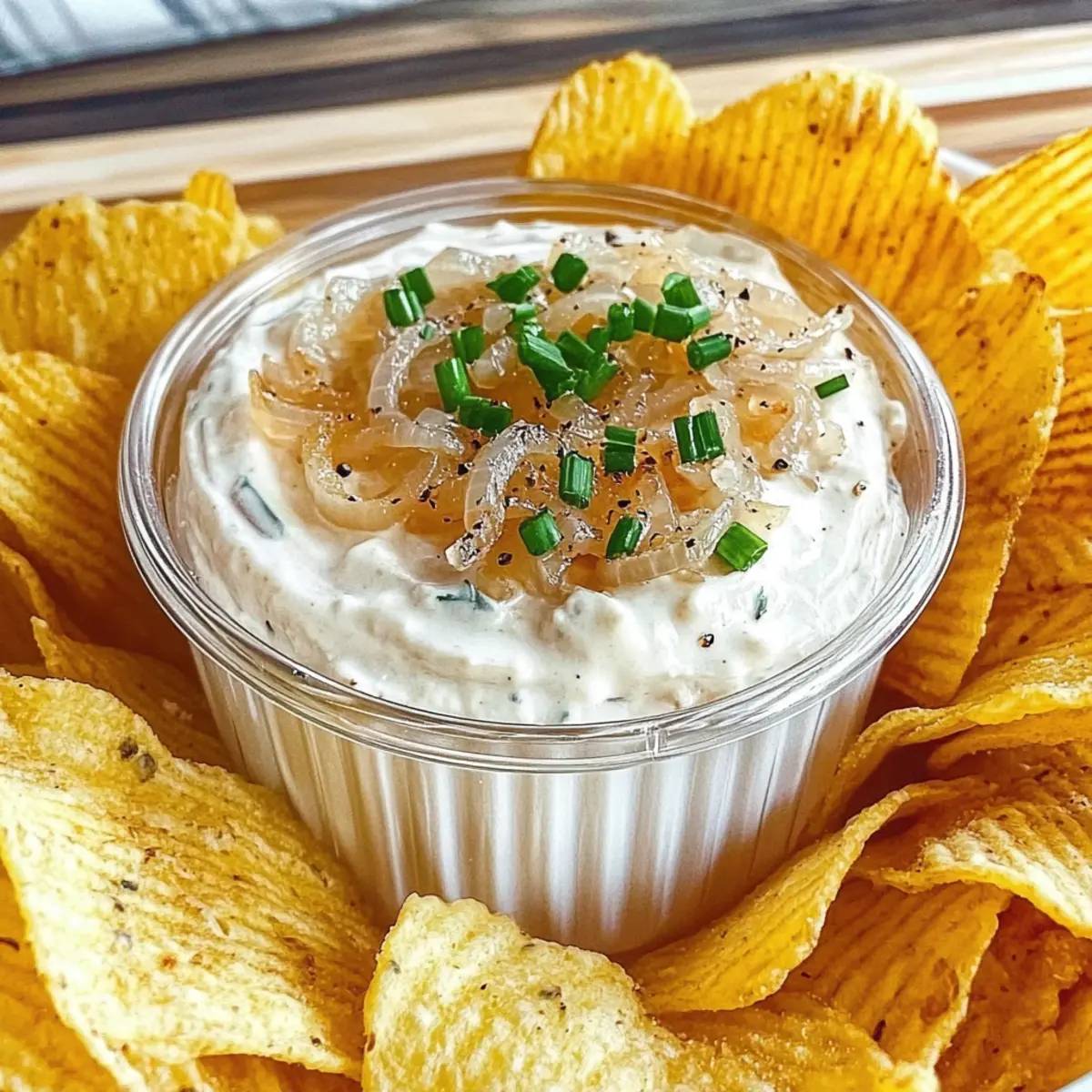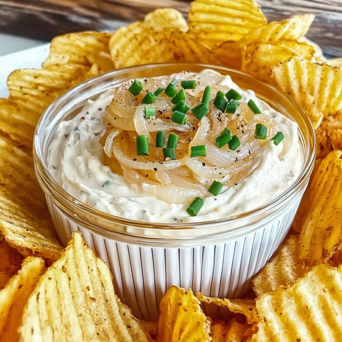 Jump to Recipe Print Recipe“Why settle for store-bought when you can create something heavenly at home?” That’s the sentiment that sparked my journey to perfect this Really, Really Great Onion Dip. Rich and creamy, it’s the kind of dip that transforms a casual get-together into a memorable feast. The secret? Slow-cooked onions that caramelize their natural sugars, delivering a sweet and savory explosion of flavor. This recipe is not just a crowd-pleaser; it’s quick to prepare and a delightful upgrade from the usual snacks. Whether paired with crispy chips or spread on a juicy burger, every bite promises comfort and a touch of sophistication. Curious how a handful of simple ingredients can elevate your next gathering? Let’s dive into the deliciousness of this onion dip! Why You’ll Love This Great Onion Dip Flavor Explosion: The deep, sweet flavor of caramelized onions transforms this dip into a savory delight that’s impossible to resist. Simplicity at Its Best: Just a few simple ingredients combined effortlessly create a rich and creamy concoction. Perfect for Any Occasion: Whether it’s a casual family gathering or a fancy dinner party, this dip is bound to impress your guests! Make-Ahead Friendly: Prep it the day before, store it in the fridge, and let the flavors meld for an unforgettable experience. Versatile Pairing: This dip pairs beautifully with chips, veggies, or as a tantalizing spread on bagels and burgers—just like my Zucchini Onion Pie! Crowd-Pleaser: Everyone will be raving about this dip; it’s sure to be the highlight of the spread! Great Onion Dip Ingredients • Elevate your gatherings with these must-have ingredients! For the Dip Sweet Onions – 2 very large, diced; the primary flavor base that helps sweeten the dip naturally. Cream Cheese – 1 package (8 ounces, softened); ensures a rich and creamy texture—make sure it’s at room temperature for easy blending. Mayo – 1 cup; adds depth and creaminess; feel free to adjust based on your taste preferences. Sour Cream – 1/4 to 1/2 cup; adds tanginess and creaminess; start with less and adjust to achieve desired tartness. Soy Sauce – 1.5 tablespoons; enhances umami flavor and complements the sweetness of the onions. Black Pepper – 1/4 teaspoon; adds a subtle spice; adjust based on your heat preference. Cayenne Pepper – 1/4 teaspoon; optional for those who enjoy a touch of heat—feel free to omit! Brown Sugar – 1/2 tablespoon; introduces a hint of sweetness; can be adjusted or omitted for less sweetness. Salt – pinch, if needed; enhances overall flavor—always taste before adding! Butter – 2 tablespoons; used for sautéing onions, enriching the dip with added richness. Chives – 3 to 4 tablespoons, finely sliced; adds a fresh, mild onion flavor; green onions can be used as a substitute. Buttermilk Powder – 1/2 tablespoon (optional); adds tang and thickens the dip, enhancing its flavor profile. Let the magic of these ingredients come together in your kitchen, and enjoy a Great Onion Dip that everyone will rave about! Step‑by‑Step Instructions for Really, Really Great Onion Dip Step 1: Melt the Butter In a large skillet, melt 2 tablespoons of butter over low heat, allowing it to become fully liquefied. This low heat is essential for gently cooking the onions. Once melted, add in 2 very large diced sweet onions, stirring them well to coat with the butter. Step 2: Caramelize the Onions Cover the skillet and let the onions sweat for about 10 minutes. After that, remove the lid and continue to sauté the onions on low heat for 45 minutes to an hour. Stir occasionally, watching for them to turn a deep golden brown, which indicates they’re caramelizing beautifully, enhancing the flavor for your Great Onion Dip. Step 3: Cool the Onions Once the onions have reached that luscious, caramelized state, remove the skillet from heat. Allow the onions to cool for at least 30 minutes at room temperature, but for best results, cover and refrigerate them for a few hours or overnight. This cooling period ensures the flavors meld perfectly before mixing them into the dip. Step 4: Mix Cream Base In a large mixing bowl, combine 8 ounces of softened cream cheese and 1 cup of mayonnaise. Use a hand mixer or a whisk to whip them together until light and fluffy, creating a creamy base. Gradually add in 1/4 to 1/2 cup of sour cream, mixing well until fully incorporated into this rich mixture for your Really, Really Great Onion Dip. Step 5: Incorporate Onions and Seasoning Once your creamy base is ready, gently fold in the cooled caramelized onions along with 3 to 4 tablespoons of finely sliced chives. Add 1.5 tablespoons of soy sauce, 1/4 teaspoon of black pepper, and optionally, 1/4 teaspoon of cayenne pepper. Mix until everything is evenly distributed, ensuring every bite of your onion dip is packed with flavor. Step 6: Chill and Serve Transfer the dip into a serving dish and cover it tightly. Refrigerate it for at least one hour to let the flavors meld. For optimal taste, chilling it overnight is highly recommended. When ready to serve, scoop out chilled Really, Really Great Onion Dip with your favorite chips or use it as a delicious burger topping! How to Store and Freeze Great Onion Dip Fridge: Keep your Great Onion Dip in an airtight container for up to 5 days. Allow it to chill for at least one hour after preparation before enjoying it. Freezer: For longer storage, freeze the dip in a tightly sealed container for up to 3 months. Thaw it in the refrigerator overnight before reheating. Reheating: Gently reheat the dip in a microwave or on the stovetop over low heat, stirring occasionally to maintain its creamy texture. Add a touch of sour cream if needed for consistency. Make-Ahead: This dip is perfect for prepping ahead! Make it a day or two in advance, allowing flavors to meld beautifully while you focus on other party preparations. Great Onion Dip Variations Feel free to put your own twist on th