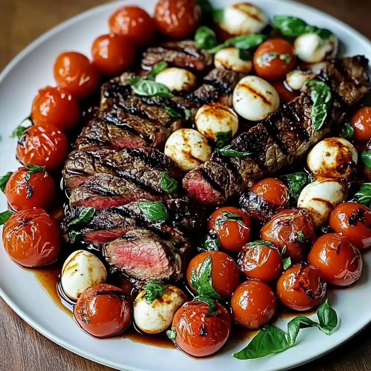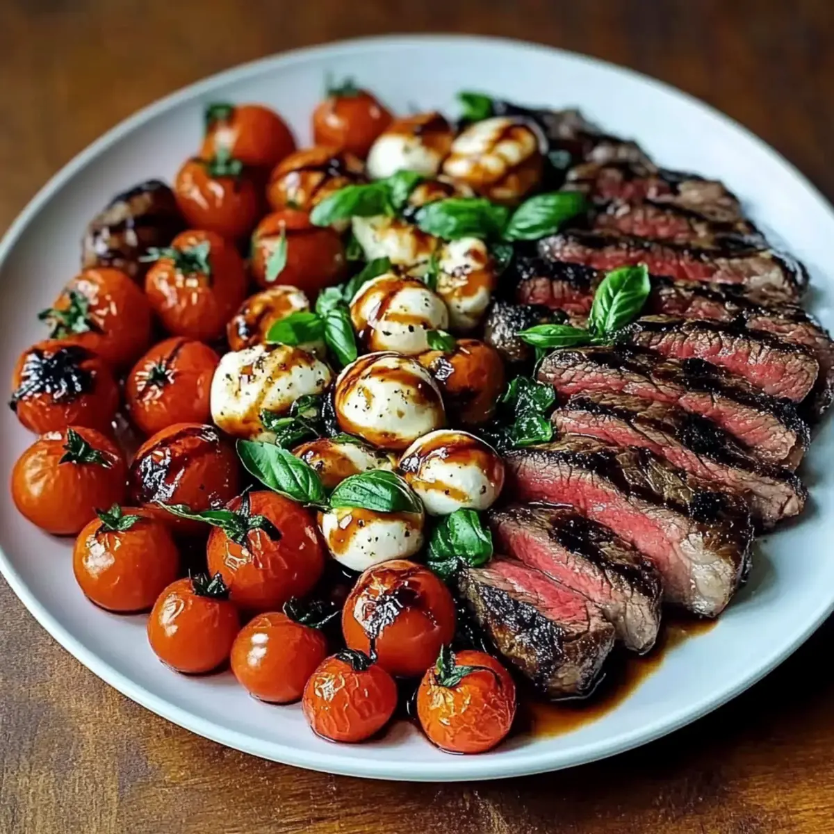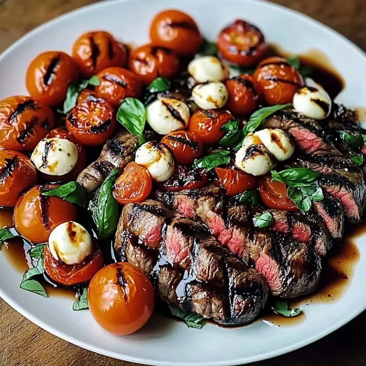 Jump to Recipe Print RecipeAs I flipped the steaks on the grill, the sizzle brought me back to summer evenings spent with friends, laughter mingling with the aroma of charred meat and fresh herbs. One of my favorite dishes that perfectly captures this magic is Grilled Flank Steak Caprese with Balsamic Dressing. This high-protein, low-carb delight showcases juicy, tender flank steak paired with ripe cherry tomatoes, creamy mozzarella, and fragrant basil, all drizzled with a sweet balsamic reduction. Not only is it quick to prepare, making it ideal for busy weeknights, but it also transforms any gathering into a celebration of summer’s best flavors. Ready to impress your family and friends while enjoying a healthy meal? Let’s fire up that grill and explore this vibrant, mouthwatering recipe together! What Makes This Dish a Must-Try? Bold flavors come alive in this dish, where juicy grilled flank steak meets fresh Caprese ingredients for an unforgettable meal. Quick preparation means you’ll spend less time in the kitchen and more time enjoying summer evenings with loved ones. Versatile serving options allow for pairings with light salads or grilled veggies, making it perfect for any occasion. Health-conscious yet indulgent, this recipe is high in protein and low in carbs, catering to diverse dietary preferences. If you’re seeking fresh ideas, check out my delicious Garlic Butter Steak or explore the tangy goodness of Korean Ramen Grilled. Transform your dinner experience with this flavorful dish! Grilled Flank Steak Caprese Ingredients For the Steak • Flank Steak – A rich source of protein; choose USDA Choice for the best flavor. • Olive Oil – Helps keep the meat moist and enhances the flavor during grilling. • Garlic (minced) – Adds a savory depth; fresh garlic is always a great choice. • Salt – Essential for flavor enhancement; opt for kosher or sea salt for a better texture. • Black Pepper – Adds a hint of spice; freshly cracked pepper gives the best flavor. For the Caprese Salad • Cherry Tomatoes – Provide sweetness and acidity; cut them in half for easier eating. • Fresh Mozzarella Balls – Adds creaminess; you can substitute with sliced large mozzarella if needed. • Fresh Basil (chopped) – Keeps things vibrant and fragrant; the freshest basil elevates the dish. For the Balsamic Dressing • Balsamic Glaze – Complements the dish with a sweet and tangy flavor; try reducing balsamic vinegar with honey for a homemade touch. Embrace the flavors of summer with this Grilled Flank Steak Caprese and enjoy a dish that will surely delight your guests! Step‑by‑Step Instructions for Grilled Flank Steak Caprese Step 1: Marinate the Steak In a large zip-top bag, combine ¼ cup olive oil, 3 minced garlic cloves, 1 teaspoon salt, and ½ teaspoon black pepper. Add the flank steak, ensuring it’s well coated in the marinade. Seal the bag, removing excess air, and refrigerate for at least 1 hour, or for maximum flavor, up to 8 hours. This marination not only enhances taste but also tenderizes the meat for your Grilled Flank Steak Caprese. Step 2: Preheat the Grill About 15 minutes before grilling, preheat your grill to medium-high heat (around 400°F to 450°F). Oil the grates to prevent sticking, using a paper towel dipped in oil, held with tongs. Ensure the grill is hot before placing the marinated flank steak on it. The high temperature will create beautiful grill marks and seal in the juices for flavor. Step 3: Grill the Steak Once the grill is preheated, remove the flank steak from the marinade, letting excess drip off. Place it on the grill and cook for approximately 4-5 minutes on each side for medium-rare, or until a meat thermometer reads 130-135°F. Look for a nicely charred surface and juices pooling on top, indicating that your steak is ready for a satisfying Grilled Flank Steak Caprese. Step 4: Rest and Slice After grilling, transfer the steak to a cutting board and let it rest for 5-10 minutes. Resting allows the juices to redistribute, ensuring every bite is tender and flavorful. After resting, slice the steak thinly against the grain. This technique is key to achieving tenderness and making your grilled masterpiece shine in the Caprese presentation. Step 5: Prepare the Caprese Salad In a mixing bowl, combine 2 cups halved cherry tomatoes, 1 cup fresh mozzarella balls, and ½ cup chopped fresh basil. Drizzle with 2 tablespoons of olive oil and season lightly with salt to enhance the flavors. Toss gently until everything is well-coated. This vibrant Caprese salad perfectly complements the heartiness of the Grilled Flank Steak and adds a fresh touch. Step 6: Serve and Drizzle On a large platter, artfully arrange the sliced flank steak alongside the caprese salad. For the finishing touch, drizzle ¼ cup balsamic glaze over the meat and salad. The sweet and tangy glaze will elevate your Grilled Flank Steak Caprese, making it a feast for both the eyes and the palate, perfect for summer dining with friends and family. Grilled Flank Steak Caprese Variations Let your creativity shine by customizing this dish with your favorite ingredients and flavors! Alternate Cuts: Swap flank steak for skirt or flat iron steak for similar flavors and textures. Herb Twist: Substitute fresh basil with arugula for a peppery kick or mint for a refreshing touch. Cheesy Delight: Use creamy burrata or ricotta instead of mozzarella for a rich creaminess that melts beautifully. Spicy Kick: Add a pinch of crushed red pepper flakes to the Caprese salad for a zingy bite that elevates the flavor profile. Zesty Marinade: Incorporate lime or lemon juice into the marinade for a citrusy twist that brightens the steak’s flavor. As delightful as the main dish is, consider pairing it with a colorful side salad, like a vibrant Berry Caprese Salad for a refreshing contrast. This combination of tastes and textures will make for a memorable meal filled with summer vibrancy! Storage Tips f
