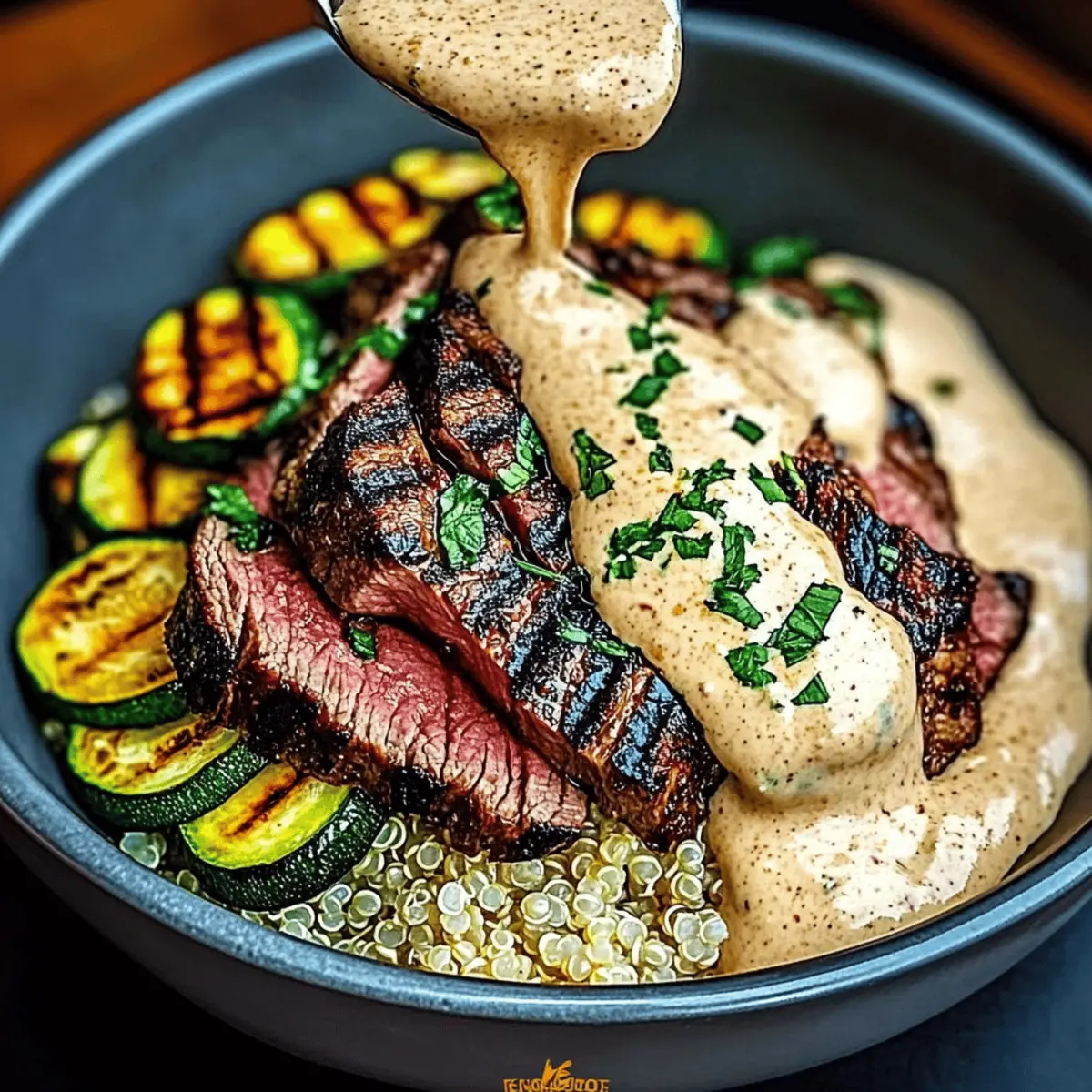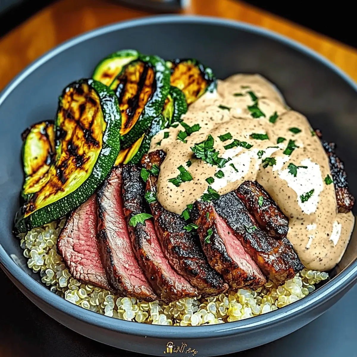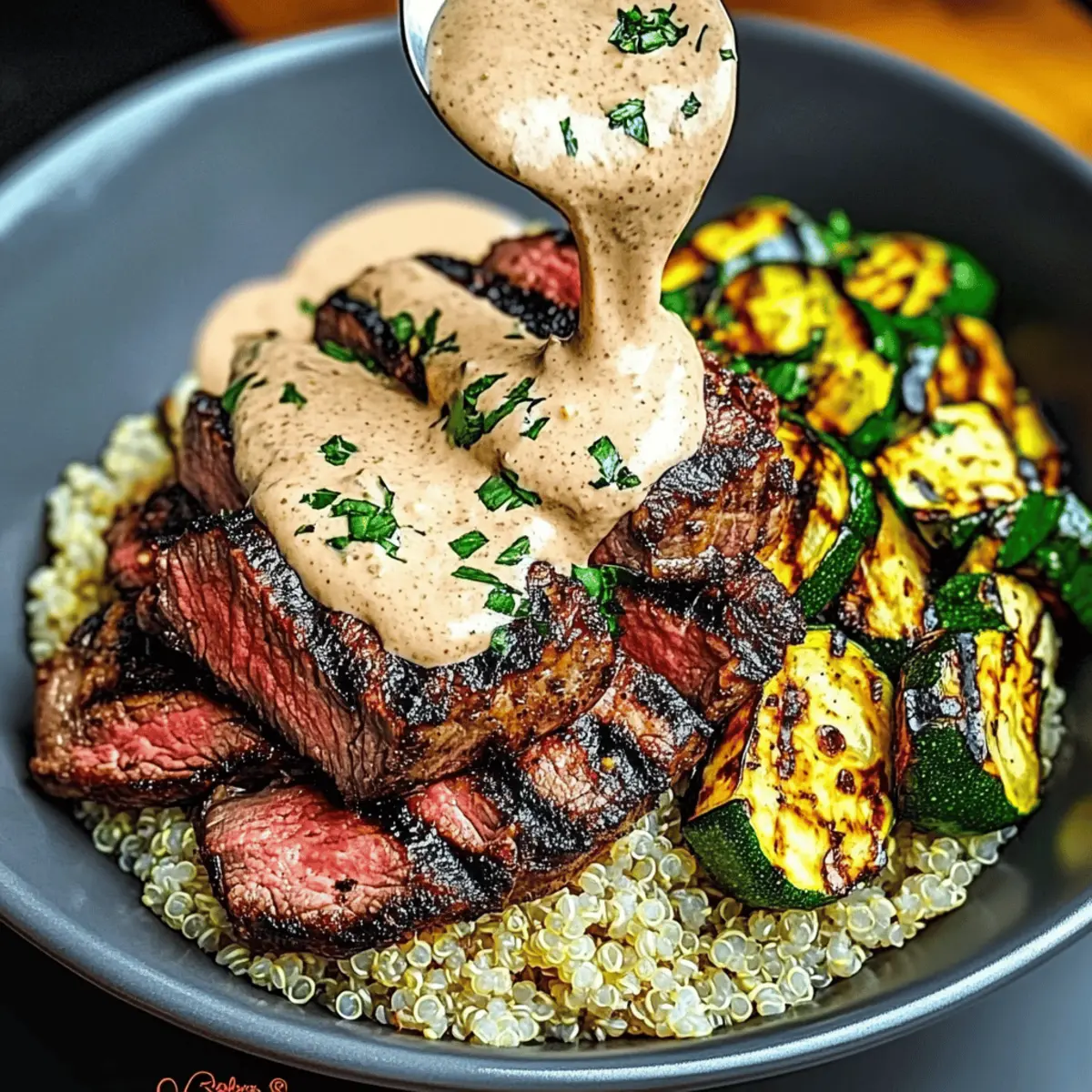 Jump to Recipe Print RecipeThe sizzling sound of steak hitting the grill is music to my ears, igniting my appetite for a fulfilling meal. When I crave a comforting yet nourishing dish, nothing beats my Grilled Steak Bowl with Creamy Sauce & Grilled Zucchini. This bowl is perfect for showcasing your favorite flavors while offering the flexibility to swap in proteins or veggies that suit your taste. It combines juicy, perfectly grilled steak, smoky zucchini, and fluffy grains, all brought together with a luscious, tangy sauce that’s both indulgent and light. You’ll find it not only easy to whip up on busy weeknights but also a guaranteed crowd-pleaser for dinner gatherings. Ready to take your dining experience to the next level? Grab your apron, and let’s create a meal that will have everyone coming back for more! Why is this steak bowl a winner? Customizable meals are where the magic happens! With this Grilled Steak Bowl, you can readily swap proteins and veggies according to your cravings. Deliciously rich creamy sauce adds a silky finish that makes every bite feel indulgent. Easy prep ensures you can whip this up any night without hassle. Health-conscious yet satisfying, it’s a balanced meal that leaves you feeling nourished. Plus, it’s a crowd pleaser for gatherings, perfect for showcasing culinary flair. Consider serving it alongside our delightful Zucchini Onion Pie for variety! Grilled Steak Bowl with Creamy Sauce Ingredients • This recipe’s ingredients create a vibrant, mouthwatering experience! For the Steak Steak (sirloin or ribeye) – The star of the show, offering juiciness and robust flavor; filet mignon can elevate this bowl. Olive Oil – A crucial element for coating the steak, giving it a beautifully golden crust. Salt & Black Pepper – Essential seasonings that genuinely enhance the steak’s natural flavors. Garlic Powder – Adds a wonderful depth of flavor to the steak’s seasoning blend. Smoked Paprika – Provides a warm, smoky taste that complements the steak beautifully. For the Grilled Vegetables Zucchini – Adds freshness and charred texture; try swapping with eggplant, bell peppers, or asparagus if desired. For the Grains Cooked Grains (quinoa, rice, or farro) – Acts as a hearty base to soak up the creamy sauce; consider cauliflower rice for a lighter alternative. For the Creamy Sauce Sour Cream or Greek Yogurt – Forms the creamy base of the sauce for tanginess; use plant-based yogurt for a dairy-free version. Dijon Mustard – Infuses the sauce with a delightful tangy kick. Fresh Parsley or Chives – Adds a burst of freshness and vibrant color to the dish. Feel free to get creative with your Grilled Steak Bowl with Creamy Sauce & Grilled Zucchini—each ingredient plays a role in making this meal your new favorite! Step‑by‑Step Instructions for Grilled Steak Bowl with Creamy Sauce & Grilled Zucchini Step 1: Prepare the Steak Begin by patting the steak dry with paper towels to remove excess moisture, ensuring a good sear. Rub both sides with olive oil, then sprinkle generously with salt, black pepper, garlic powder, and smoked paprika. Let the seasoned steak rest at room temperature for 20 minutes, allowing the flavors to meld and the meat to warm slightly. Step 2: Preheat the Grill While the steak is resting, preheat your grill to high heat, aiming for around 450°F to 500°F. This temperature ensures that the outside of the steak gets beautifully charred while locking in the juices. You’ll know it’s ready when you see faint smoke rising from the grates and hear a sizzle when the steak is placed on the grill. Step 3: Grill the Zucchini Slice the zucchini into half-inch thick rounds for even grilling. Once the grill reaches the right temperature, place the zucchini slices directly on the grates. Grill for 2-3 minutes per side, checking for beautiful char marks and tenderness. The zucchini should be soft yet still have a bit of crispness when done. Remove from the grill and set aside. Step 4: Grill the Steak Now it’s time for the star of the dish—the steak! Place the steak on the grill and cook for 4-5 minutes on each side for medium-rare. Use a meat thermometer and aim for an internal temperature of 130°F. Once cooked to your liking, transfer the steak to a cutting board and let it rest for 5 minutes to preserve its juiciness before slicing. Step 5: Cook the Grains While the steak rests, prepare your chosen cooked grains according to package instructions. For this bowl, options like quinoa, rice, or farro work wonderfully as they provide a satisfying base. Once cooked, fluff the grains with a fork and set aside, ready to soak up the sauce and complement the veggies. Step 6: Make the Creamy Sauce In a mixing bowl, combine sour cream or Greek yogurt with Dijon mustard, garlic powder, smoked paprika, salt, and a splash of water for a smoother consistency. Whisk everything together until well blended and creamy. Stir in freshly chopped herbs like parsley or chives for an extra pop of freshness in your sauce. Step 7: Assemble the Bowl Start building your Grilled Steak Bowl by layering the cooked grains at the bottom of the bowl. Next, arrange the grilled zucchini slices artfully on top of the grains. Finally, slice the rested steak against the grain and place it atop the zucchini. Drizzle generously with the creamy sauce, letting it cascade through the layers, and prepare to indulge in this delicious meal! Storage Tips for Grilled Steak Bowl with Creamy Sauce & Grilled Zucchini Fridge: Store leftovers in an airtight container for up to 3 days. Keep the steak separate from the grains and zucchini to maintain texture and flavor. Freezer: If you want to freeze portions, place the steak, grains, and veggies in separate freezer-safe bags. They can last up to 2 months. Just remember, the zucchini may lose some texture upon reheating. Reheating: When ready to enjoy, reheat the steak gently in a skillet over medium heat until warmed throug