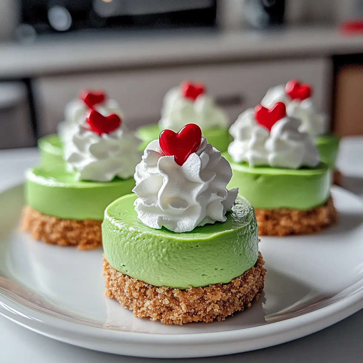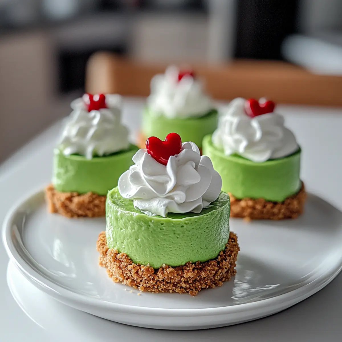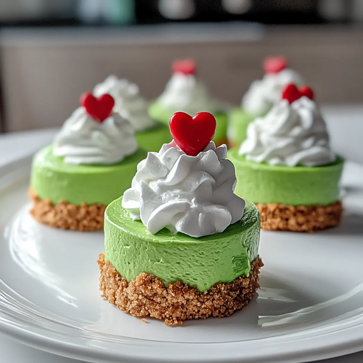 Jump to Recipe Print RecipeAs I was mixing the vibrant green filling for these Grinch mini cheesecakes, a wave of nostalgia washed over me, transporting me back to childhood holiday gatherings. These delightful no-bake treats are not only visually striking but also incredibly easy to whip up, making them the perfect festive addition to your dessert table. The creamy, smooth texture complements the buttery graham cracker crust, creating a treat that’s sure to put a smile on everyone’s face—kids and adults alike. Plus, you can prepare them in advance, ensuring a stress-free celebration. Are you ready to create a little holiday magic in your kitchen? Why Will Everyone Love Grinch Mini Cheesecakes? Irresistible visual appeal: Their vibrant green color and festive red hearts make these mini cheesecakes the star of any holiday dessert table. Effortless preparation: With a no-bake method, you can quickly assemble these treats, perfect for busy schedules amidst the holiday hustle. Versatile delight: Customize with toppings like crushed candy canes or fruits for a personal twist! Crowd-pleaser: Whether for family gatherings or office parties, everyone will be reaching for seconds. Stress-free ahead of time: Prepare them a day in advance, so you can enjoy the festivities without any last-minute rush. Take a moment to explore other festive favorites like Honey Cheesecake Salted or Strawberry Cheesecake Sandwiches for delicious additions to your holiday spread! Grinch Mini Cheesecake Ingredients For the Crust • Graham Cracker Crumbs – Provides the base structure and crunch; substitute with chocolate cookie crumbs for a richer flavor. • Butter – Adds moisture and binds the crumbs together; use coconut oil for a dairy-free option. For the Filling • Cream Cheese – Main filling ingredient for creaminess and richness; ensure it is softened for easy blending. • Sugar – Sweetens the cheesecake filling; can be replaced with powdered sugar for a smoother texture. • Sour Cream – Adds tanginess and creaminess; Greek yogurt can be used as a healthier alternative. • Vanilla Extract – Enhances the flavor profile; use almond extract for a different taste. • Green Food Coloring – Gives the cheesecakes their festive color; for a natural option, matcha powder or spinach extract can be used (note that the color might be less vibrant). For the Topping • Whipped Cream – For topping and decoration; opt for plant-based whipped cream for a dairy-free version. • Red Heart Candy – Decorative topping that stays on theme; can substitute with small red fruit or candy melts. Step‑by‑Step Instructions for Grinch Mini Cheesecake Step 1: Prepare the Crust In a mixing bowl, combine the graham cracker crumbs and melted butter until the mixture resembles wet sand. Line a cupcake pan with cupcake liners, then use the back of a spoon to press the crumb mixture firmly into the bottom of each liner, creating a solid crust. Bake at 350°F (175°C) for about 10 minutes, then set aside to cool completely. Step 2: Make the Filling In a large mixing bowl, beat the softened cream cheese with an electric mixer on medium speed until smooth and creamy, about 2 minutes. Gradually add in the sugar, sour cream, vanilla extract, and a few drops of green food coloring. Continue mixing until the filling is uniformly green and silky, showcasing the festive vibe of your Grinch mini cheesecakes. Step 3: Assemble the Cheesecakes Once the crusts have cooled, it’s time to fill them! Spoon the creamy green filling generously over each graham cracker crust, smoothing the tops with a spatula for an even finish. Each liner should be filled nearly to the top, showcasing the vibrant color of your Grinch mini cheesecakes, ready for chilling. Step 4: Chill to Set Cover the filled cheesecake cups with plastic wrap and place them in the refrigerator. Chill for at least 4 hours, or ideally overnight, to allow the filling to firm up. This step is crucial to achieve the perfect texture for your delightful no-bake Grinch mini cheesecakes. Step 5: Decorate Before Serving Once your cheesecakes have set, it’s time to add the final touches! Using whipped cream, pipe or spoon a dollop onto the top of each mini cheesecake, creating a festive look. Top each with a red heart candy, which will bring a charming touch that highlights the holiday spirit. Step 6: Serve and Enjoy Carefully remove the cheesecakes from the cupcake liners and arrange them on a festive platter. Serve these delightful Grinch mini cheesecakes at your holiday gatherings, and watch as everyone smiles at their festive appearance and delicious taste! Grinch Mini Cheesecake Variations & Substitutions Feel free to personalize your Grinch mini cheesecakes with these fun and flavorful twists that will make your dessert truly unique! Gluten-Free Crust: Substitute graham cracker crumbs with crushed gluten-free cookies for a tasty alternative. Dairy-Free Delight: Use vegan cream cheese and plant-based whipped cream for a delicious dairy-free option that everyone can enjoy. Citrus Zing: Add a splash of fresh lemon or lime juice to the filling for a tangy twist that brightens the flavor profile. Chocolate Lovers: Incorporate cocoa powder into the filling for a rich chocolate version, creating a delightful contrast with the green color. Peppermint Crunch: Top with crushed candy canes or peppermint bark to introduce a refreshing minty flavor that enhances the holiday spirit. Nutty Addition: Stir in a handful of finely chopped nuts into the filling for added texture and nutty goodness. Fruit Toppers: Substitute red heart candy with fresh raspberries or strawberries for a fruity and fresh decoration that pops with color. Matcha Magic: For a natural green coloring, use matcha powder instead of food coloring, adding a subtle earthy flavor that blends beautifully. For other delightful desserts, consider exploring the creamy goodness of Blueberry Crisp Cheesecake or the charm of L
