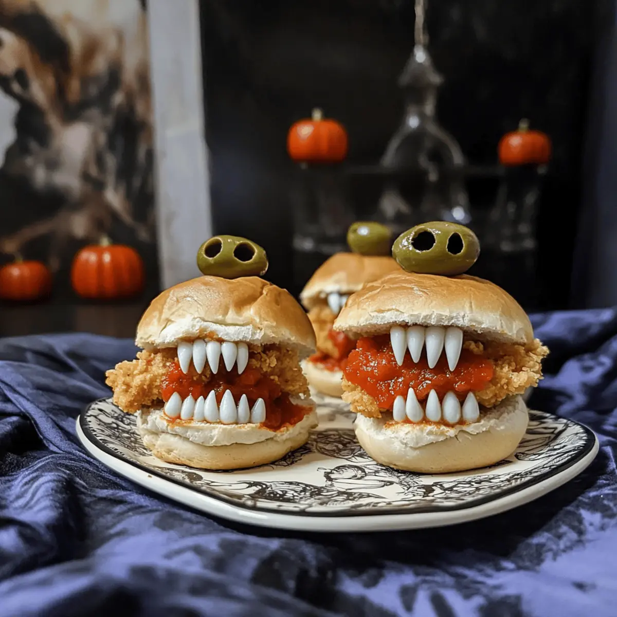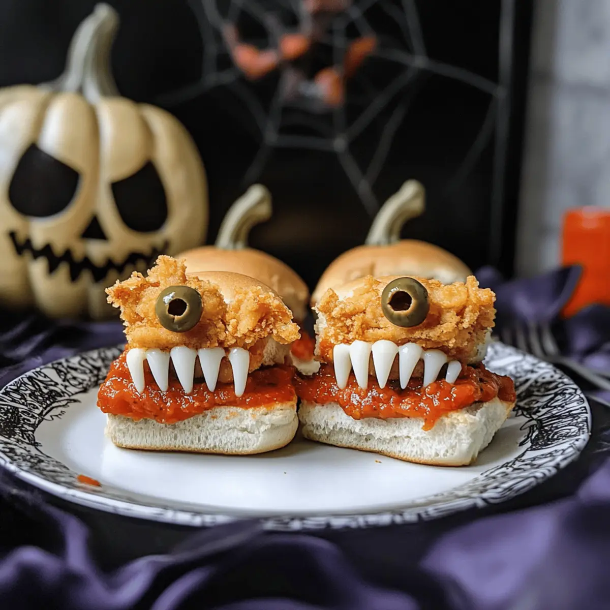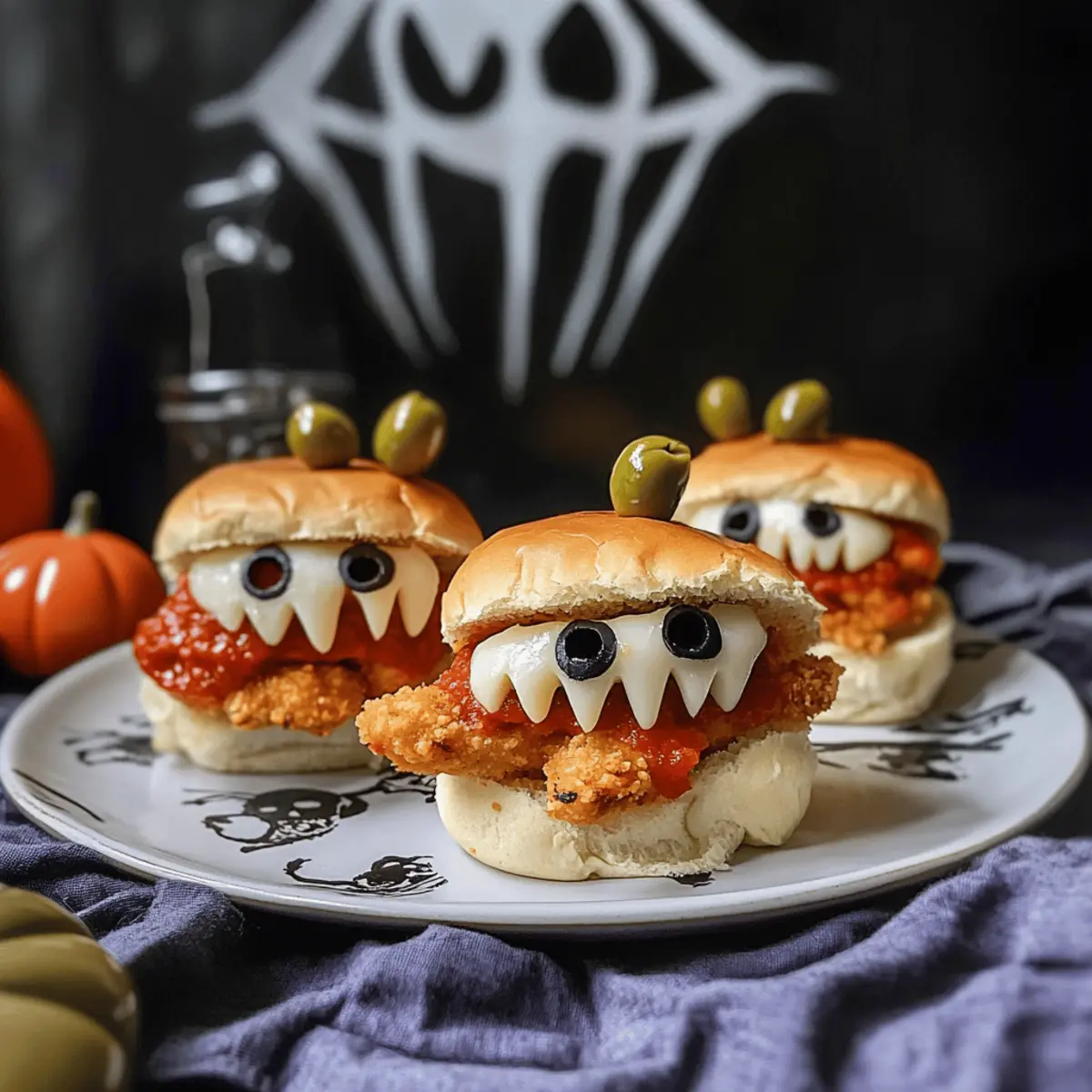 Jump to Recipe Print RecipeAs I rummaged through my kitchen last Halloween, a delightful idea struck me while gazing at leftover chicken tenders. What if I transformed them into something both playful and delicious? Enter my Spooky Halloween Chicken Parmesan Sliders! Perfect for impressing guests, these sliders are not only a fun twist on a classic favorite but also a breeze to whip up. With crispy chicken tenders nestled between soft slider buns and wrapped in gooey mozzarella, they make a fantastic appetizer that appeals to both kids and adults. Plus, you can easily customize them to suit your crowd’s tastes—from a zesty BBQ variation to a spicy buffalo kick. So, how will you make these sliders your own this Halloween? Let’s dive into the recipe! Why Are These Sliders So Popular? Fun and Festive: These Halloween Chicken Parmesan Sliders bring whimsy to your table, making your gatherings unforgettable. Endless Customization: Whether you’re into zesty BBQ or spicy buffalo, you can easily tweak the flavors to match your mood. Quick and Easy: With pre-cooked chicken tenders, whipping these up is a breeze—even on the busiest days! Crowd-Pleasing Appeal: Perfect for parties, kids and adults alike will be clamoring for seconds, ensuring they’re a hit at any Halloween bash. Get ready to impress—serve them with a side of Garlic Parmesan Chicken for a delicious buffet! Halloween Chicken Parmesan Sliders Ingredients For the Sliders Frozen Chicken Tenders – A convenient main protein source; swap for grilled chicken for a fresher twist. Slider Buns – The perfect base for your sliders; try whole grain or gluten-free for variety. Mozzarella Cheese – Essential for that creamy, melty goodness; substitute with provolone for a unique flavor. For the Sauce Marinara Sauce – Adds rich tomato flavor; consider BBQ sauce for a different, smoky profile. For Decoration Green Olives (stuffed with pimento) – Use these fun ‘eyes’ for a spooky touch; jalapeño slices can spice things up! Get ready to create your own delightful Halloween Chicken Parmesan Sliders! Step‑by‑Step Instructions for Halloween Chicken Parmesan Sliders Step 1: Cook the Chicken Tenders Begin by preheating your oven to 400°F (200°C). Spread frozen chicken tenders on a baking sheet lined with parchment paper and cook according to package directions, usually about 20-25 minutes, until golden brown and crispy. Turn them halfway through for even cooking. While they bake, the delicious aroma will fill your kitchen! Step 2: Prepare the Mozzarella Teeth While the chicken is baking, grab fresh mozzarella cheese slices and a paring knife. Carve the edges of each slice into jagged teeth shapes to create a spooky, fun effect for your Halloween Chicken Parmesan Sliders. This playful touch will certainly delight your guests and create a real ‘monster’ presentation! Step 3: Create Monster Eyes Next, take green olives stuffed with pimento and skewer two olives onto toothpicks for each slider. These will serve as the quirky ‘eyes’ for your sliders. Set them aside; they will add a festive and fun touch to your Halloween Chicken Parmesan Sliders. Step 4: Heat the Marinara Sauce In a medium saucepan, pour in your marinara sauce and heat over medium heat, stirring occasionally, until it begins to simmer—about 5 minutes. Avoid letting it come to a boil as you want it warm and smooth to prevent sogginess in the buns. This rich sauce will add that authentic chicken Parmesan flavor! Step 5: Assemble the Sliders Once your chicken tenders are perfectly cooked, it’s assembly time! Spread approximately 1 tablespoon of the warm marinara sauce on the bottom half of each slider bun. Place a crispy chicken tender on top, add more marinara if desired, and then layer on your mozzarella teeth with the points facing outward for that spooky look. Step 6: Complete the Slider Finish your Halloween Chicken Parmesan Sliders by placing the top bun gently over the cheese. Secure the skewer with olives on top of the bun, creating your monstrous presentation. These sliders are now ready to be served; the combination of textures and flavors will surely wow your guests! Step 7: Serve and Enjoy Serve your sliders immediately for the best taste, presenting them on a festive platter. You can include an assortment of dipping sauces, such as extra marinara or ranch, for an added flavor burst. Watch as everyone enjoys these delightful Halloween Chicken Parmesan Sliders at your spooky gathering! Expert Tips for Halloween Chicken Parmesan Sliders Prep Ahead: Prepare cheese shapes and olive decorations up to 3-4 days in advance; store them in an airtight container to save time on party day. Monitor Sauce Temperature: Ensure the marinara sauce is warm but not boiling before assembling sliders to prevent sogginess in the buns. Experiment Freely: Don’t hesitate to play with flavors! Swap out proteins, sauces, and cheeses to create your own delicious variations of Halloween Chicken Parmesan Sliders. Keep it Crisp: To maintain crispy chicken tenders, serve the sliders immediately after assembly; they’re best enjoyed fresh! Presentation Matters: Use festive platters and garnishes to elevate the spooky theme; a fun display can impress guests even before they taste the sliders. How to Store and Freeze Halloween Chicken Parmesan Sliders Fridge: Store leftover sliders in an airtight container for up to 3 days. Reheat the chicken in the oven or microwave before serving to restore crispiness. Freezer: For longer storage, freeze assembled sliders (without toppings) in an airtight container for up to 2 months. Thaw in the fridge overnight before reheating. Separately Stored Ingredients: Keep individual components like chicken, buns, and sauce in separate airtight containers for maximum freshness, ensuring each lasts about 3 days in the fridge. Reheating: To reheat, warm the assembled sliders in the oven at 350°F (175°C) for about 10 minutes or until heated throu