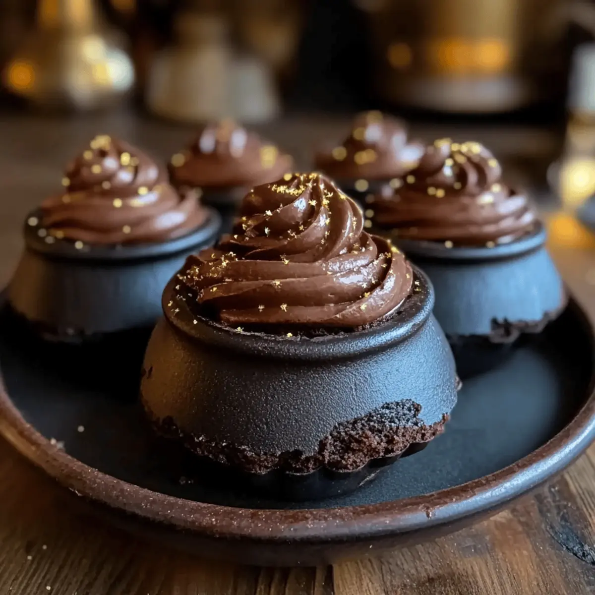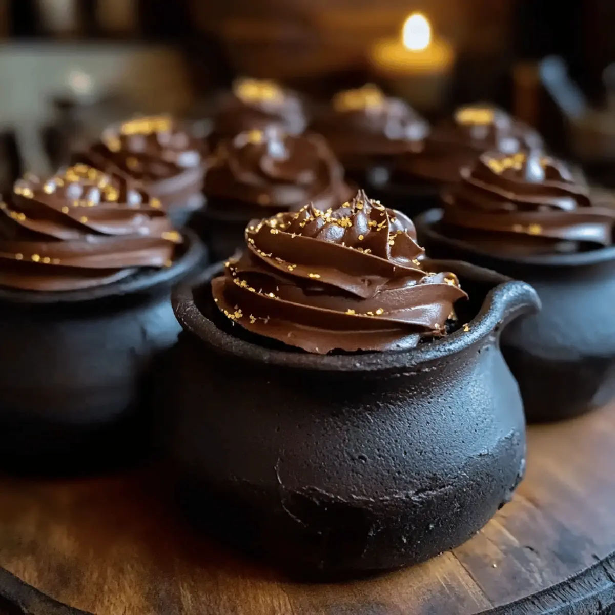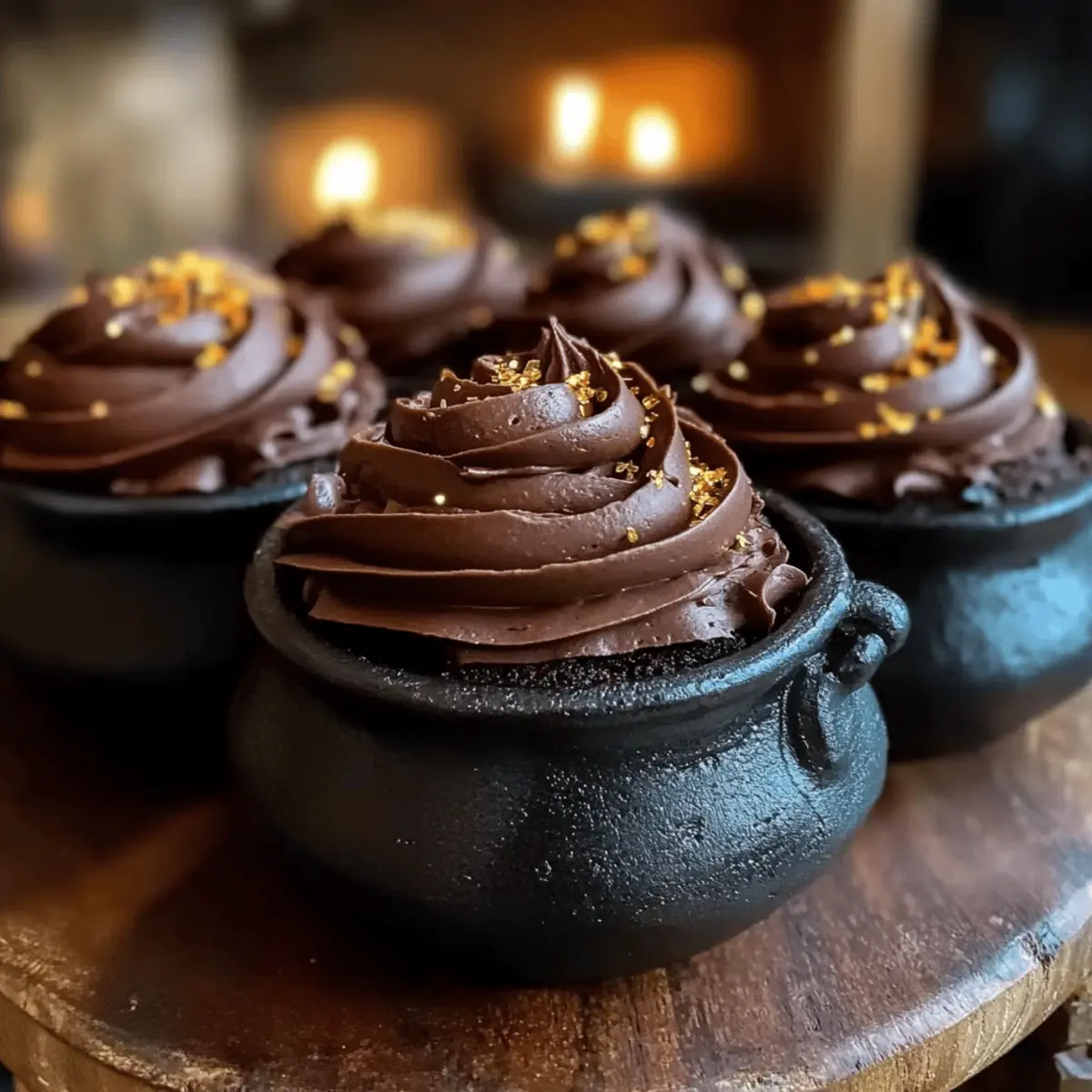 Jump to Recipe Print RecipeAs the rich aroma of chocolate wafts through the air, you can almost hear the magic brewing in your kitchen. Let me take you on a whimsical journey with these Harry Potter Cauldron Cakes—a dessert that perfectly captures the enchanting spirit of the beloved series. Not only are these delightful treats a hit at themed parties or cozy movie nights, but they also deliver easy prep and a mouthwatering chocolate flavor that will have everyone coming back for more. With their soft, moist texture and a sprinkle of edible glitter, they’ll add a touch of whimsy to any occasion. Curious about how to conjure them up in your own kitchen? Let’s dive into this magical baking adventure together! Why Are These Cauldron Cakes Special? Magical Flavor: The deep, rich chocolate flavor is perfectly complemented by creamy frosting, creating a dessert that feels like a warm hug. Easy to Make: With a straightforward preparation and minimal mess, even novice bakers can whip these up effortlessly, making them the perfect recipe for any gathering. Impressive Presentation: Frosted with chocolate icing and sprinkled with edible glitter, these cauldron cakes are not just tasty; they’re visually stunning too! Themed Fun: Perfect for Harry Potter-themed parties, these treats will have both wizards and muggles alike begging for seconds. Texture Explosion: Moist, fluffy layers with a luscious frosting create a delightful mouthfeel that rivals any fine bakery. Now that you’re inspired, why not pair these with a warm mug of butterbeer? Check out our Strawberry Mango Cupcakes for more whimsical dessert ideas! Harry Potter Cauldron Cakes Ingredients For the Batter • All-Purpose Flour – Provides structure and stability to the cakes; substitute with gluten-free flour for a magical twist. • Granulated Sugar – Adds sweetness to balance the rich chocolate flavor; brown sugar can lend a deeper taste. • Unsweetened Cocoa Powder – Essential for that rich chocolate flavor; be sure it’s unsweetened for best results! • Baking Powder – Helps the cakes rise and become fluffy; freshness is key for optimal leavening. • Baking Soda – Works alongside baking powder for extra fluffiness in your cauldron cakes. • Salt – Enhances sweetness by balancing flavors; a must-have in dessert recipes! • Unsalted Butter (melted) – Adds richness and moisture; vegan options can include coconut oil. • Large Eggs – Binds the mixture together for a cohesive texture; eggs are essential for that perfect cake rise. • Vanilla Extract – Elevates the flavor profile, making the chocolate taste even more enchanting. • Milk – Provides necessary moisture; feel free to swap for non-dairy milk if desired. For the Topping • Chocolate Frosting – Adds sweetness and a decadent finish to the cakes; can be homemade or store-bought for convenience. • Edible Glitter – Sprinkles on top for that whimsical touch; optional but highly recommended for a magical effect. Get ready to bake your very own Harry Potter Cauldron Cakes and bring a taste of Hogwarts to your kitchen! Step‑by‑Step Instructions for Harry Potter Cauldron Cakes Step 1: Prep Dry Ingredients In a large mixing bowl, whisk together the all-purpose flour, granulated sugar, unsweetened cocoa powder, baking powder, baking soda, and salt. Ensure there are no lumps, as this will help create a smooth batter for your Harry Potter Cauldron Cakes. This initial step is crucial for achieving the perfect texture, so take your time to blend everything thoroughly. Step 2: Mix Wet Ingredients In a separate bowl, combine the melted unsalted butter, large eggs, and vanilla extract. Mix until smooth, then gradually whisk in the milk until well incorporated. The wet ingredients should blend into a creamy mixture, creating a luscious base that will bring moisture to your cauldron cakes. Make sure everything is at room temperature for the best results. Step 3: Combine Batter Pour the wet mixture into the bowl of dry ingredients and gently stir with a spatula until just combined. The mixture should remain slightly lumpy, as overmixing can result in dense cakes. This is crucial for creating light and fluffy Harry Potter Cauldron Cakes that will enchant everyone at your gathering. Step 4: Preheat Oven & Prepare Molds Preheat your oven to 350°F (175°C) to ensure it reaches the right temperature for baking. While the oven warms up, prepare your cauldron-shaped molds by greasing them lightly, then fill each mold about three-quarters full with the cake batter. This ensures adequate space for rising while maintaining their whimsical shape. Step 5: Bake Cakes Place the prepared molds in the preheated oven and bake for 20-25 minutes, or until a toothpick inserted into the center comes out clean. Keep an eye on the cakes during the final few minutes to prevent overbaking, as you want them to retain their moist texture. The cauldron cakes should rise nicely and have a slight sheen. Step 6: Cool Cakes Once baked, remove the cauldron cakes from the oven and let them cool in the molds for 10 minutes. Afterward, carefully transfer them to a wire rack to cool completely. This cooling step is essential for allowing the cakes to set properly and develop that fluffy interior, perfect for savoring later. Step 7: Decorate Once your Harry Potter Cauldron Cakes have cooled completely, it’s time to bring them to life! Frost each cake generously with chocolate frosting, allowing it to cascade down the sides for a delightful finish. Finally, add a sprinkle of edible glitter on top for that magical touch, making them look enchanting and inviting for your guests. What to Serve with Magical Harry Potter Cauldron Cakes Indulge in a world of delightful pairings that will elevate your dessert experience and spark joy during your next gathering. Creamy Vanilla Ice Cream: A scoop of creamy vanilla complements the rich chocolate of the cauldron cakes beautifully, creating a deliciou