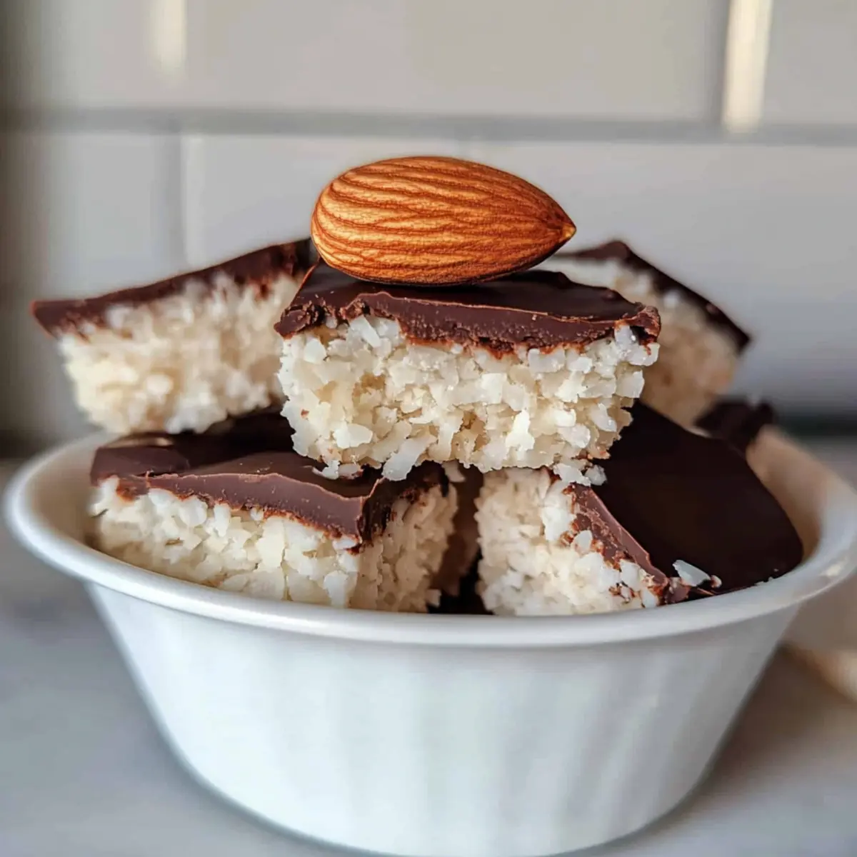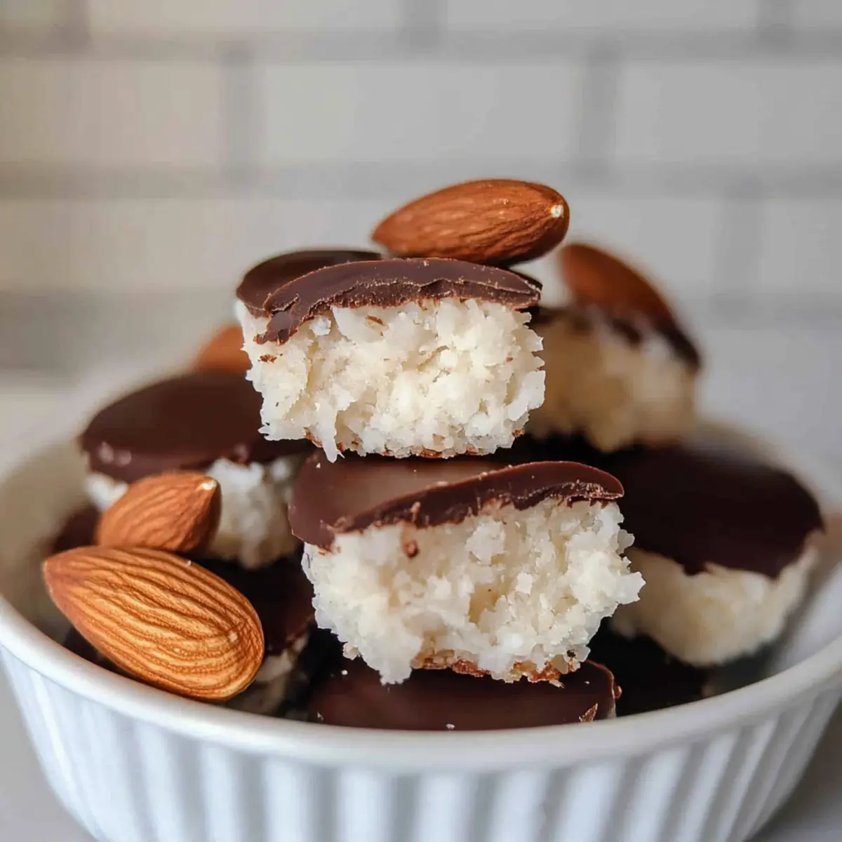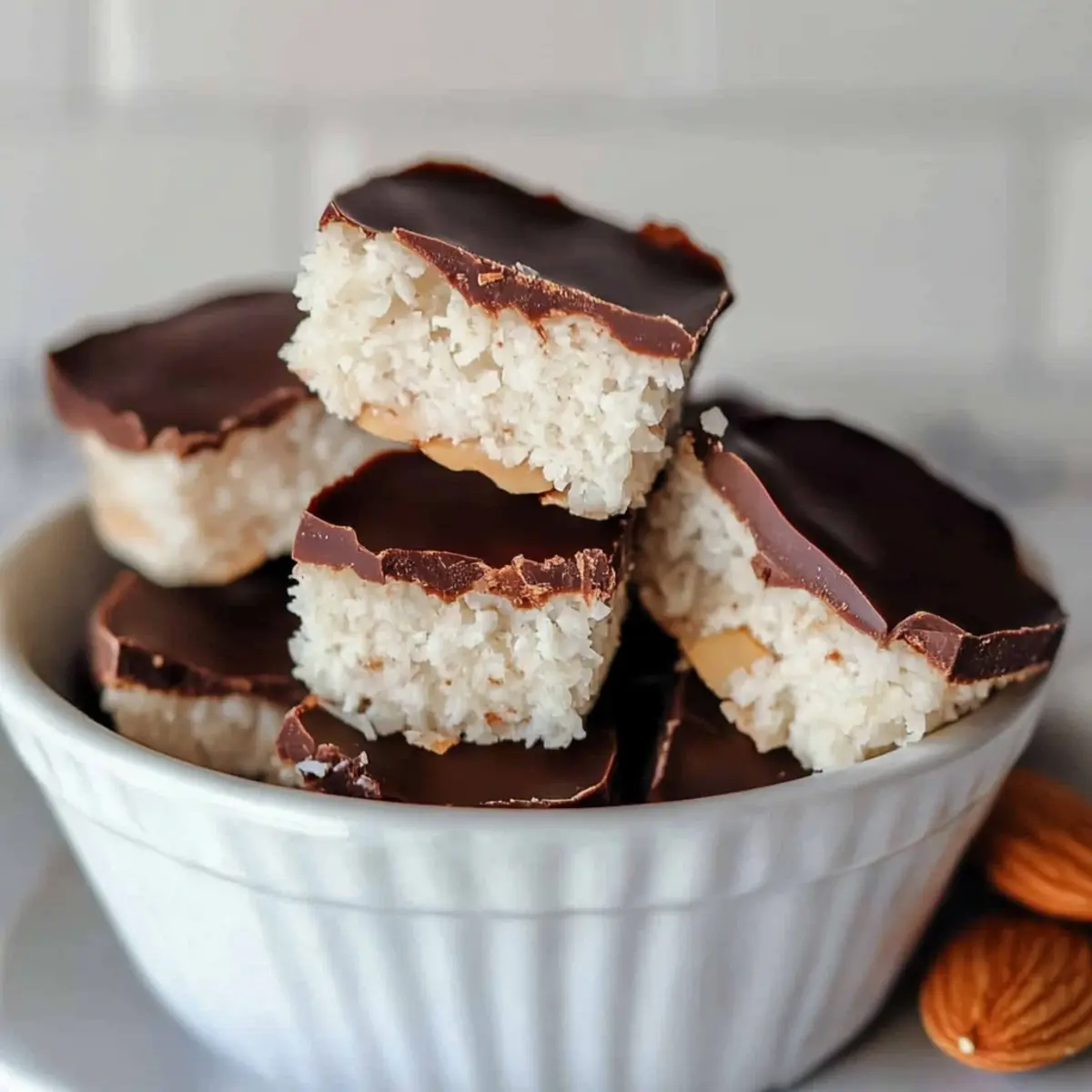 Jump to Recipe Print RecipeSinking my teeth into a treat that captures my childhood never fails to evoke a warm, cozy feeling. These Healthy Almond Joys bring back memories of candy bar indulgence without the guilt! With a delightful blend of chewy coconut, rich chocolate, and crunchy almonds, this no-bake recipe offers a vegan, gluten-free, and refined sugar-free way to satisfy your sweet tooth. Not only are they incredibly easy to whip up—requiring just five wholesome ingredients—but they also make a perfect snack for any time of day. Whether you prefer mini muffin bites or rectangular bars, these low sugar delights are sure to please your palate. Curious how these treats can transform your dessert game without derailing your healthy lifestyle? Let’s dive into this sweet adventure together! Why Make Healthy Almond Joys? Deliciously Guilt-Free: These Healthy Almond Joys redefine indulgence by swapping out refined sugars for wholesome ingredients! Quick & Easy: With just five simple ingredients, you can whip up these treats in minutes, perfect for busy days when cravings hit. Versatile Treats: Whether you choose mini muffin bites or rectangular bars, you can tailor them to suit any occasion, from snacking to sharing at gatherings. Nutritious Ingredients: Made with coconut, dark chocolate, and almonds, they’re not just tasty; they’re a great source of healthy fats too! Satisfying Taste & Texture: Enjoy a delightful crunch from the almonds paired with the chewiness of coconut and a smooth chocolate coating! Craving something unique? You might also love trying our Rainbow Chicken Salad or make-ahead Vegan Carrot Lox for a vibrant twist on healthy eating! Healthy Almond Joys Ingredients For the Coconut Base • Unsweetened finely shredded coconut – This keeps the sugar content low while providing a delicious texture for your Healthy Almond Joys. • Maple syrup or honey – A natural sweetener that binds the coconut; use agave for a fully vegan version. • Melted coconut oil – Ensures moisture and smoothness; neutral oil works as a fine substitute. • Vanilla extract – A little boost of flavor; optional but recommended for richer taste. • Sea salt – Optional, but a pinch balances the sweetness beautifully. For the Chocolate Coating • Chocolate bars or chocolate chips – Provides a rich, delightful layer; opt for dark chocolate to keep things healthy. For Topping • Raw almonds – Adds that signature crunch and authentic Almond Joy vibe to each treat. Now that you have the ingredients ready, let’s explore the simple steps to create these yummy delights! Step‑by‑Step Instructions for healthy almond joys Step 1: Make the Coconut Base In a food processor, combine unsweetened finely shredded coconut, melted coconut oil, maple syrup or honey, vanilla extract, and a pinch of sea salt. Blend these ingredients for about 40 seconds, or until the mixture becomes sticky and holds together when pressed. You’ll know it’s ready when it resembles a thick dough-like consistency, perfect for forming your healthy almond joys! Step 2: Press into Muffin Pan Take your prepared coconut mixture and evenly distribute it into a mini muffin pan, pressing it firmly into each cavity to avoid air gaps. Use your fingers or the back of a spoon to pack it down tightly, creating a solid base that will hold the almond joys together. Once filled, set the muffin pan aside while you prepare the chocolate coating. Step 3: Melt the Chocolate In a microwave-safe bowl, combine your chocolate bars or chocolate chips with a tablespoon of coconut oil. Heat the mixture in 30-second increments in the microwave, stirring in between, until the chocolate is smooth and fully melted, typically about 1 to 2 minutes total. Alternatively, use a double boiler if you prefer a more controlled melting process, stirring until silky. Step 4: Assemble and Freeze Carefully pour the melted chocolate over each coconut base in the muffin pan, ensuring an even covering. Place a raw almond on top of each treat, gently pressing it into the chocolate. Once all chocolates are assembled, transfer the muffin pan to the freezer and let it chill for 3 to 4 hours, or until solid and set—perfectly firm for your healthy almond joys! Step 5: Storage After the almond joys are fully set, carefully remove them from the muffin pan. If using a metal pan, lightly greasing it beforehand aids in easy release. Store your healthy almond joys in an air-tight container in the fridge for up to a week or freeze for longer-lasting treats. Enjoy these delightful snacks whenever your sweet cravings call! How to Store and Freeze Healthy Almond Joys Fridge: Store your Healthy Almond Joys in an airtight container in the fridge for up to 1 week. This keeps them fresh and ready for guilt-free snacking! Freezer: For longer storage, freeze the almond joys for up to 3 months. Just make sure to separate layers with parchment paper to prevent sticking. Thawing: When ready to enjoy, simply remove your treats from the freezer and let them sit for a few minutes at room temperature before indulging. Reheating: There’s no need to reheat these no-bake delights! Just enjoy them chilled for the best taste and texture. What to Serve with Healthy Almond Joys? Indulge in a delicious meal experience that complements the healthy sweetness of these delightful treats, highlighting their textures and flavors. Fresh Fruit Salad: A medley of seasonal fruits provides a refreshing contrast to the sweet, rich flavors of the almond joys while adding vibrant colors to your plate. Creamy Coconut Yogurt: The smooth and creamy yogurt balances the chewy coconut base, enhancing the tropical notes in each bite of the almond joys. Nutty Granola: A crunchy granola topped with nuts and seeds adds an extra layer of texture, making for a satisfying snack or breakfast option alongside the almond joys. Dark Chocolate Dipped Strawberries: A delightful pairing of fresh strawberries dipped in 
