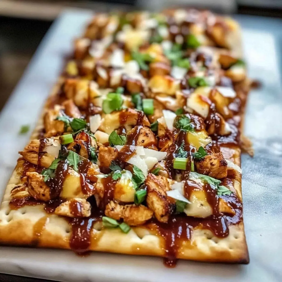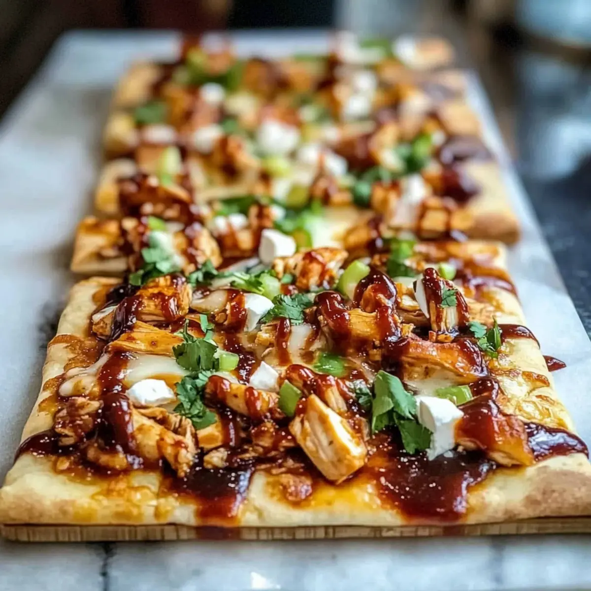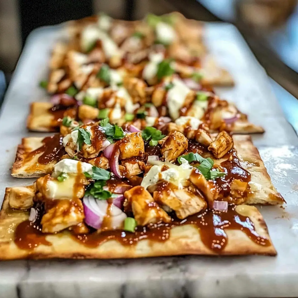 Jump to Recipe Print RecipeCooking should never feel like a chore, especially on busy weeknights. That’s why I’m thrilled to share my High Protein BBQ Chicken Flatbread, a dish that perfectly marries convenience with satisfaction. In just 20 minutes, you can have a crispy flatbread topped with tender grilled chicken, tangy BBQ sauce, and melty Colby Jack cheese, delivering a whopping 30 grams of protein per serving. It’s not only quick and delicious but also a nourishing alternative to those fast-food cravings that sneak up on us. Whether you’re feeding hungry teenagers or simply want a well-balanced meal that’s easy to whip up, this recipe will become a go-to in your kitchen. Ready to make mealtime an adventure? Let’s dive into the step-by-step! Why Choose High Protein BBQ Chicken Flatbread? Convenience: This recipe is a lifesaver for busy nights, taking just 20 minutes from prep to plate. Protein-Packed: With around 30 grams of protein per serving, it’s ideal for those looking to fuel up healthily. Flavor Explosion: The combination of smoky BBQ sauce and melty cheese creates a taste that’s hard to resist. Customizable: Feel free to swap in different cheeses or add spicier jalapeños for a personalized twist! Family-Friendly: It’s a hit with everyone, making it an excellent choice for satisfying even the pickiest eaters. Pair this with a fresh arugula salad or enjoy these delicious flavors with Honey Butter Chicken for a full, balanced meal. High Protein BBQ Chicken Flatbread Ingredients • Here’s everything you need to create this flavorful, high-protein masterpiece! For the Flatbread Flatbread crusts – Use store-bought for a quick base or make your own for a personal touch. For the Toppings BBQ sauce – Choose your favorite brand or whip up a homemade version to control sweetness and tang. Diced grilled chicken or rotisserie chicken – A fantastic protein source; rotisserie is super convenient! Shredded Colby Jack cheese – Melts beautifully; substitute with cheddar or mozzarella if you prefer. Chopped bell peppers – They add brightness and crunch; feel free to add jalapeños for a spicy twist! Thinly sliced green onions – Fresh garnish to elevate flavor and presentation. Enjoy crafting this amazing High Protein BBQ Chicken Flatbread! Step‑by‑Step Instructions for High Protein BBQ Chicken Flatbread Step 1: Preheat the Oven Start by preheating your oven to 425°F (220°C). If you’re using a pizza stone, place it in the oven as it heats up. This will help achieve that perfect crispy texture on your flatbread. Allow the oven to fully preheat for about 10-15 minutes, ensuring you’re ready for the next steps. Step 2: Prepare the Flatbread While the oven is heating, arrange the flatbread crusts on two baking sheets, ensuring they have enough space between them. To prevent sticking, lightly dust each crust with cornmeal; this adds a delightful crunch. This preparation sets the stage for your High Protein BBQ Chicken Flatbread to shine! Step 3: Spread the BBQ Sauce Grab your favorite BBQ sauce and evenly spread a generous layer over each flatbread, leaving about half an inch of border around the edges. This will prevent any sogginess while baking. Use the back of a spoon for smooth application, making sure every bite will be packed with rich flavor. Step 4: Add the Cheese Sprinkle the shredded Colby Jack cheese generously over the BBQ sauced flatbreads. Be careful to avoid the edges, as you want the cheese to melt beautifully without spilling over. The meltiness of the cheese will be an inviting feature of your High Protein BBQ Chicken Flatbread once baked. Step 5: Distribute the Chicken and Peppers Evenly distribute the diced grilled chicken and chopped bell peppers on top of the cheese, ensuring every corner has its share. This layering not only enhances flavor but also adds vibrant color to your dish. The combination of protein and freshness is crucial for your tasty flatbread! Step 6: Bake to Perfection Carefully place the baking sheets in the preheated oven and bake for 12-14 minutes. Keep an eye on the flatbreads; you’re looking for bubbling cheese and golden, crispy edges. The aroma will fill your kitchen, hinting that your High Protein BBQ Chicken Flatbread is almost ready! Step 7: Rest and Garnish After baking, take the flatbreads out of the oven and let them rest for 1-2 minutes. This pause allows the flavors to settle and makes slicing easier. Once rested, garnish with thinly sliced green onions for an extra pop of color and flavor. Step 8: Slice and Serve Use a sharp knife or pizza cutter to slice your High Protein BBQ Chicken Flatbread into desired portions. Serve warm and immediately enjoy this hearty, flavorful meal that is sure to please everyone at the table! Storage Tips for High Protein BBQ Chicken Flatbread Fridge: Store any leftover High Protein BBQ Chicken Flatbread in an airtight container for up to 3 days to maintain freshness. Freezer: If you want to enjoy this delicious flatbread later, you can freeze unbaked, assembled flatbreads for up to one month. Just add extra baking time when cooking from frozen. Reheating: For the best texture, reheat baked flatbread in a 350°F oven for about 10-15 minutes, until warmed through and the cheese is melty again. Room Temperature: If left out, consume any flatbread within 2 hours to ensure food safety. High Protein BBQ Chicken Flatbread Variations Feel free to get creative and customize your High Protein BBQ Chicken Flatbread to suit your taste and dietary needs! Cheese Swap: Substitute Colby Jack with cheddar, pepper jack, or mozzarella for a different flavor profile. Spicy Upgrade: Add sliced jalapeños or a sprinkle of red pepper flakes for an extra kick that will awaken your taste buds. Vegetarian Option: Replace the chicken with grilled portobello mushrooms or a mix of your favorite veggies for a hearty meat-free meal. Herb Infusion: Incorporate fresh herbs like cilantro or basil on to
