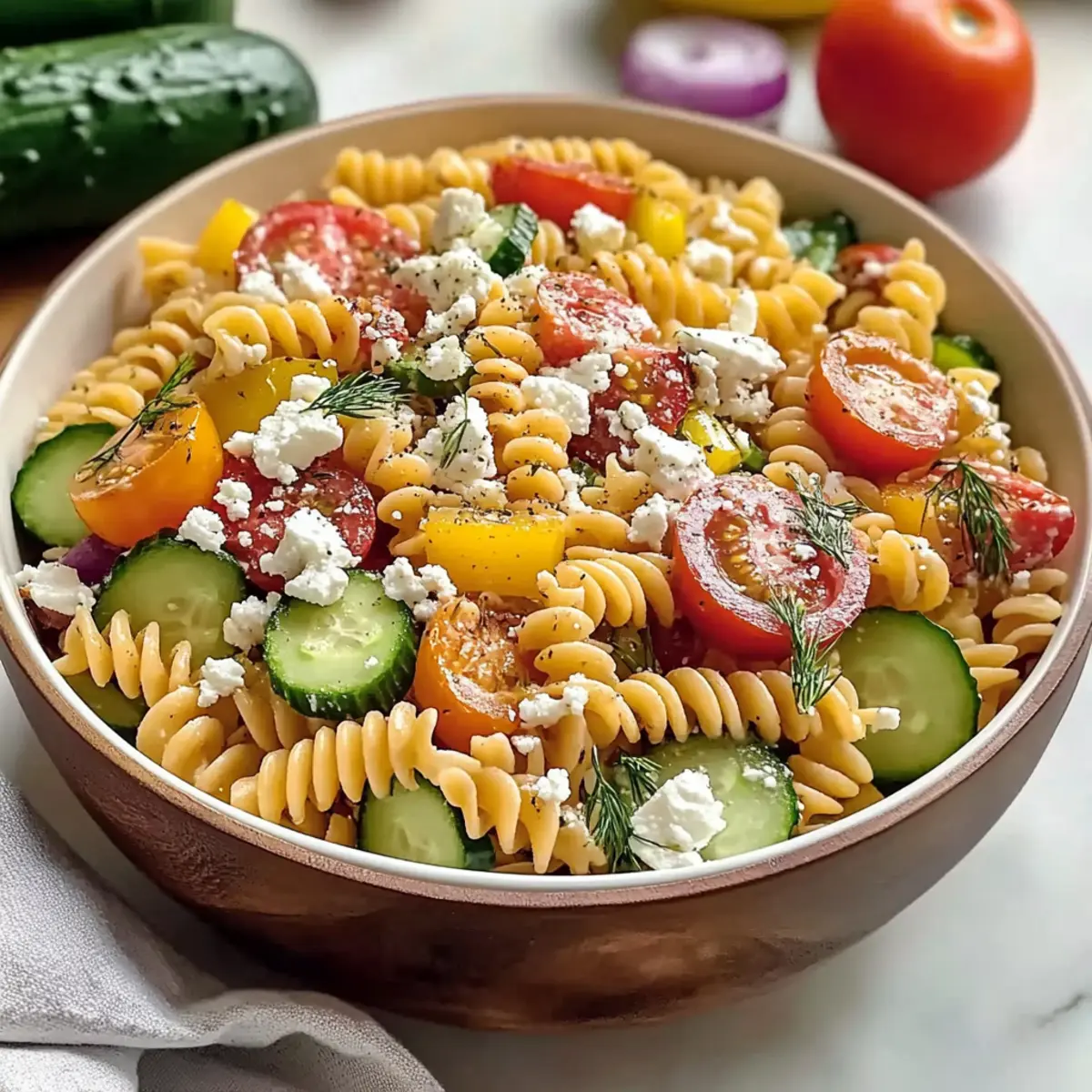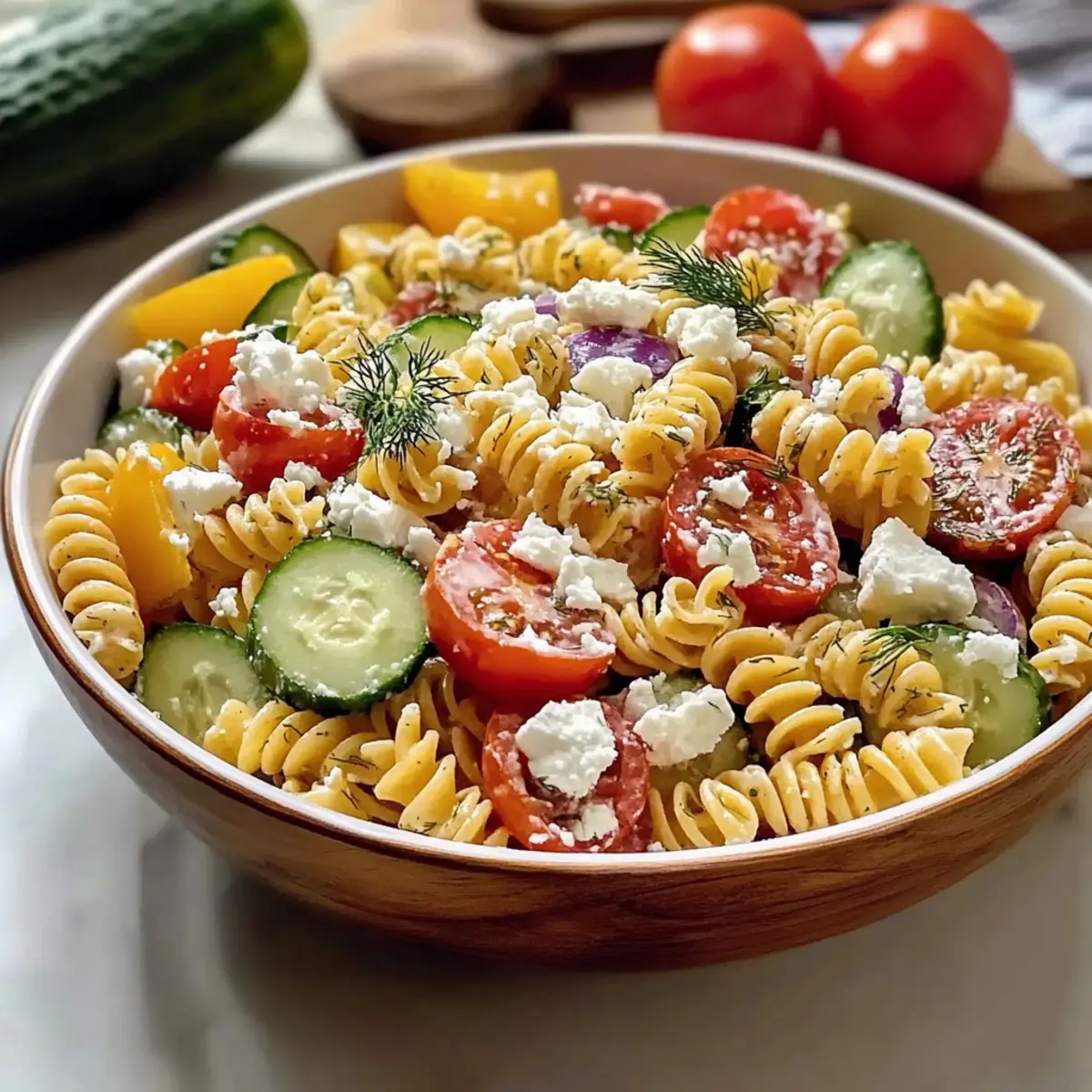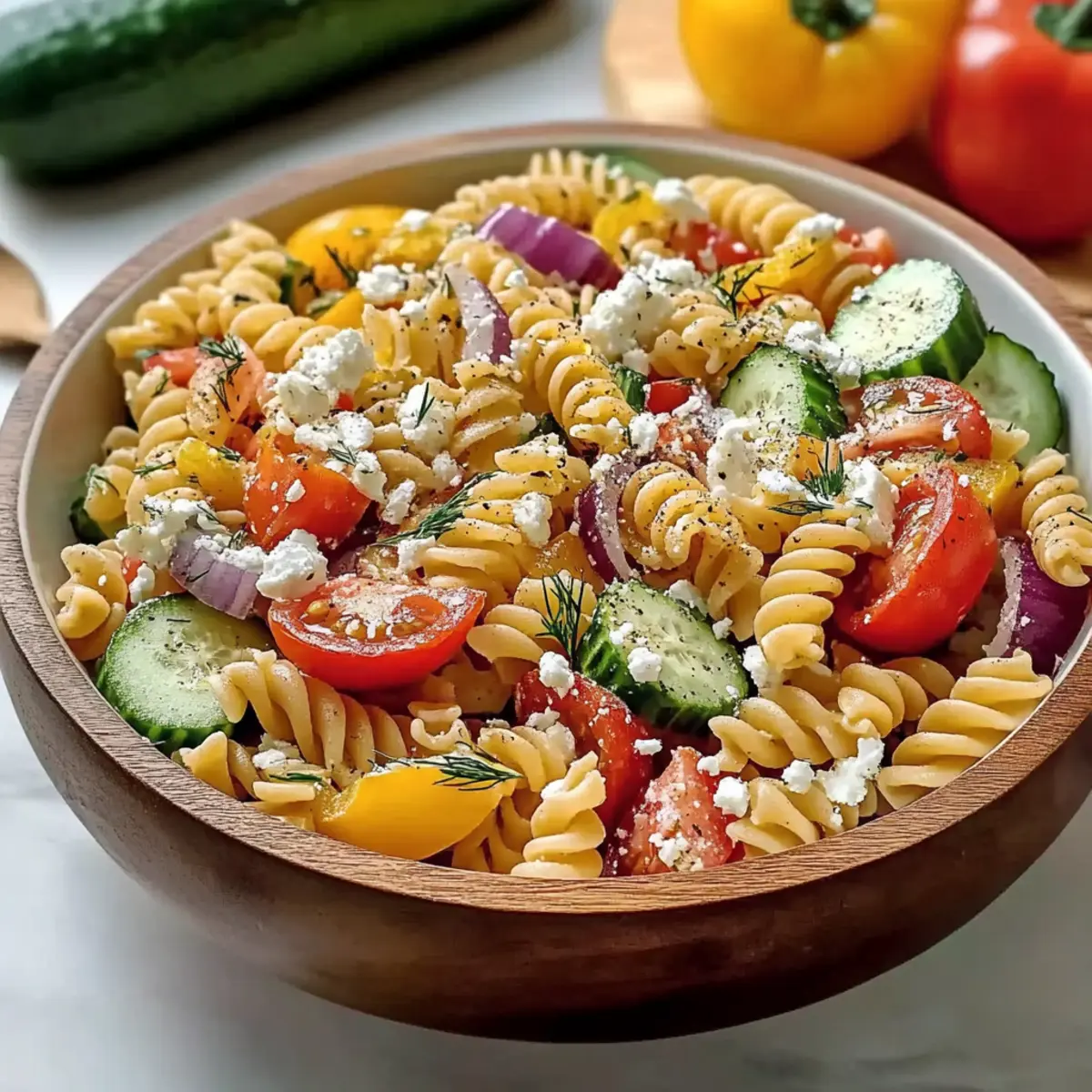 Jump to Recipe Print RecipeAs I stirred the colorful medley of crisp cucumbers, juicy tomatoes, and vibrant bell peppers, I couldn’t help but feel excited about my latest creation: a High Protein Greek Pasta Salad. This dish isn’t just a wholesome meal; it’s a tapestry of flavors and textures that transforms a simple weeknight dinner into a Mediterranean feast. What I love most is how quick it is to whip up, making it perfect for meal prep or a light lunch that keeps me energized throughout the day. Plus, it features protein-packed elements that satisfy my cravings while ensuring I stick to my healthy eating goals. Have you ever tasted a salad that makes you feel so good after every bite? Let’s dive into this delightful recipe that’s sure to become a repeat favorite in your kitchen! Why choose High Protein Greek Pasta Salad? Nutrient-Packed Delight: This salad offers a satisfying boost of protein from hearty pasta and feta, perfect for those seeking nutritious meals. Ultimate Meal Prep: Quick to prepare, it can be made ahead and stored for days, making it an easy grab-and-go meal option that fits your busy lifestyle. Flavor Explosion: Experience a symphony of flavors with crunchy veggies, tangy dressing, and savory feta, making this more than just a side dish. Versatile and Fun: Swap in seasonal vegetables or add proteins like grilled chicken for variety, keeping your lunch interesting. Crowd-Pleasing: Perfect for potlucks and backyard barbecues, it’s sure to impress guests along with other favorites like Egg Pasta Salad or Cucumber Shrimp Salad. High Protein Greek Pasta Salad Ingredients For the Salad • Pasta (16 oz; Barilla Protein+) – The heartiness of this pasta provides a protein boost and keeps you full. • Cucumber (1) – Adds a refreshing crunch to balance the salad. • Tomatoes (1 pint) – Provides juiciness that brightens every bite. • Red Bell Pepper (1) – Sweetness and vibrant color enhance the dish’s appeal. • Yellow Bell Pepper (1) – Adds mild sweetness; you can skip it if needed. • Red Onion (1) – Introduces a sharp bite for added flavor depth. • Feta Cheese (5 oz; Athenos crumbles) – Creamy and salty, this cheese ties the salad together. • Fresh Dill (2 tbsp chopped) – Brightens the salad with an herbal note; parsley works too. For the Dressing • Olive Oil (2/3 cup) – This rich base emulsifies the dressing perfectly. • Red Wine Vinegar (1/2 cup) – Balances flavors with necessary acidity. • Lemon Juice (1, freshly squeezed) – Enhances freshness and brightness in each bite. • Oregano (1 tbsp) – Infuses Mediterranean flavor, adding to the salad’s authenticity. • Garlic Powder (1/2 tsp) – Introduces savory depth, perfect for the dressing. • Salt (1/4 tsp) and Pepper (1/4 tsp) – Essential for bringing all the flavors together; adjust to your liking. Feel free to mix and match ingredients to personalize your High Protein Greek Pasta Salad—it’s as versatile as your creativity allows! Step‑by‑Step Instructions for High Protein Greek Pasta Salad Step 1: Prep Vegetables Begin by washing and preparing your vegetables for the High Protein Greek Pasta Salad. Peel and slice the cucumber, then dice the red and yellow bell peppers into bite-sized pieces. Quarter and thinly slice the red onion, and halve the tomatoes to reveal their juicy interiors. Finally, chop the fresh dill and crumble the feta cheese, setting each aside in separate bowls for easy assembly. Step 2: Cook Pasta In a large pot, bring salted water to a rolling boil over high heat. Add 16 oz of Barilla Protein+ pasta and cook for 9 to 10 minutes, or until al dente—tender yet firm to the bite. Once cooked, drain the pasta in a colander, and rinse it under cold water to cool it down quickly and stop the cooking process, ensuring it retains the perfect texture for your salad. Step 3: Make Dressing In a medium bowl, whisk together 2/3 cup of olive oil, 1/2 cup of red wine vinegar, and the freshly squeezed juice of one lemon until well emulsified. Then, add 1 tablespoon of oregano, 1/2 teaspoon of garlic powder, and a pinch of salt and pepper to taste. Mix thoroughly to combine all flavors, creating a bright, zesty dressing that will bring your High Protein Greek Pasta Salad to life. Step 4: Combine Ingredients In a large mixing bowl, combine the cooled pasta with the prepared vegetables: cucumber, bell peppers, red onion, and tomatoes. Pour your freshly made dressing over the mixture and toss gently with a spatula, ensuring every piece is well coated. Finally, fold in the crumbled feta and chopped dill carefully to preserve their textures, allowing all the flavors to meld beautifully. Step 5: Rest & Chill Let your High Protein Greek Pasta Salad rest for at least 15 to 20 minutes to allow the flavors to harmonize. For maximum deliciousness, cover the salad and refrigerate it for up to 4 hours before serving. This chilling time enhances the taste, making it refreshing and perfect for meal prep or a quick, nutritious lunch option. What to Serve with High Protein Greek Pasta Salad This vibrant dish deserves delightful companions that enhance its flavors while creating a satisfying meal experience. Grilled Chicken: Juicy grilled chicken adds a savory protein boost, perfectly complementing the salad’s fresh elements and making it a complete meal. Garlic Bread: Warm, crispy garlic bread provides a comforting crunch that contrasts beautifully with the cool, crunchy salad. Each bite offers a satisfying textural balance. Mediterranean Quinoa: This nutty, protein-rich side brings a delightful chew and complements flavors with its herbs and spices, enhancing the overall Mediterranean theme. Hummus and Pita Chips: Creamy hummus paired with crispy pita chips makes for an excellent appetizer, offering a smooth counterpart to the salad’s textures. Chilled White Wine: A glass of chilled Sauvignon Blanc or a light Pinot Grigio elevates the meal, enhancing the sala