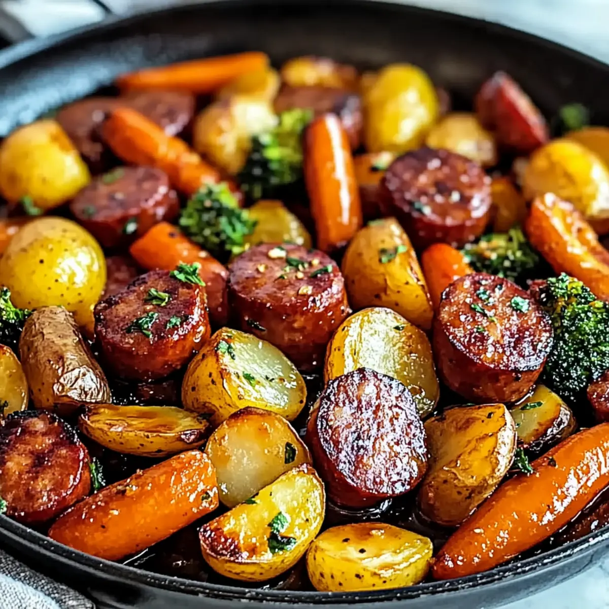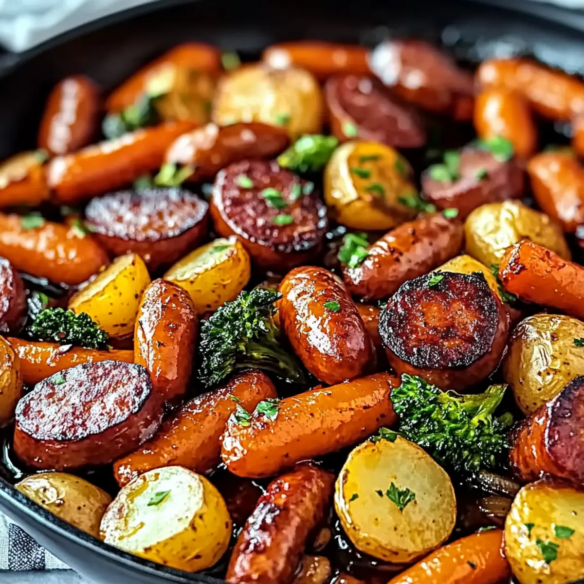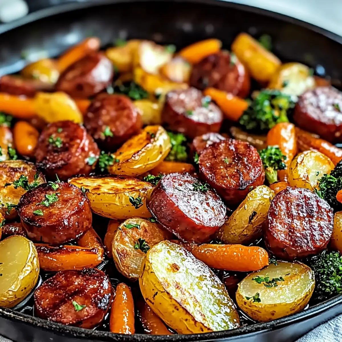 Jump to Recipe Print RecipeAs the sun sets and the evening rush begins, the kitchen becomes a little sanctuary where magic happens. This One-Pan Honey Garlic Kielbasa & Veggies recipe is my go-to for those busy weeknights when I crave something nutritious yet quick. The delightful combination of sweet honey and savory garlic transforms humble kielbasa and colorful veggies into a meal the whole family will adore. With just one pan and minimal cleanup, you’ll not only save time but also whip up a dish that’s packed with protein and flavor. Ready to fill your home with irresistible aromas and satisfy hungry hearts? Let’s dive into this easy and customizable recipe that’s sure to become a weeknight favorite! Why is One-Pan Dinner So Appealing? Simplicity makes this recipe a breeze, allowing anyone to create a delicious meal without fuss. Flavorful honey and garlic meld together beautifully with the kielbasa, giving each bite an irresistible taste. Customizable to your family’s preferences, you can swap in seasonal vegetables or proteins you enjoy. Quick and convenient, this dish is perfect for busy weeknights when time is tight but satisfaction is essential. Pair it with a side of Cheesy Garlic Breadsticks for a complete dinner that everyone will love! Honey Garlic Kielbasa & Veggies Ingredients For the Kielbasa & Veggies • Kielbasa – A protein-rich sausage that provides hearty flavors and is best sourced from quality brands. • Honey – Offers a delightful sweetness that perfectly balances the garlic; consider using local honey for depth. • Garlic – Elevates the dish with aromatic power; feel free to adjust the quantity to suit your taste. • Soy Sauce – Introduces umami and saltiness to the dish; opt for low-sodium varieties for a healthier choice. • Bell Peppers (Red & Yellow) – These vibrant veggies add crunch and essential vitamins; zucchini or asparagus are great alternatives. • Baby Carrots – Deliver natural sweetness and crisp texture; regular carrots can be used with slight adjustments in cooking time. • Baby Potatoes – Bring heartiness to the dish; swap in sweet potatoes for added sweetness and variation. • Olive Oil – Key for cooking and flavor enhancement; other light oils like avocado oil can work well too. For Garnish • Fresh Parsley or Green Onions – Enhance presentation and freshness; a sprinkle will elevate the dish’s visual appeal. Get ready to enjoy the delightful and protein-packed Honey Garlic Kielbasa & Veggies, where each ingredient plays a role in creating a family-friendly meal that’s both nutritious and delicious! Step‑by‑Step Instructions for Honey Garlic Kielbasa & Veggies Step 1: Preheat the Oven Begin by preheating your oven to 400°F (200°C). This crucial first step ensures that your Honey Garlic Kielbasa & Veggies will roast perfectly, creating that mouthwatering caramelization on the kielbasa and tenderness in the vegetables. Allow the oven to fully heat while you prepare the rest of the ingredients. Step 2: Prepare the Ingredients In a large mixing bowl, combine the sliced kielbasa, bell peppers, baby carrots, and baby potatoes. Drizzle the mixture generously with olive oil, honey, and soy sauce, and add the minced garlic. Toss everything together until each piece is well coated, making sure to distribute the flavors evenly throughout the Honey Garlic Kielbasa & Veggies. Step 3: Arrange on the Baking Sheet Line a baking sheet with parchment paper for easy cleanup. Carefully spread the kielbasa and vegetable mixture evenly onto the sheet in a single layer. This step allows for optimal roasting, ensuring that each bite is infused with the sweet and savory glaze, and the vegetables become beautifully tender while avoiding overcrowding. Step 4: Roast in the Oven Place the baking sheet in your preheated oven and roast for 20-25 minutes. Remember to stir the mixture halfway through for even cooking. You’ll know your Honey Garlic Kielbasa & Veggies are ready when the kielbasa turns golden and slightly caramelized while the vegetables are tender and vibrant in color. Step 5: Garnish and Serve Once roasting is complete, remove the baking sheet from the oven and let it cool for a minute. To finish, sprinkle freshly chopped parsley or green onions over the dish for a pop of freshness and color. Serve the Honey Garlic Kielbasa & Veggies hot, and enjoy this delightful meal with your family! Expert Tips for Honey Garlic Kielbasa & Veggies Uniform Chopping: Ensure all vegetables are cut to similar sizes for even cooking and to avoid any mushiness in the Honey Garlic Kielbasa & Veggies. Watch the Roasting Time: Keep an eye on the dish while it roasts; overcooking can lead to dried-out kielbasa and burnt veggies. Substitutions Matter: Feel free to swap out bell peppers for your favorites like zucchini or asparagus, enhancing the versatility of this Honey Garlic Kielbasa & Veggies meal. Easy Cleanup: Use parchment paper on your baking sheet for hassle-free cleanup and to prevent sticking. Pre-Prep for Convenience: Chop and prepare your ingredients a day in advance to make assembly super quick during busy weeknights. Make Ahead Options These One-Pan Honey Garlic Kielbasa & Veggies are perfect for those busy nights when you need a quick and satisfying meal! You can chop all your vegetables, including bell peppers, baby carrots, and potatoes, up to 24 hours in advance; simply store them in an airtight container in the refrigerator to maintain freshness. You can also slice the kielbasa ahead of time and keep it separate. When you’re ready to prepare dinner, just combine the prepped ingredients with the honey, soy sauce, and garlic before roasting as directed. This way, you’ll have a delicious, nutritious meal ready in no time, just as flavorful as if you had made it fresh! Honey Garlic Kielbasa & Veggies Variations Get ready to personalize your dish and explore new flavors while enjoying this delightful recipe! Chicken Sau
