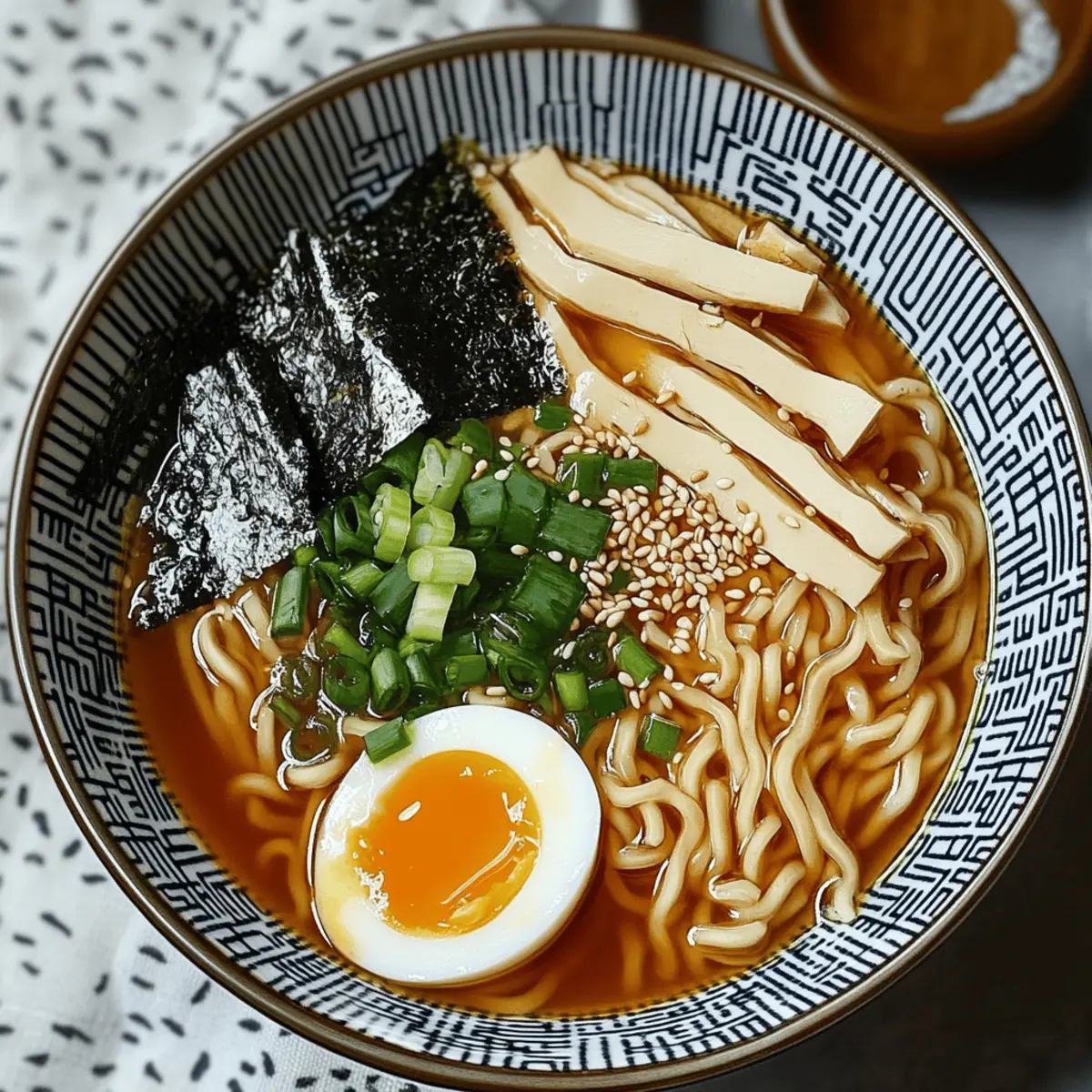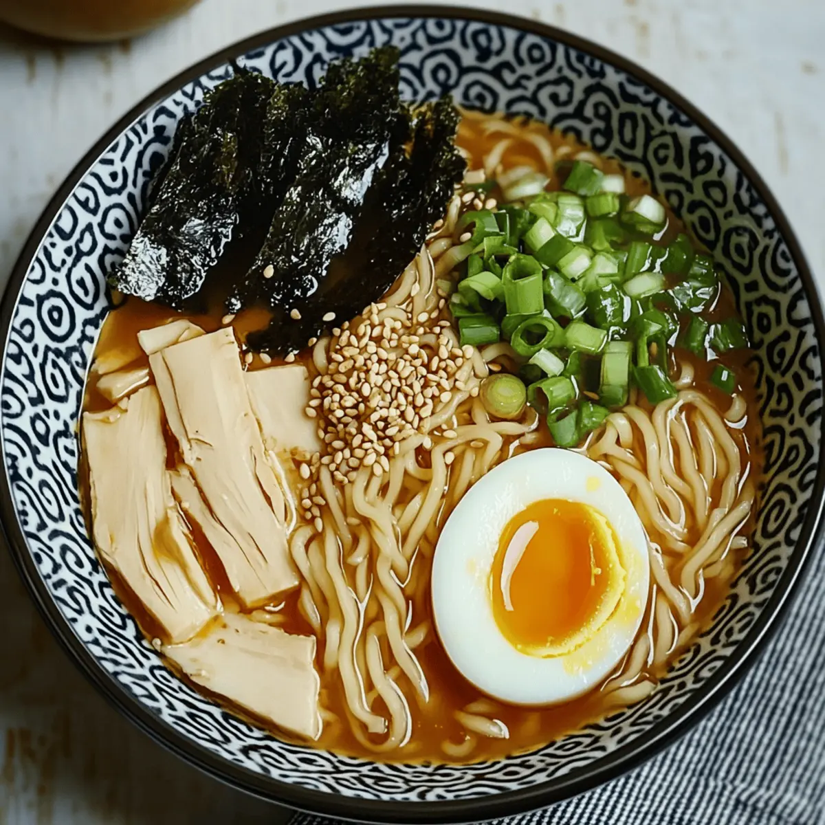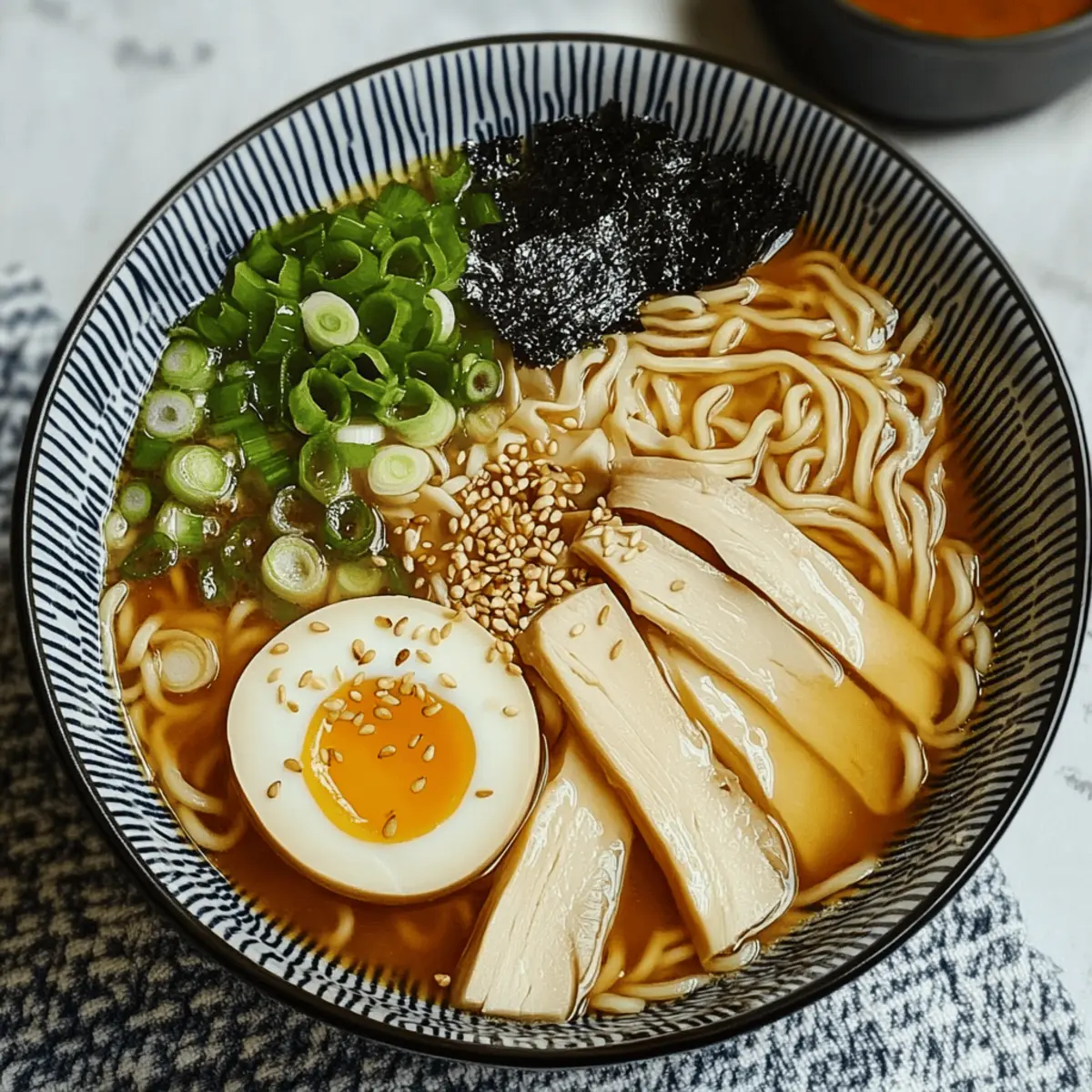 Jump to Recipe Print RecipeAs the steam swirls and a savory aroma fills the air, I can’t help but feel transported to a cozy ramen shop in the heart of Japan. In mere minutes, you can whip up an enticing bowl of Instant Pot Miso Ramen with Homemade Chicken Broth that brings comfort and warmth right to your dinner table. This soulful dish not only allows for quick preparation but also boasts incredible versatility with vegetarian and gluten-free options. With rich umami flavors, silky noodles, and the delightful addition of soft-boiled eggs, each spoonful is a gratifying experience. Why not take a moment to indulge in this delightful culinary adventure and discover just how easy it is to elevate your weeknight dinners? Why Choose Instant Pot Miso Ramen? Quick Prep: This recipe comes together in no time, making it perfect for busy weeknights. Customizable Flavor: Adjust the ingredients to suit your taste—go vegetarian, gluten-free, or add a spicy kick! Comforting Dish: The rich broth and tender noodles deliver the warm, satisfying flavors of your favorite ramen shop. Simple Ingredients: With just a few staple items, this dish is not only easy but also wallet-friendly—perfect for everyone! Make Ahead: Prepare the broth in advance to save time, or whip up a batch for meal prep, just like I do with my Crock Pot Cheeseburger Soup. Instant Pot Miso Ramen Ingredients For the Broth • Chicken Carcass – Base for a flavorful broth; substitute with vegetable broth for a vegetarian option. • Onion – Provides a savory foundation; can substitute with shallots for a milder flavor. • Garlic – Adds vibrant pungency; use fresh garlic for the best results. • Ginger – Infuses warmth and zest; fresh ginger is recommended. • Water – Essential for broth consistency; using filtered water enhances the taste. • White Miso Paste – Key for richness and texture in broth; red miso can deepen the flavor profile. For Seasoning • Soy Sauce – Introduces umami; choose low-sodium soy sauce for a lighter dish. • White Vinegar – Balances flavors; rice vinegar is a suitable substitute. • Chili Oil – Adds heat; adjust according to personal preference. For Toppings • Eggs – For soft-boiled toppings; marinated tofu can replace for a vegan option. • Shiitake Mushrooms – Provide earthy flavor; substitute with any mushroom or omit. • Shallots – Contributes sweetness; can replace with onions. • Green Onions – Thinly sliced for garnish; adds a fresh touch and enhances visual appeal. • Toasted Sesame Seeds – Adds crunch and visual appeal. • Seaweed (Nori or Wakame) – Elevates the presentation and adds texture. For Cooking • Cooking Oil – Needed for sautéing; sesame oil adds a flavorful twist. • Noodles – Essential for your Instant Pot Miso Ramen; use regular or gluten-free noodles as desired. Indulging in this Instant Pot Miso Ramen is a flavorful journey you shouldn’t miss! Step‑by‑Step Instructions for Instant Pot Miso Ramen Step 1: Prepare Broth Begin by placing the chicken carcass, chopped onion, crushed garlic, ginger slices, and 6 cups of filtered water into the Instant Pot. Secure the lid tightly, ensuring the steam valve is closed. Set to pressure cook on high for 1 hour. Listen for the beep indicating cooking is complete, then allow the pot to naturally release pressure for a rich, flavorful broth. Step 2: Soft-Boil Eggs While the broth is cooking, prepare the soft-boiled eggs by bringing a small pot of water to a gentle boil. Carefully add the eggs and cook for exactly 7 minutes for that perfect, creamy center. After cooking, transfer the eggs to an ice bath for a few minutes to halt the cooking process. Once cool, peel the shells and marinate them in soy sauce to add a savory touch. Step 3: Finish Broth Once pressure cooking is complete, carefully release any remaining steam following the manufacturer’s instructions. Open the lid and strain the broth through a fine mesh sieve into a large bowl, discarding the solids. Set aside any pulled chicken that separates from the carcass. This delicious, fragrant broth serves as the foundation for your Instant Pot Miso Ramen. Step 4: Sauté Aromatics In the Instant Pot, switch to sauté mode and heat up a drizzle of cooking oil. Add sliced shiitake mushrooms and sauté for about 3 minutes, or until they start to soften. Next, toss in the minced shallots, garlic, and ginger, stirring for another 2 minutes until the mixture is fragrant and golden. This aromatic blend will deepen the flavors in your ramen broth. Step 5: Combine & Simmer Stir in the white miso paste, soy sauce, white vinegar, and chili oil, ensuring everything is evenly coated. Gradually pour in the strained broth and bring the mixture to a gentle simmer. Keep warming for about 20 minutes, allowing the flavors to meld beautifully. A warm, savory aroma will fill your kitchen, tying all the components of your Instant Pot Miso Ramen together. Step 6: Cook Noodles Add your choice of noodles along with any reserved pulled chicken back into the pot. Cover with the lid and heat everything on high pressure for 5 minutes. The noodles should become tender yet remain perfectly al dente. A quick release after cooking will prepare your ramen for garnishing and serving. Step 7: Garnish & Serve Ladle the steaming delicious ramen into bowls, topping each serving with half of a soft-boiled egg, sliced green onions, toasted sesame seeds, and strips of seaweed. The vibrant colors and enticing aromas make each bowl of Instant Pot Miso Ramen a feast for both the eyes and the spirit. Make Ahead Options Preparing your Instant Pot Miso Ramen in advance is a fantastic way to save time on busy days! You can make the broth up to 3 days before serving; simply refrigerate it in an airtight container to maintain its rich flavor. The soft-boiled eggs can also be prepared 24 hours ahead and stored in soy sauce for that extra umami. For the best results, keep the noodles sep