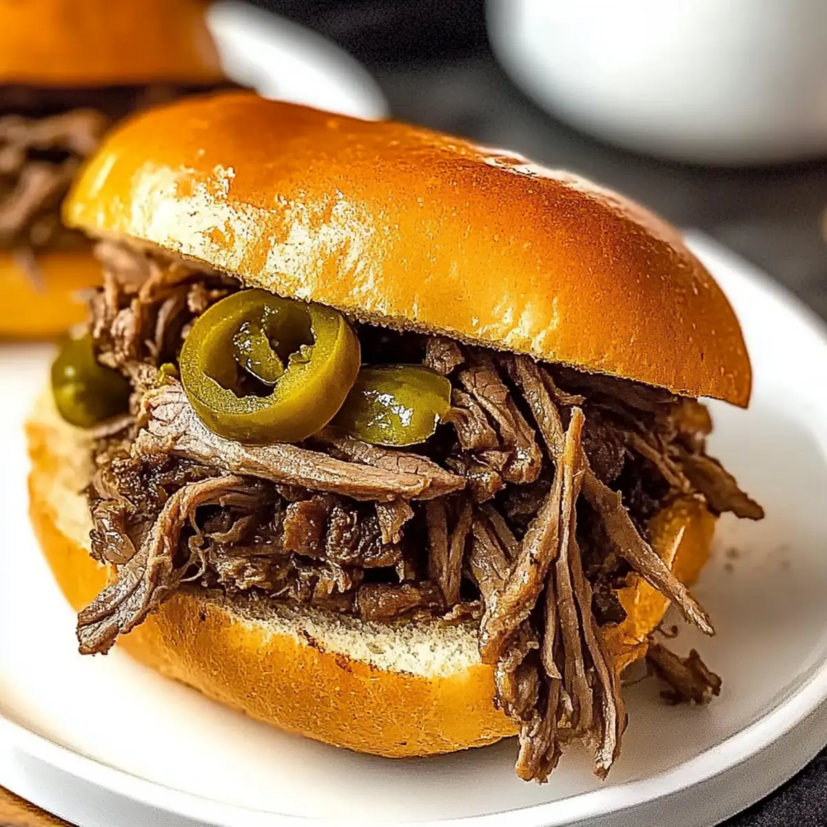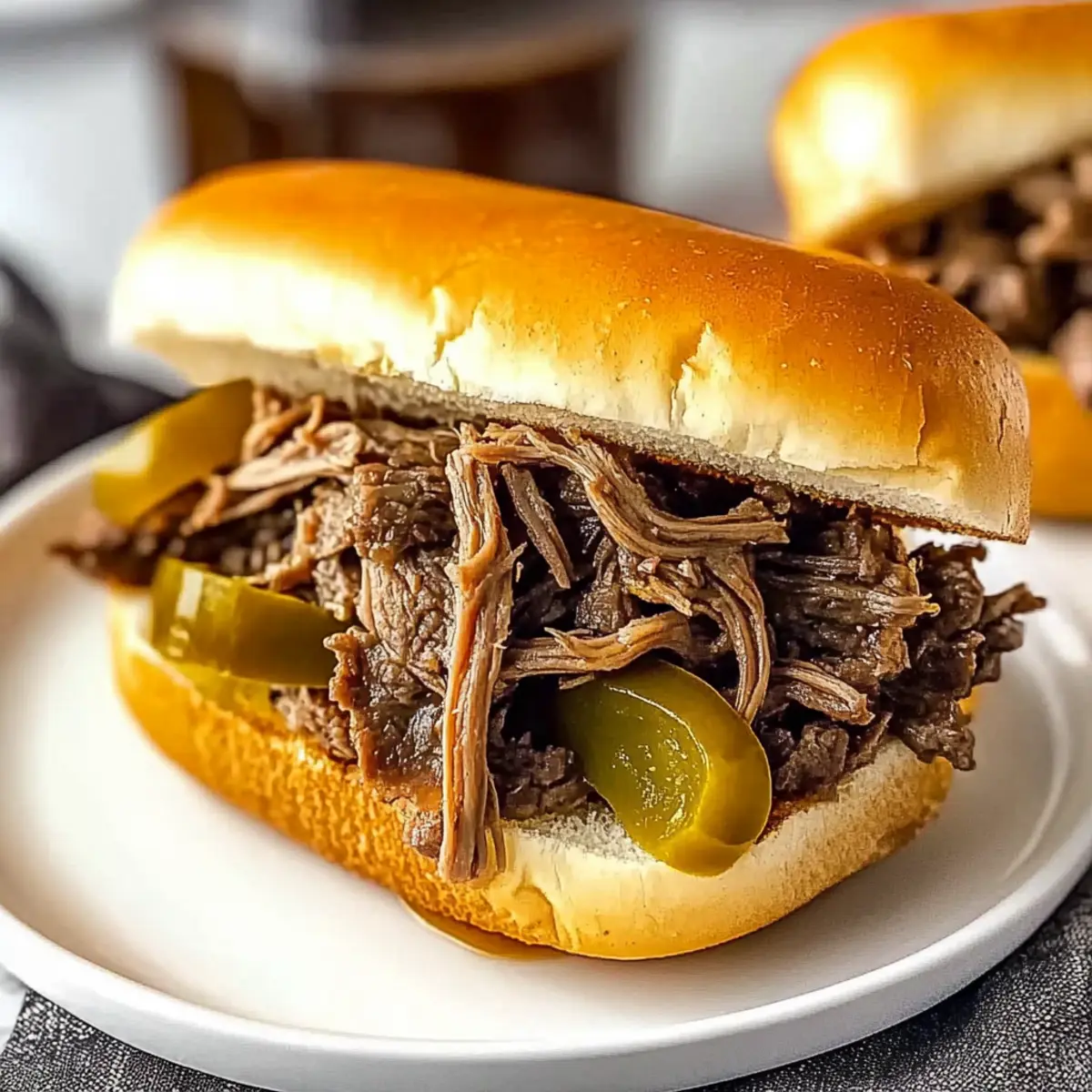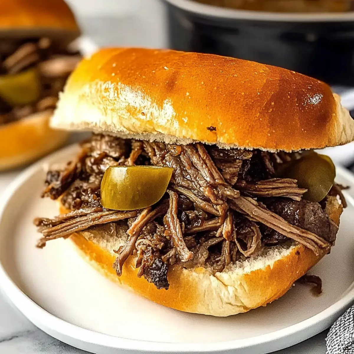 Jump to Recipe Print RecipeAs I stood in my kitchen, the smell of simmering beef filled the air, transporting me to an Italian café bustling with flavor memories. These 5-Ingredient Slow Cooker Italian Beef Sandwiches are my secret weapon for busy weeknights, effortlessly transforming a handful of simple ingredients into a mouthwatering feast. With just five minutes of prep, you can indulge in the ultimate comfort food that’s both satisfying and customizable—a sure way to unite family and friends around the dinner table. Imagine fork-tender beef enveloped in a crusty hoagie roll, with zesty pepperoncini adding that perfect kick. Ready to dive into this deliciousness and bring warmth to your kitchen? Let’s get cooking! Why You’ll Crave These Sandwiches? Simplicity at its Best: With just five easy ingredients, preparation is a breeze—perfect for those hectic evenings. Bursting with Flavor: The tender beef absorbs all the savory spices, creating a rich and tangy filling that’s simply unforgettable. Customization Galore: Feel free to experiment with toppings like sautéed onions or spicy jalapeños to tailor this dish to your taste buds. Crowd-Pleasing Comfort: These sandwiches are ideal for family gatherings or casual get-togethers, guaranteed to impress everyone at the table! Make-Ahead Marvel: Prepare it in the morning, let it slow-cook, and come home to a delicious meal—just like my Cucumber Sandwiches Refreshing. You’ll have more time to enjoy your evening! Italian Beef Sandwiches Ingredients For the Beef • Chuck Roast – The star of the show; look for good marbling for maximum flavor. • Italian Dressing Mix – Elevates the dish effortlessly; swap with homemade for a personal touch. • Pepperoncini Peppers – Provides a zesty punch; save some for topping to add extra crunch. • Beef Broth – Keeps the beef juicy and adds depth; vegetable or chicken broth works well too. For the Rolls • Hoagie Rolls – Perfectly cradle your beef; toasting enhances their deliciousness—try gluten-free for dietary needs. For Topping (Optional) • Provolone Cheese – Melts beautifully over the beef; experiment with mozzarella or pepper jack for different flavors. These Italian Beef Sandwiches not only promise to delight your taste buds but also deliver an easy, satisfying comfort food experience! Step‑by‑Step Instructions for 5-Ingredient Slow Cooker Italian Beef Sandwiches Step 1: Sear the Roast Begin your Italian Beef Sandwiches by heating a skillet over medium-high heat. Once hot, add the chuck roast and sear it for about 5 minutes on each side until a beautiful brown crust forms. This step is crucial as the caramelization adds depth to the flavor. While searing, get ready for the juicy aroma to fill your kitchen! Step 2: Deglaze the Pan With the roast seared, carefully pour in one cup of beef broth into the skillet. Using a wooden spoon, scrape up the delicious browned bits from the bottom of the pan, as these will enhance the flavor of your beef. Allow the mixture to simmer for about one minute, letting those flavors meld before moving on. Step 3: Combine Ingredients Next, transfer the seared roast to your slow cooker. Sprinkle the Italian dressing mix evenly over the top, then add the pepperoncini peppers. Pour the deglazed broth mixture over everything, ensuring the roast is well-covered. This combination will create a savory bath that will infuse the beef with zesty flavors throughout the cooking process. Step 4: Slow Cook Cover the slow cooker and set it to low heat, allowing it to cook for 8 hours. As it cooks, the beef will become fork-tender, soaking up all the delicious flavors. You’ll know it’s ready when you can easily shred it with a fork, filling your kitchen with an irresistible scent that will have everyone eagerly awaiting dinner. Step 5: Prepare Rolls While the beef is cooking, preheat your oven to 350°F (175°C). Once heated, place the hoagie rolls on a baking sheet and toast them for about 5 minutes, or until golden and crispy. This extra step adds a satisfying crunch that perfectly complements the tender beef, enhancing your Italian Beef Sandwiches. Step 6: Assemble Sandwiches When the beef is tender, shred it right in the slow cooker, mixing it with the cooking liquid for extra flavor. Take the toasted hoagie rolls and load them with the shredded beef mixture. If desired, drizzle some of the cooking liquid over the top for added moisture, then finish with a generous slice of provolone cheese, allowing it to melt slightly for that perfect finish. Make Ahead Options These 5-Ingredient Slow Cooker Italian Beef Sandwiches are a dream for meal prep enthusiasts! You can prepare the beef mixture up to 24 hours ahead by searing the roast, deglazing the pan, and combining all ingredients in the slow cooker. Simply refrigerate the mixture (in an airtight container) and cook it the next day. For a longer option, the cooked beef can also be stored in the refrigerator for up to 4 days. When you’re ready to serve, just reheat the beef on low in the slow cooker or in a saucepan, toast your hoagie rolls, assemble the sandwiches, and enjoy a delicious meal that’s just as comforting and flavorful as when freshly made! Expert Tips for Italian Beef Sandwiches Searing Savvy: Don’t rush the searing process; it creates essential flavors that elevate your Italian beef sandwiches. Achieve a rich brown crust for maximum taste. Broth Choices: While beef broth adds depth, feel free to experiment with vegetable or chicken broth to suit your dietary preference without sacrificing flavor. Chill & Store: After cooking, store leftover beef in an airtight container for up to 4 days. Keep the rolls separate to maintain crispness. Freezing Wisdom: If you plan to freeze, let the beef cool completely before transferring it to a freezer bag for up to 3 months—perfect for easy future meals! Layering Flavors: For added texture, consider reserving some pepperoncini to sprink