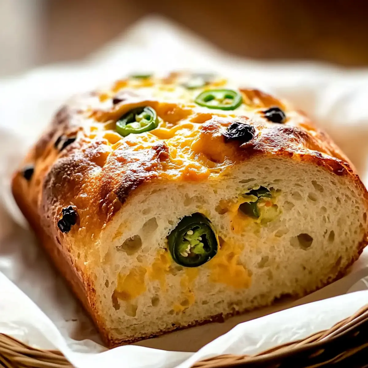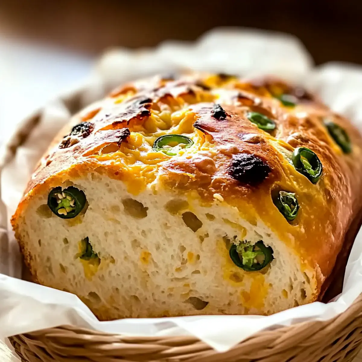 Jump to Recipe Print RecipeThere’s nothing quite like the aroma of warm, homemade bread wafting through the kitchen, especially when it comes with a little extra flair. As I was experimenting with flavors last weekend, it dawned on me just how delicious a loaf of Jalapeno Cheddar Bread could be—blending the comforting essence of freshly baked bread with a spicy kick and creamy cheddar. With its customizable heat levels, this savory bread is not only a show-stopping side dish for soups and salads but also the ultimate snack for gathering around the table. Plus, it’s surprisingly simple to whip up, making for the perfect weekend baking project. Are you ready to slice into a loaf that’s as flavorful as it is fun to prepare? Why is Jalapeno Cheddar Bread a Must-Try? Irresistible Aroma: The scent of baking bread filled with jalapenos and cheddar creates an inviting atmosphere in your kitchen. Customizable Heat: Adjust the spiciness to your liking by varying the jalapeno quantity or swapping in milder peppers, making it perfect for all palates. Simple Prep: With straightforward instructions, even novice bakers can master this delightful recipe effortlessly. Versatile Pairing: Enjoy it warm with butter, or serve it alongside your favorite soups like chili or potato leek for a satisfying meal that brings everyone together. Crowd Pleaser: Whether for casual dinners or festive gatherings, this Jalapeno Cheddar Bread is sure to impress, much like our Apple Zucchini Bread or Fudge Brownie Bread. Leftover Magic: If you have any leftover slices, they can be stored easily and enjoyed later, proving this homemade treat is as practical as it is delicious! Jalapeno Cheddar Bread Ingredients For the Bread All-purpose flour – Essential for structure and stability; turning to bread flour can give a chewier texture. Warm water (110°F) – Activates the yeast for proper rising; ensure it’s warm, not boiling. Active dry yeast – Provides necessary leavening; fresh yeast is key for a light texture. Olive oil – Adds moisture and richness; melted butter can be used for an even richer flavor. Granulated sugar – Feeds the yeast for better rising; keep it minimal to maintain a savory bread. Salt – Enhances flavor and controls yeast activity; crucial for balancing the loaf’s taste. For the Spice Fresh jalapenos – Brings the heat; adjust the amount based on your spice tolerance, or opt for roasted peppers for a milder kick. For the Cheese Shredded cheddar cheese – Adds a creamy texture and rich flavor; feel free to experiment with cheeses like pepper jack for extra spice. Step‑by‑Step Instructions for Jalapeno Cheddar Bread Step 1: Activate Yeast In a small bowl, combine 2 teaspoons of granulated sugar with 1 cup of warm water (110°F). Sprinkle 2 ¼ teaspoons of active dry yeast over the surface and let it sit for 5-10 minutes until the mixture becomes frothy. This bubbling indicates the yeast is alive and ready to help your Jalapeno Cheddar Bread rise beautifully. Step 2: Mix Dry Ingredients In a large mixing bowl, whisk together 3 cups of all-purpose flour and 1 teaspoon of salt. Creating a well in the center allows you to easily incorporate the wet ingredients later. Use a sturdy spoon or spatula to mix, ensuring the salt is evenly distributed for balanced flavor throughout your bread. Step 3: Combine Mixtures Pour the activated yeast mixture into the well of the flour and add 2 tablespoons of olive oil along with ½ to 1 cup of finely chopped fresh jalapenos, depending on your heat preference. Stir gently until a shaggy dough forms, ensuring that all dry flour is absorbed. This marks the beginning of your flavorful Jalapeno Cheddar Bread! Step 4: Knead Dough Transfer the dough onto a floured surface and begin kneading for 8-10 minutes, applying firm pressure and folding the dough back on itself. Continue kneading until the dough becomes smooth and elastic, showing a slight shine. This step develops gluten, which contributes to the chewiness of your Jalapeno Cheddar Bread. Step 5: First Rise Lightly grease a large bowl with olive oil and place your dough inside. Cover it with a clean cloth and let it rise in a warm area for about 1 hour, or until it doubles in size. You’ll know it’s ready when the dough feels airy and puffs up nicely, giving you that fluffy bread texture. Step 6: Shape and Second Rise Once the dough has risen, punch it down gently to release any trapped air. Shape the dough into a loaf and place it on a greased baking sheet. Cover it again with the cloth, allowing it to rise for another hour until it’s doubled in size. This second rise helps achieve a light, fluffy Jalapeno Cheddar Bread. Step 7: Bake Preheat your oven to 375°F (190°C). When ready, place the risen loaf in the oven and bake for 35-40 minutes until the crust turns golden brown. To ensure doneness, carefully check that the internal temperature reaches 190°F-200°F. The irresistible aroma of baking bread will fill your kitchen! Step 8: Cool Once baked, remove the Jalapeno Cheddar Bread from the oven and let it cool on a wire rack for at least 10-15 minutes before slicing. This cooling step is crucial for letting the flavors settle and the texture firm up, giving you perfect, warm slices filled with melty cheddar and spicy jalapenos. What to Serve with Jalapeno Cheddar Bread There’s something wonderfully comforting about pairing this delightful loaf with hearty accompaniments that elevate your meal experience. Creamy Tomato Soup: The rich, tangy flavors of this classic soup complement the spices in the bread, creating a nostalgic dining experience. Think of cozy evenings by the fire, enjoying spoonfuls of soup alongside that warm, cheesy loaf. Spicy Chili: The bold flavors of chili work harmoniously with the heat of the jalapenos in the bread, making each bite a savory delight. This combination warms your spirit and fills your belly, perfect for gatherings or a casual night in. Garden Salad: A fr