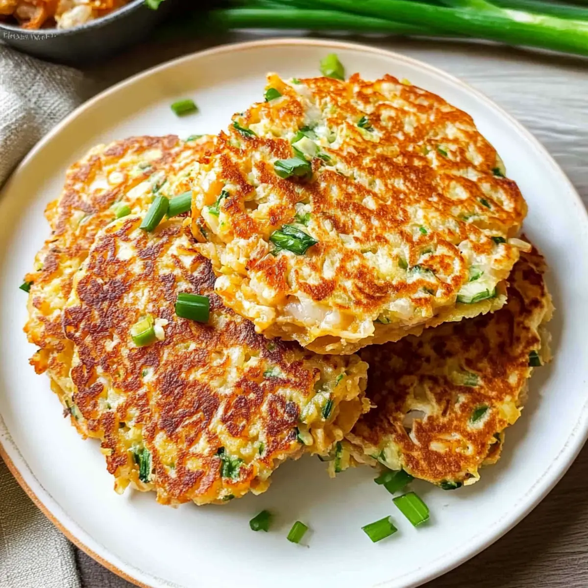 Jump to Recipe Print RecipeThe aroma of sizzles fills the air as I stand over the skillet, the anticipation palpable. There’s something truly magical about Korean Tuna Pancakes, or Chamchijeon, that captures both comfort and delight in every bite. This quick and easy recipe is like a hug on a plate, perfect for those busy weeknights or when a snack attack strikes. With just 15 minutes and a handful of pantry staples, you’ll whip up crispy, protein-packed pancakes that are versatile enough to serve on their own or as a delightful add-in to any meal. Not only will these savory gems satisfy your hunger, but they also offer a wonderful chance to experiment with fresh ingredients you have on hand. Ready to turn your kitchen into a Korean street food haven? Let’s dive into this delightful recipe that’s sure to become a regular in your cooking repertoire! Why are Korean Tuna Pancakes irresistible? Quick to Make: You can prepare these pancakes in just 15 minutes! Perfect for busy evenings or unexpected guests. Savory Bliss: The combination of tuna, veggies, and subtle spices creates a mouthwatering flavor that satisfies the most discerning palettes. Customizable: Feel free to swap in your favorite vegetables or even try canned salmon for a twist on this classic dish. Perfect for Any Meal: Enjoy them as a hearty snack, a side dish, or even nestled inside a burger for a fun fusion twist! Don’t forget to serve with a side of Korean Ramen Grilled for a complete meal experience! Kid-Friendly: Even the pickiest eaters will be reaching for seconds, making this an excellent choice for family dinners. Korean Tuna Pancakes Ingredients • Here’s everything you need to make delightful Korean Tuna Pancakes! For the Batter Vegetable Oil – Use any cooking oil you prefer for frying. Canned Tuna (7 oz) – This is the main protein source, so make sure to drain it well for the best texture. Onion (1/4 medium) – Adds moisture and flavor; shallots can be a nice substitute. Green Onion – Brings a fresh touch and mild flavor; chives work well as an alternative. Carrot/Bell Pepper (30 g) – Adds color and crunch to the pancakes; feel free to use other diced veggies too. Garlic (2 cloves) – Provides great aroma and depth; garlic powder (1/2 tsp) could be a quicker substitute. Large Eggs (2) – These bind the mixture and add richness; don’t skip them! All-Purpose Flour (2 tbsp) – Helps maintain structure; whole wheat or gluten-free flour can be good substitutes. Salt (1/2 tsp) – Enhances flavor; adjust to your taste preference. Black Pepper (1/4 tsp) – Adds a little kick; white pepper is a milder option if preferred. Shredded Cheddar Cheese (2 tbsp, optional) – Adds a creamy richness, though you can substitute with other cheeses. For Serving Ketchup or Soy Sauce – Perfect for dipping; enhances flavor when served with these tasty Korean Tuna Pancakes! Step‑by‑Step Instructions for Korean Tuna Pancakes Step 1: Prepare the Batter In a medium bowl, combine the drained canned tuna, diced onion, chopped green onion, and your choice of diced vegetables like carrot or bell pepper. Add minced garlic, eggs, all-purpose flour, salt, and black pepper. Mix everything together until well combined, ensuring a cohesive mixture that will hold together while frying. Step 2: Heat the Skillet Place a large skillet over medium heat and pour in about two tablespoons of vegetable oil, allowing it to heat for a minute. You’ll know the oil is ready when it shimmers slightly, creating a perfect cooking environment for the Korean Tuna Pancakes. Step 3: Form the Pancakes Using a spoon or a measuring cup, scoop about 3 tablespoons of the tuna batter and gently drop it into the skillet, shaping it into a round pancake. Space these pancakes apart to avoid overcrowding, which ensures they cook evenly without steaming. Step 4: Fry to Perfection Fry each pancake for about 2 to 3 minutes on one side, watching for golden brown edges to form. When the bottoms are nicely crisped, carefully flip them over using a spatula and fry for an additional 2 to 3 minutes on the other side, until both sides are golden and the pancakes are cooked through. Step 5: Repeat the Cooking Process Once the first batch is done, remove the pancakes from the skillet and place them on a paper towel-lined plate to absorb excess oil. If needed, add more oil to the skillet to ensure the next batch fries perfectly. Continue until all the batter is used, maintaining that lovely golden-brown color. Step 6: Serve Hot Serve the Korean Tuna Pancakes hot, either on their own or alongside a small bowl of ketchup or soy sauce for dipping. These savory pancakes are delicious on their own but also make an exciting addition to rice or a sandwich, delivering a delightful culinary experience. Storage Tips for Korean Tuna Pancakes Fridge: Store leftover Korean Tuna Pancakes in an airtight container in the fridge for up to 3-4 days, ensuring they stay fresh and delicious. Freezer: If you want to enjoy them later, freeze the pancakes in a single layer on a baking sheet, then transfer to a freezer bag. They can last up to 1 month. Reheating: To reheat, simply warm them on a skillet over medium heat for 3-4 minutes on each side, or use a microwave for 1-2 minutes until heated through. Enjoy crispy comfort with every bite! What to Serve with Quick & Easy Korean Tuna Pancakes Imagine a vibrant meal that not only bursts with flavor but also paints your table with joy and comfort. Steamy White Rice: A staple that pairs perfectly, the fluffy rice absorbs the savory notes of the pancakes, creating a satisfying contrast. Mixed Green Salad: Light and refreshing, a salad dressed with sesame oil brings a crisp, fresh element that brightens each bite. Toss in some avocado for a creamier texture! Korean Kimchi: This beloved side adds a tangy, spicy kick to the meal, balancing the rich flavors of the tuna pancakes. Plus, it’s packed with probiotics for gut health! Crispy Te