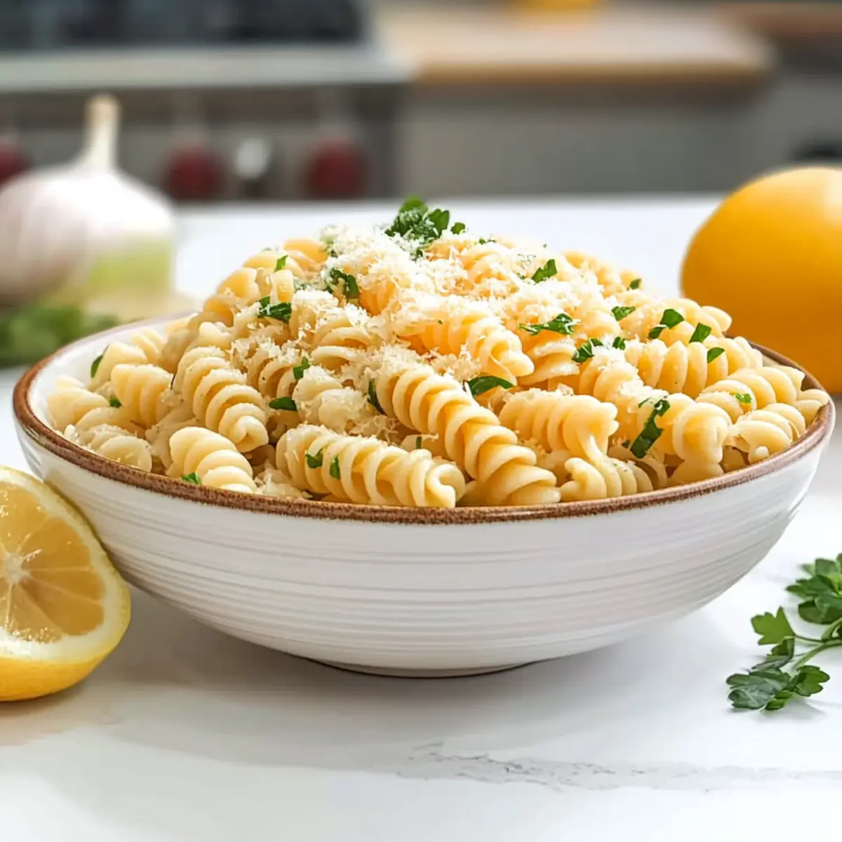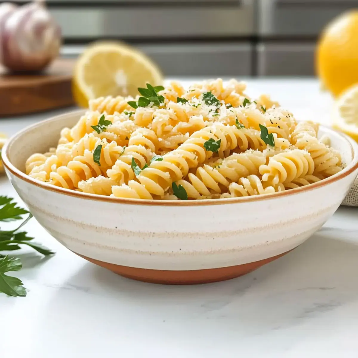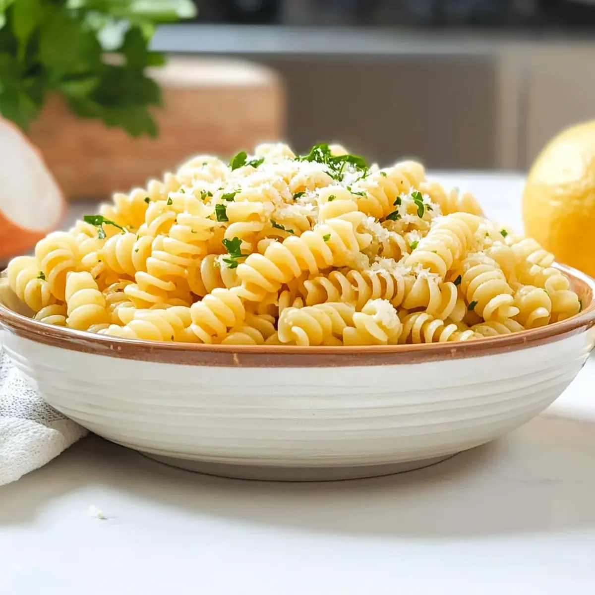 Jump to Recipe Print RecipeAs I tossed the pasta with a splash of zesty lemon juice and a shower of Parmesan, the sunny flavors danced in the air, reminding me of carefree summer days. This Easy Lemon Parmesan Pasta Salad is not just a dish; it’s a celebration of simplicity that makes my heart sing. With quick prep and a vibrant profile, it’s the perfect side for everything from backyard BBQs to family picnics. Plus, it’s so versatile that you can even swap in gluten-free pasta to accommodate your dietary needs! Whether served chilled or at room temperature, this dish promises to brighten any meal vividly. Ready to discover how to whip up this delightful salad in no time? Let’s dive in! Why is this pasta salad a must-try? Simplicity at Its Best: Preparing this Lemon Parmesan Pasta Salad is a breeze, making it perfect for both beginner cooks and seasoned chefs alike. Zesty Flavor Explosion: The combination of fresh lemon juice and cheesy Parmesan offers a bright, mouthwatering taste that awakens the senses. Versatile Dish: Customize with your favorite ingredients—add grilled chicken or veggies from your garden, similar to what we do in our Garlic Parmesan Chicken or mix in some vibrant bell peppers for extra crunch. Ideal for Gatherings: Whether it’s a summer BBQ or a picnic in the park, this salad steals the show and is always a crowd favorite. Time-Saver: Whip it up in under 30 minutes, and consider making it ahead of time for even bolder flavors. Enjoy this delightful side and keep the good times rolling! Lemon Parmesan Pasta Salad Ingredients For the Salad • Rotini Pasta – A corkscrew shape that holds dressing beautifully; can substitute with penne or fusilli if preferred. • Italian Dressing – Convenient and flavorful; choose your favorite brand for the best overall taste. • Lemon Juice – Freshly squeezed for a burst of brightness that elevates your Lemon Parmesan Pasta Salad. • Grated Parmesan Cheese – Adds creamy texture and depth of flavor; be generous for maximum deliciousness! • Fresh Parsley – Chopped to add a pop of color and a refreshing herbal note that brightens the dish. • Garlic Powder – A sprinkle enhances the flavor profile, giving it a subtle kick without being overpowering. • Onion Powder – Complements the garlic and adds a layer of savory richness to the salad. • Kosher Salt – Balances flavors and enhances the overall taste of the dish. • Black Pepper – Adds a mild heat and depth; adjust according to your taste preferences. Optional Add-Ins • Veggies – Bell peppers or blanched asparagus contribute color and nutrition; feel free to get creative with what you have on hand! • Protein – Boost the salad into a main dish by adding cooked shrimp or chicken for an extra satisfying meal. Step‑by‑Step Instructions for Lemon Parmesan Pasta Salad Step 1: Cook the Pasta Begin by bringing a large pot of salted water to a boil over high heat. Add the rotini pasta and cook according to the package instructions, typically 10–11 minutes, until al dente. Once cooked, drain the pasta in a colander and rinse thoroughly with cold water to stop the cooking process and cool it down. Step 2: Prepare the Dressing In a large mixing bowl, combine the prepared Italian dressing, freshly squeezed lemon juice, grated Parmesan cheese, chopped parsley, garlic powder, onion powder, kosher salt, and black pepper. Whisk these ingredients together until the mixture is well blended and smooth. The vibrant flavors will create a delightful base for your Lemon Parmesan Pasta Salad. Step 3: Combine Pasta and Dressing Add the cooled rotini pasta to the bowl with the dressing mixture. Gently stir the pasta with a spatula or wooden spoon, ensuring each piece is thoroughly coated in the dressing. Take a moment to appreciate how the pasta absorbs the zesty flavors, enhancing the overall taste of this refreshing salad. Step 4: Chill or Serve Immediately You can either serve the Lemon Parmesan Pasta Salad immediately for a fresh, bright flavor or cover the bowl with plastic wrap and refrigerate for a couple of hours. Chilling allows the flavors to meld together beautifully, making each bite even more delicious. Remember to stir well before serving to redistribute the dressing evenly. Expert Tips for Lemon Parmesan Pasta Salad Use Fresh Ingredients: Fresh lemon juice and high-quality Parmesan make a noticeable difference in flavor. Avoid bottled lemon juice to keep your Lemon Parmesan Pasta Salad vibrant. Pasta Tips: Undercook the pasta by a minute to maintain its texture when mixed with dressing and added ingredients, ensuring a perfectly chewy bite. Chill Time: Allowing the salad to chill for at least an hour intensifies the flavors. This is a great opportunity to let the dressing infuse every piece of pasta. Mixing Method: When combining the pasta with the dressing, fold gently to minimize breakage and maintain the pasta’s shape, ensuring a beautifully presented salad. Customize with Veggies: Add seasonal vegetables like cherry tomatoes or bell peppers for extra crunch and nutrition. Just be mindful of balance; don’t overpower the pasta! Storage Tips: Store leftovers in an airtight container for up to three days. The flavors might deepen, but add a splash of lemon juice before serving to freshen it up! What to Serve with Easy Lemon Parmesan Pasta Salad Elevate your dining experience with delightful accompaniments that perfectly complement this vibrant dish. Grilled Chicken: Juicy, smoky grilled chicken adds heartiness, making your meal satisfying and full of flavor without overshadowing the salad. Garlic Bread: Crispy, buttery garlic bread is a go-to side that pairs wonderfully with pasta, absorbing all the delicious juices. Caprese Salad: Fresh, vibrant tomatoes and mozzarella play off the lemony pasta beautifully while adding a refreshing texture and taste variation. Corn on the Cob: Sweet, juicy corn on the cob brings a burst of sunshine to your t