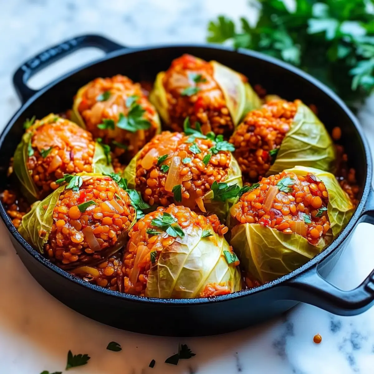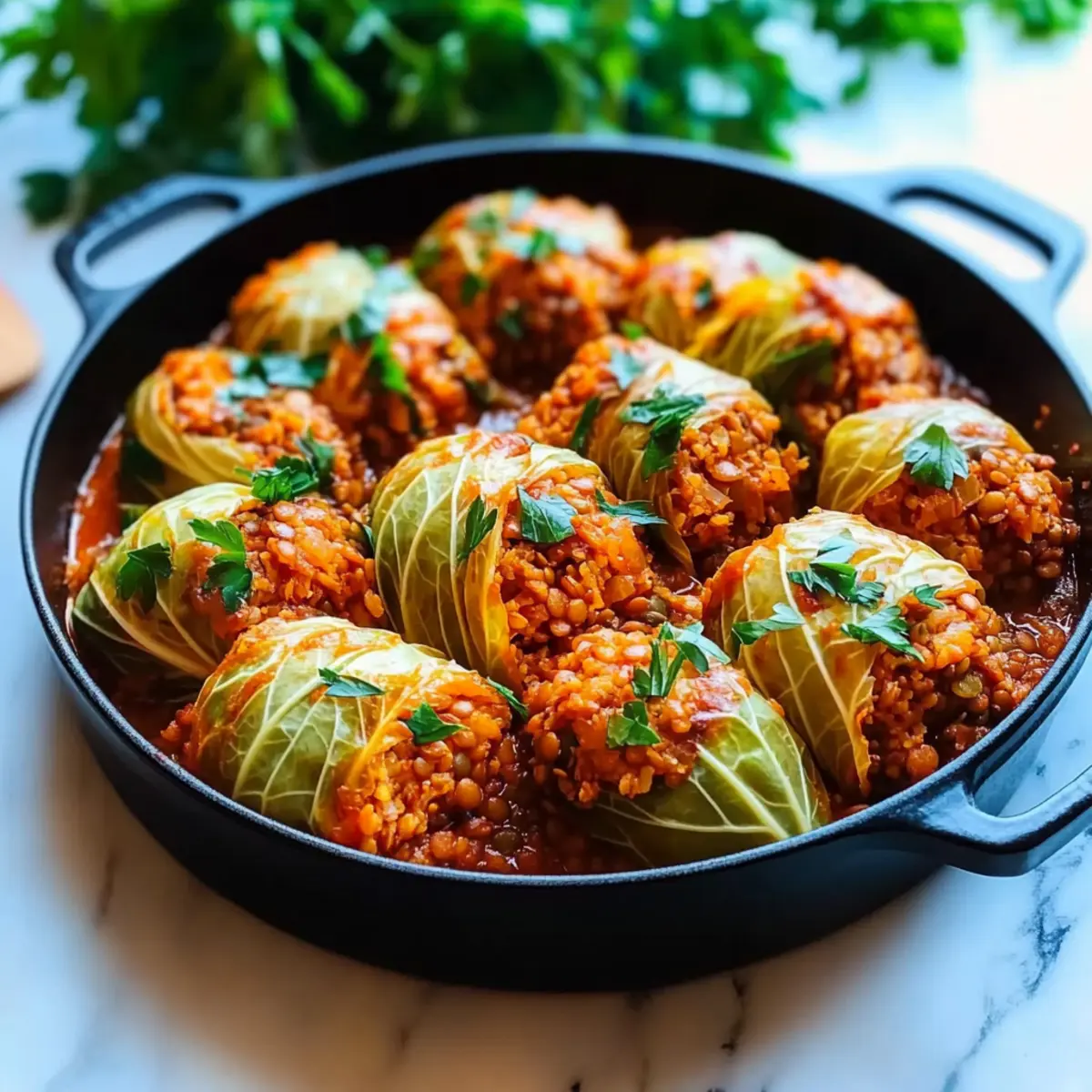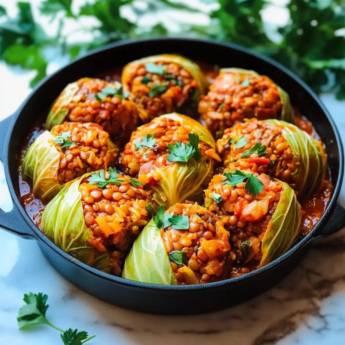 Jump to Recipe Print RecipeAs I navigated the aisles of my local market, the vibrant green of fresh cabbage caught my eye, and a memory sparked—a family tradition of stuffed cabbage rolls. I decided it was time to create my own version: Vegan Lentil and Rice Stuffed Cabbage Rolls. This dish is delightfully straightforward, featuring hearty lentils and wholesome rice wrapped in tender cabbage, making it an ideal option for those busy weeknights or cozy gatherings. Not only are they packed with protein and fiber, but they’re also a fantastic way to bring a touch of comfort to your table while embracing a plant-based lifestyle. Are you ready to roll up your sleeves and create a dish that tantalizes your taste buds? Let’s dive in! Why Are Cabbage Rolls So Comforting? Hearty, wholesome filling: Packed with lentils and rice, these rolls provide a satisfying meal that’s rich in protein and fiber. Bright flavors: Enhanced by spices like smoked paprika and cumin, every bite delivers a burst of savory goodness. Simple preparation: These rolls are easy to assemble, making them a great choice for novice cooks or busy chefs alike. Customizable: Feel free to swap out ingredients based on your preferences—try Basil Beef Rolls for a non-vegan twist or add veggies for extra crunch! Crowd-pleasing dish: Ideal for family dinners or gatherings, these stuffed cabbage rolls are sure to impress your guests. Lentil and Rice Stuffed Cabbage Rolls Ingredients For the Filling • Cooked Lentils – These provide protein and fiber; brown or green lentils work best for a hearty filling. • Cooked Rice – Adds bulk to the filling; feel free to use white, brown, or basmati rice depending on your preference. • Onion – Enhances flavor; finely chop for even cooking, or substitute with shallots for a milder taste. • Garlic – Fresh cloves are preferred for aromatic depth; avoid powdered garlic for optimal flavor. • Ground Cumin – Imparts a warm, earthy flavor; can be swapped with ground coriander for a different profile. • Smoked Paprika – Offers a smoky note to the dish; regular paprika can serve as an acceptable alternative. • Ground Coriander – Complements cumin well; it can be omitted altogether if not available. • Salt and Pepper – Essential for flavor enhancement; adjust according to your taste preferences. • Olive Oil – Ideal for sautéing and adds richness; vegetable oil is a good substitute if needed. For the Cabbage Rolls • Green Cabbage – This is the ideal base for your rolls, but Savoy cabbage is a close alternative if you prefer. For the Sauce • Crushed Tomatoes – These create a saucy base for the rolls, adding acidity and moisture; opt for low-sodium options if preferred. • Dried Oregano – Adds additional flavor; Italian seasoning can be substituted if you want a different seasoning blend. • Sugar – Balances the acidity in the sauce; this is optional and can be adjusted based on your taste. Step‑by‑Step Instructions for Lentil and Rice Stuffed Cabbage Rolls Step 1: Blanch the Cabbage Leaves Bring a large pot of water to a rolling boil over high heat. Carefully immerse the whole head of green cabbage for 3–4 minutes until the outer leaves become tender and pliable. Using tongs, remove the cabbage and let it cool slightly. Peel off 10–12 leaves, setting them aside for later use in your Lentil and Rice Stuffed Cabbage Rolls. Step 2: Sauté the Aromatics In a large skillet, heat 2 tablespoons of olive oil over medium heat. Add the finely chopped onion and sauté for about 3 minutes, or until translucent. Next, stir in the minced garlic and continue to sauté for an additional 1 minute until fragrant, ensuring everything is well combined and aromatic for the filling of the cabbage rolls. Step 3: Combine Filling Ingredients Add the cooked lentils and rice to the skillet with the sautéed onion and garlic mixture. Sprinkle in the ground cumin, smoked paprika, ground coriander, salt, and pepper. Cook the mixture for 2–3 minutes, stirring occasionally, until heated through and the spices are evenly distributed. This flavorful filling will be the heart of your Lentil and Rice Stuffed Cabbage Rolls. Step 4: Prepare the Tomato Sauce Using the same skillet, add a little more olive oil if necessary and sauté additional onion and garlic until softened. Pour in the crushed tomatoes and sprinkle dried oregano, salt, and sugar if using. Simmer the sauce for about 10 minutes over low heat until thickened, allowing the flavors to meld, creating the perfect companion sauce for your cabbage rolls. Step 5: Preheat the Oven While the sauce simmers, preheat your oven to 375°F (190°C). This temperature is ideal for baking your Lentil and Rice Stuffed Cabbage Rolls to perfection, ensuring they become tender while the tops achieve a delightful golden brown finish in the oven. Step 6: Assemble the Cabbage Rolls Lay one cabbage leaf flat on a clean surface and place a generous scoop of the lentil and rice filling at the base. Fold in the sides and roll it tightly from the bottom, encasing the filling securely within the leaf. Repeat this process with the remaining leaves and the filling until all are assembled, ready for baking. Step 7: Arrange for Baking Pour a thin layer of the prepared tomato sauce into a baking dish, ensuring the bottom is coated. Place the assembled cabbage rolls seam-side down in the dish and carefully pour the remaining sauce over the top, fully covering the rolls to keep them moist during baking. Step 8: Bake the Cabbage Rolls Cover the baking dish tightly with aluminum foil to trap moisture, and bake in the preheated oven for 30 minutes. Then, remove the foil and bake for an additional 10–15 minutes, or until the tops are golden brown and bubbly, enhancing the appearance and flavor of your delicious Lentil and Rice Stuffed Cabbage Rolls. Step 9: Cool and Serve Once baked, remove the dish from the oven and let the rolls cool for a few minutes. 