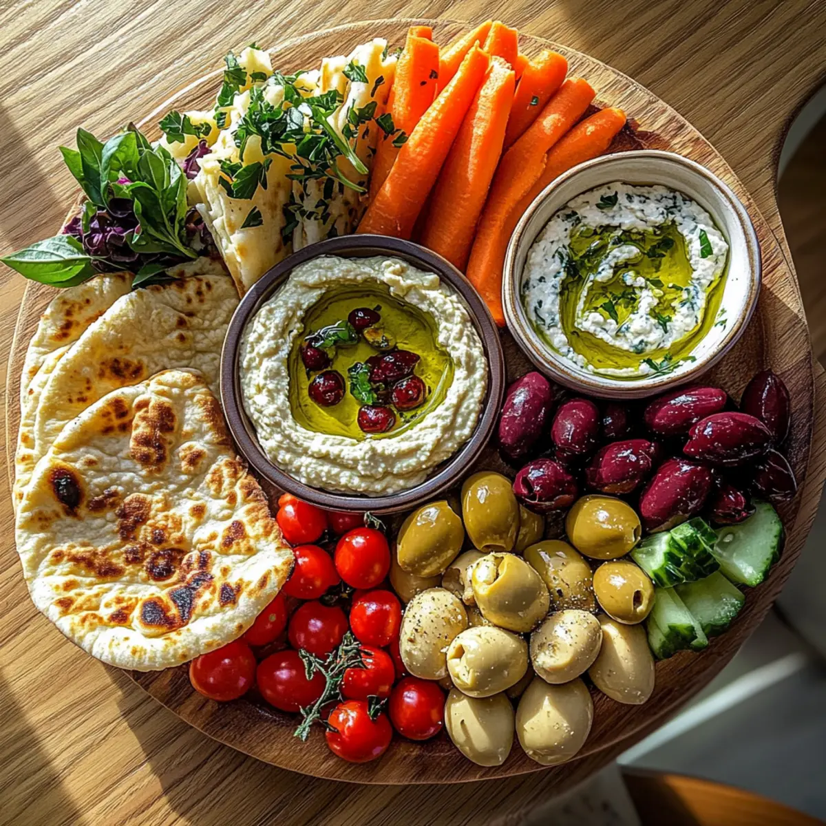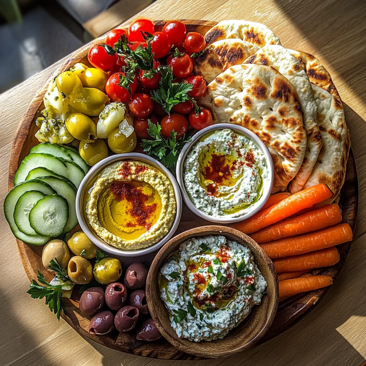 Jump to Recipe Print RecipeAs I set the table for a relaxed Sunday brunch, the colors and scents of fresh ingredients whisk me away to the sunny shores of the Mediterranean. An Easy Mediterranean Brunch Board with Dips and Flatbreads is not just a meal; it’s a celebration of flavor and community. Within minutes, you can blend creamy hummus, tangy tzatziki, and smoky baba ganoush with an assortment of vibrant veggies and warm flatbreads. With its easy assembly and customizable nature, this brunch spread is the perfect solution for both spontaneous gatherings and leisurely mornings. Plus, it’s beautifully adaptable to various dietary preferences, whether you’re gluten-free or vegan. So, are you ready to dive into a colorful feast that brings friends and family together around the table? Why Choose a Mediterranean Brunch Board? Colorful, Inviting Display: Your table will dazzle with vibrant hues of fresh veggies and rich dips. Customizable Delight: With endless combinations, you can mix and match based on your taste or dietary needs—think Mexican Ground Beef for a unique twist! Effortlessly Impressive: Guests will be wowed by this beautiful spread, but it comes together in just minutes—perfect for busy weekends. Healthy & Fresh: Emphasizing vegetables and wholesome ingredients, this brunch board is not just delicious; it’s nourishing too. Community & Sharing: Enjoy this meal in a relaxed, communal setting, reveling in the joy of shared dishes reminiscent of a Mediterranean picnic. Mediterranean Brunch Board Ingredients • Create a flavorful feast with these must-have ingredients for Mediterranean brunch boards! For the Dips Hummus – A creamy base that’s perfect for dipping; store-bought is convenient! Tzatziki – A tangy yogurt dip that enhances flavor; Greek yogurt mixed with garlic and cucumber works too. Baba Ganoush – A smoky eggplant dip that adds depth; consider roasted red pepper hummus as a fabulous alternative. For the Flatbreads Flatbreads – The essential foundation for scooping your dips; feel free to use store-bought or make your own. For Fresh Vegetables Fresh Vegetables (Carrots, Cucumber, Bell Peppers) – Provide crunch and freshness; use any seasonal veggies you love! For Flavor Enhancements Olives – A salty bite that pairs beautifully with dips; choose your favorite variety, or omit if needed. Feta Cheese – Adds a creamy, tangy flavor; swap for a vegan alternative if you prefer plant-based options. Olive Oil – A finishing drizzle for richness; avocado oil is a great substitute. Flaky Sea Salt – Enhances all the flavors; adjust to your personal taste! This Mediterranean brunch board is perfect for gatherings, pleasing everyone at the table with delicious dips and fresh ingredients! Step‑by‑Step Instructions for Mediterranean Brunch Boards with 3 Dips and Flatbreads Step 1: Prepare the Dips Begin by placing your chosen dips—hummus, tzatziki, and baba ganoush—into small bowls. If you’ve made any dips from scratch, allow them to sit at room temperature for 15 minutes to enhance their flavors. Use colorful bowls to create a warm, inviting atmosphere. This simple step is crucial for a delightful Mediterranean brunch board experience. Step 2: Slice the Vegetables While the dips are resting, wash and slice your fresh vegetables, such as carrots, cucumbers, and bell peppers. Aim for vibrant, colorful pieces that are easy to pick up and dip. Arrange them aesthetically on your cutting board or serving platter, ensuring a beautiful presentation that encourages everyone to dig in and enjoy the fresh crunch alongside the dips. Step 3: Warm the Flatbreads Next, heat a dry skillet over medium heat. Place your flatbreads in the skillet for about 30 seconds on each side until warm and slightly puffed. This will make them pliable and enhance their flavor. Once warmed, wrap the flatbreads in a clean kitchen towel to retain their warmth, setting the stage for a delicious Mediterranean brunch board. Step 4: Assemble the Brunch Board Now it’s time to bring your Mediterranean brunch board to life! Start by placing the bowls of dips on a large serving platter, spaced apart for easy access. Next, cluster the colorful vegetable slices and warmed flatbreads around the dips, creating an inviting and visually appealing display. This arrangement will make everyone feel welcome to share in the deliciousness. Step 5: Drizzle and Season Finish your Mediterranean brunch board with a light drizzle of olive oil over the dips and vegetables, adding a touch of richness. Then, sprinkle flaky sea salt over the entire board to enhance the flavors of the dips and the fresh veggies. This final touch will elevate your presentation and create an irresistible invitation for everyone to gather around the table. What to Serve with Easy Mediterranean Brunch Board with Dips and Flatbreads Elevate your brunch experience with delectable pairings that enhance the flavors of your Mediterranean spread. Mint Tea: Refreshing and fragrant, it perfectly complements the vibrant flavors, making every bite burst with freshness. Crisp Rosé: This light and fruity wine adds a touch of elegance, balancing the savory bites with its crispness. Greek Salad: A medley of tomatoes, cucumbers, and olives offers a crunchy contrast to the creamy dips, tying in Mediterranean flavors seamlessly. Stuffed Grape Leaves: These savory parcels of rice and herbs bring an authentic taste of the Mediterranean, perfect for sharing among guests. Roasted Chickpeas: With a satisfying crunch, they provide a healthy snack that echoes the dips and adds an extra protein punch. Honey Drizzled Feta: This sweet and tangy twist on feta cheese enhances the board’s richness, inviting sweet bites alongside savory elements. Pita Chips: For added texture, these are a delightful alternative to flatbreads, ideal for scooping up those delicious dips. Grilled Vegetables: Smoky, tender bites of zucchini and bell peppers beautifully com