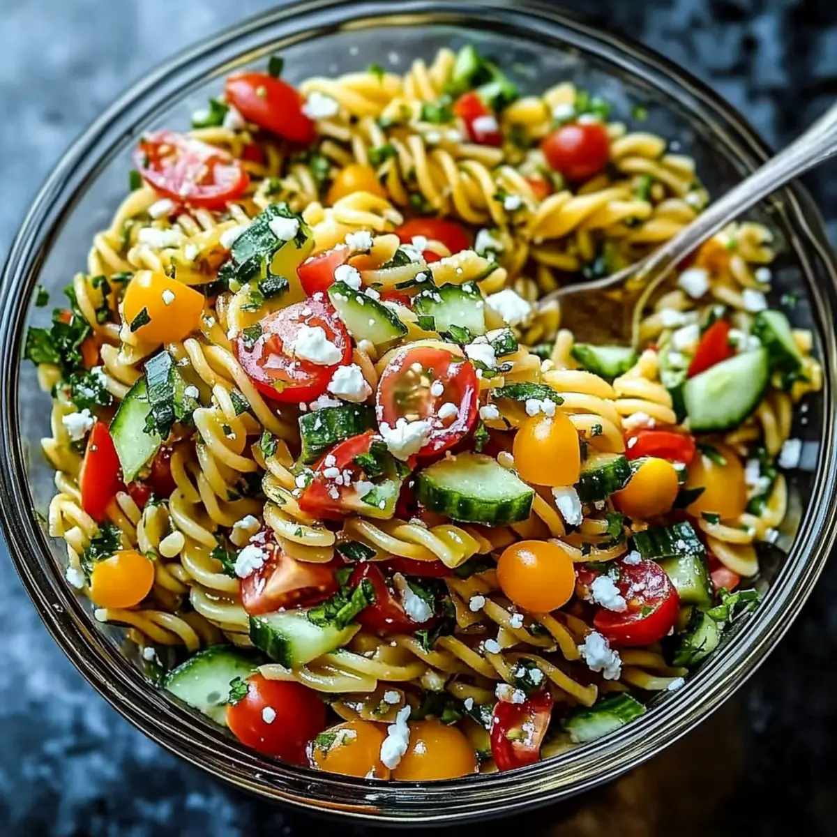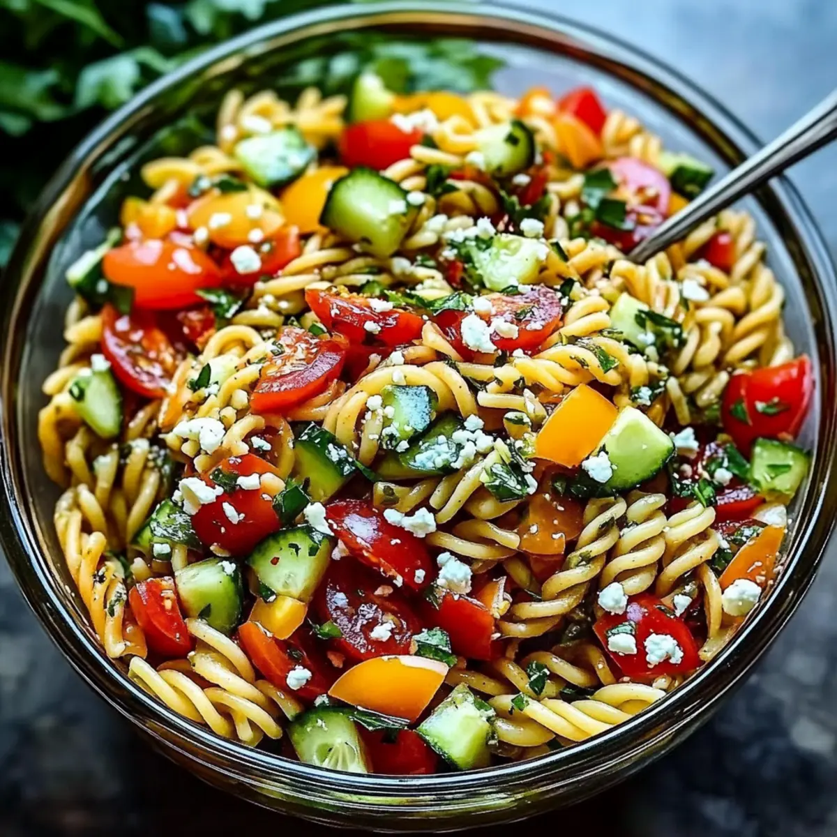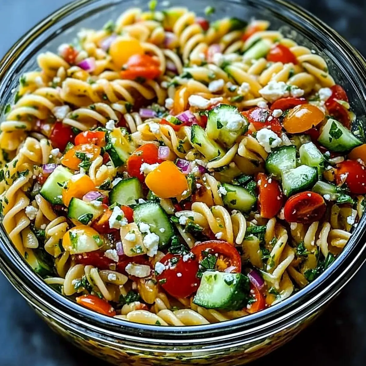 Jump to Recipe Print RecipeStepping into my kitchen, the vibrant colors of fresh ingredients immediately draw me in. There’s something magical about preparing a Mediterranean Pasta Salad, where every bite offers a scoop of sunshine and health. With juicy tomatoes, crunchy cucumbers, and tangy feta mingling in a delightful homemade Greek dressing, this dish not only brings a burst of flavor but is also incredibly quick to make—ready in just 20 minutes! It’s perfect for those last-minute potlucks or meal prep sessions when you want something nutritious without the fuss. Trust me, your taste buds are in for a treat! Are you ready to mix, toss, and savor? Why is Mediterranean Pasta Salad a Must-Try? Quick Preparation: Enjoy a delicious meal in just 20 minutes—perfect for busy lifestyles! Nutritious Ingredients: Packed with vitamins from fresh veggies, this salad makes healthy eating a breeze. Flavor Explosion: A harmonious blend of tangy feta, fresh herbs, and zesty dressing ensures every bite is a delight. Versatile Dish: Whether as a side for grilled chicken or a solo lunch, it fits seamlessly into any meal plan. Crowd-Pleasing Appeal: Ideal for potlucks, this colorful salad guarantees you’ll be asked for the recipe; just like our Cucumber Shrimp Salad, it’s a showstopper! Try it today, and you’ll find yourself making it again and again! Mediterranean Pasta Salad Ingredients • Fresh, vibrant, and ready to impress! For the Salad Pasta – 12 ounces; use rotini or penne for best dressing adherence. Grape Tomatoes – 1 cup halved; adds a delicious juiciness and sweetness. Cucumbers – 1 cup sliced and quartered; brings a refreshing crunch; bell peppers can be a great swap. Red Onion – ¼ cup thinly sliced; offers a sharp bite; green onions can be used for a milder flavor. Baby Spinach – 1 cup; boosts nutrition and adds vibrant color; kale can be used instead. Green Olives – ½ cup sliced, pitted; imparts saltiness and a briny kick; capers or black olives are good alternatives. Black Olives – ½ cup sliced, pitted; complements the green olives in flavor and texture. Feta Cheese – ½ cup crumbled; provides creaminess and tang; goat cheese is a tasty substitute. For the Dressing Greek Salad Dressing – ½ to ¾ cup (homemade); adjust amount to your taste for a flavorful experience. Olive Oil – ½ cup; the essential fat for a rich dressing that ties everything together. Red Wine Vinegar – ½ cup; adds balancing acidity to the mix. Garlic – 1 large clove minced; introduces depth of flavor; omit if you prefer a milder dressing. Dijon Mustard – 2 teaspoons; helps emulsify the dressing nicely and adds mild spice. Dried Oregano & Thyme – 2 teaspoons each; herbal notes enhance the overall flavor profile; use fresh herbs in smaller quantities if available. Salt and Pepper – To taste; essential for lifting flavors and completing the dish. This Mediterranean Pasta Salad is bursting with fresh ingredients, making it a go-to recipe for quick, nutritious meals! Step‑by‑Step Instructions for Mediterranean Pasta Salad Step 1: Cook the Pasta Bring a large pot of salted water to a vigorous boil over high heat. Add 12 ounces of rotini or penne pasta, cooking until al dente, about 8-10 minutes. Once done, drain the pasta in a colander and rinse it briefly under cold running water to halt the cooking process. This ensures the pasta remains firm and prevents it from becoming mushy in your Mediterranean Pasta Salad. Step 2: Prepare the Vegetables While the pasta is cooling, wash and chop 1 cup of grape tomatoes in half, and slice 1 cup of cucumbers into quarters. Thinly slice ¼ cup of red onion for a nice sharp bite. Gather 1 cup of fresh baby spinach and place all these vibrant vegetables into a large mixing bowl. The combination of these fresh ingredients will add color and texture to your Mediterranean Pasta Salad. Step 3: Combine Ingredients Once the pasta has cooled, gently fold it into the bowl with the vegetables. Add ½ cup each of sliced green and black olives to the mix. Stir everything together gently with a large spatula until the ingredients are well distributed. This mixture will create a beautiful medley, ready to be elevated with a flavorful dressing. Step 4: Make the Dressing In a separate bowl, whisk together ½ cup of olive oil, ½ cup of red wine vinegar, and 1 minced garlic clove. Add 2 teaspoons each of Dijon mustard, dried oregano, and dried thyme to enhance the flavor. Season this homemade Greek dressing with salt and pepper to taste. Once combined, you’ll have a delicious dressing that will bring the Mediterranean Pasta Salad to life. Step 5: Dress the Salad Drizzle ½ cup of your Greek dressing over the mixed pasta salad and toss gently to coat everything evenly. If you prefer a more flavorful punch, feel free to add more dressing according to your taste. This step is essential for ensuring that each bite of the Mediterranean Pasta Salad is bursting with zesty flavors. Step 6: Add Feta and Final Touches Crumble ½ cup of feta cheese over the dressed salad and toss again, allowing the cheese to blend in with the other ingredients. Give the salad a final seasoning with salt and pepper, adjusting as needed. You’ll notice the creamy feta will enhance both the texture and taste of your Mediterranean Pasta Salad beautifully. Step 7: Chill and Serve For the best flavor, let the Mediterranean Pasta Salad chill in the refrigerator for at least 30 minutes before serving. This allows the flavors to meld and intensify. When ready to serve, give it a gentle toss and enjoy this delicious salad immediately, or store any leftovers in an airtight container in the fridge for up to three days. Mediterranean Pasta Salad Variations Feel free to make this Mediterranean Pasta Salad your own with these delightful twists and substitutions! Protein Boost: Add chickpeas or white beans for a hearty and filling salad that boosts nutrition while adding a lovely creaminess