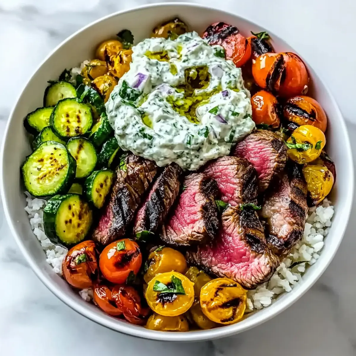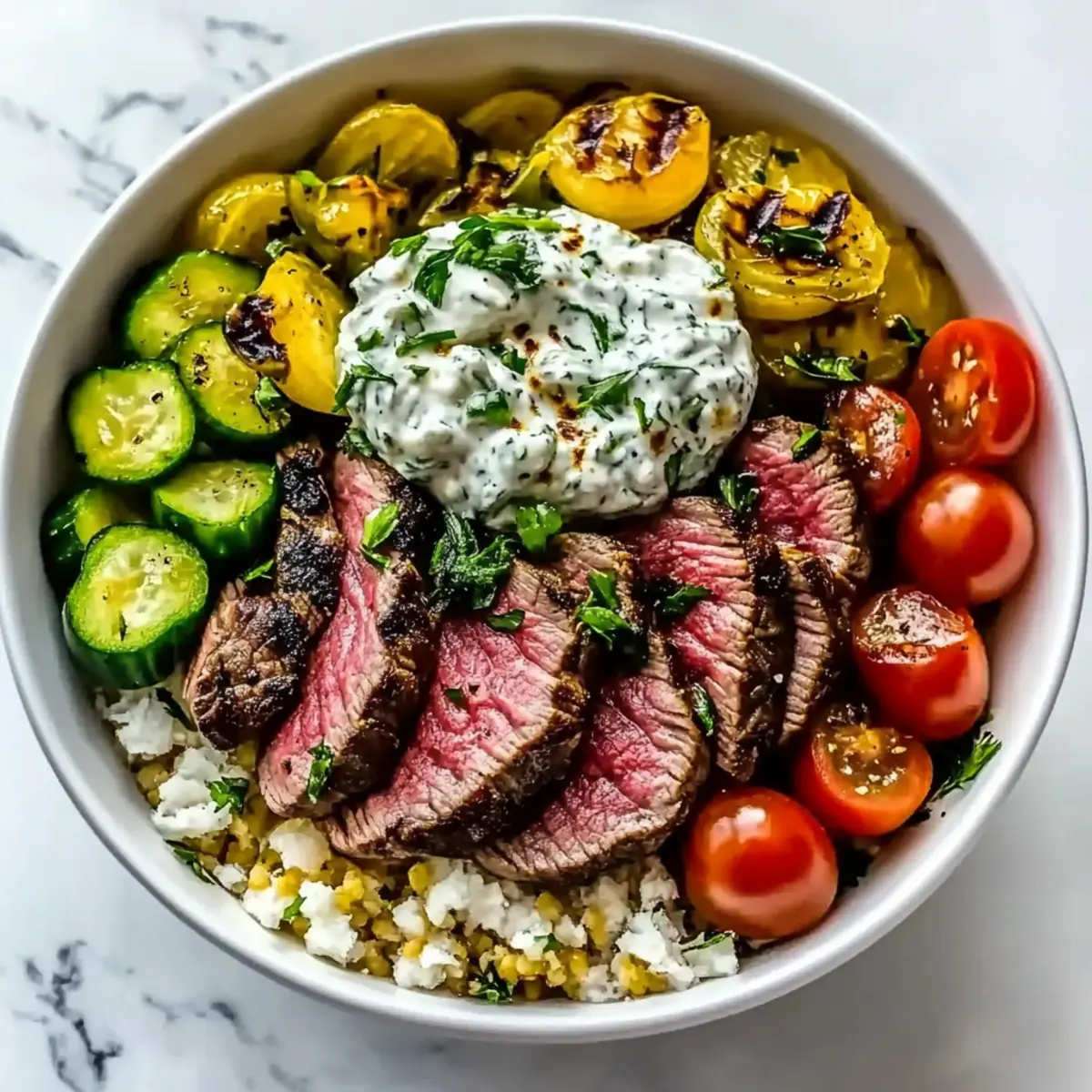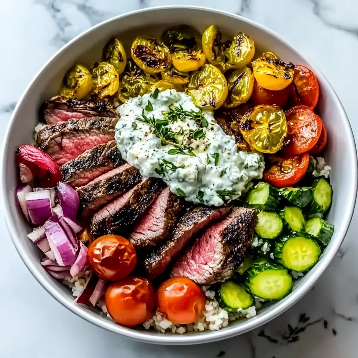 Jump to Recipe Print RecipeWhile rushing to dinner after a long day, I stumbled upon the idea of a Mediterranean Steak Bowl, and my mouth instantly watered. This vibrant dish is not only a feast for the eyes but also a quick and nourishing option that can be prepped in under 30 minutes. Loaded with juicy sirloin steak, crunchy fresh veggies, and a creamy tzatziki sauce, this Mediterranean Steak Bowl is designed to satisfy your cravings without sacrificing health or flavor. Ideal for both busy weeknights and meal prep, it’s also easily adaptable for low-carb or gluten-free diets. What fresh ingredients will you layer into your bowl tonight? Why You’ll Crave This Steak Bowl Simplicity in preparation makes this Mediterranean Steak Bowl a weeknight favorite. Bold flavors shine through with juicy sirloin steak and zesty tzatziki, ensuring each bite is a taste sensation. Nutritionally balanced, it’s packed with high protein and customizable for low-carb or gluten-free diets, making it perfect for all tastes. Quick assembly means you can enjoy a wholesome meal in under 30 minutes, leaving more time for what you love. Plus, meal prep-friendly, this dish can be conveniently portioned for those busy weeks ahead—why not pair it with a fresh side salad for a complete dining experience? Mediterranean Steak Bowl Ingredients For the Steak Marinade Sirloin Steak – The main protein source; flank or ribeye can also be used for different textures. Olive Oil – Adds richness and helps the flavors to adhere; feel free to substitute with avocado oil. Garlic (minced) – Infuses the steak with flavor; garlic powder can serve as a quick alternative. Lemon Juice – Provides acidity to tenderize the steak; fresh lemon juice is highly recommended. Dried Oregano & Thyme – Brings a robust, Mediterranean profile; use Italian seasoning as a substitute if needed. Salt & Pepper – Essential seasonings to enhance flavors; adjust according to your taste preferences. For the Base Cooked Grains – Use brown rice, quinoa, or cauliflower rice based on dietary needs; they provide fiber and bulk. For the Veggie Medley Cherry Tomatoes (halved) – Adds freshness and a pop of color; grape tomatoes can be a great substitute. Cucumber (diced) – Contributes crunch and hydration; zucchini can work nicely instead. Red Onion (thinly sliced) – Adds sharpness and depth; shallots are a milder alternative. Kalamata Olives (pitted) – Provides a briny touch; any favorite olives can replace them. For Toppings Feta Cheese (crumbled) – Enhances creaminess; omit for a dairy-free dish. Fresh Herbs (parsley or dill, chopped) – Adds vibrant flavor; if unavailable, basil works as a good substitute. For the Tzatziki Sauce Greek Yogurt (plain) – Creates a creamy base; coconut yogurt can be a great dairy-free option. Cucumber (grated and squeezed dry) – Provides texture for tzatziki; you can skip it or add more yogurt if you prefer. Honey (optional) – Adds a subtle sweetness to balance flavors; omit for Whole30 compliance. For the Vinaigrette Olive Oil – Brings a smooth richness; can be replaced with another mild oil if desired. Lemon Juice – Brightens up the vinaigrette; fresh is best for maximum flavor. Garlic – Adds a pungent kick; ensure it’s finely minced for even distribution. Oregano – Complements the overall Mediterranean taste profile; feel free to adjust to your liking. Craft your unique Mediterranean Steak Bowl with these fresh ingredients, and enjoy a wholesome meal that delights the senses! Step‑by‑Step Instructions for Mediterranean Steak Bowl Step 1: Marinate the Steak In a mixing bowl, combine olive oil, minced garlic, lemon juice, dried oregano, thyme, salt, and pepper, creating a fragrant marinade. Coat the sirloin steak thoroughly with this mixture. Allow it to marinate for at least 30 minutes, but up to 4 hours is ideal for deeper flavor. This will set the foundation for the delicious Mediterranean Steak Bowl. Step 2: Prepare Tzatziki While the steak marinates, prepare the tzatziki sauce. In a bowl, mix plain Greek yogurt with grated cucumber (squeezed dry), lemon juice, minced garlic, chopped dill, salt, and pepper. Stir well until combined and creamy. Cover the tzatziki and refrigerate it for at least 15 minutes, allowing the flavors to meld while you focus on the rest of the Mediterranean Steak Bowl. Step 3: Make Vinaigrette In a small bowl, whisk together olive oil, lemon juice, minced garlic, dried oregano, salt, and pepper to create a zesty vinaigrette. Adjust the seasoning to taste, ensuring a balanced tanginess. This vinaigrette will enhance the freshness of your Mediterranean Steak Bowl, adding a delightful drizzle just before serving. Step 4: Cook the Steak Heat a skillet over medium-high heat until hot, adding a drizzle of olive oil. Carefully place the marinated steak in the skillet, searing for 4-5 minutes on each side for medium-rare, or until it reaches your preferred doneness. The steak should develop a beautiful crust. Once cooked, transfer it to a cutting board and let it rest for a few minutes before slicing thinly against the grain. Step 5: Assemble the Bowl Begin layering the Mediterranean Steak Bowl by placing a base of your choice of cooked grains—brown rice, quinoa, or cauliflower rice—in a large bowl. Next, add the sliced steak, followed by vibrant cherry tomatoes, diced cucumber, thinly sliced red onion, pitted kalamata olives, crumbled feta, and freshly chopped herbs. This colorful assembly promises a feast for both the eyes and palate. Step 6: Finish with Sauces To complete your Mediterranean Steak Bowl, generously dollop the chilled tzatziki sauce over the top, followed by a drizzle of the zesty vinaigrette you prepared earlier. This final touch not only adds flavor but also elevates the presentation of your dish. Your Mediterranean Steak Bowl is now ready to be enjoyed! Make Ahead Options These Mediterranean Steak Bowls are perfect for meal prep enthusia