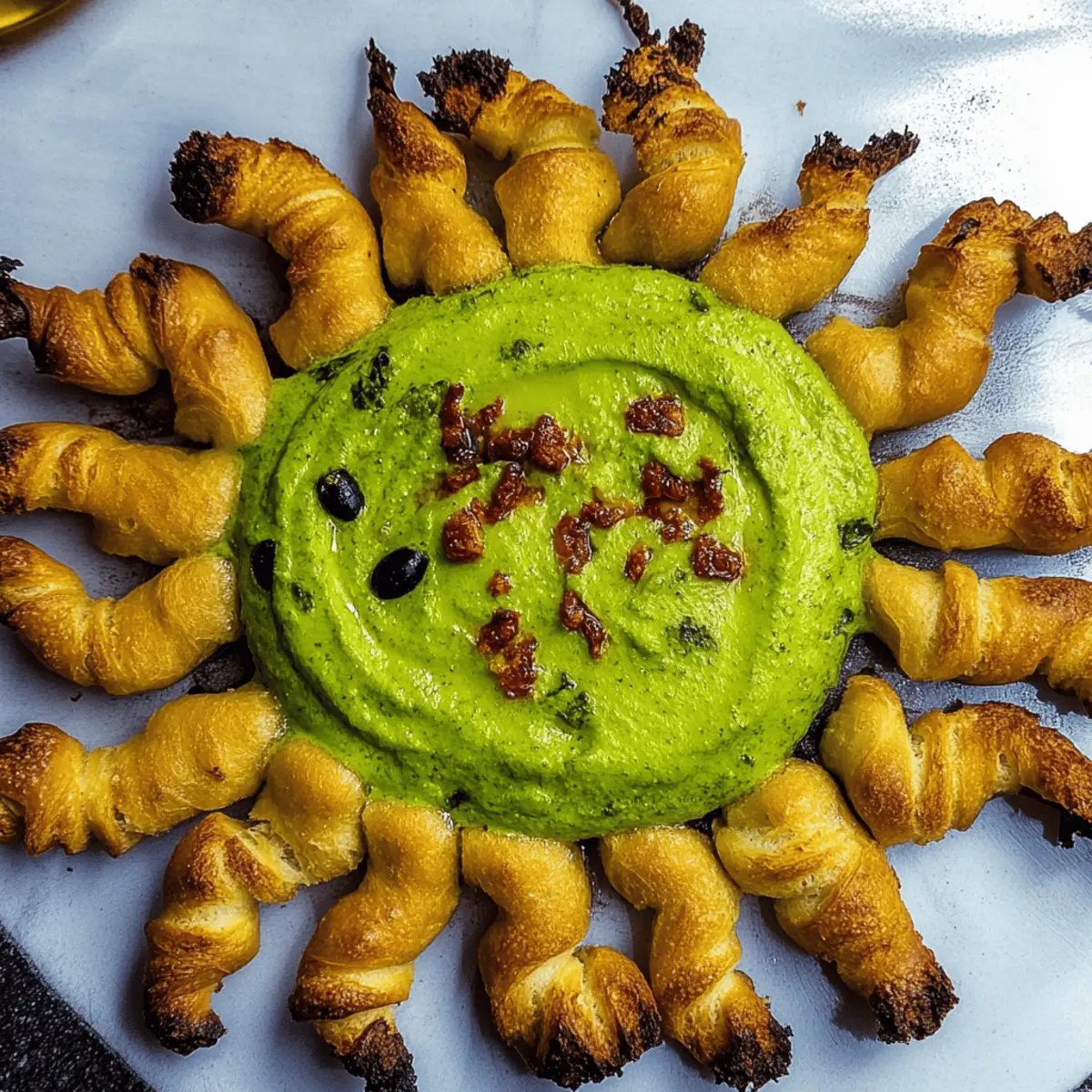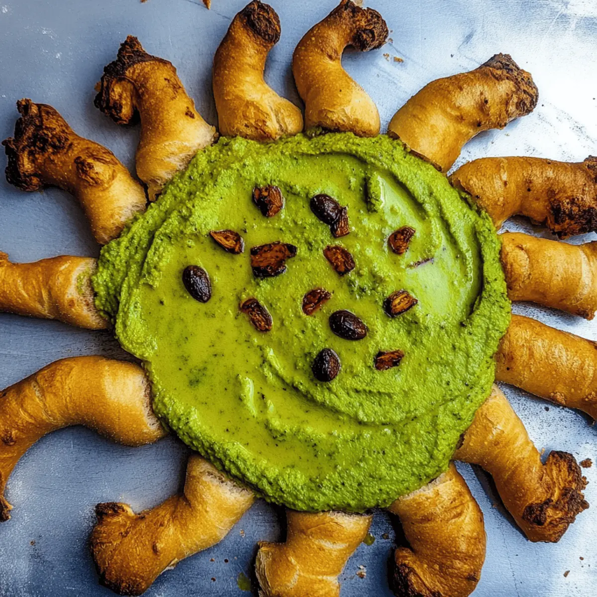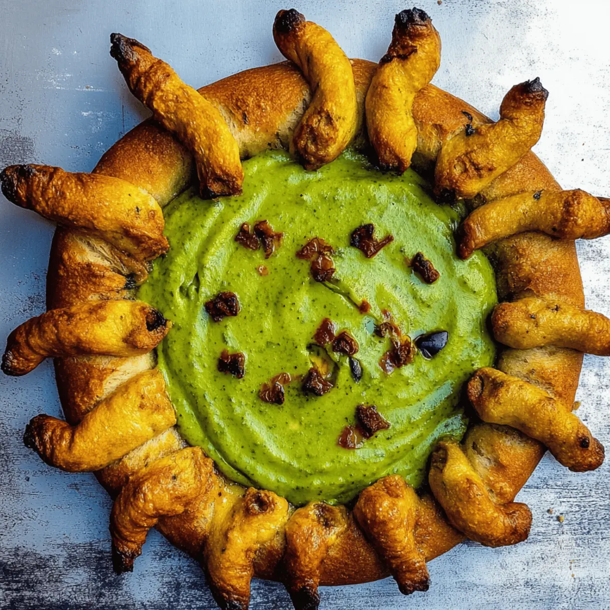 Jump to Recipe Print RecipeAs I stared at my kitchen counter cluttered with Halloween decorations, an idea struck me—why settle for ordinary when I can create something extraordinary? Enter the Medusa Tear and Share Bread, an enchanting blend of flavorful spinach, briny olives, and tangy sun-dried tomatoes. Not only does this delightful bread make for a stunning centerpiece at any spooky gathering, but it also encourages everyone to dig in and share—a true crowd-pleaser! With its soft, airy texture and a spicy ‘snake bite’ dip on the side, this recipe transforms mundane meals into festive feasts. Trust me, your guests will be captivated by every delicious bite! Are you ready to conjure up your own Medusa masterpiece? Why is Medusa Bread a Must-Try? Captivating Presentation: This Medusa Tear and Share Bread not only tastes fantastic but also dazzles your guests with its unique shape and vibrant colors. Savory Delight: The medley of spinach, olives, and sun-dried tomatoes creates an explosion of flavor that pairs perfectly with the spicy ‘snake bite’ dip, making each bite unforgettable. Simple Process: You don’t need to be a baking expert; this recipe breaks down the steps so anyone can create this awe-inspiring bread in their own kitchen. Perfect for Sharing: Designed for tearing and sharing, it fosters a fun, communal dining experience—ideal for Halloween parties or family gatherings. Versatile Options: Want to mix things up? Feel free to experiment by incorporating different herbs or trying out a vegan version with substitutions. The possibilities are endless! If you’re looking for more fantastic bread ideas, check out our recipe for Cheesy Garlic Breadsticks or try a delicious slice of Apple Zucchini Bread. Medusa Tear and Share Bread Ingredients • Get ready to create something magical with these simple ingredients! For the Bread Dough Baby Spinach – Adds color and a nutritious element; use fresh or frozen, but make sure to drain frozen thoroughly. Strong White Bread Flour – Provides structure and chewiness essential for bread-making; regular all-purpose flour can be used as a substitute. Sachet Fast Action Dried Yeast – The key fermenting agent that helps the bread rise; can be replaced with active dry yeast, remembering to proof it first. Caster Sugar – Introduces a hint of sweetness to balance savory flavors; granulated sugar is an acceptable substitute. Olive Oil – Essential for moistness and dough elasticity; melted butter or sunflower oil can be used as alternatives. Basil Pesto – Adds richness and herbaceous flavor; substitute with homemade pesto or any green herb paste. Black Olives, Pitted and Finely Chopped – Contributes brininess and depth; any preferred variety of olives works well. Sun-Dried Tomatoes in Oil, Drained and Finely Chopped – Lends tang and umami; fresh tomatoes can be used, but may alter the texture. Feta, Crumbled – Adds creaminess and tang, with goat cheese being a good alternative if preferred. For the Spicy ‘Snake Bite’ Dip Cream Cheese – Provides a creamy texture for the dip; Neufchâtel cheese is a lower-fat substitute. Crispy Chilli Oil (Lee Kum Kee Chiu Chow Chilli Oil) – Delivers a kick of heat; feel free to use any chili oil or hot sauce tailored to your spice level. This Medusa Tear and Share Bread is sure to steal the show at your next gathering! Step‑by‑Step Instructions for Medusa Tear and Share Bread Step 1: Prepare Dough In a small bowl, combine 300ml of warm water, 7g of sachet fast action dried yeast, and 1 teaspoon of caster sugar. Stir gently and let it bloom for about 10 minutes until frothy. This yeast mixture is essential for your Medusa Tear and Share Bread to rise properly, so make sure it bubbles nicely before proceeding. Step 2: Mix Ingredients In a large mixing bowl, combine 500g of strong white bread flour with 3 tablespoons of olive oil. Pour in the bloomed yeast mixture, and mix until a shaggy dough forms. Transfer the dough onto a clean surface and knead for about 10 minutes until it’s smooth and elastic. This kneading process is key for developing the gluten structure in your bread. Step 3: Incorporate Flavors Gently fold in 150g of chopped baby spinach, 100g of finely chopped black olives, and 75g of sun-dried tomatoes into the dough. Mix well until the ingredients are evenly distributed throughout the dough, creating a colorful, flavorful blend in your Medusa Tear and Share Bread. Step 4: First Rise Place the dough in a greased bowl, cover it with a damp cloth, and let it rise in a warm area for about 1 hour or until it has doubled in size. This step is critical for a light, airy bread, so be patient and look for the dough to puff up beautifully. Step 5: Shape the Bread Once risen, punch down the dough to release excess air. Transfer it to a lightly floured surface and shape it into a round loaf, ensuring a smooth top. Creating a well-shaped loaf will help with an even bake, so take your time during this shaping stage for optimum results. Step 6: Preheat Oven While the dough undergoes its second rise for about 20 minutes, preheat your oven to 220°C (428°F). This ensures that your Medusa Tear and Share Bread will bake evenly and develop a gorgeous, golden-brown crust. Prepare a baking tray lined with parchment paper for the dough. Step 7: Bake Bread Carefully place the shaped dough onto the prepared baking tray and bake in the preheated oven for 25-30 minutes. Keep an eye on it as it bakes; you’re looking for a golden-brown crust and a hollow sound when tapped on the bottom, indicating it’s perfectly cooked through. Step 8: Dip Preparation While the bread bakes, prepare the spicy ‘snake bite’ dip. In a bowl, combine 100g of cream cheese, 100g of crumbled feta, 2 tablespoons of basil pesto, and 1 tablespoon of crispy chili oil. Stir until smooth and creamy. This flavorful dip complements your Medusa Tear and Share Bread beautifully. What to Serve with Medusa Tear and 