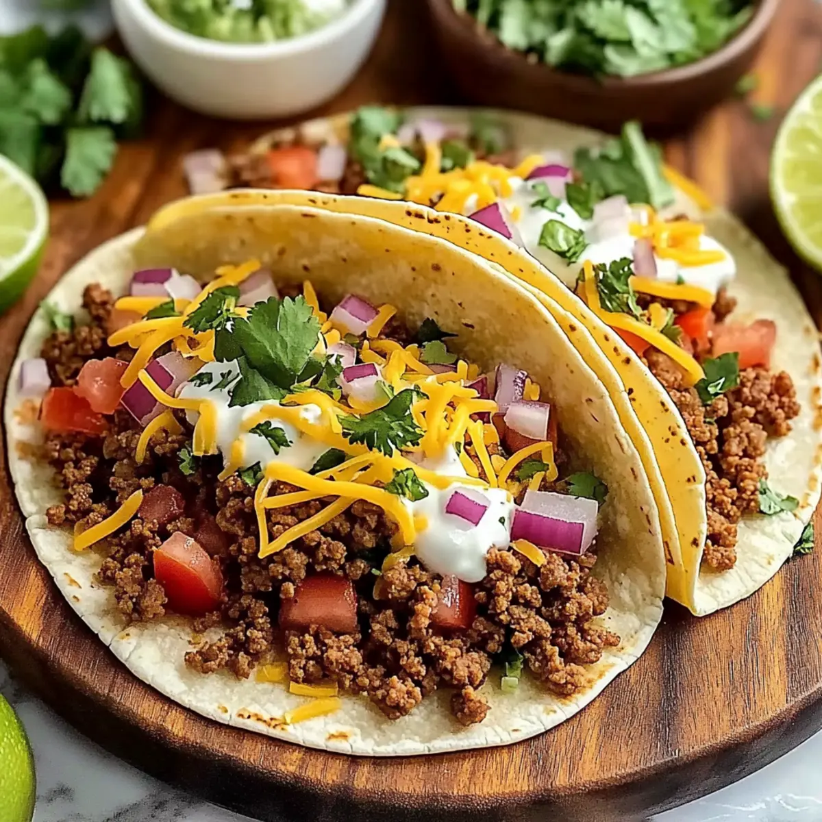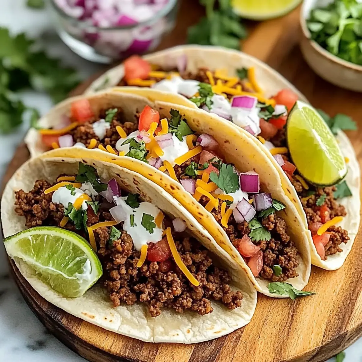 Jump to Recipe Print RecipeAs I stood in my kitchen, the enticing aroma of cumin and chili powder filled the air, instantly transporting me to lively street corners in Mexico. These Easy Mexican Ground Beef Tacos are not just another recipe; they are a culinary delight that transforms busy weeknights into delicious family feasts. With just 20 minutes of prep time, you can whip up a dish that’s quick, customizable, and guaranteed to satisfy even the pickiest eaters at your table. Each taco features juicy beef tucked into warm tortillas, ready to be adorned with your loved ones’ favorite toppings. So why settle for fast food when you can enjoy this flavorful, homemade dinner that brings everyone together? Ready to dive into taco night? Let’s get started! Why You’ll Crave These Tacos Quick and Easy: This recipe takes just 20 minutes, perfect for busy weeknights! Customizable: Each family member can craft their taco just the way they like it, from spicy to mild. Incredible Flavor: A delightful mix of cumin and chili powder ensures a burst of authentic taste in every bite. Kid-Friendly: These tacos appeal to picky eaters, making them a favorite at the dinner table. Minimal Ingredients: With common pantry staples, you can create a tasty meal without a long shopping list. Pair these tacos with Mexican Ground Beef or some delicious Cheesy Beef Chimichangas for a complete feast! Mexican Ground Beef Tacos Ingredients For the Beef Filling • Vegetable Oil – Provides fat for cooking; substitute with olive oil for a healthier option. • Ground Beef – The main protein source; choose 80/20 for juiciness, with leaner options allowed if you add extra oil. • Cumin – Adds warm, earthy flavor; no substitution necessary for authenticity. • Chili Powder – Delivers heat and depth; adjust to your preferred spice level. • Paprika – Adds color and a hint of sweetness; can be omitted if necessary. • Garlic Powder – Enhances aroma and taste; use fresh garlic as a tasty alternative. • Oregano – Provides fresh, herbal notes; feel free to use dried or fresh based on what you have. • Salt and Black Pepper – Essential for seasoning; adjust to personal taste. • Cayenne Pepper – Gives extra heat; omit for a milder flavor. • Tomato Paste – Thickens and enriches the meat mixture; no direct substitute, but diced tomatoes work in a pinch. • Beef Broth – Adds moisture and flavor; vegetable broth can lighten the taste. For the Tacos • Flour Tortillas – The essential foundation for your tacos; substitute with corn tortillas for a gluten-free option. • Cheese Blend – Melts beautifully; use your favorite cheese for added flavor. For the Toppings • Tomatoes – Adds freshness and color; diced for easy topping. • Red Onion – Provides crunch and sharpness; can be omitted for a milder taste. • Cilantro – Offers brightness and freshness; skip if not a fan. • Sour Cream – Adds creaminess; swap with Greek yogurt if you’re looking for a healthier twist. • Lime – A squeeze brightens flavors; lemons can be substituted in a bind. These Mexican Ground Beef Tacos ingredients make for a flexible and delicious family dinner that everyone will love! Step‑by‑Step Instructions for Easy Mexican Ground Beef Tacos Step 1: Prep Ingredients Start by gathering all your ingredients for the Easy Mexican Ground Beef Tacos. Measure out the spices: cumin, chili powder, paprika, garlic powder, oregano, salt, black pepper, and cayenne. Dice the tomatoes and red onions, chop the cilantro, and cut the lime into wedges for garnishing. This prep ensures a smooth cooking process and allows you to focus on bringing out the vibrant flavors of these tacos. Step 2: Cook Beef Heat a large skillet over medium heat and add 1 tablespoon of vegetable oil. Once the oil shimmers, add 1 pound of ground beef, breaking it apart with a wooden spoon. Cook for about 6-8 minutes, stirring occasionally until the beef browns nicely. You’ll know it’s ready when it’s no longer pink and has a rich golden color, which forms the savory base of your Mexican Ground Beef Tacos. Step 3: Season Beef With the beef browned, it’s time to stir in your prepared spice mix and 2 tablespoons of tomato paste. Cook this mixture for 2-3 minutes until the spices are fragrant and well incorporated. The beef should be well-coated, and the tomato paste will start to caramelize slightly, enhancing the overall depth of flavor for your Easy Mexican Ground Beef Tacos. Step 4: Simmer with Broth Next, pour in 1/2 cup of beef broth, stirring well to combine. Allow it to simmer on low heat for about 3-5 minutes until the mixture thickens slightly. You want a moist consistency that’s neither too runny nor too dry, making it perfect for filling your tortillas later. The aroma wafting from the skillet will heighten your excitement for these delightful tacos. Step 5: Warm Tortillas While the beef mixture simmers, prepare your tortillas. If using gas, place them directly over the flame for just a few seconds on each side until they puff and turn warm. Alternatively, wrap them in a damp paper towel and microwave for 20-30 seconds. This step ensures your tortillas are pliable and ready to hold all the delicious fillings of your Mexican Ground Beef Tacos. Step 6: Assemble Tacos Now it’s time to assemble your Easy Mexican Ground Beef Tacos. Spoon a generous portion of the beef mixture onto each tortilla, followed by a sprinkling of cheese, diced tomatoes, red onions, and a handful of fresh cilantro. Don’t hesitate to adjust the toppings to your family’s tastes, ensuring everyone gets a taco just the way they like it! Step 7: Serve Arrange your beautifully assembled tacos on a platter, accompanied by lime wedges and optional toppings like sour cream, guacamole, or pico de gallo. This lets everyone customize their meal, making dinner interactive and fun. Serve immediately for the best experience—these Easy Mexican Ground Beef Taco