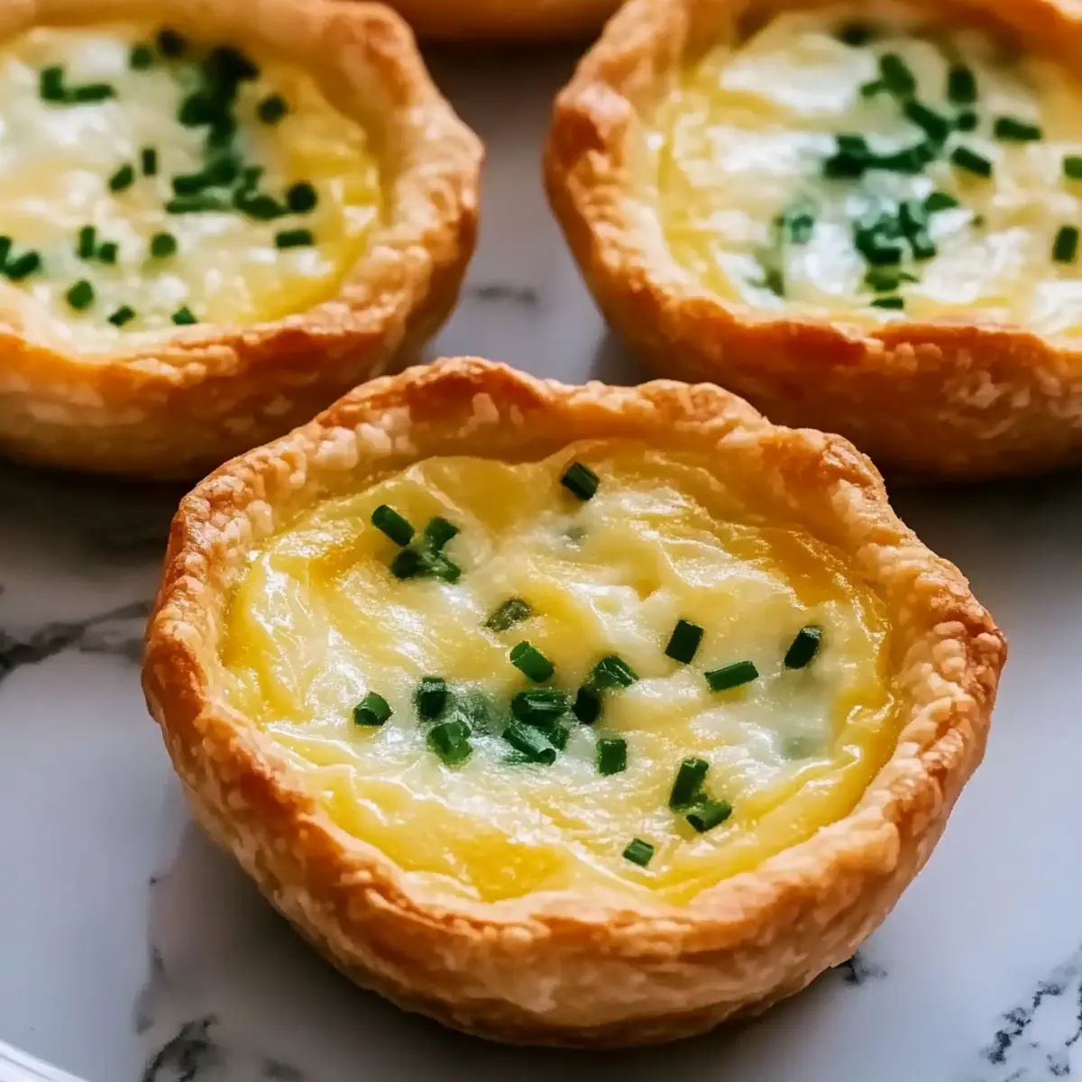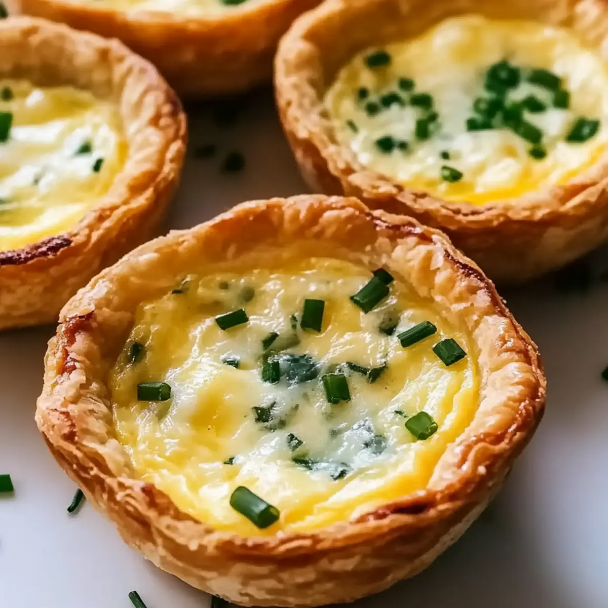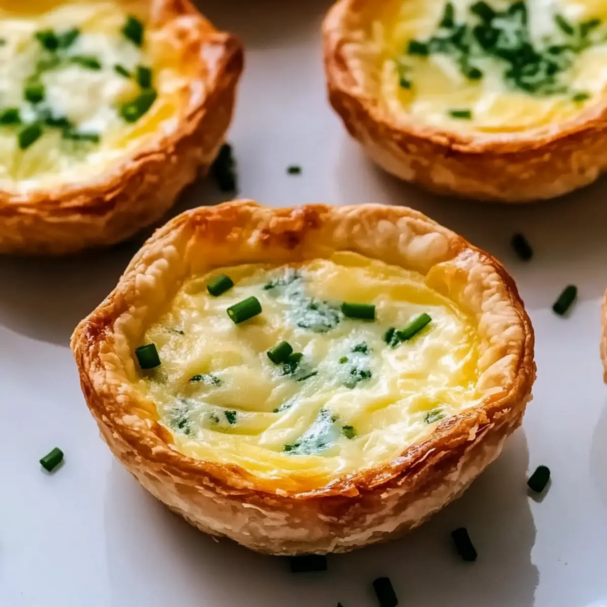 Jump to Recipe Print RecipeThe aroma of buttery pastry wafting through my kitchen instantly transports me to cozy brunches with friends, and there’s one dish that always steals the show: Mini Cheese Quiche. These delightful little bites are not just a charming addition to any gathering; they’re also incredibly adaptable to your taste buds, making meal prep a breeze. With a few simple ingredients, you can whip up a batch that caters to both cheese lovers and adventurous eaters alike. Whether you’re hosting a weekend brunch or just need a quick snack to have on hand, these mini quiches are perfect for every occasion. Ready to impress your guests and satisfy your cravings? Let’s dive into this simple yet irresistible recipe! Why Are Mini Cheese Quiches So Great? Versatile Options: Each quiche is a blank canvas! Customize your cheese and fillings to create unique flavor profiles that suit any palate, from the classic cheddar to adventurous jalapeño-infused varieties. Time-Saver: Perfect for meal prep, these quiches can be baked ahead of time and stored in the fridge or freezer, making them a quick and easy snack or brunch item ready in a flash! Crowd-Pleasing: Their delightful bite-sized nature makes them an instant favorite at gatherings. Serve warm or at room temperature, alongside a refreshing salad, and watch them disappear! Simple Preparation: Don’t worry about fancy skills; making these mini quiches is a breeze. Plus, if you love easy yet impressive dishes, check out my Hash Brown Quiche for another fantastic option! Mini Cheese Quiche Ingredients • Whether you’re planning a brunch or a cozy night in, having the right ingredients makes all the difference! For the Crust Pie Crust – A flaky foundation that can be store-bought or homemade for ease and comfort. For the Filling Eggs – The essential binder; always use fresh eggs for the best texture in your mini cheese quiche. Half-and-Half – Adds a luxurious creaminess that enriches the filling; you can swap it for whole milk for a lighter touch. Cheese (e.g., Apple Smoked Gouda) – The star of the show! Feel free to substitute with Gruyere or sharp cheddar for a twist. Salt and Pepper – These seasonings heighten flavor; adjust them to fit your personal taste. Chives – A fresh garnish that brightens the dish; it’s optional but adds a lovely visual appeal. Step‑by‑Step Instructions for Mini Cheese Quiche Step 1: Preheat Oven Begin by preheating your oven to 375°F (190°C). This is crucial for ensuring that your mini cheese quiches bake evenly and turn out perfectly golden brown. As the oven warms up, gather your ingredients and prepping equipment, including a muffin tin and mixing bowls for a smooth cooking experience. Step 2: Prepare Muffin Tin Lightly spray a 24-cup mini muffin tin with vegetable spray, making sure to coat each cup evenly. This will prevent your mini cheese quiches from sticking and ensure easy removal once they are baked. Take care to cover each cup to avoid any frustration during assembly. Step 3: Cut Dough Unroll your pie crust and use a 3-inch cookie cutter to cut out circles. Aim for about 24 circles to fit into your muffin tin cups. As you cut, you can gather any leftover dough and re-roll it for additional circles. Keep each cut-out near the muffin tin and ready for the next step. Step 4: Blind Bake Crusts Place the dough circles into the prepared muffin cups, gently pressing down to fit them snugly. Blind bake in the preheated oven for 12 minutes until just set but not browned; this will help avoid any sogginess in your mini cheese quiches. You’ll know they’re ready when they appear dry to the touch. Step 5: Prepare Filling In a mixing bowl, whisk together the eggs, half-and-half, salt, and pepper until well combined and frothy. This creamy mixture is what binds your filling and creates the delightful texture in your mini cheese quiches. Aim for a smooth consistency with no clumps for the best results. Step 6: Cool Filling Allow the egg mixture to cool slightly for a couple of minutes. This step is vital to prevent the filling from cooking the dough prematurely. The mixture should just be warm when you’re ready to fill the crusts, which ensures a tender final product without rubbery eggs. Step 7: Assemble Quiches Carefully divide the cheese evenly among each crust, allowing it to create a generous layer at the bottom. Next, pour the prepared egg mixture over the cheese so that it fills each shell until just about 1/4 inch from the top. This space will allow the filling to rise without overflowing during baking. Step 8: Bake Reduce the oven temperature to 300°F (150°C) and return the muffin tin to the oven. Bake for 15 minutes or until the mini cheese quiches are puffed up and lightly browned. Look for a slight jiggle in the center when they are done; they continue to cook as they cool. Step 9: Cool and Serve Once done, allow your mini cheese quiches to cool in the tin for a few minutes before transferring them to a wire rack. These delightful bites can be enjoyed warm or at room temperature, making them an elegant and easy addition to any meal. What to Serve with Mini Cheese Quiche? Imagine a warm gathering filled with laughter and delicious aromas—mini cheese quiches shining brightly on a beautifully set table, begging to be paired with delightful companions. Mixed Green Salad: A refreshing salad with tangy vinaigrette balances the quiche’s richness, providing a burst of freshness with every bite. Toss in some cherry tomatoes and crunchy cucumbers for added texture! Fruit Salad: A medley of seasonal fruits adds sweetness and color to your spread. The juicy fruits perfectly contrast the savory quiches, creating a delightful harmony of flavors. Roasted Vegetables: Warm, caramelized veggies like bell peppers and zucchini offer a hearty, nutritious side that complements the quiche’s creamy filling, adding earthy notes to the meal. Herbed Goat Cheese Dip: Serve this creamy