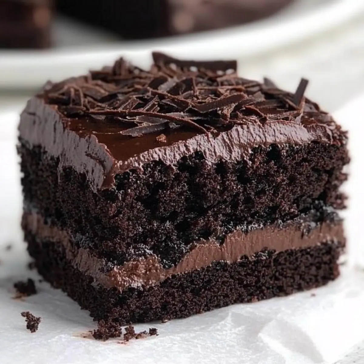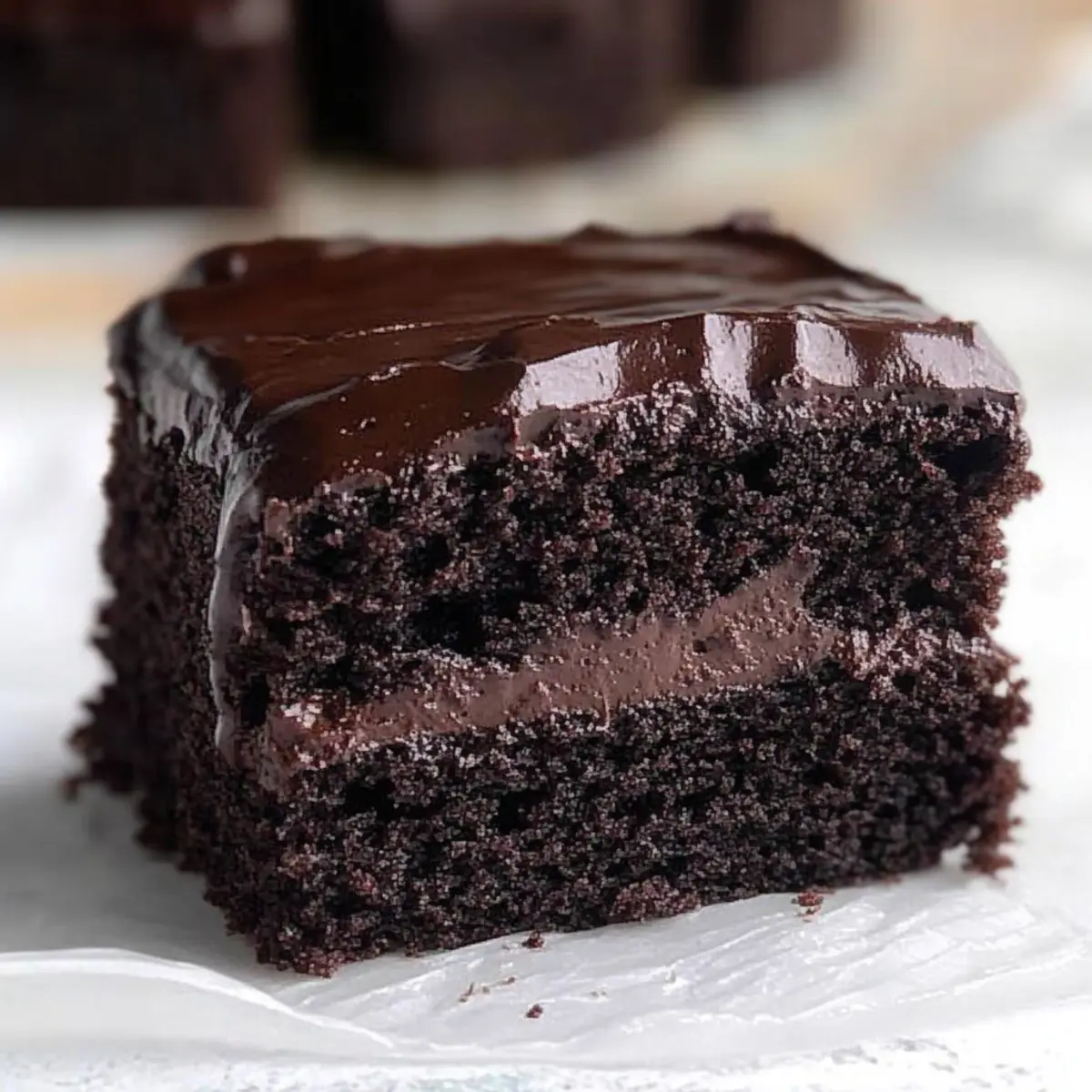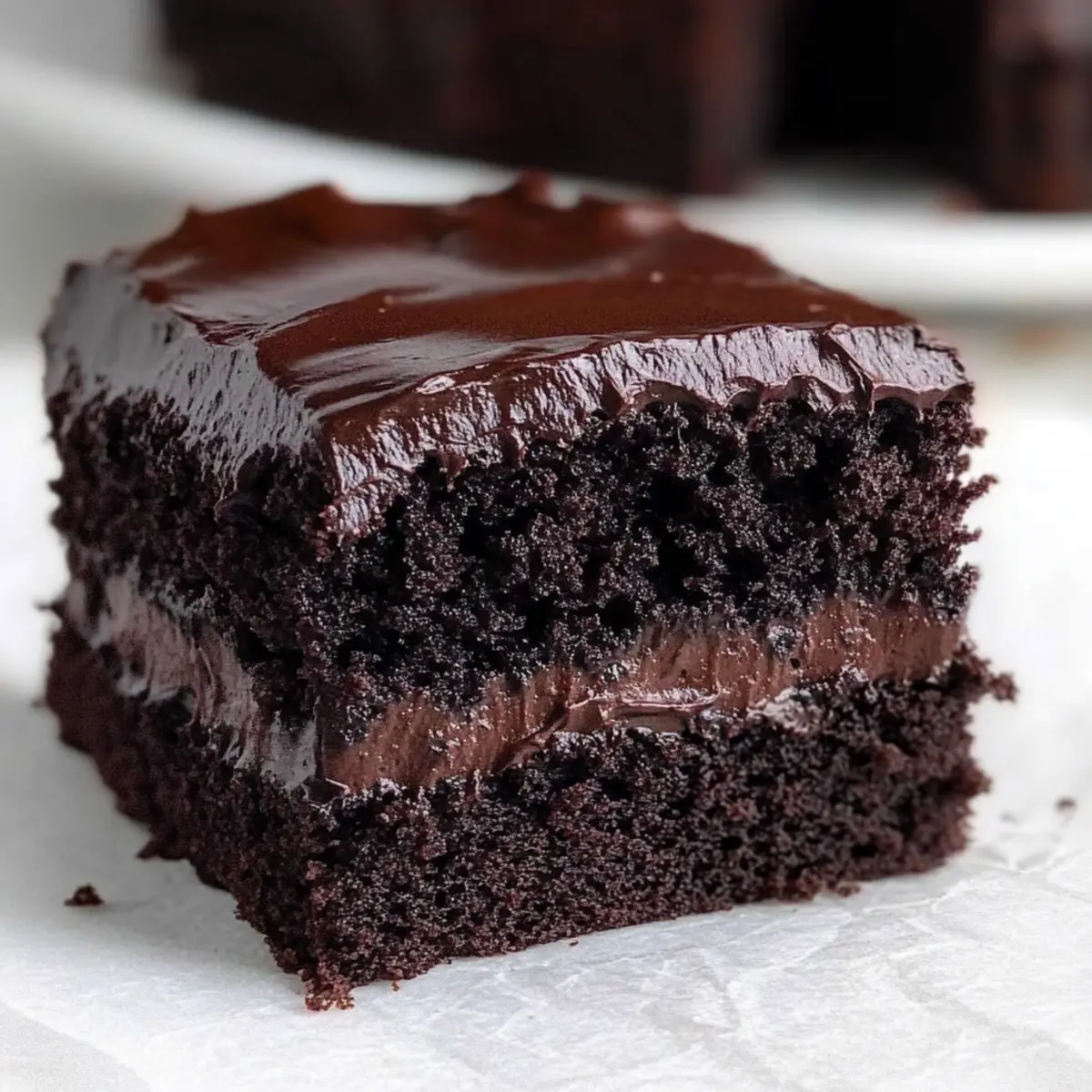 Jump to Recipe Print RecipeAs I stood in my kitchen, a rich aroma of chocolate wafted through the air, instantly lifting my spirits and igniting my anticipation for dessert. This Moist & Fudgy Chocolate Cake is my go-to recipe for those moments when only something sweet will do. With its deeply satisfying chocolate flavor and incredibly moist texture, it’s the kind of cake that effortlessly steals the spotlight, whether it’s a birthday bash or a cozy family dinner. The beauty of this one-bowl wonder is not just in its simplicity—whipping it up is a breeze, making it perfect for beginners and busy bakers alike. Plus, it’s versatile enough to be baked as a sheet cake, layered masterpiece, or delightful cupcakes. Curious about how to bring this chocolate indulgence to your table? Let’s dive in! Why is this chocolate cake a must-try? Irresistible Moisture: Each bite of this Moist & Fudgy Chocolate Cake is like sinking into a cloud of chocolate bliss. Effortless Baking: With just one bowl required, you can whip this beauty up in no time, making it a perfect choice for spontaneous cravings or busy weeknights. Versatile Options: Bake it as cupcakes or a layered cake for any occasion—birthdays, celebrations, or just because! Crowd-Pleasing Flavor: The rich chocolate taste and moist texture make it a guaranteed hit, even among the most discerning chocolate lovers. Elevate Your Desserts: Pair it with a scoop of vanilla ice cream or a drizzle of hot fudge sauce for a decadent dessert experience. For a fun twist, check out my Double Chocolate Chip Cookies for another chocolate craving solution! Moist and Fudgy Chocolate Cake Ingredients For the Cake • All-Purpose Flour – Provides structure to the cake; ensure you spoon it into the measuring cup for accuracy. • Granulated Sugar – Enhances sweetness and moisture; brown sugar can be used for a richer flavor. • Cocoa Powder – Adds an intense chocolate flavor; Dutch-processed cocoa is preferred for its smoothness. • Baking Powder & Baking Soda – Essential leavening agents for a rise that makes the cake fluffy and light. • Fine Sea Salt – Balances the sweetness and enhances overall flavor; no substitutes needed. • Whole Milk – Adds richness; low-fat versions can work if you want to cut back on calories. • Vegetable Oil – Ensures the cake remains moist and tender; melted butter can enhance flavor slightly, but may affect texture. • Sour Cream – Contributes to the cake’s moisture and tenderness; Greek yogurt is a valid alternative. • Large Eggs – Provide richness and support stability; using room temperature eggs is best for mixing. • Vanilla Extract – Infuses depth of flavor; try almond extract for a twist. • Hot Coffee – Deepens the chocolate taste without tasting like coffee; boiling water can substitute if needed. For Optional Toppings • Whipped Cream – A light and creamy addition that beautifully complements the rich chocolate cake. • Chocolate Ganache – For an indulgent touch, pour this over the cooled cake for a glossy finish. • Chocolate Shavings – A decorative and tasty garnish that enhances the chocolate theme without overwhelming the cake. Step‑by‑Step Instructions for Moist and Fudgy Chocolate Cake Step 1: Prepare Baking Pan Preheat your oven to 350°F (175°C) and take a 9×13 metal baking pan. Line the bottom and sides with parchment paper, leaving some overhang to easily lift the cake later. This little step ensures that your moist and fudgy chocolate cake won’t stick, guaranteeing a clean release when it’s ready to serve. Step 2: Mix Dry Ingredients In a large mixing bowl, combine all-purpose flour, granulated sugar, cocoa powder, baking powder, baking soda, and fine sea salt. Whisk together thoroughly for about a minute until the mixture is well blended and aerated. The goal is to eliminate any lumps, creating a smooth base for your rich cake. Step 3: Combine Wet Ingredients Add in the whole milk, vegetable oil, sour cream, large eggs, and vanilla extract to your dry mixture. Stir gently with a spatula or wooden spoon until just combined; this step should take no more than two minutes. Be careful not to overmix, as we want our cake to retain that wonderfully moist texture. Step 4: Incorporate Hot Coffee Gradually pour in the hot coffee, stirring until the batter is thin and glossy. This may take about 30 seconds of mixing, and the batter should look silky smooth. Don’t worry about the coffee flavor; it enhances the chocolate decadence of your moist and fudgy chocolate cake without making it taste like coffee. Step 5: Bake Carefully pour the batter into the prepared baking pan, leveling it out with a spatula. Place it in your preheated oven and bake for 30 to 35 minutes. You’ll know it’s ready when a toothpick inserted into the center comes out clean or with only a few moist crumbs attached. The top should look set and have a slight shine. Step 6: Cool and Frost Once baked, remove the cake from the oven and let it cool in the pan for about 10 minutes. Then, using the parchment overhang, lift the cake out and onto a wire rack to cool completely. This is crucial to locking in moisture before you frost or serve your delicious moist and fudgy chocolate cake. Make Ahead Options These Moist & Fudgy Chocolate Cakes are ideal for those busy weeks when you want to save time without sacrificing flavor! You can mix the dry ingredients up to 3 days in advance and store them in an airtight container to keep them fresh. Additionally, you can prepare the batter and refrigerate it for up to 24 hours. When you’re ready to bake, simply bring the batter to room temperature, pour it into the prepared pan, and follow the baking instructions as usual. To maintain the cake’s rich moisture, be sure to cool it completely before frosting or wrapping. This way, you’ll enjoy decadent slices that are just as delicious as when freshly baked! Moist and Fudgy Chocolate Cake Variations
