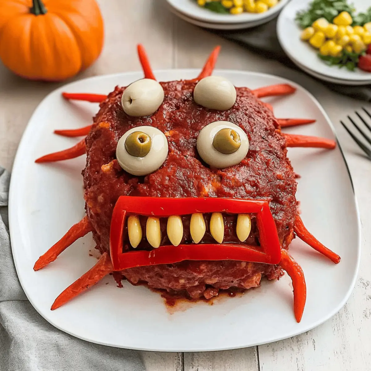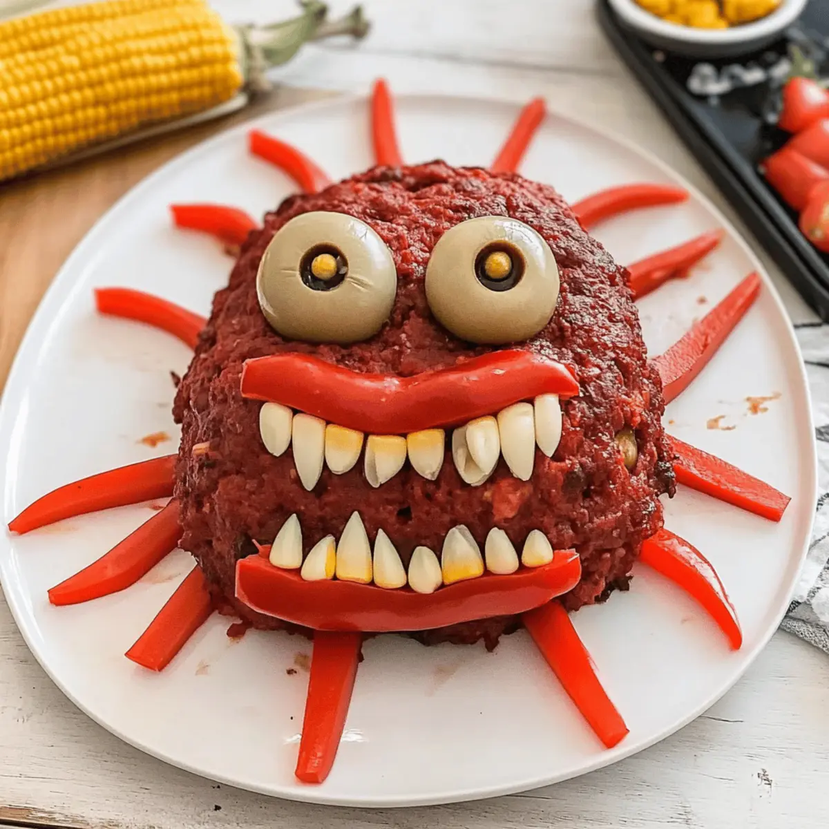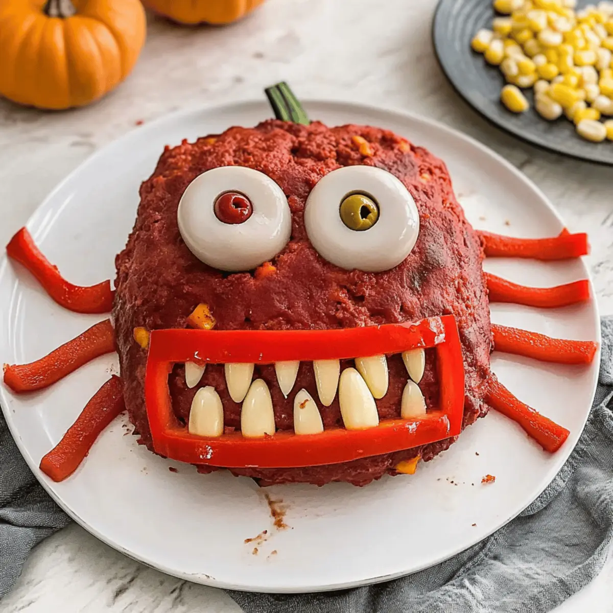 Jump to Recipe Print RecipeAs I pulled out the ingredients for my Halloween feast, I couldn’t help but smile at the idea of turning an everyday classic into something delightfully spooky. Enter the Monster Meatloaf—a festive centerpiece that brings laughter and fun to the dinner table. With just a quick prep, this family-friendly recipe transforms your regular meatloaf into a whimsical creature that’s perfect for a night of tricks and treats. Not only does it spark joy among kids and adults alike, but it also packs in savory goodness that will leave everyone satisfied. Are you ready to whip up this playful dish and create some monster-sized memories this Halloween? Why is Monster Meatloaf a Halloween Hit? Delightful Presentation: The Monster Meatloaf invites creativity with its playful design, making dinner a fun event for families. Savory Goodness: Packed with umami flavors from Worcestershire sauce and spices, each bite promises to please everyone’s palate. Family-Friendly Fun: Kids will love the spooky look, while adults appreciate the wholesome ingredients—perfect for making lasting memories. Quick and Easy: With just a few simple steps, you can bake this monster masterpiece in no time. Make-Ahead Friendly: Prepare ahead and store leftovers for easy meals, ensuring no waste and more time for Halloween festivities. Dive into this whimsical recipe that’s sure to be the star of your Halloween gatherings! Monster Meatloaf Ingredients • Gather the essentials for your festive creation! For the Meatloaf Ground Meat – This is the main protein; ground beef or ground turkey are great substitutes if needed. Italian Breadcrumbs – These help bind the mixture, creating a sturdy base for your monster. Worcestershire Sauce – Enhances umami flavor and moisture, making each bite delightfully savory. Tomato Sauce – Adds moisture and a tangy flavor, essential for keeping the meatloaf juicy. Diced Medium Onion – Offers a hint of sweetness and depth; substitute with shallots for a milder taste. Creole Seasoning – Adds a warm kick; use regular seasoning if you prefer less spice. Garlic Powder & Onion Powder – Boosts flavor; fresh garlic and onions can be used for a more vibrant taste. For the Eyes and Mouth Red Bell Pepper – Perfect for creating a spooky mouth; yellow or green peppers are good alternatives. Stuffed Olives – Ideal for eyes, providing a briny contrast; any kind of olives will work as substitutes. For the Monster Features Whole Kernel Corn – Adds a sweet crunch for the teeth; peas can be a fun alternative. Carrots – Steamed legs that should stay slightly firm; use cucumber sticks for an alternate crunchy touch. Mushrooms – Use raw for eye bases or cook them if you prefer a softer texture. Get ready to create a Monster Meatloaf that will charm your Halloween guests and make mealtime whimsical! Step‑by‑Step Instructions for Monster Meatloaf Step 1: Preheat Your Oven Begin by preheating your oven to 350°F (175°C). This ensures that once your Monster Meatloaf mixture is ready, it’ll go straight into a hot oven, promoting even cooking. A proper oven temperature is key to achieving that perfect, juicy texture as the meatloaf bakes. Step 2: Prepare the Meatloaf Mixture In a large bowl, combine the ground meat, Italian breadcrumbs, Worcestershire sauce, tomato sauce, diced onion, and spices like garlic and onion powder. Mix until everything is well incorporated, forming a cohesive but not overly dense mixture. It should blend harmoniously together, showcasing all that delightful seasoning and moisture. Step 3: Shape the Monster Transfer your meat mixture onto a lined baking sheet or a lightly greased loaf pan. Shape it into a monstrous figure—consider a rounded body with a pronounced head for added effect. This creative forming will add to the festive fun of your holiday feast, making it a true Monster Meatloaf. Step 4: Bake the Meatloaf Place your shaped Monster Meatloaf in the preheated oven and bake for about 1 hour, or until it reaches an internal temperature of 160°F (71°C). Keep an eye on the top; it should be browned and sizzling, with a lovely aroma wafting through the kitchen, signaling that it’s nearly done. Step 5: Steam the Carrots While the meatloaf bakes, take your carrots and lightly steam them until they’re tender yet still firm—this should take about 10 to 15 minutes. They will serve as the legs of your monster, providing a colorful and flavorful touch while keeping their shape for a fun presentation. Step 6: Prepare the Monster Features As the meatloaf finishes, cut your red bell pepper into strips for a monstrous mouth. Get your stuffed olives ready; these will serve as the eyes. The vibrant colors will not only create a spooky appearance but will also add an extra crunch and flavor to your Monster Meatloaf. Step 7: Assemble Your Monster Once the meatloaf reaches 160°F, carefully remove it from the oven and transfer it to a serving plate. Arrange the steamed carrots as legs, top the loaf with your eye-catching mushrooms, and place the olives for eyes. Don’t forget to add the corn for those charming teeth—this is where the fun really begins! Step 8: Serve and Enjoy Finally, it’s time to present your delightful Monster Meatloaf at the table! Gather your family, serve it with a flourish, and watch as smiles spread all around. This playful creation is sure to spark laughter and joy, making your Halloween dinner a memorable occasion. How to Store and Freeze Monster Meatloaf Fridge: Store leftover Monster Meatloaf in an airtight container for up to 3 days to maintain freshness while making it easy to reheat anytime you crave a tasty meal. Freezer: For longer storage, slice the meatloaf and freeze it in individual portions for up to 3 months. This allows for quick reheating and convenient serving. Reheating: To reheat, place the slices in a preheated oven at 350°F (175°C) until warmed through, about 15-20 minutes. You can al
