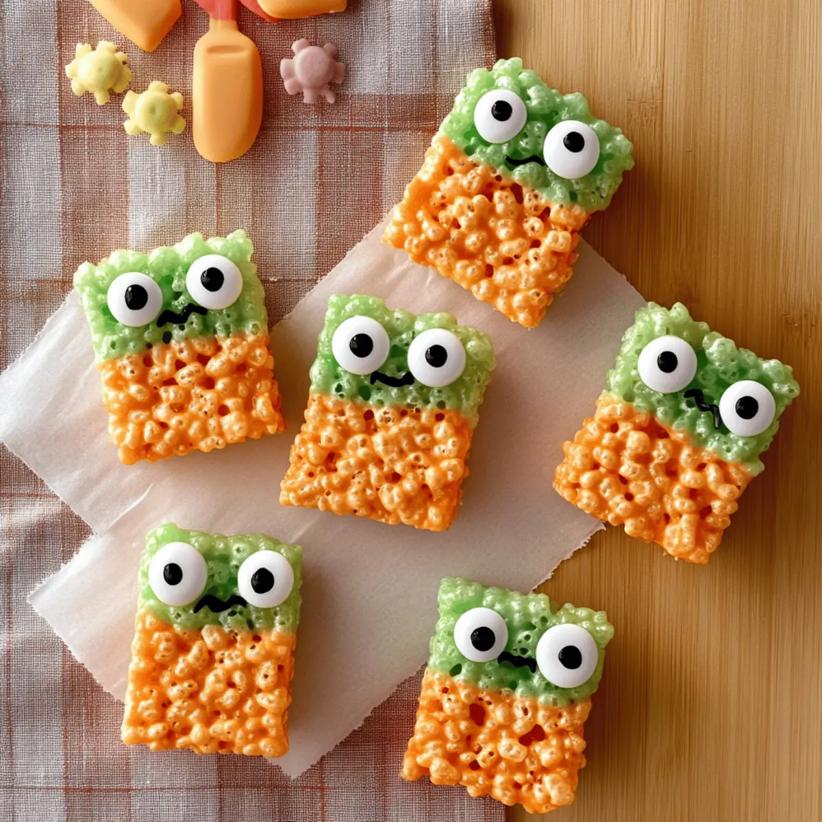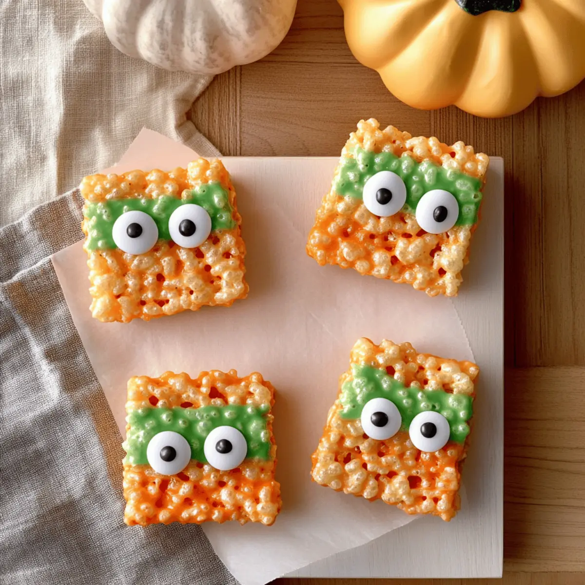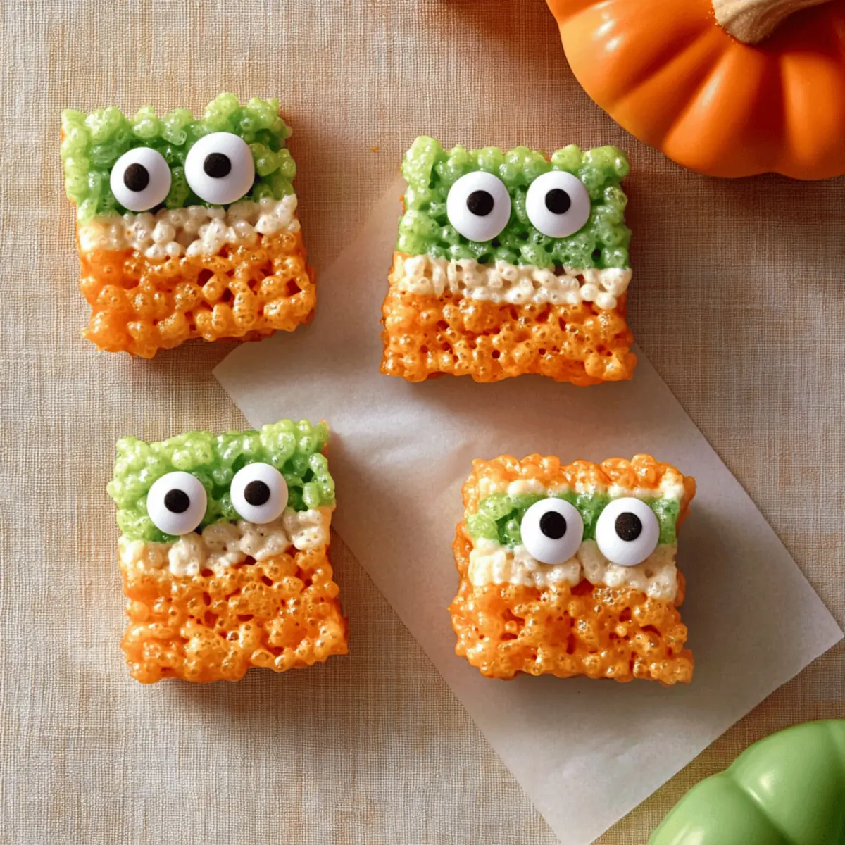 Jump to Recipe Print RecipeAs I rummaged through the pantry, the fall air tinged with the scent of spices reminded me that Halloween was just around the corner. This year, I wanted to create something truly memorable for the little goblins and ghouls in my life, and that’s when I landed on these delightful Monster Rice Krispies Treats. Not only are they colorfully enchanting and perfect for any Halloween celebration, but they also come together in a flash—ideal for those of us juggling life’s chaos. With their chewy texture, magical hues, and whimsical googly eyes, these treats are bound to be a hit at school parties or fun family gatherings. Are you ready to bring some spooky sweetness to your Halloween festivities? Let’s dive in! Why are Monster Rice Krispies Treats irresistible? Easy and Quick: With just a few simple ingredients and quick steps, you can whip up these festive treats in no time. Perfect for busy Halloween prep! A Festive Delight: The vibrant orange and green colors bring the Halloween spirit straight to your table, making them visually appealing for kids and adults alike. Customizable Fun: Feel free to get creative! Swap out the Rice Krispies for Fruity Pebbles or sprinkle on some Halloween-themed decorations for added flair. Chewy Goodness: The combination of gooey marshmallows and crispy cereal creates a delightful texture that’s hard to resist—one bite and you’ll be hooked! Perfect for Sharing: Great as party favors or to bring to school events, these treats are sure to win over any crowd! Plus, if you’re looking for other festive ideas, check out these delightful Orange Creamsicle Cookies to add more variety. Monster Rice Krispies Treats Ingredients • Get ready to create delightful magic! For the Base Cooking Spray – Prevents your treats from sticking to the pan easily; you can also use vegetable oil spray as an alternative. Unsalted Butter – Adds richness and helps the marshmallows melt smoothly for that perfect gooey texture. Mini-Marshmallows – These provide the essential sweetness and chewiness; if you only have larger marshmallows, just cut them into smaller pieces. Rice Krispies or Puffed Rice Cereal – This cereal gives crunch and structure; any puffed rice cereal will work as a substitute. For the Colorful Swirls Orange Candy Melts (12-ounce package) – These will give a vibrant Halloween color and a sweet hint of flavor; feel free to swap with white chocolate or colored chocolate chips if needed. Green Candy Melts (12-ounce package) – Compliments the orange and adds a festive touch; similar substitutions apply as with orange melts. For the Fun Decorations Small Candy Googly Eyes – These help create adorable monster faces; if you can’t find them, chocolate chips or mini marshmallows can work just as well for eyes. Let’s get those ingredients gathered and prepare to create some truly memorable Monster Rice Krispies Treats! Step‑by‑Step Instructions for Monster Rice Krispies Treats Step 1: Prep the Baking Dish Start by lightly coating a 9×13 inch baking dish with cooking spray to prevent your Monster Rice Krispies Treats from sticking. Ensure the entire bottom and corners are well greased for easy removal later. Set this aside as you prepare the delightful mixture. Step 2: Melt the Butter In a large saucepan, add 4 tablespoons of unsalted butter and place it over low heat. Stir gently as the butter melts, ensuring it doesn’t brown. This should take about 2-3 minutes. Once melted, watch for it to become bubbly, indicating it’s ready for the marshmallows. Step 3: Add the Marshmallows Carefully stir in 10 cups of mini-marshmallows into the melted butter, continuing to mix until they’re completely melted and smooth. This should take about 3-4 minutes. Remove the saucepan from the heat once the mixture is glossy and all the marshmallows are fully dissolved. Step 4: Mix in the Cereal Now, quickly add 6 cups of Rice Krispies or puffed rice cereal directly into the melted marshmallow mixture. Use a spatula to fold the cereal in gently but thoroughly, ensuring it’s completely coated. This step should take about 1-2 minutes, and you’ll want to see a nice, sticky blend before moving on. Step 5: Divide and Color the Mixture Pour the mixture onto a clean countertop or into a large bowl and evenly divide it in half. In one half, mix in 1 cup of orange candy melts until completely combined. In the other, mix in 1 cup of green candy melts. Stir thoroughly for a vibrant color throughout each portion which should only take 1-2 minutes. Step 6: Spread the Mixture Press each color mixture into the prepared baking dish, alternating if desired. Use your lightly greased hands or a spatula to ensure it’s evenly distributed and packed down tightly. This step should take about 4-5 minutes, and you’ll want a smooth, even surface as you fill the dish. Step 7: Decorate with Googly Eyes Once your mixtures are slightly cooled but still warm, it’s time to add the fun! Sprinkle candy googly eyes on top of the treats, gently pressing them in for them to adhere well. This decorative step will only take a couple of minutes and will bring your Monster Rice Krispies Treats to life! Step 8: Cool and Cut Allow the treats to cool completely in the baking dish at room temperature for about 30-40 minutes. Once set, use a sharp knife to cut them into squares or fun shapes to serve. You’re ready to delight everyone with your delicious and colorful Monster Rice Krispies Treats! Expert Tips for Monster Rice Krispies Treats Fresh Ingredients: Use fresh mini-marshmallows for the best chewy texture and flavor. Stale marshmallows can lead to a hard treat. Speedy Mixing: Work quickly when adding the Rice Krispies to the melted mixture, as it can harden rapidly. Stay focused to keep your treats fluffy! Avoid Sticky Hands: To prevent your hands from sticking while pressing the mixture into the pan, use lightly greased hands or wear gloves during this step. 