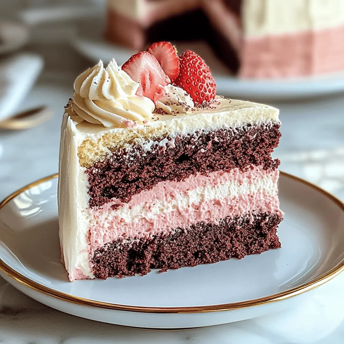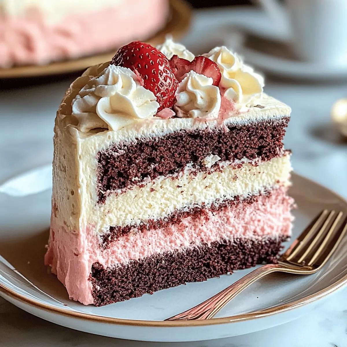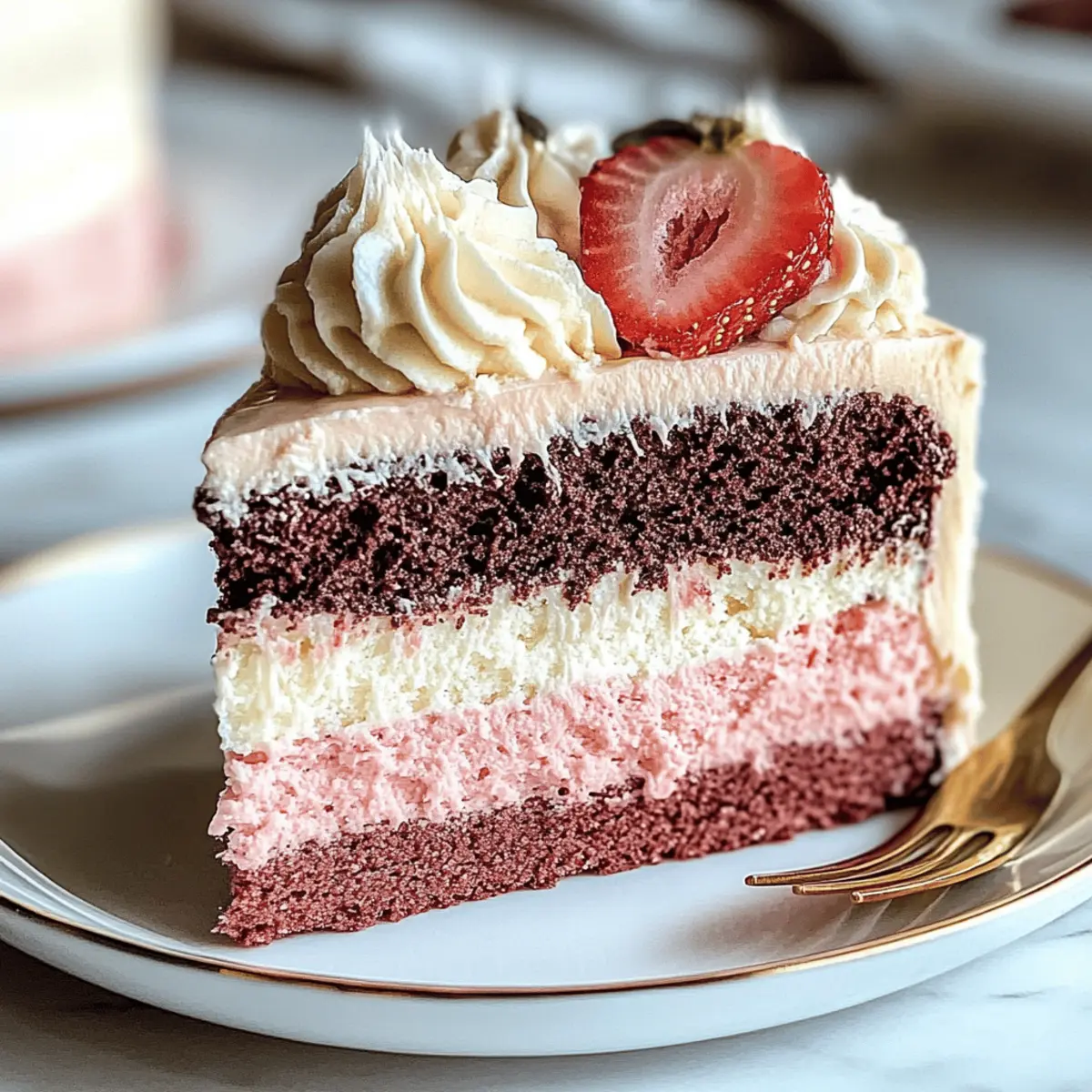 Jump to Recipe Print RecipeAs I sliced into the beautifully layered Neapolitan Cake, the delightful aroma of chocolate, vanilla, and fresh strawberries wafted through the air, transporting me to carefree summer picnics. This celebration cake is not just a feast for the eyes; it’s elegantly customizable, making it perfect for any occasion. Whether you’re hosting a birthday bash or just treating yourself after a long day, this dessert brings a touch of joy and warmth to the table. With its easy-to-follow steps, even novice bakers can create a stunning dessert that dazzles guests and sparks conversation. So, are you ready to embark on this sweet journey of flavor and color? Why is Neapolitan Cake So Special? Jaw-Dropping Appearance: This stunning cake is a feast for the eyes as much as it is for the palate, with its vibrant layers of chocolate, vanilla, and strawberry. Endless Customization: Whether you want to swap strawberries for peaches or add a hint of almond extract, the flavors are as adaptable as your taste buds! Simple to Make: Even if you’re new to baking, this straightforward recipe ensures that you can create a show-stopping dessert with minimal fuss. Perfect for Celebrations: Be it birthdays, holidays, or casual get-togethers, a slice of Neapolitan Cake is bound to be the star at any gathering. Pair it with vibrant fresh fruit or a scoop of whipped cream for an extra touch! Shared Joy: This cake isn’t just dessert; it’s a conversation starter, a centerpiece, and a heartfelt offering to friends and family, creating moments that linger long after the last bite. Plus, if you’re looking for more baking inspiration, check out my Blueberry Cake Donuts or Zucchini Coffee Cake! Neapolitan Cake Ingredients For the Cake Layers • All-purpose flour – Provides structure to the cake; substitute with gluten-free flour blend for a gluten-free version. • Cocoa powder – Adds rich chocolate flavor; use unsweetened cocoa for deep flavor. • Granulated sugar – Sweetens and retains moisture; reduce for a less sweet cake. • Baking powder – Acts as a leavening agent; ensure it’s fresh for best results. • Salt – Enhances flavors; a pinch boosts sweetness perception. • Eggs – Binds ingredients and adds moisture; use flax eggs as a vegan alternative. • Milk – Moistens and enriches the batter; substitute with almond or oat milk for a dairy-free option. • Vanilla extract – Infuses rich fragrance; use pure vanilla for the best flavor. • Melted chocolate – Deepens the chocolate layer’s flavor; swap with dark chocolate for a richer taste. • Pureed strawberries – Adds fruitiness to one of the layers; substitute with raspberry puree for a different twist. For the Frosting • Cream cheese frosting – Provides a creamy, tangy finish; can be replaced with whipped cream or chocolate ganache for variation. Indulge in the delicious world of flavors with this Neapolitan Cake that adds joy to every celebration! Step‑by‑Step Instructions for Delectable Neapolitan Cake Step 1: Preheat Oven Begin by preheating your oven to 350°F (175°C). While it warms up, prepare three round cake pans by greasing them thoroughly or lining them with parchment paper. This ensures that your delectable Neapolitan Cake layers will release easily after baking, setting the stage for a beautiful presentation. Step 2: Prepare Dry Ingredients In a large mixing bowl, whisk together all-purpose flour, cocoa powder, granulated sugar, baking powder, and salt. This mixture provides the structure and sweetness for your cake layers, so make sure it’s well blended. Set this bowl aside as you gather your wet ingredients, ready to create a harmonious batter. Step 3: Mix Wet Ingredients In a separate bowl, blend together the eggs, milk, and vanilla extract until smooth. This combination brings moisture and richness to your Neapolitan Cake. Gradually pour this mixture into the bowl with the dry ingredients, stirring gently to combine. Be careful not to overmix; a light touch will keep your cake beautifully fluffy! Step 4: Divide Batter Once your batter is mixed, carefully divide it into three equal portions in separate bowls. In one bowl, fold in the melted chocolate for a rich cocoa layer. In another, gently mix in pureed strawberries for a fruity layer. Leave the last portion as plain vanilla, ensuring a beautiful gradient of flavors in your Neapolitan Cake. Step 5: Bake Layers Pour each flavor portion into the prepared cake pans, smoothing the tops for an even bake. Place them in the preheated oven and bake for 25-30 minutes. Check for doneness by inserting a toothpick into the center—if it comes out clean, the layers are ready! Allow them to cool in the pans for 10 minutes before transferring them to a wire rack. Step 6: Assemble Cake Once your cake layers are completely cool, it’s time to assemble your magnificent Neapolitan Cake! Start by placing one layer on a serving platter, and spread a generous layer of cream cheese frosting on top. Carefully add the second layer, repeating the frosting process, and finish with the final layer. Don’t forget to cover the top and sides of the entire cake with frosting for a stunning finish. Step 7: Final Touches To enhance the beauty of your Neapolitan Cake, consider drizzling some chocolate or strawberry sauce over the frosting. You might also sprinkle fresh fruits or colorful sprinkles on top for an extra burst of color. Now, let your creation shine as a centerpiece, perfect for celebrations and gatherings! Neapolitan Cake Variations & Substitutions Feel free to unleash your creativity and customize the Neapolitan Cake to suit your palate! Fruit Alternatives: Swap strawberries with raspberries or peaches for a burst of different flavors. Vegan Option: Replace eggs with flax eggs and use almond milk instead of regular milk for a plant-based twist. Gluten-Free: Use a gluten-free flour blend to make this delightful cake suitable for those with diet