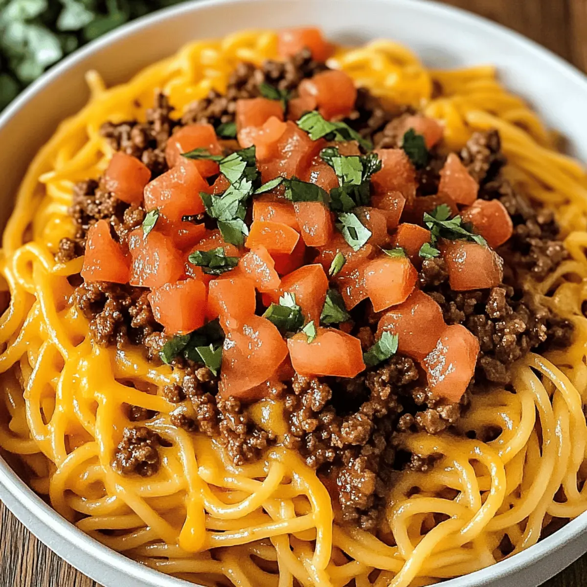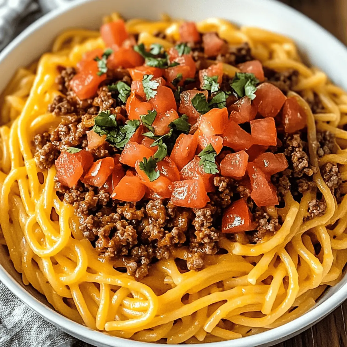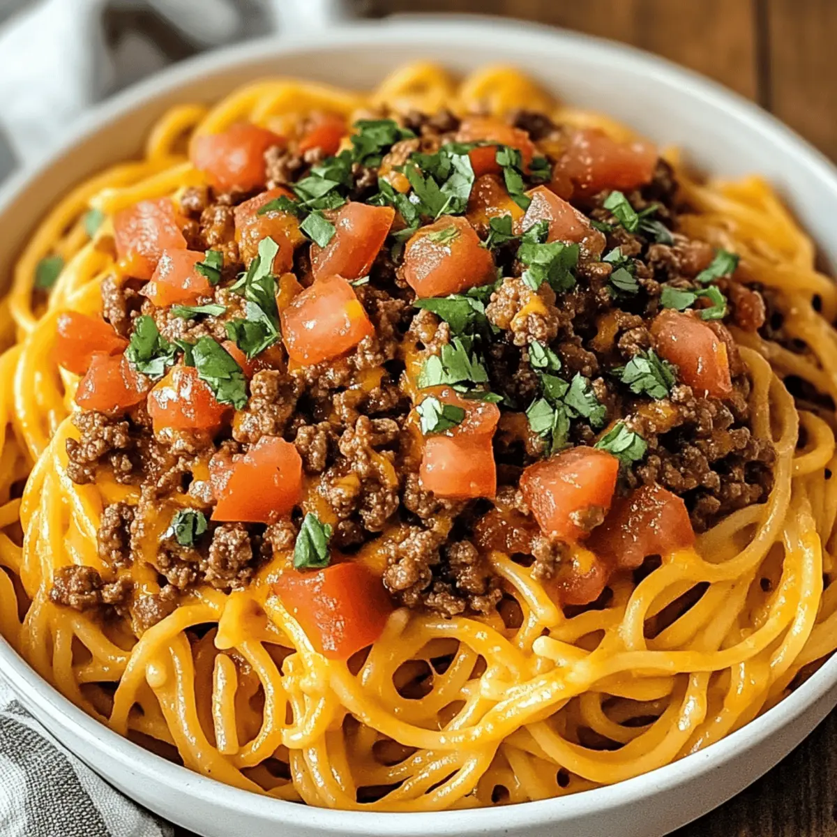 Jump to Recipe Print Recipe“What’s for dinner?” This age-old dilemma unravels with a little creative thinking and a dash of culinary flair! Allow me to introduce you to my One-Pot Taco Spaghetti, where the comforts of hearty pasta meet the bold zest of your favorite taco seasonings. In a mere 30 minutes, this delightful dish transforms your busy weeknight into an effortless cooking triumph, making clean-up a breeze. It’s not just family-friendly; it’s also adaptable for various dietary needs, so whether you’re vegetarian, gluten-free, or just seeking a simple yet satisfying meal, I’ve got you covered. Are you ready to dive into a bowl of this comforting fusion that will please everyone at your table? Let’s get cooking! Why Is One-Pot Taco Spaghetti a Must-Try? Quick and Easy: You’ll whip this up in under 30 minutes, making it perfect for those hectic weeknights. Customizable Flavors: Love a little spice? Add jalapeños! Prefer it vegetarian? Swap in black beans or lentils! Minimized Cleanup: One pot means less mess and hassle, leaving you more time to enjoy your meal. Family-Friendly: Kids and adults alike will savor the cheesy goodness combined with zesty taco flavors. Pair this dish with a fresh side salad for additional nutrition or indulge in some garlic bread to mop up every last bit! Comforting Fusion: This dish brilliantly marries hearty pasta with the vibrant essence of tacos, providing a unique taste experience that stands out. One-Pot Taco Spaghetti Ingredients For the Pasta • Spaghetti – This serves as the main carb base; feel free to swap it for linguine or gluten-free pasta! For the Protein • Ground Beef or Turkey – Adds heartiness to the dish; substitute with black beans or lentils for a vegetarian version. For the Seasoning • Taco Seasoning – Infuses the dish with vibrant taco flavors; use your favorite store-bought blend or make your own for a personal touch. For the Cheese • Cheddar Cheese – Gives that creamy meltiness; try Monterey Jack or a dairy-free option if you need a lactose-free meal. For the Sauce • Diced Tomatoes – Contributes moisture and acidity; fresh tomatoes or tomato sauce work wonderfully if you prefer a homemade touch. With these ingredients in hand, you’re just moments away from enjoying a delicious bowl of One-Pot Taco Spaghetti that will warm your heart and satisfy your taste buds! Step‑by‑Step Instructions for One-Pot Taco Spaghetti Step 1: Cook the Protein In a large skillet over medium heat, add the ground beef or turkey and cook for 5–7 minutes until browned and no longer pink. Use a wooden spoon to break apart the meat, ensuring it cooks evenly. Once cooked, drain any excess fat if necessary, and prepare for the next flavorful step in making your One-Pot Taco Spaghetti. Step 2: Add Seasoning Stir in the taco seasoning and diced tomatoes to the skillet, letting the mixture simmer for about 2 minutes until fragrant and well-combined. The spices should envelop the meat, creating a delicious aroma. This step enhances the savory base of your One-Pot Taco Spaghetti before bringing in the pasta! Step 3: Combine Pasta Next, add the uncooked spaghetti to the skillet, ensuring it’s right in the flavorful mixture. Pour in about 4 cups of water, then cover the skillet with a lid. Bring it to a boil, then reduce the heat to low, and let it simmer for 10–12 minutes until the pasta is tender and has absorbed most of the liquid, stirring occasionally. Step 4: Incorporate Cheese Once the pasta is cooked to your desired tenderness, remove the skillet from heat and gradually mix in the shredded cheddar cheese. Stir continuously until the cheese is melted and creamy, turning your One-Pot Taco Spaghetti into a rich and comforting dish. The cheese will create a deliciously gooey texture. Step 5: Serve Spoon the One-Pot Taco Spaghetti into bowls and add your favorite garnishes like sour cream, chopped avocado, or fresh cilantro. Present it beautifully to your family, inviting them to enjoy this hearty, flavorful fusion that brings the best of tacos and pasta together in one delightful meal. What to Serve with One-Pot Taco Spaghetti Let the vibrant flavors of this comforting dish inspire your meal and create a delightful dining experience. Garlic Bread: The warm, buttery crunch complements the creamy pasta wonderfully, perfect for scooping up every last bit of sauce. Fresh Garden Salad: A colorful mix of lettuce, tomatoes, and cucumbers adds a refreshing contrast, balancing the richness of the spaghetti beautifully. Mexican Street Corn: This flavorful side, topped with lime and cheese, brings an extra layer of zest that pairs harmoniously with the taco-inspired spaghetti. Sour Cream and Guacamole: These classic toppings enhance the dish with creaminess and richness, creating a satisfying finish for each bite. Crispy Tortilla Chips: Serve with a side of salsa for dipping! The crunch adds texture and is an exciting way to complement the flavors of your spaghetti. Cheesy Quesadillas: Loaded with gooey cheese, they mirror the flavors in your main dish, creating a cheesy explosion that the whole family will love. Chilled Horchata: This sweet, creamy beverage not only refreshes but also beautifully counterbalances the savory spices of the pasta. Chocolate Churros: For dessert, these sweet treats offer a delightful contrast and a perfect finish to your vibrant meal. The warm cinnamon sugar dips are irresistible! With these pairings, your One-Pot Taco Spaghetti transforms into a complete and memorable dining experience that everyone will cherish! Make Ahead Options One-Pot Taco Spaghetti is a fantastic option for meal prep, saving you precious time on those busy weeknights! You can prepare the meat and taco seasoning mixture up to 24 hours in advance. Simply cook the ground meat, mix it with the seasoning and diced tomatoes, and store it in an airtight container in the fridge. The pasta can also be cooked ahead; just make sure 