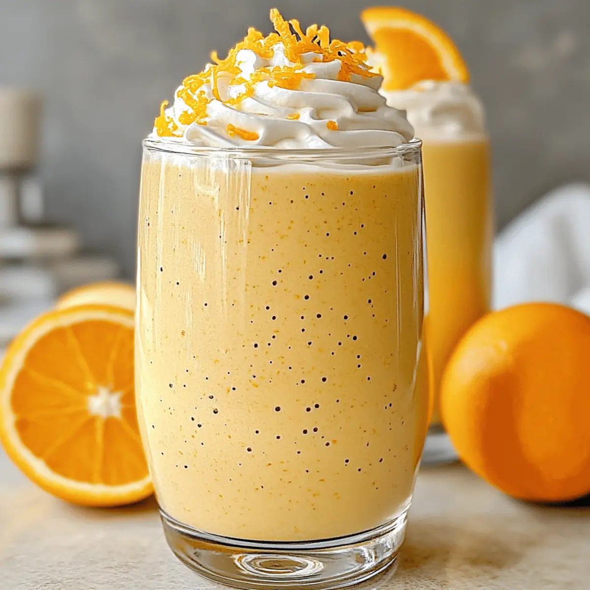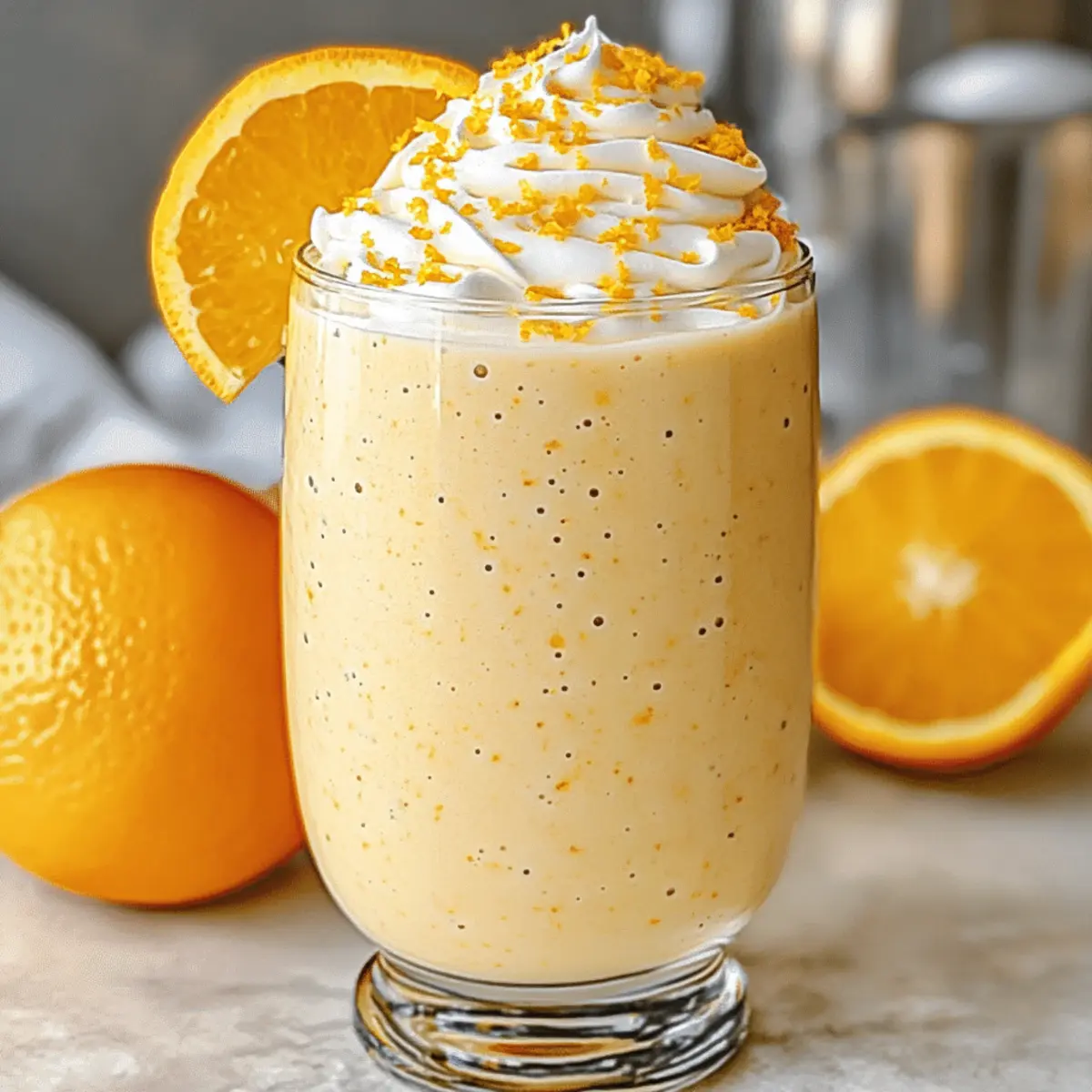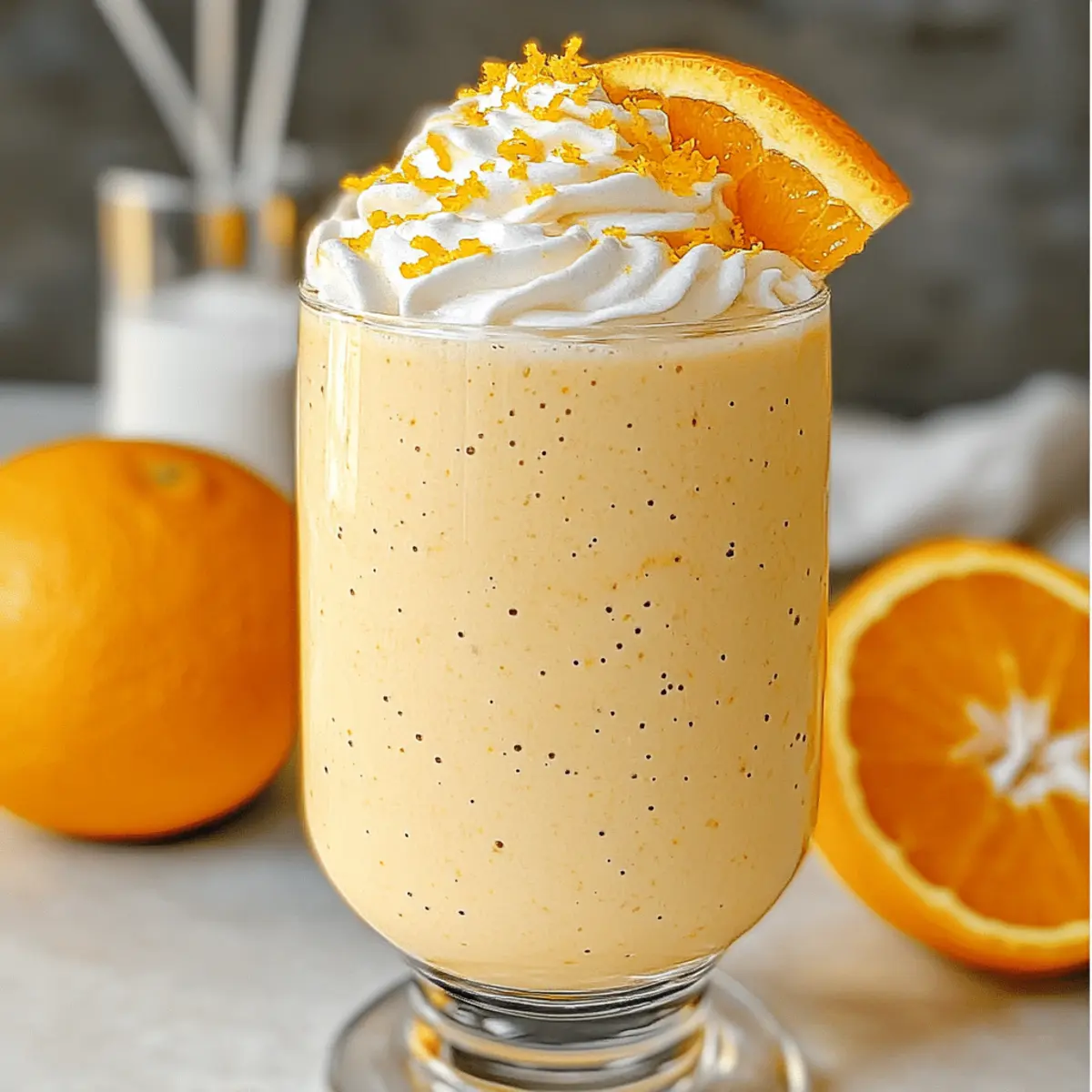 Jump to Recipe Print RecipeAs I blended my once-frozen bananas with zesty orange juice, the vibrant color whirlpooled into a cheerful sunrise. This creamy Orange Creamsicle Smoothie is more than just a drink; it’s a delightful trip down memory lane, evoking sunny days and childhood treats. Perfect for busy mornings or as a refreshing post-workout snack, this quick and easy recipe takes just five minutes to whip up using simple ingredients you already have in your pantry. Plus, it’s customizable—feel free to swap in your favorite fruits for a fun twist! Who can resist a healthy treat that brings a burst of nostalgia with every sip? Let’s dive into the recipe and see what delightful variations await! Why is this Orange Creamsicle Smoothie a Must-Try? Nostalgic vibes are packed into every sip, making this smoothie a joyful reminder of childhood summers. Customizable options abound—switch up the fruits or sweetness to match your preferences! Quick and easy, it comes together in just five minutes, perfect for busy mornings. Nutritious ingredients provide a guilt-free treat that’s delicious and healthy. Whether paired with a light breakfast or enjoyed solo as a snack, this drink is an instant crowd-pleaser. Check out our Watermelon Banana Smoothie for another refreshing idea! Orange Creamsicle Smoothie Ingredients For the Smoothie • Frozen Bananas – Adds natural creaminess and sweetness for that milkshake-like texture; substitute with frozen mango for a different flavor. • Orange Juice – Provides a bright, tangy flavor; try mandarin juice to switch things up! • Orange Zest – Enhances the citrus flavor, bringing a delightful aroma that transports you to sunny days. • Greek Yogurt – Contributes richness and protein; replace it with coconut yogurt for a vegan-friendly option. • Milk of Choice – Adjusts thickness and creaminess; any dairy or plant-based milk suits this recipe well. • Honey or Maple Syrup – Naturally sweetens the smoothie; swap for a Medjool date if you want a whole-food alternative. Optional Add-Ins • Vanilla Protein Powder – For an extra protein boost that complements the smoothie beautifully. • Coconut Milk – Use for a lighter version or omit yogurt for a vegan-friendly treat. • Other Fruits – Include strawberries or peaches for a fruity twist that makes every sip exciting. Craft this Orange Creamsicle Smoothie and enjoy a refreshing boost that’s as nourishing as it is nostalgic! Step‑by‑Step Instructions for Orange Creamsicle Smoothie Step 1: Gather Ingredients Begin by assembling all necessary ingredients for your Orange Creamsicle Smoothie—frozen bananas, orange juice, orange zest, Greek yogurt, and your choice of milk. Measure out these pantry staples to ensure a smooth workflow. Having everything ready will make the blending process quick and enjoyable, keeping those nostalgic vibes flowing. Step 2: Blend the Base In a high-speed blender, combine the frozen bananas, orange juice, orange zest, Greek yogurt, and milk. Secure the lid tightly and blend on high for about 30 to 60 seconds until the mixture turns smooth and creamy. You’ll know it’s ready when it resembles a vibrant, frosty orange shake that beckons to be enjoyed. Step 3: Adjust Sweetness Once your smoothie is beautifully blended, pause to taste your creation. If you prefer a sweeter drink, carefully add honey or maple syrup, blending again for a few seconds to fully incorporate. This step allows you to customize your Orange Creamsicle Smoothie, balancing the tangy citrus with delightful sweetness. Step 4: Serve and Garnish Pour your creamy Orange Creamsicle Smoothie into chilled tall glasses for a refreshing presentation. For an extra touch of beauty, garnish with orange slices or a light dusting of orange zest on top. The vibrant colors and lovely aroma enhance the overall experience, inviting everyone to savor the nostalgic charm of this summertime treat. How to Store and Freeze Orange Creamsicle Smoothie Fridge: Store any leftover smoothie in an airtight container for up to 24 hours. Give it a good shake or stir before enjoying, as separation may occur. Freezer: If you have leftover portions, freeze the smoothie in ice cube trays. Once frozen, transfer the cubes to a freezer bag, where they can be stored for up to 3 months. Reheating: Thaw frozen smoothie cubes overnight in the fridge, then blend with a splash of juice or milk for an instant refreshment that brings back that Orange Creamsicle Smoothie magic! Making Ahead: Prepare smoothie packs by combining frozen bananas, zest, and yogurt in freezer bags; all you’ll need to do is blend with juice and milk when you’re ready to treat yourself! What to Serve with Orange Creamsicle Smoothie Enjoy this delightful smoothie as part of a wholesome meal or light snack. Granola Parfait: Layer creamy yogurt and crunchy granola for textural contrast that complements the smoothie’s sweetness beautifully. Avocado Toast: The rich, creamy texture of spicy avocado on whole-grain toast offers a savory balance to the citrusy drink, creating a perfect morning duo. Chia Seed Pudding: This creamy, nutrient-packed pudding adds a delightful chewiness. Consider adding a splash of orange zest to tie the flavors together! Fruit Salad: A refreshing mix of seasonal fruits like berries and melons enhances the vibrant flavors of your smoothie while providing a burst of freshness. Light Muffins: Pair with mini muffins such as blueberry or lemon for a delightful, handheld treat that contrasts the smoothie’s texture. Lightly Sweetened Green Tea: The subtle flavors of green tea with just a hint of sweetness cleanse the palate and elevate the experience of enjoying your smoothie. Coconut Whipped Cream: For a touch of indulgence, layer your smoothie with fluffy whipped coconut cream for a decadent treat. Enjoy it just as is or garnish with fresh fruit! Orange Creamsicle Smoothie Variations Feel free to explore these creative twis