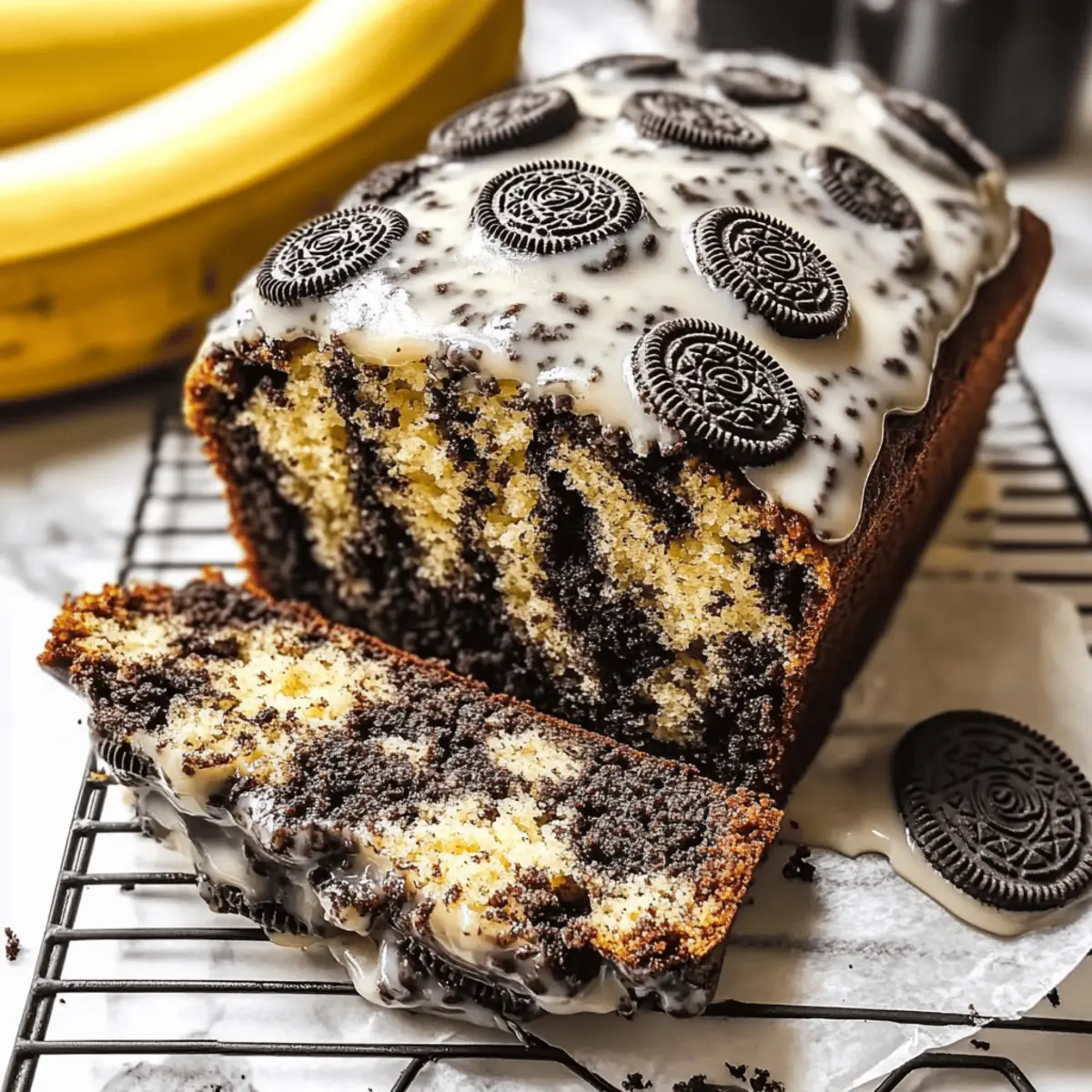 Once the bread is completely cooled, drizzle the prepared glaze over the top. Allow the glaze to set for a few minutes before slicing your decadent Oreo Banana Bread into thick, inviting pieces. Now you have a gorgeous loaf ready to share with family and friends, perfect for any occasion!