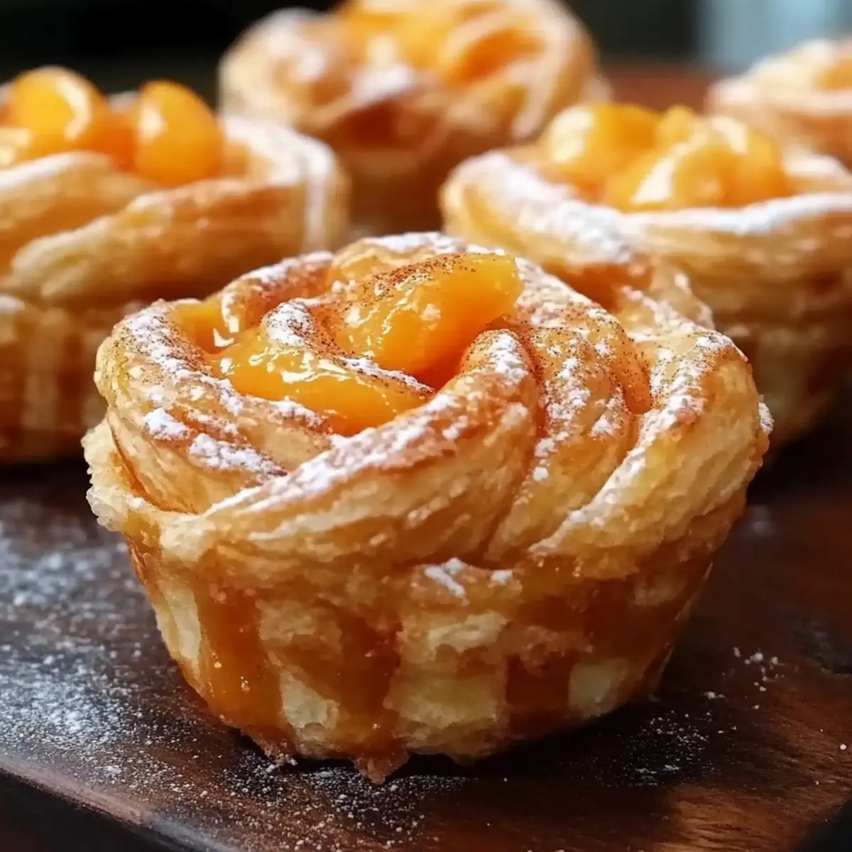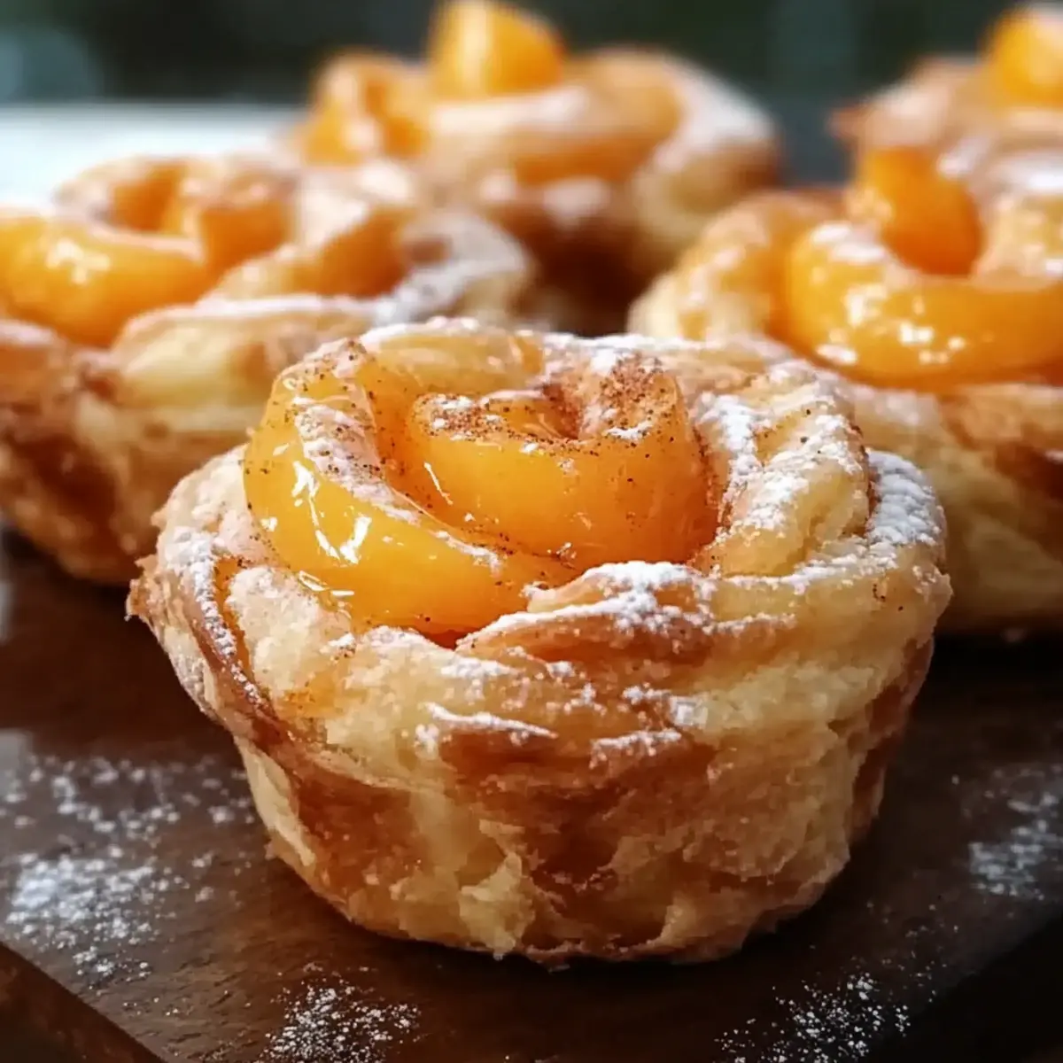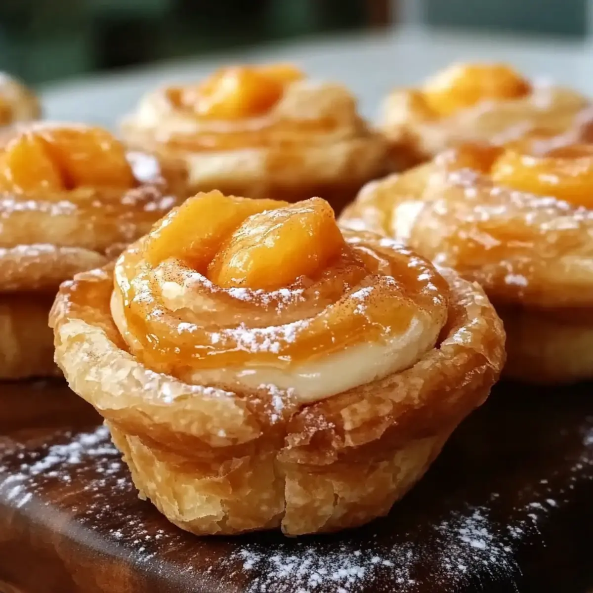Jump to Recipe Print RecipeAs I stood in the kitchen, the sweet scent of peaches mingling with cinnamon and buttery dough wafted through the air, instantly transporting me to summer picnics. That’s the magic of Peach Pie Cruffins! This delightful blend of croissants and muffins delivers all the comforting flavors of a classic peach pie wrapped in a whimsical spiral. With just a few simple ingredients, you can whip up this easy dessert that is bound to impress at any gathering. Plus, the flaky texture and gooey peach preserve filling make them a crowd-pleaser, perfect for brunch or an evening treat. Are you ready to dive into a world of cozy baking and create a dessert that will warm hearts? Let’s get started! Why Are You Going to Love These Cruffins? Uniquely Delicious: Peach Pie Cruffins marry the best of both worlds—croissants and muffins—for a mouthwatering treat that’s sure to impress. Flaky Perfection: Each cruffin boasts a golden, flaky exterior that crumbles beautifully while revealing a gooey peach filling inside, reminiscent of a comforting peach pie. Quick & Easy: With just a few simple ingredients like refrigerated crescent dough and peach preserves, you can whip these up in no time, making them a fantastic choice for busy bakers. Versatile Options: While peach is divine, feel free to experiment with different fruit preserves or add a splash of almond extract to take your flavors to the next level. Perfect for Any Occasion: Whether it’s a sweet brunch, casual gathering, or cozy dessert, these cruffins are bound to be a crowd-pleaser and the talk of the town! Plus, you might also enjoy our delightful Peach Cobbler Buttery for a traditional twist or a fresh Millionaire Peach Salad to accompany your treats. Peach Pie Cruffins Ingredients For the Dough • Refrigerated Crescent Dough – This brings a flaky texture and delightful structure; puff pastry can be used for a crispier result. For the Filling • Peach Preserves – Sweet and fruity, providing that classic peach pie flavor; feel free to swap with other jams, Nutella, or apple butter for exciting variations. • Cinnamon – This warm spice elevates the flavor; it’s optional, but highly recommended for that cozy taste. For the Glaze • Sweet Glaze – The finishing touch that adds a beautiful sheen and sweetness; recipes for glaze can vary widely, so choose your favorite! With these simple ingredients, you’ll be well on your way to crafting delightful Peach Pie Cruffins that are sure to impress! Step‑by‑Step Instructions for Peach Pie Cruffins Step 1: Preheat the Oven Begin by preheating your oven to 375°F (190°C). This ensures that your Peach Pie Cruffins bake evenly and achieve that golden, flaky texture we all love. As the oven warms up, prepare your muffin tin by greasing it lightly or lining it with paper liners to prevent sticking, making removal a breeze later on. Step 2: Prepare the Dough Unroll the refrigerated crescent dough onto a clean, flat surface, and gently press the seams to seal them together. Using a rolling pin, roll the dough out to create a larger rectangle. This will give your Peach Pie Cruffins a beautiful, flaky body once baked. Visualize a nice, even surface to spread the sweet peach preserves. Step 3: Spread the Filling Take a generous amount of peach preserves and spread it evenly across the rolled-out dough. Make sure to cover every inch, as this sweet filling is the heart of your Peach Pie Cruffins. If you’d like an extra touch of warmth, sprinkle a teaspoon of cinnamon over the preserves for a delightful flavor boost. Step 4: Roll and Cut Starting from one edge, tightly roll the dough into a spiral, ensuring the preserves are tucked inside. Once rolled, slice the log into approximately 12 equal pieces. Each piece should be a charming spiral that reveals the beautiful layers of peach and dough, setting the stage for perfectly flaky cruffins. Step 5: Arrange in Muffin Tin Carefully place each spiral piece into the prepared muffin tin, making sure to position them upright. The spirals should take up about half the cup, allowing for some room to expand. As they bake, the Peach Pie Cruffins will puff up beautifully, filling your kitchen with tantalizing aromas! Step 6: Bake to Perfection Place the muffin tin in your preheated oven and bake the cruffins for about 20 minutes. Keep an eye on them as they cook, looking for a lovely golden-brown color to signal they’re perfectly done. The aroma of peaches and cinnamon will fill the air, making it hard to wait! Step 7: Cool and Glaze Once baked, remove the cruffins from the oven and let them cool in the pan for about 5 minutes. This helps them retain their shape as they set. After cooling slightly, drizzle your sweet glaze over the warm Peach Pie Cruffins to add an irresistible finishing touch. Make Ahead Options Peach Pie Cruffins are a fantastic choice for meal prep enthusiasts, saving you time for busy mornings or gatherings! You can assemble the cruffins up to 24 hours in advance; simply roll, cut, and place them in a muffin tin, covering tightly with plastic wrap before refrigerating overnight. This allows the flavors to meld beautifully. When you’re ready to serve, preheat your oven and bake them straight from the fridge to achieve that perfect golden color. For best results, avoid letting them sit out for too long before baking, so that they maintain their delightful flaky texture. Enjoy these delicious treats with minimal morning effort! Peach Pie Cruffins: Endless Possibilities Customize your cruffins with flavorful twists and delightful substitutions for a truly unique dessert experience! Puff Pastry: Swap crescent dough for puff pastry for an ultra-flaky and crispy treat that elevates the cruffin experience. Berry Preserves: Instead of peach, use berry preserves like raspberry or blueberry for a vibrant and tangy alternative. Nutella Delight: Spread a layer of Nutella along with peach preserves for a luscious cho