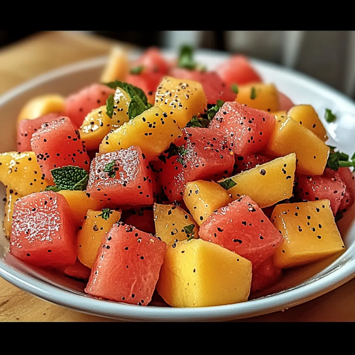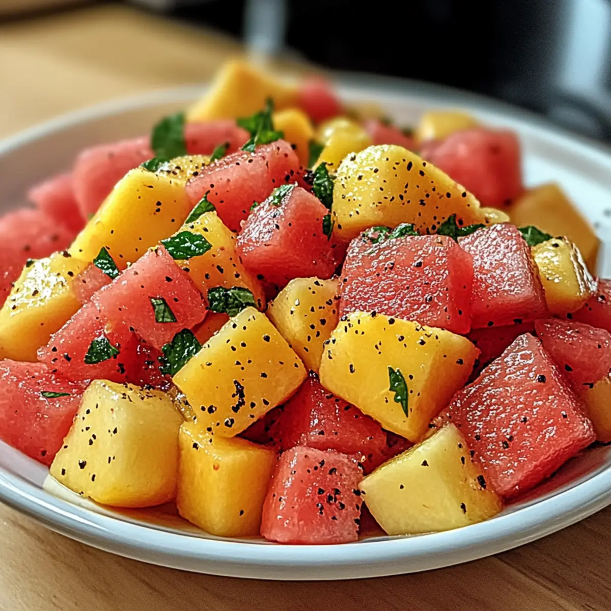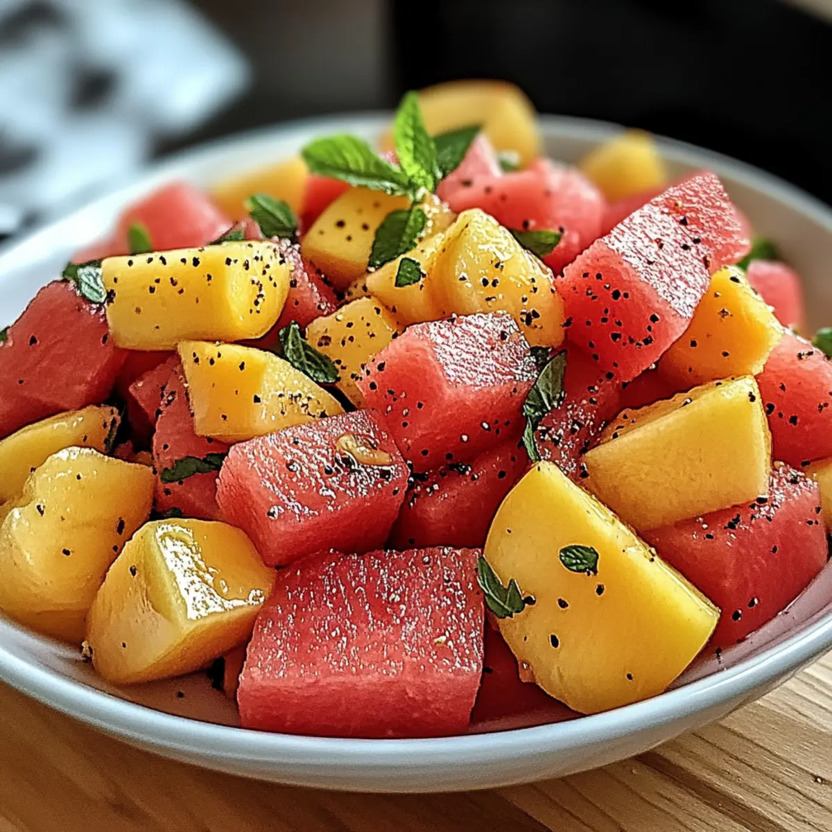 Jump to Recipe Print RecipeNothing says summer like the delightful combination of sweet peaches and juicy watermelon dancing together in a bowl. My mouth waters just thinking about this refreshing Peach Watermelon Salad, bursting with colors and flavors that instantly evoke sun-soaked picnics and backyard barbecues. With only ten minutes of prep time, this quick and easy vegan dish is not only a feast for the eyes, but it also keeps you cool and hydrated on warm days. Picture this: a vibrant medley of fruits, accented by aromatic mint and a zesty dressing, ready to elevate any meal or stand alone as a satisfying snack. Curious about how to bring this summer celebration to your table? Let’s dive into the details! Why is Peach Watermelon Salad a Must-Try? Simplicity at its core: This recipe is as easy as it gets—just ten minutes of prep! Refreshing taste: The blend of sweet peaches and juicy watermelon provides a hydrating thrill on bright summer days. Versatile acclaims: Perfect as a side for grilled meats or as a light lunch alongside pita and hummus. For an exciting take, consider pairing it with Radish Salad Roasted for an unexpected crunch! Visual delight: The beautiful colors make it a stunning centerpiece for any gathering, sure to impress your guests. Healthy indulgence: Low-calorie and high in fiber, this salad helps keep cravings at bay while packing in essential nutrients. Easy substitutions: Whether you want to add feta for a savory twist or replace mint with basil, the possibilities are endless! Peach Watermelon Salad Ingredients For the Salad • Watermelon – the main component providing hydration and sweetness; use fresh, ripe watermelon for the best flavor. • Peaches – adds a soft texture and sweetness; ripe peaches enhance the dish and bring out its fruity goodness. • Fresh Mint – introduces a fresh, aromatic note that elevates the flavor profile; substitute with basil for a different taste. • Cucumber/Red Onion (optional) – adds crunch and enhances the salad’s refreshing quality. For the Dressing • Lime or Lemon Juice – brightens the flavors and adds a tangy contrast; it’s essential for the Peach Watermelon Salad’s vibrant taste. • Honey (optional) – sweetens the dressing; skip for a completely vegan option and adjust sweetness to taste. Step‑by‑Step Instructions for Peach Watermelon Salad Step 1: Chill the Fruits Start by chilling your fresh watermelon and ripe peaches in the refrigerator for at least 30 minutes. This enhances their natural sweetness and refreshing qualities, making your Peach Watermelon Salad extra delightful. Visualize each piece of fruit glowing with coolness, waiting to be turned into a colorful medley. Step 2: Make the Dressing In a small bowl, whisk together the juice of one lime or lemon and a drizzle of honey, if you’re using it. Adjust the sweetness to your preference, keeping in mind that the fresh fruits offer natural sugars. With the vibrant citrus aroma filling the air, set this tangy dressing aside to let the flavors meld together. Step 3: Prepare the Fruits Once your fruits are nicely chilled, remove them from the fridge and chop the watermelon and peaches into bite-sized cubes. If you’re opting for added crunch, consider dicing some cucumber or red onion as well. Place all the cubed fruits in a large mixing bowl, allowing the vibrant colors to inspire your appetite. Step 4: Combine and Dress Drizzle the prepared dressing over the assembled fruits in the bowl. Gently toss everything together with a spatula or your hands, ensuring the fruits are well-coated but not crushed. Pay attention to the glossy finish as the dressing clings to the juicy pieces, adding an enticing shine to your Peach Watermelon Salad. Step 5: Chill Again For an ideal flavor fusion, let the salad chill in the refrigerator for another 10-15 minutes. This brief waiting time allows the dressing to soak into the fruits, enhancing their brightness. As you wait, imagine the only challenge will be deciding who gets the first scoop of this refreshing dish! Step 6: Serve in Style Finally, transfer your beautifully chilled Peach Watermelon Salad into a wide platter or a clear glass bowl for an eye-catching presentation. Garnish with a sprig of fresh mint for an aromatic touch, and get ready to impress your guests with a stunning, vibrant dish that captures the essence of summer! Make Ahead Options These Peach Watermelon Salads are perfect for meal prep, saving you valuable time on busy days! You can chop the watermelon and peaches up to 24 hours in advance and store them in an airtight container in the refrigerator to keep them fresh and vibrant. However, it’s best to prepare the dressing just before serving to avoid sogginess; simply whisk together lime or lemon juice and honey right before you’re ready to enjoy. Keep the dressing separate until serving time to maintain the crispness of the fruit. When you’re ready, combine the fruit and dressing, toss gently, and you’ll have a refreshing summer salad that’s just as delicious as if made fresh! Expert Tips for Peach Watermelon Salad Fresh is Best: Use ripe, seasonal fruits for maximum flavor. Overripe or under-ripe fruits can alter the taste of your Peach Watermelon Salad. Dress Right Before Serving: To avoid soggy fruit, add the dressing just before serving, keeping flavors fresh and vibrant. Prep Ahead: You can chop the fruits in advance, but store them separately from the dressing until just before serving for the best results. Experiment with Herbs: If you want to switch things up, try substituting mint with basil or cilantro for a unique flavor twist in your Peach Watermelon Salad. Chill for Flavor Fusion: Let the prepared salad chill for at least 10-15 minutes before serving to enhance the taste and allow the flavors to meld together beautifully. What to Serve with Peach Watermelon Salad? There’s nothing quite like the refreshing and vibrant flavors of summer, and this de