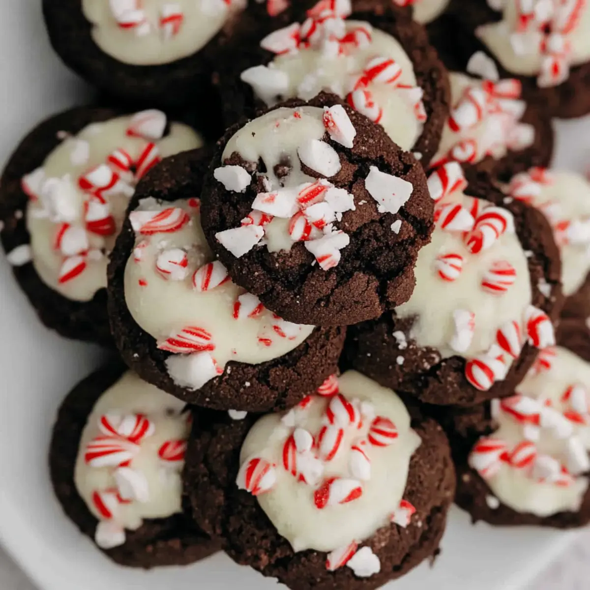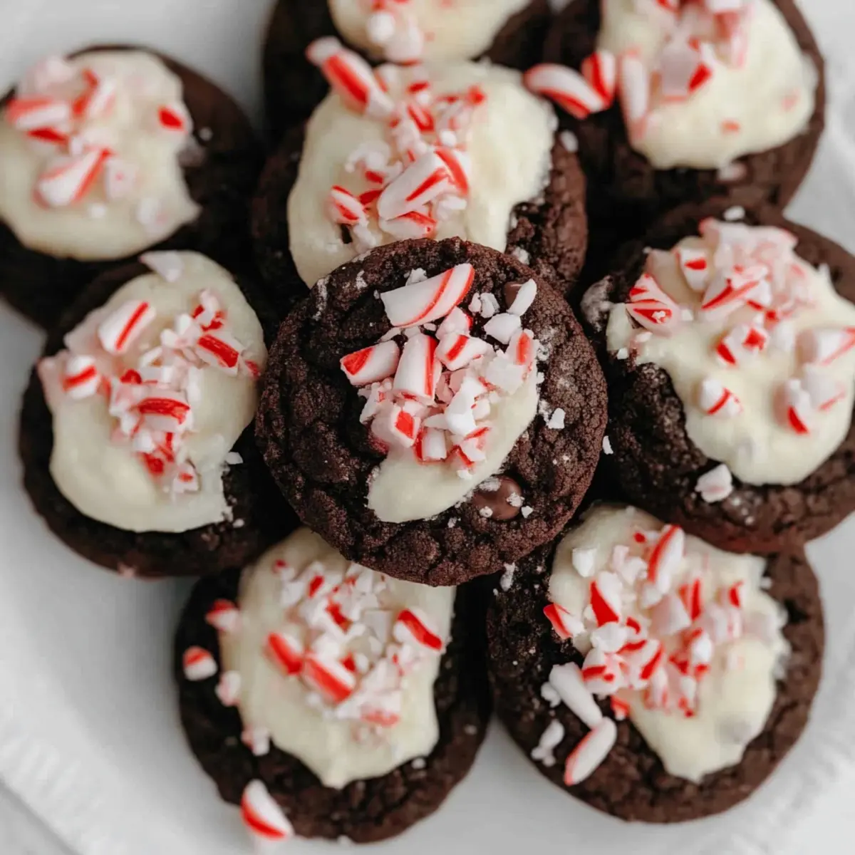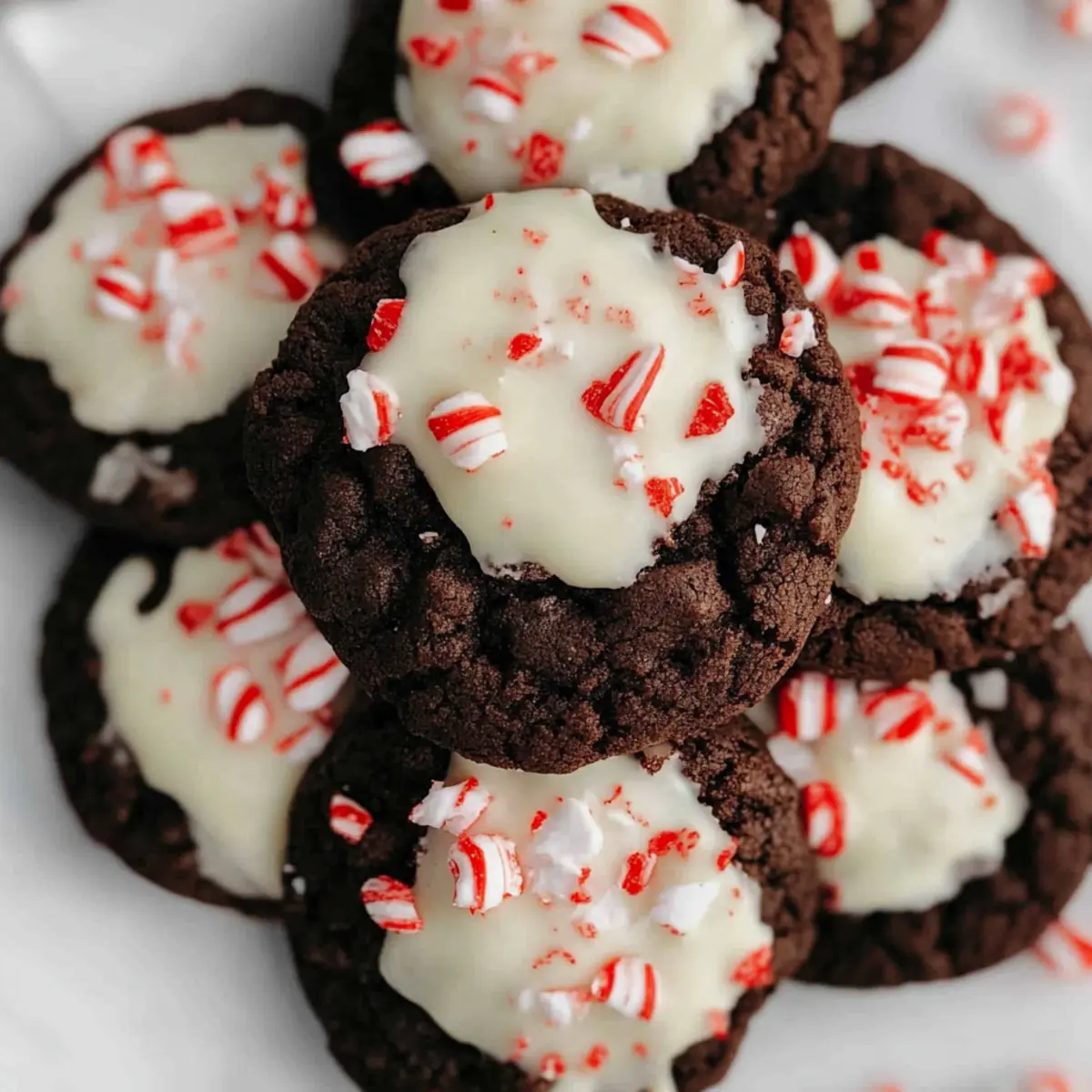 Jump to Recipe Print RecipeAs I lingered in my kitchen, the holiday spirit wafted through the air like an enchanting melody. That’s when I knew it was time to whip up a batch of my beloved Peppermint Bark Cookies. These festive treats combine the richness of dark chocolate with a creamy white chocolate coating, while crispy crushed candy canes add that perfect holiday crunch. Not only are they a delightful addition to your Christmas cookie platter, but they also come together in just 12 minutes—ideal for those busy days when you crave something sweet without the fuss. So, are you ready to indulge your senses and bring a touch of cheer to your festivities? Why are Peppermint Bark Cookies a Must-Try? Festive Flavors: These Peppermint Bark Cookies deliver a delightful combination of rich dark chocolate and creamy white chocolate layered with crunchy candy canes, encapsulating the essence of holiday spirit. Quick to Make: Whip up a batch in just 12 minutes, making them a perfect last-minute treat or a fun activity for the whole family during the holiday rush. Crowd-Pleaser: Their vibrant presentation and unique flavor profile make these cookies a hit at any gathering, whether it’s a cozy family dinner or a festive holiday party. Versatile Treat: You can customize them by using different types of chocolate or adding extra flavors, enhancing their appeal even further. Try mixing in milk chocolate for a sweeter treat or adding chopped nuts for a delightful crunch! Perfect Gift: Pack them in decorative tins to share with friends and loved ones; they make thoughtful homemade gifts that everyone appreciates. These cookies are an excellent addition to any holiday dessert platter, complementing other favorites like Lemon Raspberry Cookies or Blueberry Cookies Soft. Peppermint Bark Cookies Ingredients For the Cookie Base Dark Chocolate – Provides a rich cocoa flavor and moist texture; you can substitute semi-sweet chocolate for a sweeter taste. Flour – Acts as the structure for the cookie; for gluten-free options, use an all-purpose gluten-free flour blend. Cocoa Powder – Enhances the chocolate flavor; ensure it is unsweetened for the best results. Unsalted Butter – Adds richness and moisture; remember to use room temperature butter for easier mixing. Light Brown Sugar – Contributes moisture and a caramel-like sweetness; consider dark brown sugar for a deeper flavor. Granulated Sugar – Sweetens the cookies and aids in browning. Kosher Salt – Enhances the flavors of other ingredients. Baking Soda – A leavening agent that helps the cookies rise. Baking Powder – Provides additional leavening for a lighter texture. Vanilla Extract – Adds aromatic sweetness; almond extract can be used for a slightly different flavor profile. Egg – Binds the ingredients together while providing moisture; use a flax egg for a vegan option. For the Coating and Topping White Chocolate – Drizzled on top to add sweetness and creamy texture; consider yogurt-covered wafers for a lighter option. Coconut Oil – Mixed with white chocolate to achieve a smooth dipping consistency. Candy Cane – Adds decoration and a delightful crunch; feel free to use crushed peppermint or any flavored hard candy for variety. These Peppermint Bark Cookies are not just a holiday treat but a wonderful creation that everyone will adore! Step‑by‑Step Instructions for Peppermint Bark Cookies Step 1: Preheat the Oven and Prepare Baking Sheets Begin by preheating your oven to 350°F (180°C). While the oven heats, line your baking sheets with parchment paper to prevent sticking. This will ensure that your Peppermint Bark Cookies come out perfectly baked and ready for easy removal once cooled. Step 2: Mix Dry Ingredients In a medium-sized mixing bowl, whisk together the flour and cocoa powder until well combined. Then, stir in most of the chopped dark chocolate, leaving a small portion aside for topping later. This dry mixture forms the delicious base for your cookies, so ensure there are no lumps. Step 3: Cream Butter and Sugars In a stand mixer fitted with a paddle attachment, combine room temperature unsalted butter, light brown sugar, granulated sugar, kosher salt, baking soda, baking powder, and vanilla extract. Beat these ingredients on medium speed for about five minutes, until the mixture looks light and fluffy—a sure sign of perfect cookie texture! Step 4: Incorporate the Egg Add the egg to the butter and sugar mixture, continuing to beat until fully incorporated and smooth. This crucial step helps bind the ingredients together, creating a rich dough for your Peppermint Bark Cookies that will hold its shape during baking, ensuring that soft and tender centers. Step 5: Combine Mixtures Gradually mix the dry ingredients into the wet mixture in the stand mixer on low speed until everything is fully combined. This is when the rich chocolate aroma will start filling your kitchen, hinting at the delicious Peppermint Bark Cookies to come! Step 6: Shape the Cookies Using a cookie scoop or your hands, portion out about two tablespoons of dough, rolling each into a ball. Slightly flatten each ball and place them on the prepared baking sheets about two inches apart. Don’t forget to press the reserved dark chocolate pieces into the top of each cookie for an extra burst of flavor! Step 7: Bake the Cookies Transfer the baking sheets to your preheated oven and bake the cookies for 13-15 minutes. Keep an eye on them; the edges should look set while the centers remain soft. This is the perfect baking time to achieve that delightful chewy texture your Peppermint Bark Cookies are known for! Step 8: Cool the Cookies Once baked, remove the cookies from the oven and allow them to cool on the baking sheets for about 10 minutes. This cooling step is vital as it helps the cookies firm up before transferring them to a wire rack to cool completely, ensuring they’re perfectly soft and chewy. Step 9: Melt the White Chocolate While the co
