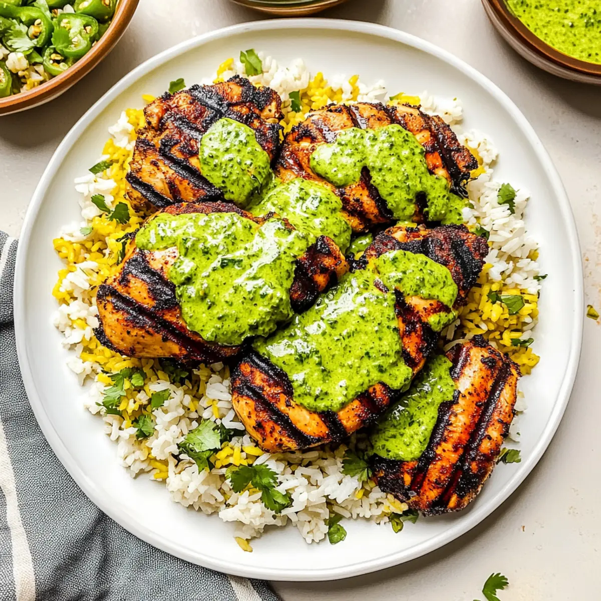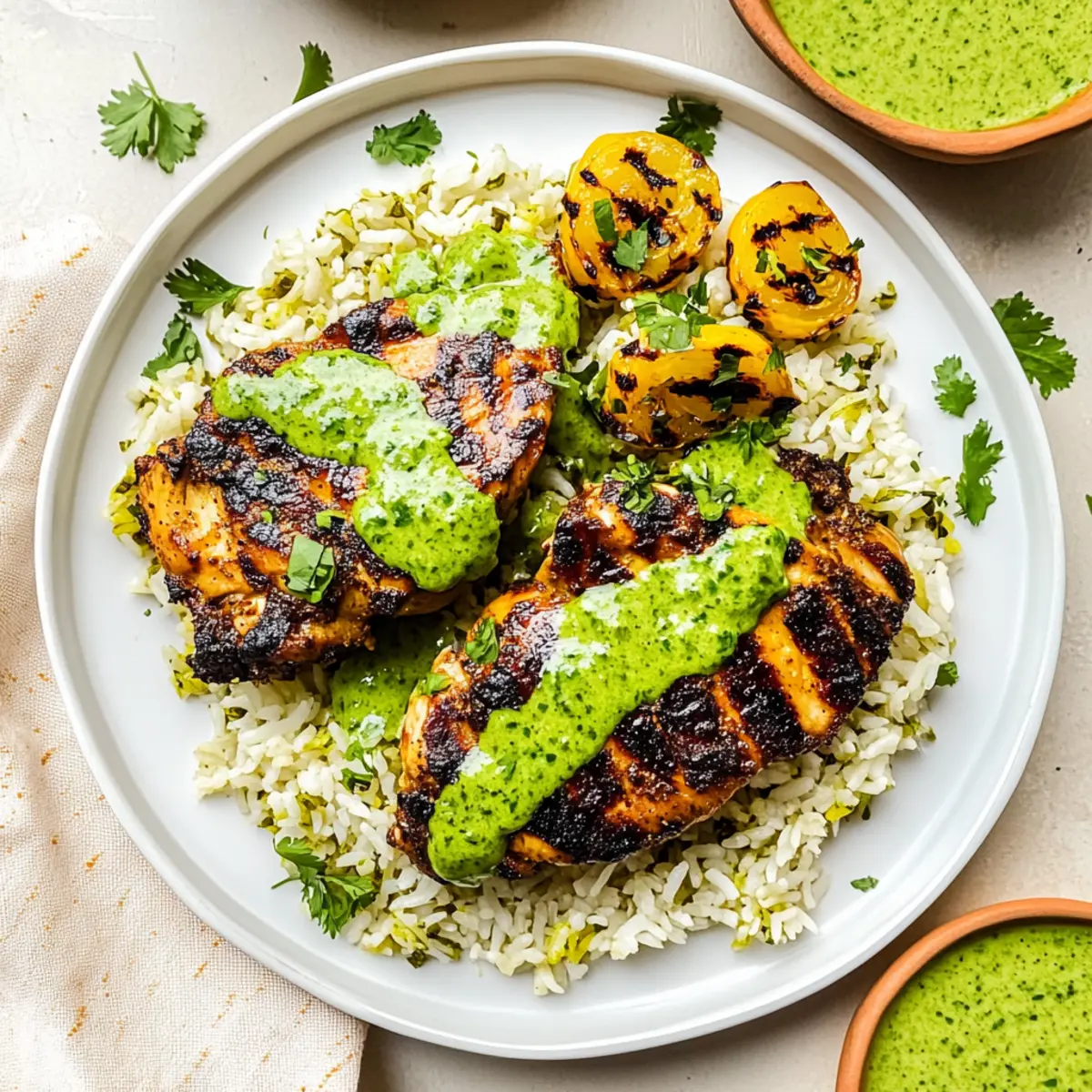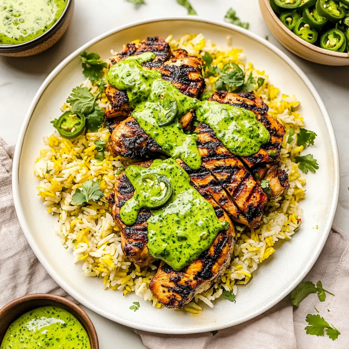 Jump to Recipe Print RecipeAs I stood in my kitchen, the comforting aroma of marinated chicken mingling with spices brought me back to a bustling market in Peru, filled with vibrant colors and mouthwatering scents. This Peruvian Chicken & Rice with Green Sauce is a delightful escape from fast food, transforming your weeknight meals into a flavorful adventure. With juicy, perfectly seasoned chicken paired with fragrant jasmine rice and a creamy green sauce, it’s not just a meal; it’s a celebration! The beauty of this recipe lies in its simplicity—it’s a one-pan wonder that promises to impress both family and friends with minimal effort. Plus, it’s easily customizable, so you can use your favorite cuts of chicken, making it a versatile dish that suits any taste. Ready to bring a splash of Peru to your table? Let’s dive into the cooking magic! Why Is This Recipe So Special? Simplicity: This one-pan meal allows you to create restaurant-quality flavors with minimal effort, perfect for busy weeknights. Flavor Explosion: The marinated chicken, infused with spices like cumin and smoky paprika, pairs beautifully with the aromatic jasmine rice, creating a delightful contrast. Versatile: Whether you prefer chicken thighs, breasts, or even fish, this recipe effortlessly adapts to your taste, making it a go-to for any day! Crowd-Pleaser: Serve it at family gatherings or dinner parties, and watch your guests rave over the rich, creamy green sauce that’s as vibrant as it is delicious. Make-Ahead Friendly: With components that store well, you can prep it in advance and enjoy stress-free meals throughout the week. For more effortless chicken recipes, check out my Garlic Parmesan Chicken or Tandoori Chicken Tikka for delicious variety! Peruvian Chicken & Rice Ingredients For the Chicken Marinade • Chicken (1.5-2 pounds) – The main protein source providing heartiness; you can use any preferred cut, including thighs or breasts. • Garlic (2-3 cloves, minced) – Enhances flavor depth; fresh garlic is key for optimal taste. • Lime Juice or White Vinegar (2 tablespoons) – Adds acidity for a balanced marinade; substitute with lemon juice if preferred. • Oil of Choice (2 tablespoons) – Acts as a marinade base, enhancing flavor; olive oil works wonderfully. • Ground Cumin (1 tablespoon) – Delivers essential earthy and warm notes for authentic flavor. • Smoked Paprika (1 teaspoon) – Infuses a subtle smokiness; feel free to use regular paprika if needed. • Kosher Salt (1 teaspoon) – Aids in flavor extraction for perfectly seasoned chicken. • Black Pepper (1/2 teaspoon, freshly ground) – Elevates the overall taste profile. For the Green Sauce • Fresh Cilantro Leaves (1 cup) – A crucial component for the green sauce, providing freshness; substitute with parsley for a different flavor. • Mayonnaise (1/2 cup) – Creamy base for the sauce; Greek yogurt is a great lighter alternative. • Sour Cream (1/4 cup) – Adds tanginess; it can be skipped or replaced with a dairy-free option. • Jalapeño Chiles (2 whole, roughly chopped) – Introduces heat; remove seeds for a milder flavor. For the Rice • Jasmine Rice (1 cup) – The fluffy, fragrant base of this meal that absorbs all the flavors beautifully. • Butter/Oil (1 tablespoon) – For sautéing aromatics; opt for non-dairy butter for a plant-based version. • Onion (1/4 cup, diced) – Aromatic base, enhancing the rice’s flavor profile. • Garlic (4-5 cloves total) – Additional flavor when added to the rice preparation. • Turmeric (1 teaspoon) – Adds color and unique flavor; you can omit if not desired. • Onion Powder, Salt, Pepper (1/4 teaspoon each) – These seasonings enhance the rice flavor. • Chicken Stock (2 cups) – Provides moisture and flavor to cook the rice perfectly. • Frozen Peas (1 cup) – An optional addition for nutrients and lovely color in the dish. Now that you have all the ingredients lined up, let’s journey towards creating this exceptional Peruvian Chicken & Rice with Green Sauce that’s sure to become a family favorite! Step‑by‑Step Instructions for Peruvian Chicken & Rice with Green Sauce Step 1: Marinate Chicken In a bowl, combine minced garlic, lime juice or white vinegar, oil, ground cumin, smoked paprika, kosher salt, and black pepper to create a flavorful marinade. Add the chicken pieces, ensuring they are thoroughly coated. Cover and refrigerate for at least 1 hour, or up to overnight for maximum flavor infusion. Step 2: Prepare Rice Begin by rinsing and soaking the jasmine rice in water for about 30 minutes. In a large pan, melt butter over medium heat, sauté diced onion and minced garlic until fragrant and soft, about 3-4 minutes. Stir in the soaked rice, turmeric, onion powder, salt, and pepper for 1 minute before adding chicken stock; bring to a boil. Step 3: Cook Rice Once boiling, reduce the heat to low, cover the pan, and let the rice simmer for 15 minutes. After this time, remove the pan from heat and let it rest covered for an additional 5-10 minutes. Gently stir in the frozen peas if using, allowing them to warm through and add color to your Peruvian Chicken & Rice dish. Step 4: Cook Chicken Preheat your grill to medium-high heat or your oven to 450°F. Place the marinated chicken on the grill, cooking for 5-7 minutes on each side until the internal temperature reaches 165°F. If baking, arrange the chicken on a baking sheet and brush with reserved marinade, cooking for about 30 minutes. Step 5: Make Green Sauce While the chicken is cooking, prepare the creamy green sauce by blending fresh cilantro, mayonnaise, sour cream, and chopped jalapeños in a food processor until smooth. Taste and adjust seasoning as desired. This vibrant sauce will add a refreshing touch to your Peruvian Chicken & Rice. Step 6: Serve To serve, plate the fluffy jasmine rice and top it with pieces of the juicy chicken. Generously drizzle the creamy green sauce over the top,
