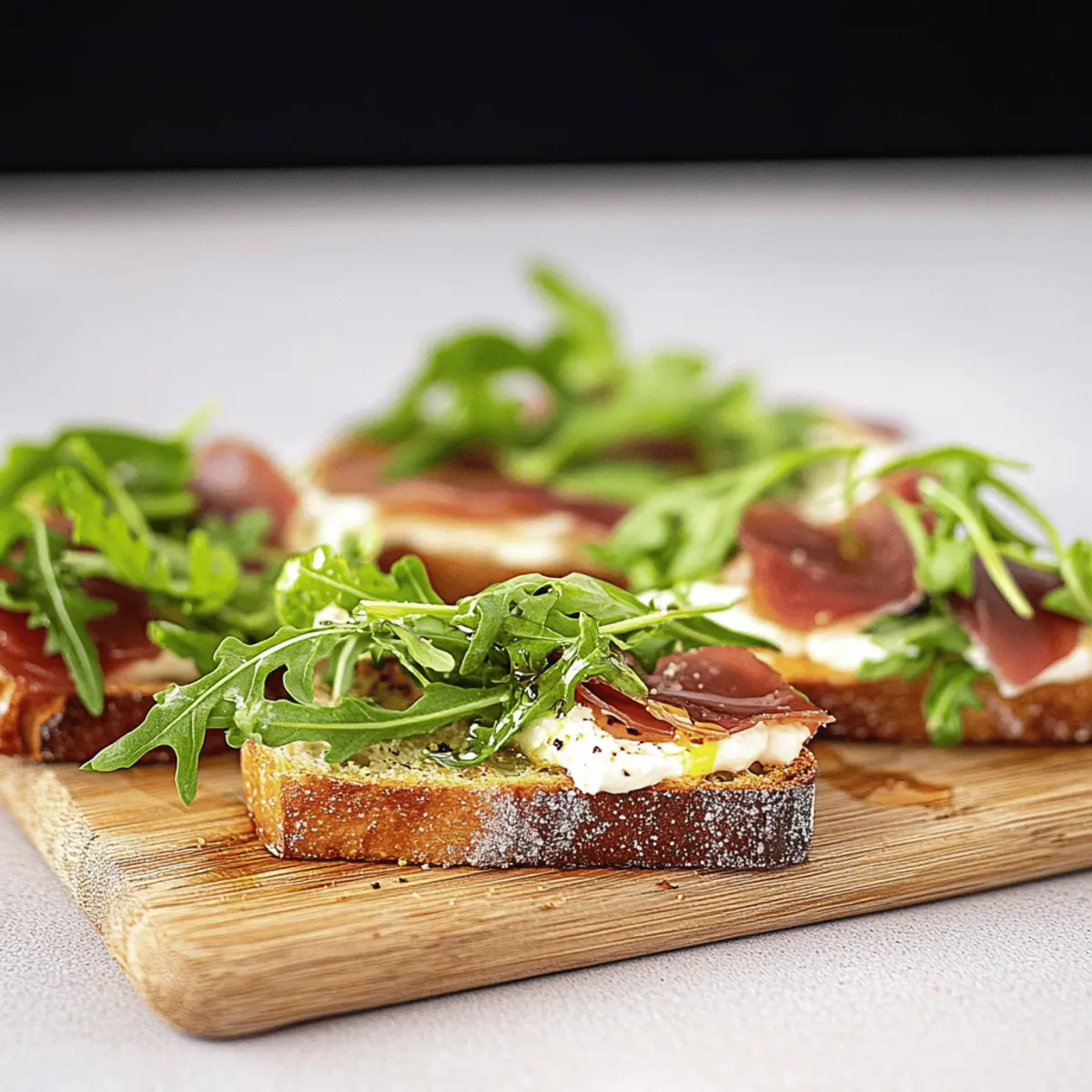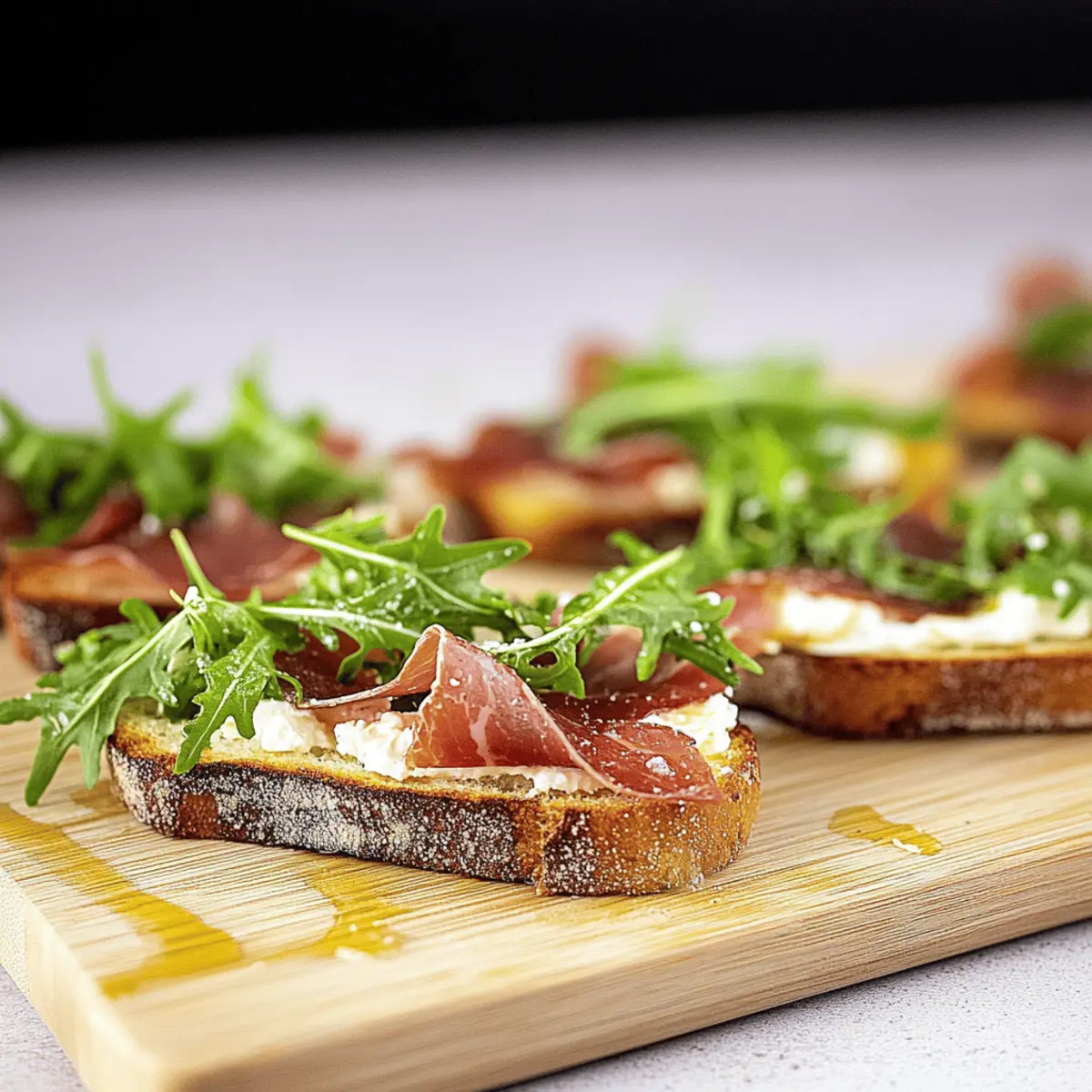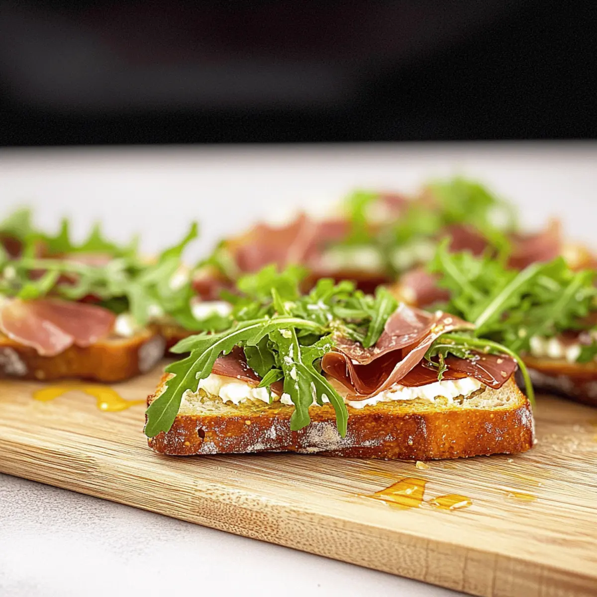 Jump to Recipe Print RecipeThe aroma of freshly toasted bread mingled with savory prosciutto and honey wafted through my kitchen, instantly transporting me to a cozy Italian trattoria. Today, I’m thrilled to share my spin on a classic: Prosciutto Arugula Bruschetta with Honey Mascarpone. With just five simple ingredients, this easy appetizer is not only a feast for the senses but also a crowd-pleaser. It’s the perfect solution for those last-minute gatherings or cozy nights when the culinary muse strikes. In under 15 minutes, you can whip up this delightful dish and impress your friends and family without breaking a sweat. Aren’t you curious about how a drizzle of honey can elevate your bruschetta experience? Grab your apron; let’s dive into this delicious creation! Why is bruschetta a crowd-pleaser? Simplicity is key! With just five ingredients, anyone can master this recipe in no time. Rich, Flavorful Layers: The combination of creamy mascarpone, salty prosciutto, and peppery arugula creates an irresistible medley. Versatile Options: Feel free to play around with cheese or bread choices, just like in my Prosciutto Wrapped Mozzarella recipe. Quick to Assemble: Pull it together in under 15 minutes—perfect for unexpected guests! Aesthetically Pleasing: The colorful presentation makes it the star of any table. Plus, it’s a delightful way to introduce your loved ones to Italian cuisine! Prosciutto Arugula Bruschetta Ingredients • For the Bread Baguette – The sturdy base that brings a delightful crunch; be sure to slice it thick to avoid sogginess. For the Spread Mascarpone Cheese – This adds a creamy texture and mild flavor; if you’re looking for a twist, try ricotta or cream cheese instead. For the Toppings Prosciutto – Offers a savory, salty kick that complements the other ingredients beautifully; can be swapped with coppa for variety. Arugula – The peppery green that adds a fresh bite; drizzle a little balsamic vinegar for an extra flavor boost! Honey – Sweetness that ties everything together; maple syrup serves as a delicious substitute if needed. Enjoy creating your own version of prosciutto arugula bruschetta! Step‑by‑Step Instructions for Prosciutto Arugula Bruschetta Step 1: Preheat the Oven Begin by preheating your oven to 425°F (220°C) if you plan on toasting additional toppings like tomatoes. As the oven warms up, gather your ingredients. This will set the perfect stage for your crispy baguette base, ensuring that the prosciutto arugula bruschetta will have that delightful crunch. Step 2: Slice and Toast the Baguette Carefully slice the baguette into thick pieces, about 1 inch wide, to provide sturdy support for your toppings. Arrange the slices on a baking sheet and toast them in the preheated oven for about 5-7 minutes or until they’re golden brown. You can also use a skillet on medium heat for about 2-3 minutes per side for a beautiful, crusty finish. Step 3: Spread the Mascarpone Once your baguette slices are toasted, allow them to cool slightly before generously spreading mascarpone cheese on top of each slice. Use a buttery knife to create an even layer that covers the surface well. This creamy foundation is essential for the prosciutto arugula bruschetta, providing both richness and a delightful contrast to the crispy bread. Step 4: Layer with Prosciutto Now, tear strips of prosciutto into smaller, bite-sized pieces and layer them artfully on top of the mascarpone. This savory element adds a delicious saltiness that perfectly complements the creamy cheese. Aim for at least one piece per slice of bruschetta to ensure each bite is packed with flavor. Step 5: Add Fresh Arugula Next, gently take a handful of arugula and sprinkle it over the prosciutto on each slice. For an extra burst of flavor, consider tossing the arugula with a splash of balsamic vinegar beforehand. This peppery green will not only enhance the taste but also add a vibrant color to your prosciutto arugula bruschetta. Step 6: Drizzle with Honey Finally, just before serving, drizzle a touch of honey over each bruschetta to elevate the sweet and savory profile. The golden syrup will enhance the flavors beautifully, creating a perfect harmony between the ingredients. Serve immediately to maintain the crispness of the bread and the freshness of the toppings. Expert Tips for Prosciutto Arugula Bruschetta Fresh Ingredients: Use the freshest prosciutto and arugula possible—it significantly enhances the flavor of your bruschetta. Right Bread: Opt for a crusty baguette cut thick to avoid sogginess. Thin slices can collapse under the toppings. Assemble Last Minute: To retain the crunch, assemble your prosciutto arugula bruschetta just before serving. Flavor Boost: Consider tossing arugula with a bit of balsamic vinegar before topping for an extra zing. Variations Galore: Don’t hesitate to experiment with different cheese like goat cheese or toppings like roasted tomatoes—every combination is a winner! Make Ahead Options These Prosciutto Arugula Bruschetta with Honey Mascarpone are a breeze to prepare in advance, making them a perfect choice for busy weeknights or entertaining. You can slice and toast the baguette up to 24 hours ahead of time—just store the slices in an airtight container to maintain their crunch. The mascarpone cheese can be pre-spread on the toasted bread up to 3 hours prior to serving; simply cover it lightly with plastic wrap to prevent drying. For the toppings, tear the prosciutto and wash the arugula up to 2 days ahead, storing them separately in the fridge. Just before serving, assemble the bruschetta and drizzle with honey for that fresh, delightful taste! Prosciutto Arugula Bruschetta Variations Feel free to explore these delightful adaptations and make this dish your own! Cheese Swap: Replace mascarpone with creamy goat cheese or ricotta for varied flavors and textures. Bready Delight: Try using ciabatta or sourdough instead of a baguette for an exciti