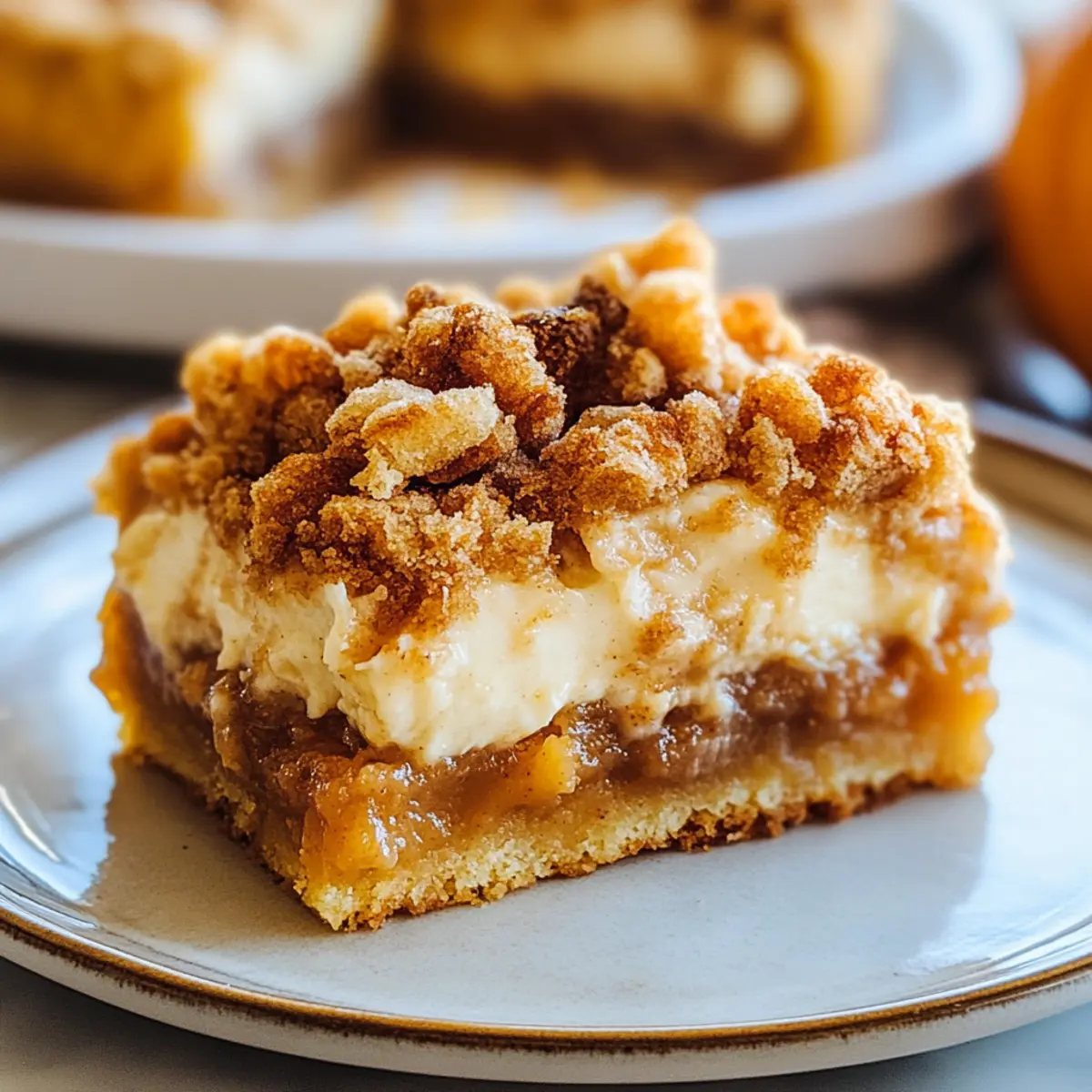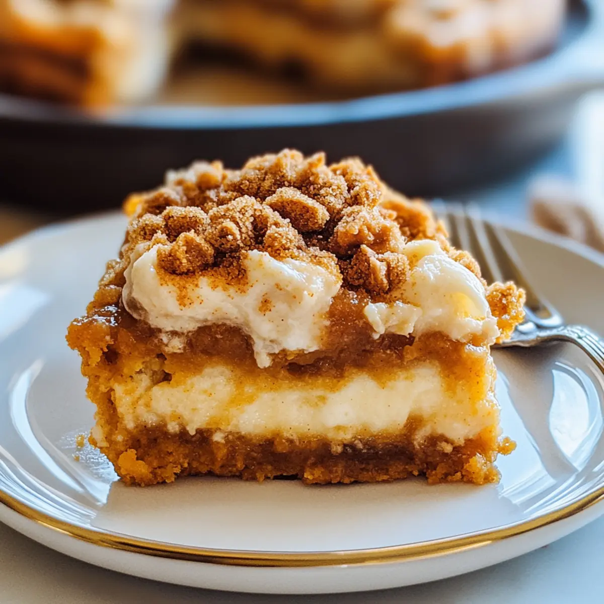 Jump to Recipe Print RecipeAs I sat on my porch, the crisp fall air wrapped around me, I suddenly craved something sweet to match the season. That’s when it hit me—nothing captures autumn quite like a warm slice of Pumpkin Dump Cake. This delightful dessert embodies the cozy, spiced essence of fall, making it a perfect addition to every gathering or quiet evening at home. With a mere handful of ingredients and quick prep time, you’ll have a stunning dessert that pairs creamy pumpkin goodness with a crunchy topping. Plus, I’ve included gluten-free options to ensure everyone can indulge in this comforting treat. Are you ready to fill your kitchen with the warm aroma of spiced pumpkin? Let’s dive in! Why is Pumpkin Dump Cake a Must-Try? Simplicity: This easy recipe requires minimal ingredients and prep time, making it perfect for busy cooks. Rich Flavor: With a delightful combination of pumpkin, cinnamon, and nutmeg, each bite is a warm embrace of fall. Versatile Options: You can easily switch up the pumpkin with sweet potato or butternut squash, and even opt for gluten-free cake mix to accommodate everyone around your table. Texture You’ll Love: Enjoy the unique mix of creamy pumpkin goodness paired with a crunchy topping for a satisfying dessert experience. Perfect for Any Occasion: Whether you’re hosting Thanksgiving or enjoying a cozy evening at home, this Pumpkin Dump Cake is sure to impress your guests and create lasting memories, just like my favorite Zucchini Coffee Cake or Honey Cheesecake Salted. Pumpkin Dump Cake Ingredients For the Pumpkin Mixture Canned Pumpkin – Provides the main flavor and creamy texture; substitute with sweet potato or butternut squash for variation. Eggs – Acts as a binding agent; ensure they are at room temperature for even mixing. Sugar – Sweetens the pumpkin base; consider reducing it or using a sugar alternative if desired. Cinnamon – Adds warmth and classic fall flavor; adjust according to your taste preference. Nutmeg – Provides aromatic notes that enhance pumpkin flavor; freshly grated nutmeg intensifies the taste. Vanilla Extract – Adds depth to the flavor; use pure vanilla for the best aroma and taste. For the Topping Yellow Cake Mix – Forms the crunchy topping and base layer; a gluten-free cake mix can serve for a gluten-free treat. Chopped Pecans/Walnuts – Adds delightful crunch and texture; omit or substitute with chocolate chips for nut-free options. Melted Butter – Moistens and enriches the final dish; keep it warm for easier drizzling over the cake mix. Step‑by‑Step Instructions for Pumpkin Dump Cake Step 1: Preheat the Oven Begin by preheating your oven to 350°F (175°C). While it warms up, take a moment to grease a 9×13-inch baking dish with cooking spray or butter. This will ensure your Pumpkin Dump Cake doesn’t stick and can be easily served later. Step 2: Prepare the Pumpkin Mixture In a large mixing bowl, combine the canned pumpkin, eggs, sugar, cinnamon, nutmeg, and vanilla extract. Use a whisk or electric mixer to blend these ingredients until smooth and creamy, about 2-3 minutes. This aromatic mixture is the heart of your Pumpkin Dump Cake, so be sure to incorporate everything well. Step 3: Layer the Pumpkin Mixture Carefully pour the prepared pumpkin mixture into the greased baking dish, spreading it evenly across the bottom. Tap the dish gently on the counter to eliminate any air bubbles and help the mixture settle. This creamy base will create a rich layer for your delightful cake. Step 4: Add the Cake Mix Next, sprinkle the yellow cake mix evenly over the pumpkin layer. Important: resist the urge to stir! The dry cake mix will create a beautiful top layer that forms a crunchy crust as it bakes, enhancing the overall texture of your Pumpkin Dump Cake. Step 5: Top with Nuts and Butter Now it’s time to add some crunch! Scatter the chopped pecans or walnuts over the cake mix, ensuring an even distribution. Then, drizzle the melted butter generously on top. This will melt into the cake and enrich the flavors, resulting in a delightful combination of textures. Step 6: Bake the Cake Place your baking dish in the preheated oven and bake for 45 to 50 minutes. Keep an eye out for a golden-brown color and bubbling edges, which will indicate that your Pumpkin Dump Cake is ready. A toothpick inserted in the center should come out clean or with just a few moist crumbs. Step 7: Cool and Serve Once baked, remove the Pumpkin Dump Cake from the oven and let it cool for about 10-15 minutes. This cooling period makes slicing easier and allows the flavors to settle. Serve warm, topped with whipped cream or a scoop of vanilla ice cream for an extra touch of indulgence! Storage Tips for Pumpkin Dump Cake Room Temperature: If you plan to enjoy your Pumpkin Dump Cake within a day, you can leave it at room temperature for up to 1 day, covered to keep it fresh. Fridge: Store leftovers in an airtight container in the fridge for up to 4 days. This helps maintain the cake’s moist texture while keeping it deliciously spiced. Freezer: To freeze, wrap individual slices tightly in plastic wrap and then place them in a freezer-safe container. It can be frozen for up to 3 months, perfect for a sweet treat anytime! Reheating: Reheat in the microwave for about 20-30 seconds or in the oven at 350°F (175°C) for 10-15 minutes, until warmed through to enjoy a taste of this delightful Pumpkin Dump Cake. Pumpkin Dump Cake Variations & Substitutions Explore the delightful twists you can put on your Pumpkin Dump Cake to make it your own. Let your creativity flow and enjoy every bite! Gluten-Free: Use a gluten-free yellow cake mix instead of the regular one to accommodate those with gluten sensitivities. Sweet Potato Swap: Substitute canned pumpkin with sweet potato or butternut squash for a unique twist on flavors, bringing an earthy sweetness to each slice. Nutty Alternative: Replace pecans or walnuts with almond slices for a di