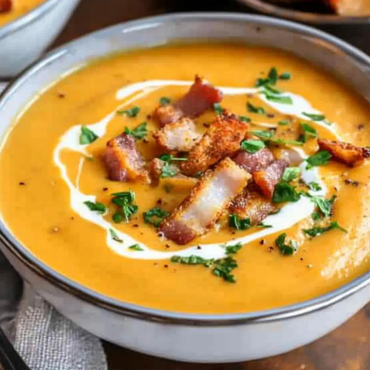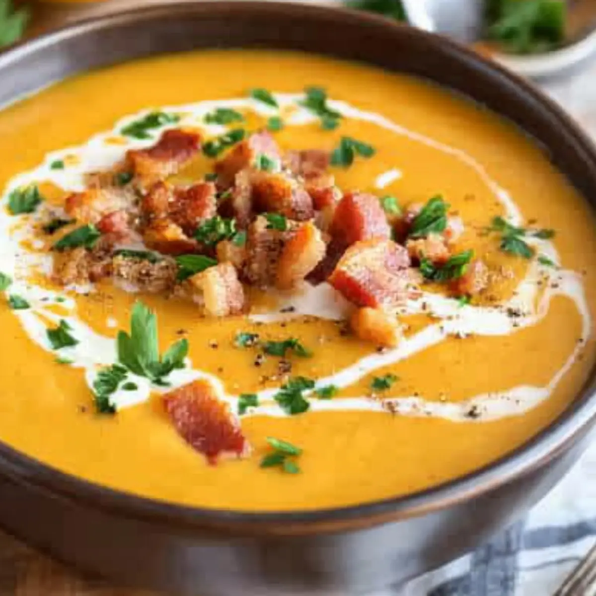 Finally, stir in chopped fresh parsley for a burst of brightness, and dish out the creamy pumpkin soup into bowls. Garnish each serving with a drizzle of cream, crispy croutons, and crumbled bacon for an enticing finish that elevates the flavors and textures.
