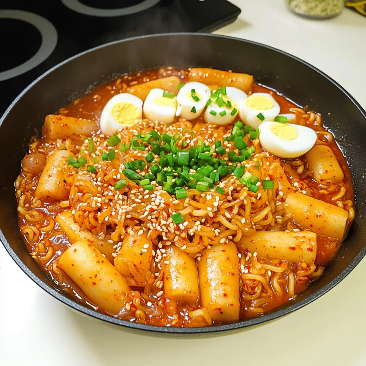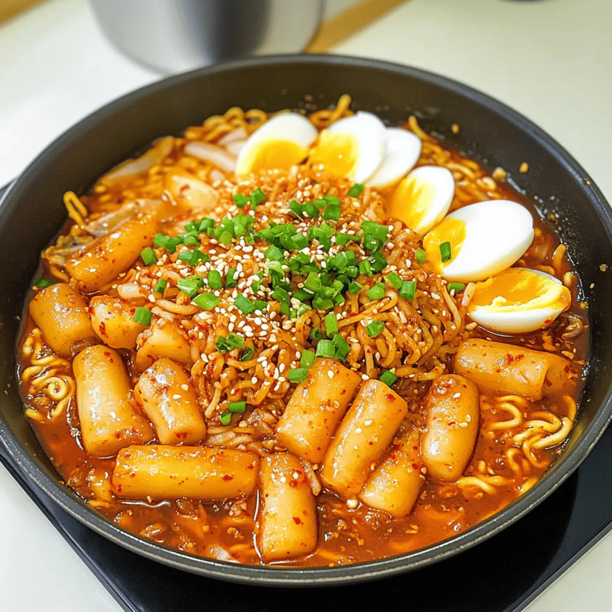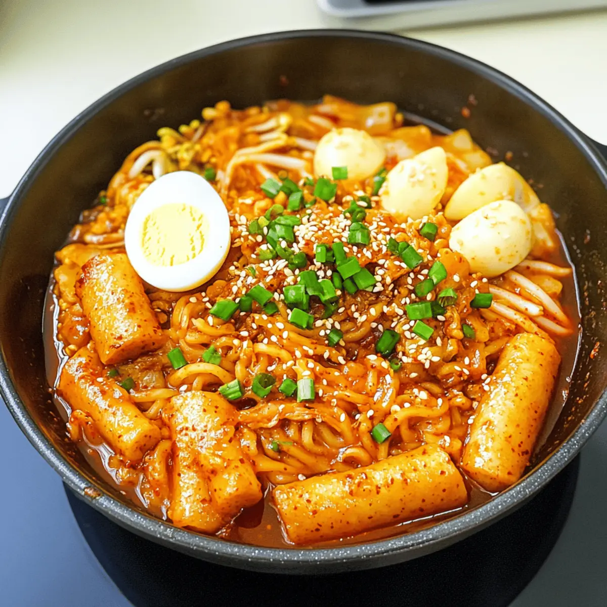 Jump to Recipe Print RecipeAs the aromas of simmering spices waft through the kitchen, I can’t help but feel drawn to the comforting warmth of a bowl of Rabokki. This delightful fusion of spicy ramen and chewy tteokbokki offers a quick and easy escape from the hustle of everyday life. With its rich, flavorful sauce and the variety of textures ranging from tender fish cakes to hearty hard-boiled eggs, this dish is perfect for a cozy lunch or a satisfying late-night snack. Plus, it’s a hands-on recipe that invites creativity—feel free to throw in any veggies you have on hand! Ready to dive into the world of Korean comfort food? Let’s get started on making your very own Rabokki! Why is Rabokki a Must-Try? Comforting, bold flavors: This Rabokki dish packs a punch with its rich blend of spices and hearty ingredients that warm your soul. Quick and easy: Perfect for busy weeknights, it takes minimal time to prepare without sacrificing taste. Versatile ingredients: Feel free to mix in leftover veggies or proteins, making it a great fridge-cleaning dish! Satisfying textures: The chewy rice cakes paired with tender ramen and soft fish cakes create a delightful experience with every bite. Crowd-pleaser: Whether family or friends, everyone will love this delicious comfort food that’s sure to impress! For more delicious comfort food ideas, check out quick dinner recipes. Rabokki Ingredients Delve into the essentials for creating delicious Rabokki! For the Sauce Soy Sauce – Adds umami flavor and saltiness; substitute with tamari for a gluten-free option. Sugar – Balances spice with sweetness; use honey or maple syrup for a natural touch. Gochugaru (Korean Chili Powder) – Delivers heat and depth; swap with red pepper flakes for a milder flavor. Gochujang (Korean Chili Paste) – Brings spiciness and richness; can be replaced with Sriracha, adjusting to your taste. Minced Garlic – Enriches flavor with a pungent kick; fresh garlic is ideal, but jarred can work in a pinch. For the Broth Anchovy Stock Tablets – Provides a savory base for the broth; substitute with vegetable or chicken broth if needed. For the Main Dish Cabbage – Offers nutrients and crunch; bok choy or spinach can be delicious alternatives. Green Onion – Adds freshness and a pop of color; chives are a suitable substitute. Rice Cakes (Tteokbokki) – The star ingredient known for its chewy texture; in a pinch, use extra ramen noodles. Fish Cakes – Contributes protein and unique flavor; replace with tofu for a vegetarian version. Hard Boiled Eggs – Adds richness and protein; omit for a vegan version or swap with creamy avocado. Ramen Noodles – Serves as the carbohydrate foundation; any instant noodles will work—just adjust cooking times as necessary. Step‑by‑Step Instructions for Rabokki Step 1: Prepare the Sauce In a mixing bowl, whisk together soy sauce, sugar, gochugaru, gochujang, and minced garlic until smooth and well combined. This vibrant sauce will be the flavorful base of your Rabokki. Set it aside as you move on to prepping the broth, ensuring you have everything ready to create that comforting fusion dish. Step 2: Make the Broth In a medium-sized pot, bring 3½ cups of water to a boil over medium-high heat. Add the two anchovy stock tablets, stirring until fully dissolved. As the broth comes to a gentle boil, you’ll notice a rich aroma filling your kitchen—this is the foundation for a delicious Rabokki. Step 3: Combine Sauce and Broth Once the broth is boiling, pour in the prepared sauce mixture, stirring to combine thoroughly. You should see the sauce blend seamlessly into the broth, creating a rich and spicy liquid. Allow this delightful mixture to simmer for about 2-3 minutes, enabling the flavors to meld together beautifully. Step 4: Add Vegetables and Rice Cakes Stir in the chopped cabbage and green onion to the simmering broth, letting them cook for about 2 minutes, until they become slightly tender. Next, add the rice cakes to the pot, stirring gently to ensure they are well coated in the sauce. Allow everything to simmer for 8-10 minutes, watching for the sauce to thicken and the rice cakes to become soft and chewy. Step 5: Incorporate Fish Cakes and Eggs Make space in the center of the pot and carefully add your fish cakes and halved hard-boiled eggs, allowing them to warm through in the simmering sauce. This step will take approximately 2-3 minutes, and you’ll see the fish cakes soften and infuse the Rabokki with their unique flavors. Step 6: Cook the Ramen Noodles Place a packet of ramen noodles in the center of the pot, ensuring they’re submerged in the sauce for even cooking. Cover the pot with a lid and simmer for 3-4 minutes, allowing the noodles to soften while absorbing the vibrant flavors of your Rabokki. You’ll know they’re ready when they reach your desired texture. Step 7: Finish and Serve Once the noodles are cooked, remove the pot from heat. Give your Rabokki a gentle stir to mix in all the ingredients, ensuring a delicious balance of textures in every bite. Garnish with freshly chopped green onions and a sprinkle of white sesame seeds for extra flair. Serve hot and get ready to enjoy a hearty bowl of comfort! What to Serve with Quick and Easy Rabokki? Pairing your Rabokki with complementary dishes enhances the dining experience, turning a simple meal into a delightful feast. Kimchi: This spicy Korean side dish adds a tangy crunch, perfectly balancing the rich flavors of the Rabokki. Crispy Tempura: Light and airy, tempura vegetables or shrimp provide a satisfying contrast, introducing a delightful crispiness. Korean Fried Chicken: Juicy and flavorful, this crispy dish brings a savory element that pairs wonderfully with the spiciness of the Rabokki. Steamed Dumplings: Soft and pillowy, dumplings complement the chewy textures of the rice cakes and noodles, creating a harmonious dish. Pickled Vegetables: Crunchy and tangy pickles provide a refreshing counterpoin