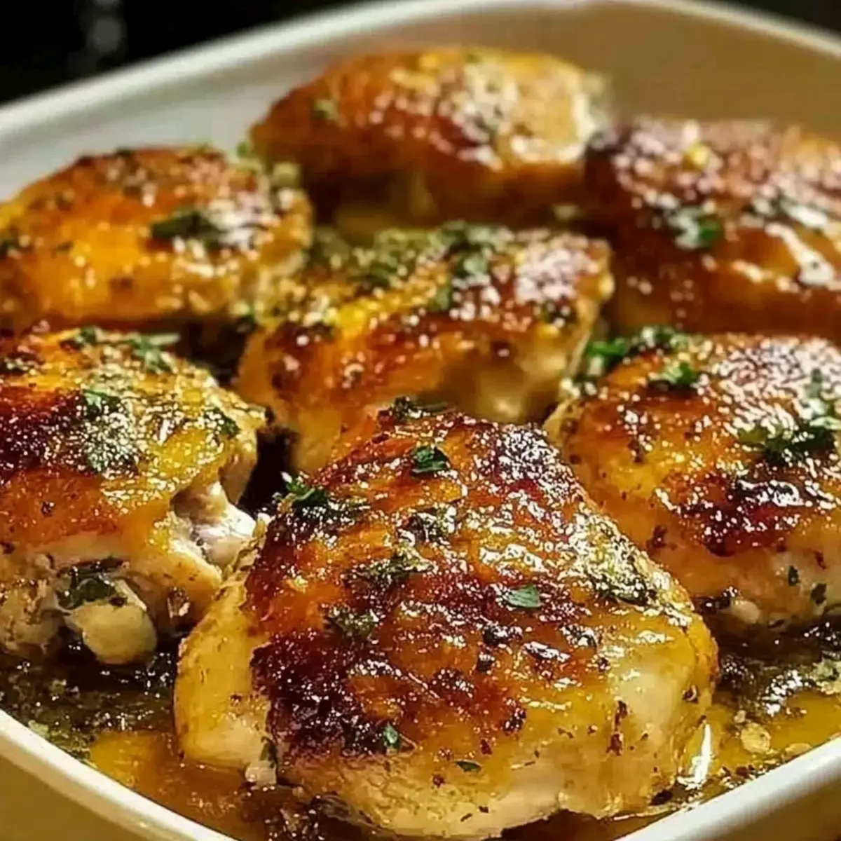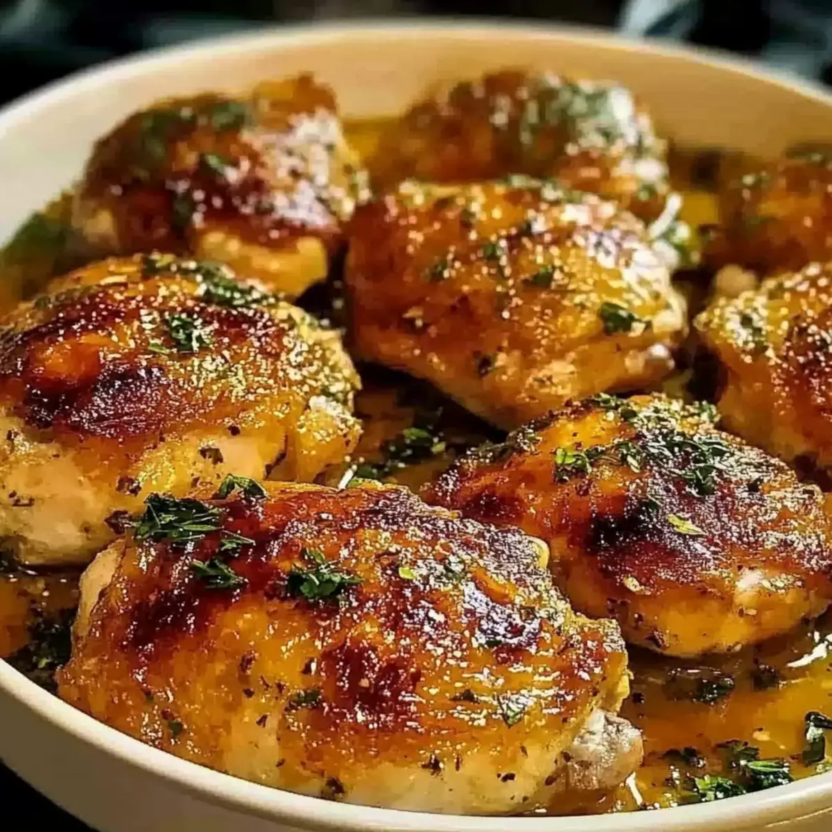 Jump to Recipe Print Recipe“Did you hear that joyful crackle?” I whispered to myself as I pulled a tray of Ranch Chicken Thighs from the oven, their skin perfectly golden and inviting. In just about an hour, this simple dish transforms into an unforgettable weeknight dinner that your whole family will adore. The magic lies in the creamy ranch seasoning, transforming juicy, bone-in thighs into crispy, savory bites that are bound to steal the spotlight at your dinner table. Not only is this recipe easy to whip up after a long day, but it also promises to leave little ones asking for seconds. Why settle for another takeout option when you can enjoy restaurant-quality flavors right at home? Ready to savor a meal that’s both delicious and effortless? Let’s dive into this delightful journey of flavors! Why choose Ranch Chicken Thighs? Crispy, golden skin: This recipe ensures every bite features that perfect crunch, making it irresistibly satisfying for chicken lovers. Family-approved flavor: The ranch seasoning brings a tangy twist that kids and adults alike will adore—ideal for picky eaters! Quick and easy: With minimal prep and just one hour in the oven, you can have a weeknight dinner that’s as effortless as it is delicious. Versatile serving options: Pair it with sides like Garlic Parmesan Potatoes or vibrant green beans for a wholesome meal. Meal prep friendly: Leftovers make unbeatable lunch options, keeping the flavor intact when reheated. Why go for fast food when you can indulge in such a scrumptious homemade feast? Ranch Chicken Thighs Ingredients For the Chicken Bone-in, skin-on chicken thighs – Juicy meat and crispy skin are key to achieving that satisfying texture. Olive oil – Adds moisture while helping to create a beautifully crispy exterior; feel free to substitute with avocado oil for a different flavor. For the Seasoning Ranch seasoning mix – The main flavor! Opt for store-bought or homemade for maximum convenience. Garlic powder – Elevates the dish’s overall flavor; fresh garlic can provide a more robust taste if you prefer. Onion powder – Adds depth to the seasoning; for a fresh twist, you can use finely chopped onions instead. Smoked paprika – Infuses a lovely smokiness; if you don’t have it on hand, regular paprika works just as well. Dried thyme – A hint of earthiness; Italian seasoning can be a lovely substitute if you enjoy those flavors. Black pepper & salt – Season to taste, adjusting according to your personal preference for a well-balanced dish. For the Finish Fresh parsley (for garnish) – A pop of color and freshness to your finished dish; optional, but highly recommended for presentation! Enjoy crafting these delectably crispy Ranch Chicken Thighs that are not only easy to make but bursting with flavor, turning your weeknight dinners into something special! Step‑by‑Step Instructions for Ranch Chicken Thighs Step 1: Preheat Your Oven Begin by preheating your oven to 400°F (200°C). This temperature is ideal for achieving that coveted crispy skin on your Ranch Chicken Thighs. A properly heated oven ensures even cooking and enhances the flavor of the spices. While the oven warms up, gather your ingredients and prep your workspace. Step 2: Prepare the Chicken Pat the bone-in, skin-on chicken thighs dry using a paper towel. This step is crucial as removing excess moisture will help the skin crisp up beautifully during baking. Once dried, arrange the chicken on a clean cutting board, making it easier to coat them evenly with olive oil in the next step. Step 3: Coat the Chicken Drizzle olive oil over each chicken thigh, ensuring every piece is thoroughly coated, including under the skin. This not only adds essential moisture but also enhances the crispiness. Take your time to make sure the oil is evenly distributed for a perfect crust on your Ranch Chicken Thighs. Step 4: Mix the Seasoning In a small bowl, combine the ranch seasoning mix, garlic powder, onion powder, smoked paprika, dried thyme, black pepper, and a pinch of salt. Stir them together until fully blended. This flavorful mix will elevate your chicken, giving it that irresistible ranch taste. Step 5: Season the Chicken Generously massage the seasoning mixture into the chicken thighs, ensuring that every piece is coated for even flavor. Pay particular attention to the crevices under the skin, where the seasoning can infuse the meat. Your Ranch Chicken Thighs will burst with flavor after this step! Step 6: Arrange on Baking Sheet Line a baking sheet with parchment paper for easy cleanup, then place the seasoned chicken thighs on it. Make sure to leave ample space between each piece to allow for air circulation, which is key for achieving crispy skin. This setup will help the chicken bake evenly and thoroughly. Step 7: Bake in the Oven Slide the baking sheet into your preheated oven and bake for 35–40 minutes. You’ll know your Ranch Chicken Thighs are cooked through when the internal temperature reaches 165°F (74°C) and the skin turns crispy and golden brown. A delicious aroma will fill your kitchen, indicating they’re getting close! Step 8: Rest the Chicken Once baked, remove the chicken thighs from the oven and let them rest for about 5 minutes. This resting period allows the juices to redistribute within the meat, keeping your chicken tender and moist. Avoid cutting into the chicken immediately; good things come to those who wait! Step 9: Garnish and Serve Finally, garnish your crispy Ranch Chicken Thighs with freshly chopped parsley for a pop of color and freshness. Serve these delightful thighs hot, alongside your favorite sides like Garlic Parmesan Potatoes or vibrant green beans for a balanced and memorable meal that your family will love! Ranch Chicken Thighs Variations & Substitutions Customize your Ranch Chicken Thighs for a personal twist that excites your palate and suits your family’s preferences! Boneless Thighs: Use boneless chicken thighs to cut c