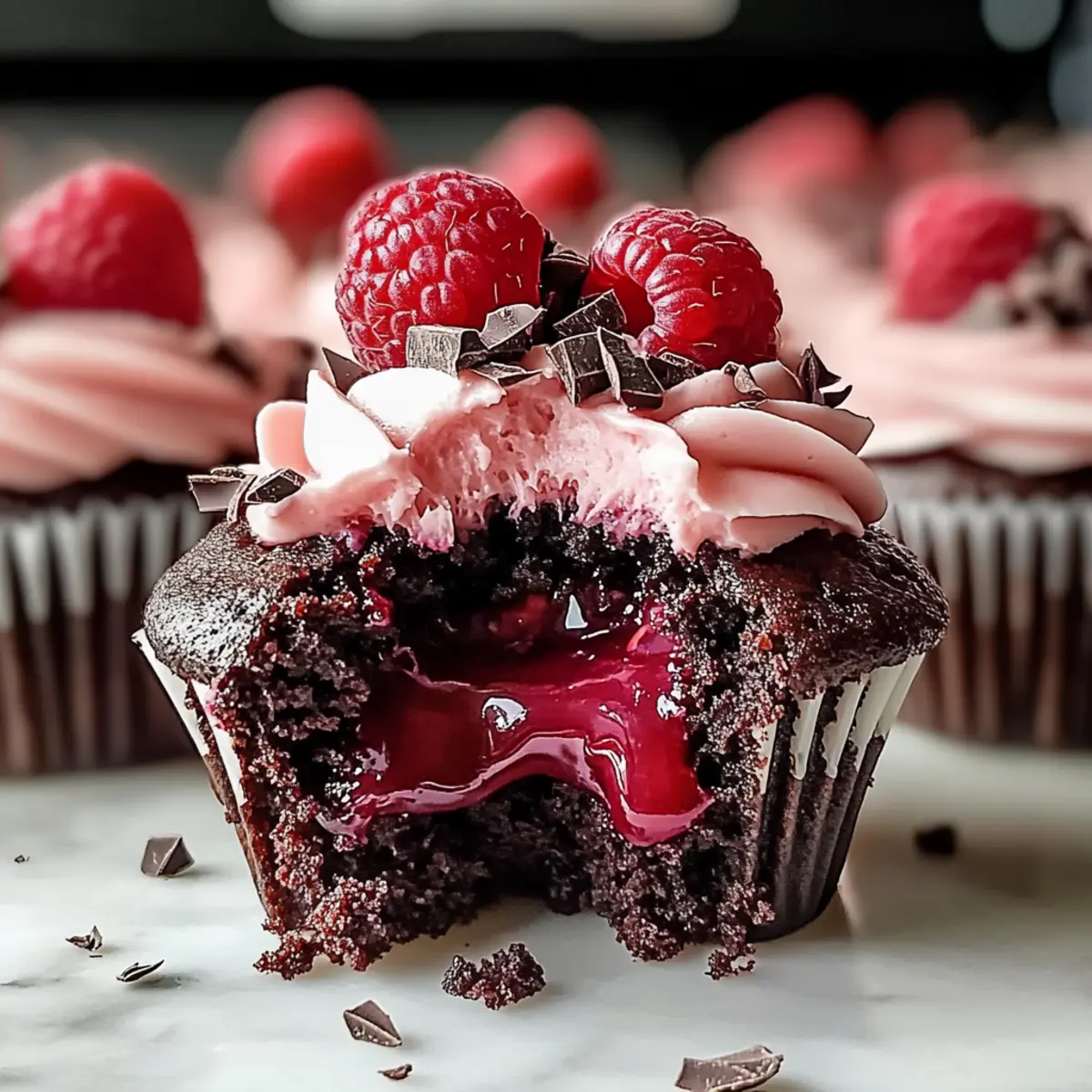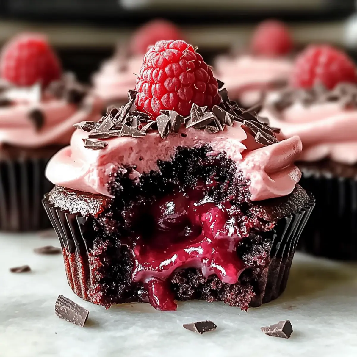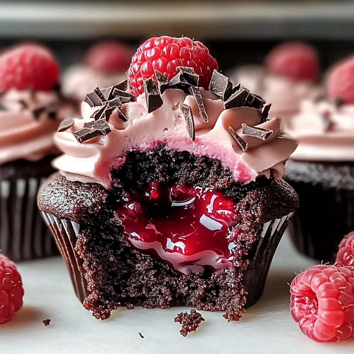 Jump to Recipe Print RecipeAs the aroma of chocolate fills my kitchen, I can’t help but feel transported to a cozy café where every bite is a little piece of heaven. Today, I’m thrilled to share my recipe for Raspberry Chocolate Lava Cupcakes, a divine dessert that marries the rich, moist decadence of chocolate cake with a surprising burst of tangy raspberry goodness. What’s truly amazing is how straightforward these indulgent treats are to make—perfect for impressing guests or enjoying a sweet escape after a long day. Plus, they’re a delightful twist on classic chocolate desserts, combining a luscious molten center with a velvety frosting that will leave you craving more. Are you ready to let the chocolate melt your heart and the raspberries brighten your day? Why Are These Cupcakes Irresistible? Decadent, the combination of rich chocolate and vibrant raspberry creates a dessert bursting with flavor. Molten Center, each bite delivers a delightful surprise as the warm, gooey filling flows out. Simple to Make, with minimal ingredients and straightforward steps, these cupcakes are perfect for bakers of any skill level. Versatile Treat, whether for birthdays or casual get-togethers, they make an impressive centerpiece—try pairing them with a scoop of vanilla bean ice cream for an unforgettable dessert experience! Eye-Catching Garnish, fresh raspberries and dark chocolate shavings elevate their visual appeal, making them a feast for the eyes as well. Raspberry Chocolate Lava Cupcake Ingredients • Here’s what you need to create these delightful treats! For the Cupcakes All-purpose flour – Essential for structure; feel free to use a gluten-free blend if needed. Unsweetened cocoa powder – A must for rich chocolate flavor; choose high-quality brands for the best results. Baking soda – Helps the cupcakes rise properly; avoid substituting it with baking powder to retain the correct texture. Salt – Balances sweetness and enhances flavor; don’t skip this essential ingredient. Butter (softened) – Adds moisture and richness; substitute with margarine for a dairy-free version if desired. Granulated sugar – Provides sweetness; using light brown sugar can add depth to the flavor. Eggs – Bring structure and richness; for an egg-free option, mix 1 tbsp ground flaxseed with 2.5 tbsp water to create flax eggs. Vanilla extract – Infuses aroma and deeper flavor; almond extract can be a tasty alternative. Buttermilk – Adds moisture and a tangy taste; feel free to substitute with plain yogurt or milk mixed with a splash of vinegar. Boiling water – Ensures hydration and batter smoothness; absolutely don’t skip this vital step as it activates cocoa. For the Molten Center Raspberry preserves – Acts as the luscious filling; you can use thawed and drained frozen raspberries if preserves aren’t available. For the Frosting Powdered sugar – Sweetens the frosting beautifully; granulated sugar won’t blend smoothly, so stick with powdered. Raspberry puree – Provides a fruity flavor in the frosting; fresh or canned raspberries can be pureed for this purpose. For Garnish Fresh raspberries and dark chocolate shavings – Add brilliance and texture contrast, making your cupcakes even more tempting. Now that you have your Raspberry Chocolate Lava Cupcake Ingredients, get ready to indulge in a dessert that’s both sumptuous and simple to prepare! Step‑by‑Step Instructions for Raspberry Chocolate Lava Cupcakes Step 1: Preheat Your Oven Begin by preheating your oven to 350°F (175°C). While the oven warms, prepare a muffin tin by placing cupcake liners in each cup. This will ensure your Raspberry Chocolate Lava Cupcakes are easy to remove once baked and stay beautifully intact. Step 2: Mix Dry Ingredients In a medium bowl, whisk together the all-purpose flour, unsweetened cocoa powder, baking soda, and salt. This blend is crucial as it helps create the structure and rich chocolate flavor for your cupcakes. Ensure there are no lumps in the dry ingredients as you combine them for a smooth batter. Step 3: Cream Butter and Sugar In a large mixing bowl, beat the softened butter and granulated sugar together until the mixture is light and fluffy, about 3-5 minutes. This step incorporates air, giving your Raspberry Chocolate Lava Cupcakes a delightful texture. Next, add the eggs one at a time, mixing well after each addition, followed by the vanilla extract for depth of flavor. Step 4: Combine Mixtures Gradually add the dry ingredient mixture into the creamed butter and sugar. Alternate this with the buttermilk, making sure to start and end with the dry ingredients. Mix until just combined, then pour in the boiling water, which helps smooth out the batter. It’s okay if the batter appears slightly thin; this is perfect for the molten center! Step 5: Fill Cupcake Liners Spoon the batter into the lined muffin tin, filling each cup halfway. Now, add a small dollop of raspberry preserves in the center of each cup; this will create the lava-like filling once baked. Top with more batter until they are about three-quarters full to ensure they rise beautifully without spilling over. Step 6: Bake the Cupcakes Slide the muffin tin into your preheated oven and bake for 18-22 minutes. You’ll know they’re ready when the edges appear set but the centers still look slightly soft and gooey. Keep an eye on them toward the end of baking to prevent overcooking, as you want that molten center for the ultimate Raspberry Chocolate Lava Cupcakes. Step 7: Cool the Cupcakes Once baked, carefully remove the cupcakes from the oven and allow them to cool in the tin for about 5 minutes. Then transfer the cupcakes to a wire rack to cool completely. This step is crucial; cooling allows the centers to stay beautifully molten while providing a firm exterior for frosting. Step 8: Prepare the Frosting In a mixing bowl, beat the softened butter until smooth, then gradually add in the powdered sugar. Combine unti