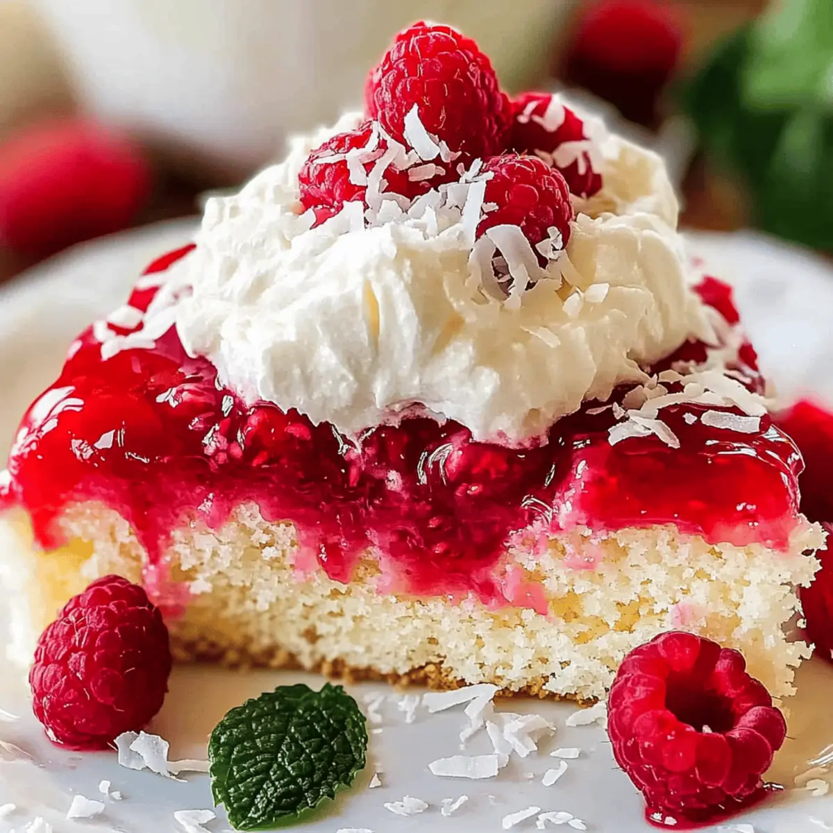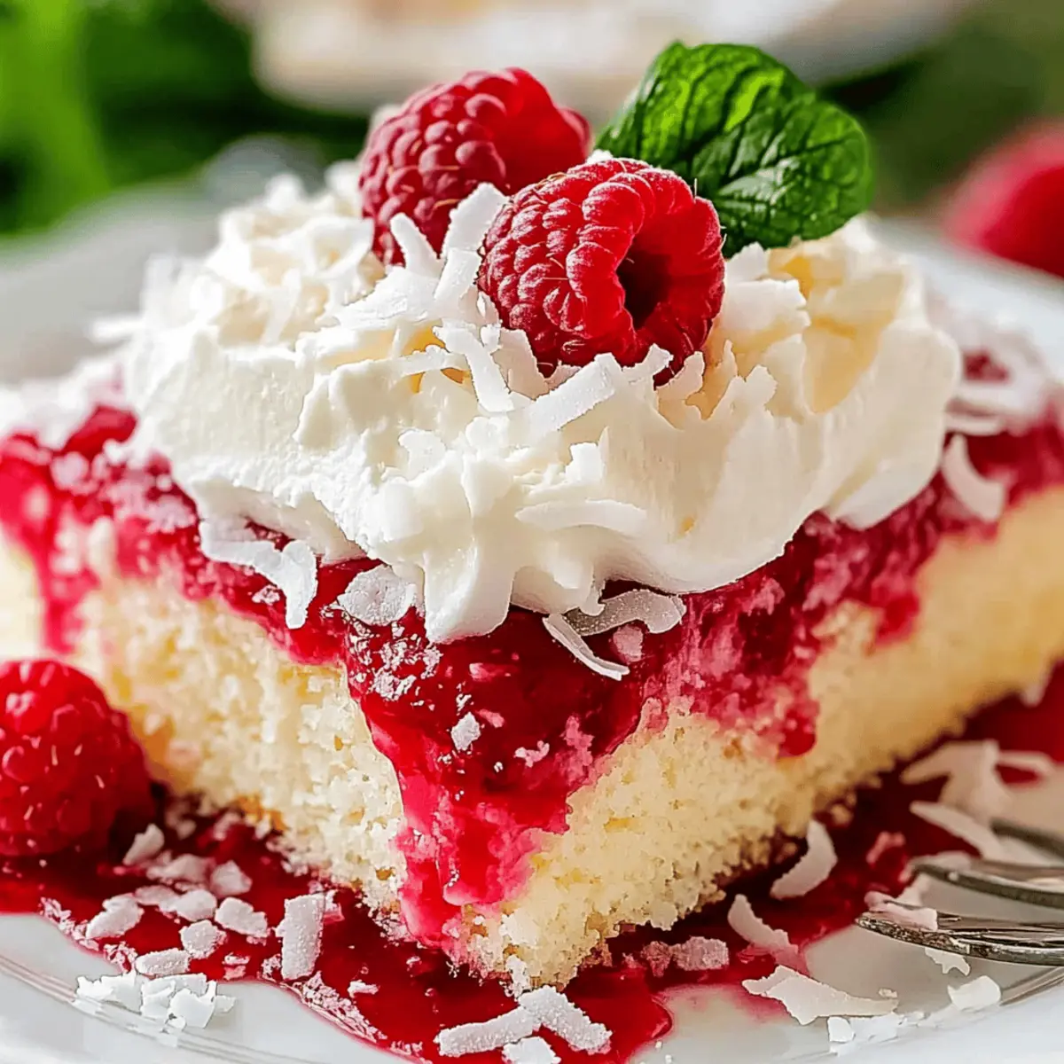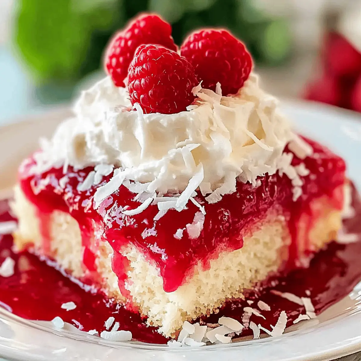 Jump to Recipe Print RecipeAs I sat around the table with friends, laughter mingled with the sweet aroma wafting from the kitchen, it struck me just how magical a simple dessert can be. Enter the Raspberry Zinger Poke Cake—a delightful creation that brings a burst of summer flavor to any gathering. This light and fluffy cake features a perfect blend of moist white cake, vibrant raspberry gelatin, and decadent whipped topping, making it not only a crowd-pleaser but also incredibly easy to whip up. Whether you’re celebrating a birthday, hosting a picnic, or simply trying to impress at a family dinner, this treat ensures everyone will come back for seconds. And with endless customization options, like swapping out coconut for chocolate shavings or adding your favorite nuts, you can make this dessert uniquely yours. Ready to dive into a slice of nostalgia? Let’s bring this Raspberry Zinger Poke Cake to life! Why is Raspberry Zinger Poke Cake Amazing? Effortless Delight: This recipe offers a quick and easy way to impress your guests. With minimal steps and common ingredients, you’ll spend less time in the kitchen and more time enjoying the laughter echoing around your table. Burst of Flavor: The combination of raspberry gelatin and preserves creates a heavenly fruitiness that dances on your tongue, making each bite a celebration of summer. Customizable Options: Feel free to play around with toppings! Whether you swap coconut for chopped nuts or try mini chocolate chips, the versatility of this poke cake makes it uniquely yours. Visual Appeal: Topped with light whipped cream and colorful raspberry layers, this cake not only tastes delicious but looks stunning on any dessert table. Perfect for Any Occasion: From casual family dinners to elegant holidays, this cake fits seamlessly into any event, ensuring you have a delightful dessert ready to wow your crowd. Raspberry Zinger Poke Cake Ingredients Here’s everything you’ll need to create this luscious dessert! For the Cake Premium White Cake Mix – The foundation of this cake, offering a light and fluffy texture; try experimenting with different cake flavors for a twist. Hot Purified Water – Activates the raspberry gelatin, ensuring the right consistency; it should be steaming hot, not boiling. For the Gelatin Raspberry-Flavored Gelatin – Infuses the cake with fruity goodness and moisture; feel free to switch to another berry flavor for personal flair. For the Topping High-Quality Raspberry Preserves – Creates that rich, fruity layer that complements the cake beautifully; use other fruit preserves like strawberry if you prefer. Whipped Topping (thawed) – Guarantees a creamy finish that lightens up the cake; making homemade whipped cream can add a fresh touch. Unsweetened Shredded Coconut – Adds a wonderful crunch and visual appeal; replace with chopped nuts or chocolate shavings for a delicious variation. Grab these ingredients and prepare to bring this delightful Raspberry Zinger Poke Cake to life! Step‑by‑Step Instructions for Raspberry Zinger Poke Cake Step 1: Prepare the Cake Begin by preheating your oven to 350°F (175°C). In a large mixing bowl, combine the premium white cake mix with the hot purified water according to the package instructions. Mix until smooth and uniform, then pour the batter into a greased 9×13-inch baking pan. Bake for about 30 minutes or until a toothpick inserted in the center comes out clean. Step 2: Cool the Cake Once baked, remove the Raspberry Zinger Poke Cake from the oven and place it on a wire rack. Allow the cake to cool at room temperature for approximately 30 minutes. This cooling period is essential as it prepares the cake for the next steps and prevents the gelatin from dissolving prematurely. Step 3: Make the Holes After the cake has cooled, use the end of a wooden spoon to poke holes about 1 inch apart all over the top of the cake. Ensure that the holes are deep enough to allow the raspberry gelatin to seep through, creating that signature moist texture that makes the Raspberry Zinger Poke Cake so delightful. Step 4: Prepare and Pour the Gelatin In a medium bowl, dissolve the raspberry-flavored gelatin in 2 cups of hot purified water, stirring until fully combined and no granules remain. Carefully pour the gelatin mixture evenly over the cake, making sure it seeps into all the holes to enhance the flavor and moisture. Let the cake absorb the gelatin for about 15 minutes. Step 5: Add Raspberry Preserves Warm the high-quality raspberry preserves in the microwave for about 30 seconds to loosen the texture, which makes spreading easier. Once warm, use a spatula to evenly spread the raspberry preserves over the top of the soaked cake, creating a luscious fruity layer that complements the gelatin. Step 6: Apply Whipped Topping Take the thawed whipped topping and carefully spread it evenly over the raspberry preserves, ensuring every inch of the cake is covered. The lightness of the whipped topping balances the richness of the raspberry layers, making this Raspberry Zinger Poke Cake even more delectable. Step 7: Sprinkle Coconut Next, evenly sprinkle the unsweetened shredded coconut over the whipped topping. This adds a delightful texture and visual appeal to your cake. If you’re looking for a variation, feel free to substitute with chopped nuts or chocolate shavings for a unique twist on the classic recipe. Step 8: Chill the Cake Finally, cover the cake with plastic wrap and refrigerate for at least 4 hours, allowing the flavors to meld beautifully. Chilling enhances the taste and ensures the cake sets properly, making each slice a refreshing treat when served. Enjoy your Raspberry Zinger Poke Cake! Raspberry Zinger Poke Cake Variations Feel free to savor your creativity and personalize this cake with these fun and tasty twists! Dairy-Free: Substitute whipped topping with a coconut or almond-based whipped cream for a delicious dairy-free alternative. Nutty Delight: Swap the coco