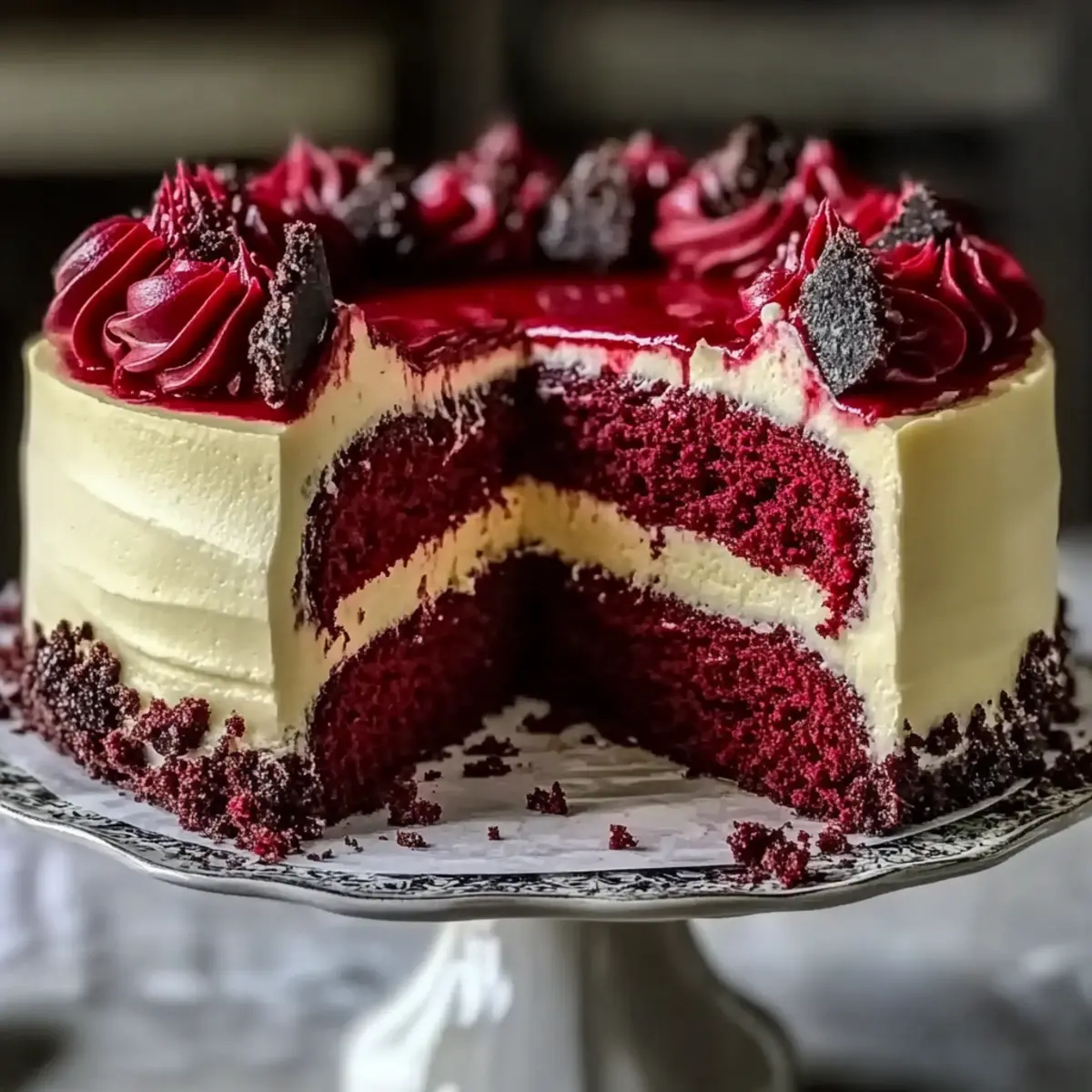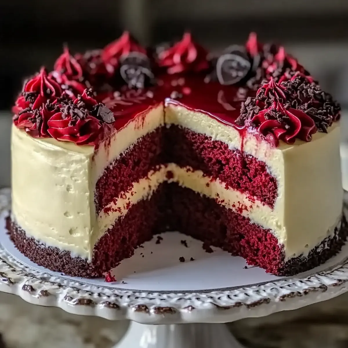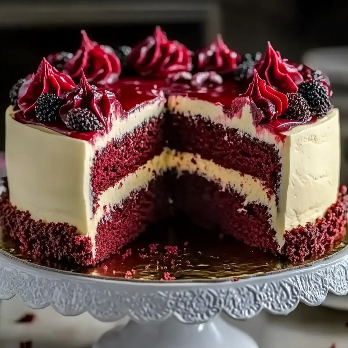 Jump to Recipe Print RecipeA subtle whisper of nostalgia wafts through the air as I pull my Red Velvet Cheesecake Layer Cake from the oven, a delightful treat that instantly transports me back to cherished gatherings and festive celebrations. Layer upon layer of moist red velvet interspersed with creamy cheesecake creates a stunning visual feast, all topped off with a luscious cream cheese frosting. The best part? This show-stopper not only takes center stage at any dessert table but also doesn’t demand hours in the kitchen—perfect for those craving homemade indulgence without the fuss. So, are you ready to impress your friends and family with a cake that’s as delicious as it is beautiful? Let’s dive into this heavenly creation! Why Is This Cheesecake a Must-Try? Irresistible Flavor: The marriage of rich red velvet and creamy cheesecake creates a delightful flavor profile that will have everyone coming back for seconds. Show-Stopping Presentation: With its vibrant colors and elegant layers, this cake makes a stunning centerpiece for any gathering, sure to impress your guests. Easy Preparation: Crafted with simple ingredients and straightforward steps, this recipe brings homemade goodness to your table without overwhelming complexity. Versatile Experience: Whether served at a birthday party or family dinner, this cake pairs beautifully with coffee or a refreshing mixed berry salad, catering to any occasion. Perfect for Any Skill Level: Even beginner bakers will find joy in creating this enchanting dessert, making it an ideal project for anyone looking to elevate their cake-baking game. For more delicious ideas, check out my Decadent Red Velvet or Honey Cheesecake Salted recipes! Red Velvet Cheesecake Ingredients • Here’s everything you need to create this delightful dessert! For the Crust Chocolate Cookie Crumbs – A base that adds depth and crunch; substitute with graham cracker crumbs for variety. Melted Butter – Binds cookie crumbs together; coconut oil is a great dairy-free alternative. For the Cake All-Purpose Flour – Provides structure; gluten-free flour works well too if it’s a blend with xanthan gum. Unsweetened Cocoa Powder – Elevates the chocolate flavor; no substitutions recommended for best results. Baking Soda & Baking Powder – Ensure freshness for optimal lift. Salt – Enhances sweetness; you can skip it if on a sodium-restricted diet. Granulated Sugar – Adds sweetness and moisture; sugar alternatives can be used if desired. Vegetable Oil – Helps keep the cake moist; melted coconut oil or applesauce work well for a lighter option. Eggs – Essential for structure; replace with flax eggs (1 tbsp flaxseed + 2.5 tbsp water per egg) for vegan. Buttermilk – Imparts moisture and tang; substitute with milk + 1 tbsp vinegar or a dairy-free version. White Vinegar – Reacts with baking soda for rising; use lemon juice as an alternative. Vanilla Extract – Enhances flavor; opt for pure extract for the best taste. Red Gel Food Coloring – Essential for that classic red velvet hue; avoid liquid versions as they dilute the batter. For the Cheesecake Layer Cream Cheese – Provides a rich element to the cheesecake; heavy cream can replicate this texture. Sour Cream – Adds creamy tang; Greek yogurt works as a good substitute. Powdered Sugar – Sweetens the frosting; in a pinch, blend granulated sugar until fine. For the Topping Berry Jam (Strawberry/Raspberry) – Glossy and flavorful topping; fresh fruit purée offers a lighter alternative. Prepare to create a stunning Red Velvet Cheesecake that’s sure to impress! Step‑by‑Step Instructions for Red Velvet Cheesecake Layer Cake Step 1: Prepare the Crust Begin by mixing chocolate cookie crumbs with melted butter until well combined. Press the mixture firmly into the bottom of a springform pan, creating an even layer. Preheat your oven to 350°F (175°C) and bake the crust for 10 minutes. Once baked, remove it from the oven and let it cool completely before adding the cheesecake layer. Step 2: Make Cake Batter While the crust cools, preheat your oven to 350°F (175°C). In a mixing bowl, whisk together all-purpose flour, unsweetened cocoa powder, baking soda, baking powder, and salt. In a separate bowl, blend granulated sugar, vegetable oil, eggs, buttermilk, white vinegar, vanilla extract, and red gel food coloring until smooth. Gradually fold the dry ingredients into the wet mixture until just combined. Divide the batter between two prepared cake pans and bake for 25-30 minutes, or until a toothpick comes out clean. Step 3: Prepare Cheesecake Layer In a mixing bowl, beat the cream cheese and powdered sugar together until smooth and creamy, ensuring there are no lumps. Add the eggs one at a time, mixing well after each addition. Then, mix in vanilla extract and sour cream until fully combined. Pour the cheesecake mixture over the cooled chocolate crust in the springform pan. Bake at 325°F (160°C) for 40-45 minutes, until the center slightly jiggles but is firm enough. Step 4: Assemble Cake Once the cakes and cheesecake layer have cooled, start assembling the Red Velvet Cheesecake Layer Cake. Place one red velvet cake layer on a serving platter, spread a generous layer of cream cheese frosting on top, and carefully position the baked cheesecake layer on top of the frosting. Follow with another layer of red velvet cake and frost the top and sides of the entire cake with the remaining cream cheese frosting for a beautiful finish. Step 5: Garnish and Serve To create a stunning presentation, drizzle berry jam over the frosted cake and garnish with fresh fruit if desired. Slice into generous servings and serve this decadent Red Velvet Cheesecake Layer Cake to family and friends. Every bite is sure to be a delightful experience, combining the rich flavors of chocolate and cream cheese in one unforgettable dessert. What to Serve with Decadent Red Velvet Cheesecake Layer Cake A beautifully layered dessert de