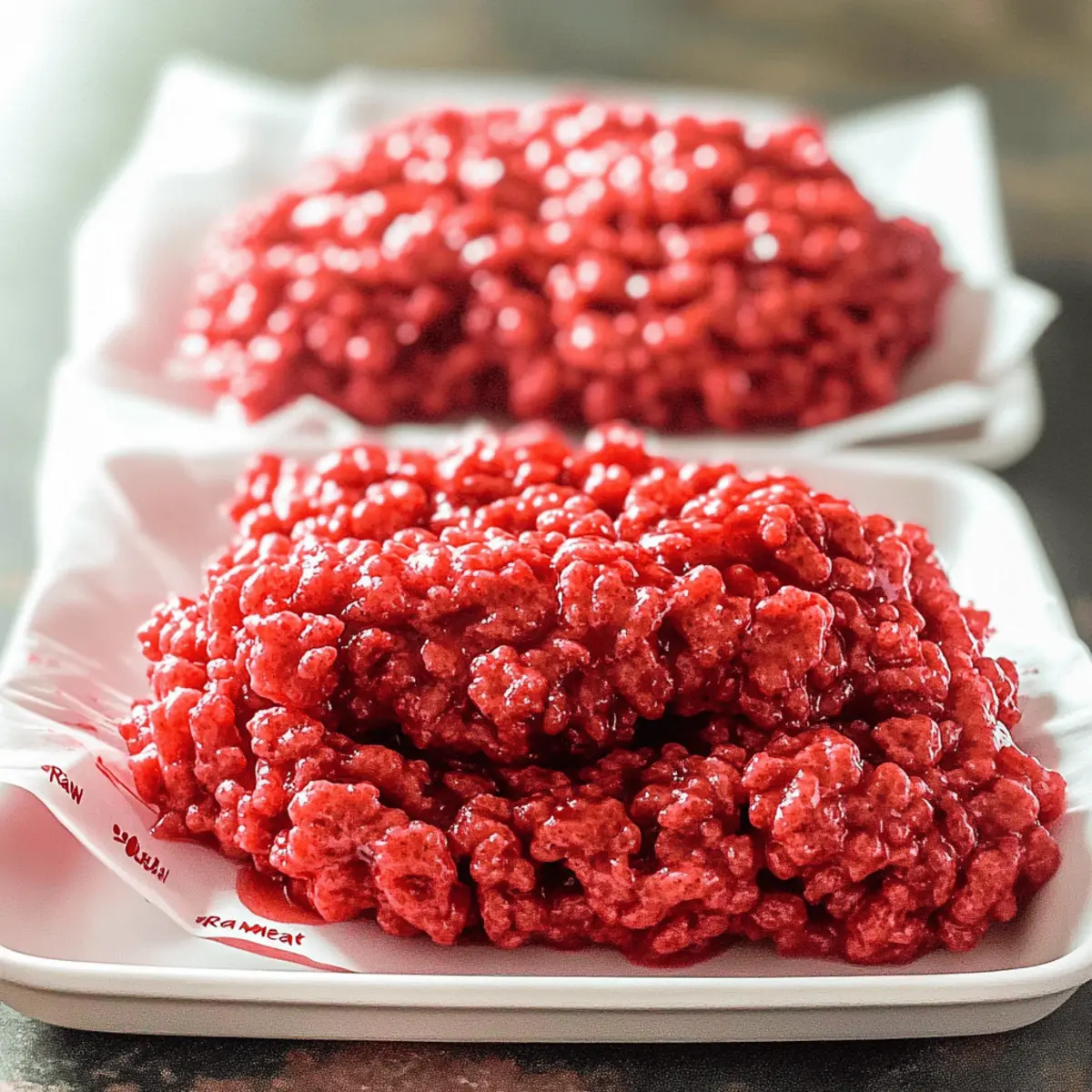 Jump to Recipe Print RecipeWhen the Halloween spirit creeps in, nothing excites my inner chef like a little culinary mischief! These Red Velvet “Raw Meat” Rice Krispies Treats are the perfect way to elevate your spooky soirées, blending nostalgia with a whimsical twist. Not only are they incredibly easy to whip up, taking just moments to prepare, but they also deliver a delightful combination of textures and flavors that will keep your guests buzzing with curiosity. Imagine the joy on their faces when they bite into these chewy treats that look like faux meat but taste like sweet, velvety goodness. Just picture them on your table, ready to steal the show at any Halloween gathering—who wouldn’t be intrigued? So, are you ready to conjure up some frightfully fun treats? Let’s dive into this recipe! Why Choose Red Velvet “Raw Meat” Treats? Whimsical Appeal: These spooky treats are sure to be the talk of your Halloween party, combining fun and deliciousness in every bite. Easy to Make: No advanced skills needed — just melt, mix, and mold for impressive results. Rich, Velvety Flavor: Infused with red velvet cake mix, they offer a delightful sweetness that surprises the senses. Perfectly Textured: Enjoy the chewy crunch of Rice Krispies paired with the soft richness of marshmallow. Versatile Inspiration: Feel free to swap flavors or even drizzle some chocolate on top, as you do with a classic Decadent Red Velvet. Party-Friendly: They’re crowd-pleasers, perfect for all ages — your guests will love the spooky presentation and sweet taste! Red Velvet “Raw Meat” Rice Krispies Ingredients Get ready to create some spooky fun with these irresistible ingredients! For the Base Mini Marshmallows – Adds sweetness and structure; large marshmallows can be used as a substitute if you don’t mind a longer melting time. Butter – Provides creamy fat content; margarine is a suitable alternative for dairy-free options. Vanilla Extract – Enhances the overall sweetness and flavor; optional adjustments can be made to suit your taste. Red Velvet Cake Mix – Imparts a unique red velvet flavor for that Halloween flair; chocolate cake mix works fine too if you’re feeling adventurous or if you want to omit the velvet. For the Crunch Crispy Rice Cereal – Offers the perfect structure and crunch; there are no recommended substitutes for that delightful crispiness. For the Color Red Food Coloring (optional) – Intensifies the red hue for spooky visual appeal; use sparingly to maintain a pleasant flavor balance. Unleash your inner chef and start crafting these delightful Red Velvet “Raw Meat” Rice Krispies Treats that are bound to impress! Step‑by‑Step Instructions for Red Velvet “Raw Meat” Rice Krispies Step 1: Melt Mixture In a large pot over medium-low heat, melt 4 tablespoons of butter along with 6 cups of mini marshmallows. Stir continuously until completely smooth and glossy, which should take about 5-7 minutes. Keep an eye on the mixture to avoid burning and ensure a perfect blend. Step 2: Mix in Flavors Once the marshmallow mixture is smooth, gently fold in 1 teaspoon of vanilla extract and 1 cup of red velvet cake mix. Stir until fully incorporated, achieving a rich red color. If you desire a deeper hue, add a couple of drops of red food coloring and mix until uniformly blended. Step 3: Combine Cereal Remove the pot from heat and immediately fold in 6 cups of crispy rice cereal. Use a spatula to gently coat the cereal with the marshmallow mixture, ensuring every piece is covered. This step is crucial for creating those delightful Red Velvet “Raw Meat” Rice Krispies Treats with a chewy texture and crispy crunch. Step 4: Shape the Treats Prepare foam trays or a plate lined with parchment paper. While the mixture is still warm, scoop out portions and shape them into lumps or “hamburger patties” to resemble raw meat. Aim for bite-sized pieces that are about 2 inches wide for a fun presentation. Let them cool and set slightly. Step 5: Finishing Touches Cover the shaped treats with plastic wrap to keep them fresh, and for an extra spooky effect, drizzle some strawberry syrup over the top just before serving. This adds a bloody aesthetic that enhances the Halloween vibe of your Red Velvet “Raw Meat” Rice Krispies Treats and will surely impress your guests. Storage Tips for Red Velvet “Raw Meat” Rice Krispies Room Temperature: Enjoy your treats within 2 days for optimal freshness. Keep them in an airtight container to prevent them from getting hard. Fridge: If you need to store them longer, refrigerate in a tightly wrapped container for up to 5 days. However, they may lose some of their original texture. Freezer: These Red Velvet “Raw Meat” Rice Krispies can be frozen for up to 6 weeks. Wrap each portion tightly in plastic wrap, then place in a freezer bag. Thawing: When ready to enjoy, simply thaw at room temperature—this will bring back their delightful chewy texture! What to Serve with Red Velvet “Raw Meat” Rice Krispies Treats When planning a spooky gathering, sweet treats deserve exciting companions that elevate the entire experience. Creepy Cocktails: Bright red cocktails topped with gummy worms or “blood” syrup create a chilling and delicious drink option that complements the treats. Classic Pumpkin Soup: The warm flavors of pumpkin soup provide a smooth, savory contrast to the sweet, chewy Rice Krispies, perfect for autumn gatherings. Witch’s Brew Punch: A fruity punch with floating eyeball-shaped fruit adds to the theme, refreshing guests while keeping the spooky vibe alive. Spooky Cheese Plate: Incorporate cheeses shaped like skulls or ghosts, offering savory bites that balance the sweetness of the dessert for an adventurous palate. Ghoulish Fruit Skewers: Fresh fruit skewers decorated with chocolate drips resemble bloodied pins, adding a healthier yet themed option to your spread. Haunted Cake Pops: Tiny cake pops decorated like litt