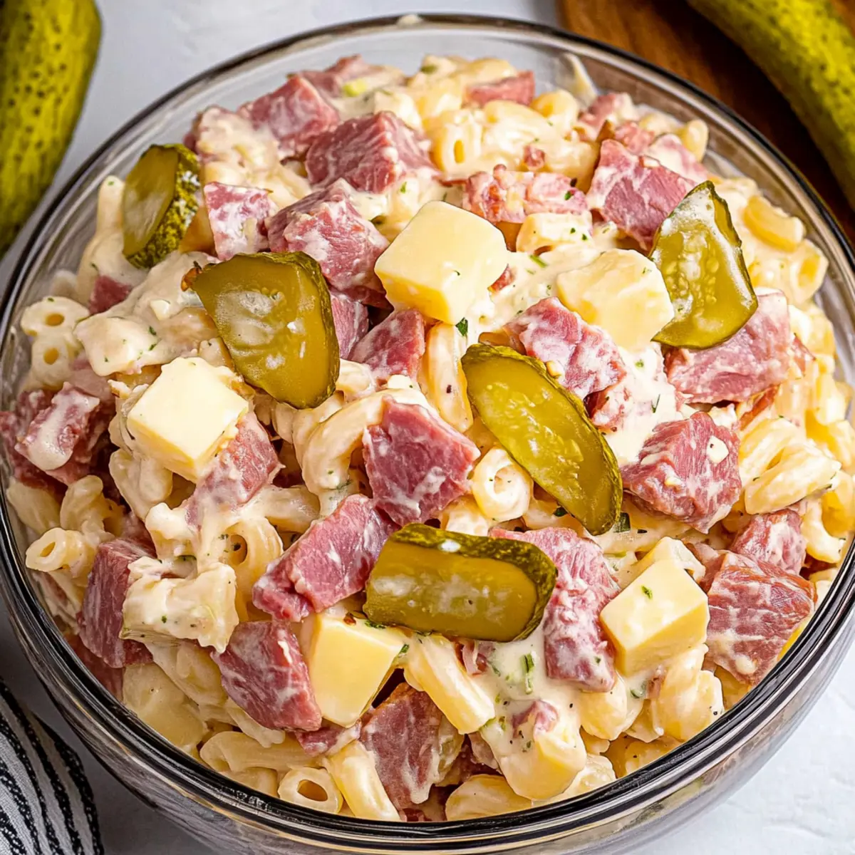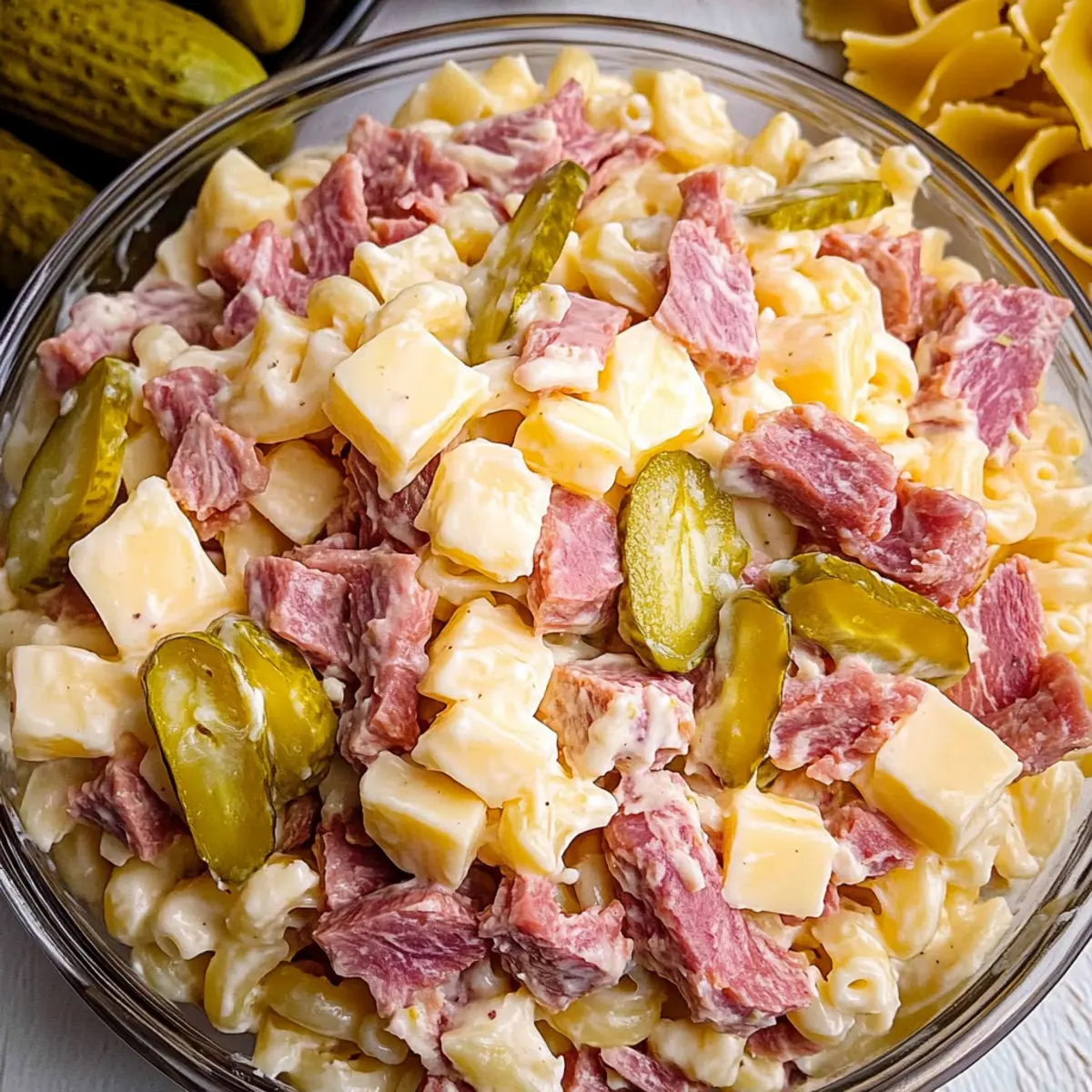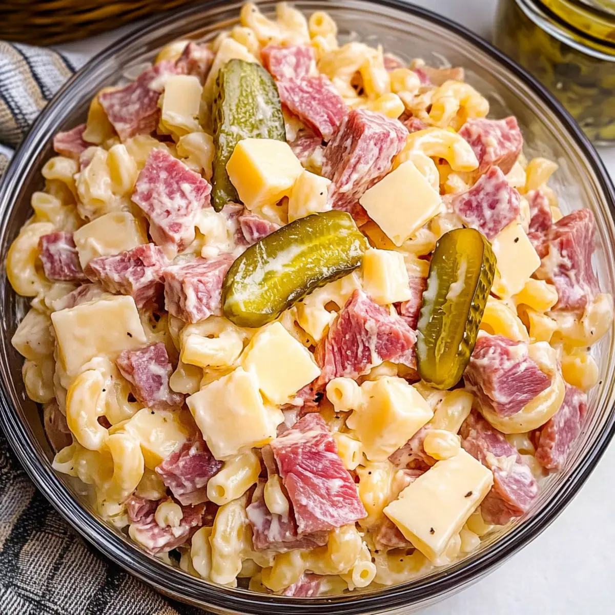 Jump to Recipe Print Recipe“Did you hear about the latest twist on a classic?” While eavesdropping at a local café, I caught a glimpse of a conversation that sparked my culinary curiosity. The dish they were raving about? A creamy Reuben Pasta Salad that combines the savory charm of a traditional Reuben sandwich with the satisfying heartiness of pasta. This recipe is not only a breeze to whip up—perfect for those busy weeknights—but it also shines at potlucks and gatherings, making it a crowd-pleaser. Each bite features tender macaroni mingling with corned beef, zesty sauerkraut, and rich Swiss cheese, all lovingly coated in a luscious dressing. Plus, the flavors develop beautifully as the salad chills, often tasting even better the next day. Ready to discover how this unique dish can transform your meal prep game? Let’s dive in! Why is This Reuben Pasta Salad Irresistible? Bold flavors and hearty ingredients make this pasta salad a stand-out choice for comfort food lovers! Each bite delivers a delightful blend of savory corned beef and tangy sauerkraut, perfectly complemented by creamy Swiss cheese. Perfect for potlucks, it’s an easy-to-make dish that will have friends and family coming back for seconds! Moreover, it’s an excellent option for meal prep; just whip it up ahead of time, and enjoy its deepening flavors over the next few days. If you’re looking for some more crowd-pleasing ideas, consider our Egg Pasta Salad or Smashed Potato Salad for variety! Reuben Pasta Salad Ingredients For the Pasta • Dry macaroni noodles – serves as the classic base and adds structure; cook according to package directions for best results. For the Salad • Deli corned beef – provides the signature savory flavor of the Reuben; opt for thick slices for a hearty bite. • Cubed Swiss cheese – delivers creamy richness and pairs beautifully with the corned beef; freshly cubed cheese enhances texture. • Sauerkraut – offers tanginess and moisture; make sure it’s drained well to avoid a soggy salad. • Dill pickles – adds a delightful crunch and acidity; feel free to swap with bread and butter pickles for a touch of sweetness. For the Dressing • Thousand Island dressing – a fantastic base dressing that binds the flavors; you can substitute with a homemade Russian dressing if you like. • Mayonnaise – introduces creaminess; adjust the quantity based on your preferred richness. • Dijon or stone ground mustard – adds a hint of spice and depth; omit if a milder flavor is desired. • Sauerkraut brine – optional but enhances tanginess and richness in the dressing. For Seasoning • Salt and pepper – season to taste; adjust according to the saltiness of the corned beef and dressing. Step‑by‑Step Instructions for Reuben Pasta Salad Step 1: Cook Macaroni Start by bringing a large pot of salted water to a rolling boil. Add 2 ½ cups of dry macaroni noodles and cook according to package instructions, usually around 8-10 minutes, until al dente. Drain the pasta in a colander and rinse under cold water to cool it down, stopping the cooking process and preventing a mushy texture. Step 2: Combine Ingredients In a large mixing bowl, combine the drained macaroni, 2 cups of diced corned beef, 1 ½ cups of cubed Swiss cheese, 1 cup of drained sauerkraut, and ½ cup of diced dill pickles. Gently fold these ingredients together until evenly distributed. The Reuben Pasta Salad will start to come together with the beautiful mix of colors and textures. Step 3: Mix Dressing In a separate small bowl, whisk together 1 cup of Thousand Island dressing, ½ cup of mayonnaise, 2 tablespoons of Dijon mustard, and 2 tablespoons of sauerkraut brine until smooth. This creamy dressing will add wonderful flavor and texture to your Reuben Pasta Salad. Make sure there are no lumps and the ingredients are well combined. Step 4: Combine Pasta and Dressing Pour the dressing over the pasta mixture and stir gently but thoroughly until everything is evenly coated. The dressing should cling to the noodles and the other ingredients, creating a luscious finish for the Reuben Pasta Salad. Ensure that every piece is covered for the best flavor in each bite. Step 5: Chill Cover the bowl tightly with plastic wrap or transfer the salad into an airtight container. Refrigerate for at least 1 hour, allowing the flavors to meld beautifully. Chilling is crucial, as it enhances the taste and ensures the salad is refreshing when served, just like a classic Reuben sandwich. Step 6: Adjust Seasoning Before serving, remove the salad from the refrigerator and give it a gentle stir. Taste and adjust the seasoning by adding salt and pepper as needed. This final touch is important as it allows you to balance the flavors perfectly in your Reuben Pasta Salad, ensuring it’s just right for your gathering or meal prep. How to Store and Freeze Reuben Pasta Salad Fridge: Store leftover Reuben Pasta Salad in an airtight container for up to 3-4 days. The flavors will continue to deepen, making it even more delicious with time. Freezer: Though not recommended for best texture, you can freeze the salad for up to 1 month. To do this, seal it tightly in a freezer-safe container, ensuring as much air is removed as possible. Thawing: When ready to eat, thaw in the refrigerator overnight. It’s best to enjoy it fresh, so consider making smaller portions for freezing. Reheating: If you prefer a warm version, gently reheat on the stovetop or microwave, but keep in mind that cold pasta salads generally taste better fresh! Expert Tips for Reuben Pasta Salad Chill for Flavor: Let the salad rest in the refrigerator for at least 1 hour—preferably overnight—to allow the Reuben flavors to meld together beautifully. Drain Sauerkraut Well: Make sure to thoroughly drain your sauerkraut; excess moisture can lead to a soggy Reuben Pasta Salad, detrimental to its texture. Cool the Pasta: Rinse your cooked macaroni under cold water to halt cookin