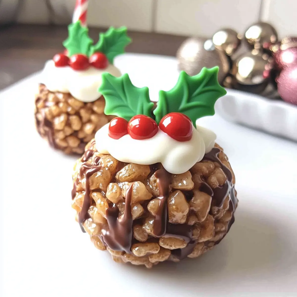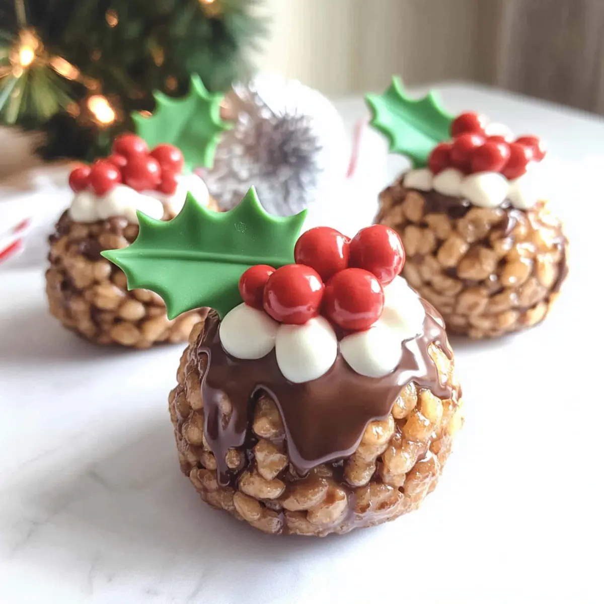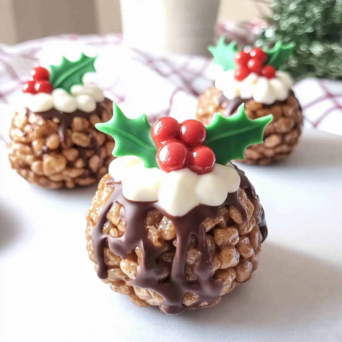 Jump to Recipe Print RecipeAs a child, the holidays sparkled with excitement and deliciousness, especially when it came to crafting sweet treats in the kitchen. Fast forward to today, and I’m just as giddy preparing these delightful Rice Krispie Christmas Puddings. With rich Belgian milk chocolate melting together with fluffy mini marshmallows, this quick and festive recipe turns into an absolute crowd-pleaser that everyone—from toddlers to grandparents—will adore. Not only do they bring cheer to any holiday gathering, but they also make for thoughtful handmade gifts that truly come from the heart. Ready to whip up a batch that’ll have everyone smiling? Let’s dive into making these magical little puddings together! Why are Rice Krispie Christmas Puddings special? Kid-friendly fun: This recipe is perfect for kids, making holiday baking an enjoyable bonding experience. Quick and easy: With simple ingredients and just a few steps, you can whip these up in no time—ideal for those busy festive days. Chocolate delight: Rich Belgian milk chocolate mixed with gooey marshmallows creates an irresistible flavor that chocolate lovers will rave about. Versatile treat: You can personalize these puddings with different cereals or decorations, tailoring them to your taste or dietary needs. Crowd pleaser: Their delightful appearance and taste are sure to impress at any holiday gathering, making them a go-to for parties or gifting. Get ready to create sweet memories with these festive Rice Krispie Christmas Puddings—everyone will want to help out in the kitchen! Rice Krispie Christmas Puddings Ingredients For the Puddings • Milk Chocolate – Provides a rich chocolate flavor and is essential for a creamy base; Hershey’s works wonderfully. • Unsalted Butter – Adds creaminess and binds the ingredients; crucial for preventing the mixture from becoming too dry. • Mini Marshmallows – Key for texture and sweetness; they melt down to create a sticky goodness that holds everything together. • Rice Krispies (or Coco Pops) – These bring that crispy texture you love; feel free to swap with Coco Pops for a delicious chocolate twist. For Decorating • White Chocolate – Used for drizzling over the puddings; make sure to melt it gently to avoid burning. • White Sugarpaste (or Pre-colored Sugarpaste) – Great for shaping festive decorations like holly; choose pre-colored for an easier experience. • Red & Green Food Colour Gel – Perfect for tinting your sugarpaste; using pre-colored sugarpaste can save you time and effort. Get ready to enjoy making these delightful Rice Krispie Christmas Puddings—every bite is truly magical! Step‑by‑Step Instructions for Rice Krispie Christmas Puddings Step 1: Melt the Chocolate and Butter Begin by gently melting 200g of milk chocolate and 50g of unsalted butter in a medium saucepan over low heat. Stir frequently until the mixture is creamy and fully combined, approximately 5 minutes. Alternatively, you can melt these ingredients in the microwave in 30-second bursts, stirring in between, ensuring it doesn’t overheat. Step 2: Incorporate the Marshmallows Once the chocolate and butter are smoothly melted, add 100g of mini marshmallows to the saucepan. Stir continuously for about 2-3 minutes until the marshmallows are fully melted and the mixture turns glossy. This gooey combination is the base for your Rice Krispie Christmas Puddings. Step 3: Combine with Rice Krispies Pour the melted chocolate-marshmallow mixture over 200g of Rice Krispies in a large mixing bowl. Use a spatula to gently fold the ingredients together until all the Rice Krispies are evenly coated, making sure to avoid crushing them. Let this mixture cool for about 10 minutes at room temperature, allowing it to thicken slightly. Step 4: Form the Puddings Dampen your hands with a little water to prevent sticking, then scoop tablespoon-sized amounts of the mixture and roll them into balls. Place these balls on a lined baking tray, ensuring they are spaced apart. This step is crucial for forming your delightful Rice Krispie Christmas Puddings just right. Step 5: Chill to Set Transfer the baking tray with the pudding balls to the refrigerator and chill for 30 minutes. This cooling step will help the puddings firm up nicely, ensuring they hold their shape when you decorate them. You’ll know they are ready when they feel firm to the touch. Step 6: Melt White Chocolate for Drizzling While your puddings are chilling, melt about 100g of white chocolate using the same low-heat method in a saucepan or in the microwave. Once melted and smooth, transfer the chocolate into a piping bag or a small plastic bag with the corner snipped off. This will make it easy to drizzle over your puddings. Step 7: Decorate with Chocolate and Sugarpaste After the puddings have set, take them out of the fridge. Drizzle the melted white chocolate over the top of each pudding, creating a festive pattern. Then, use colored sugarpaste to shape small holly leaves and berries to adorn your Rice Krispie Christmas Puddings, adding a beautiful holiday touch. Expert Tips for Rice Krispie Christmas Puddings Melt Gently: Make sure to melt the chocolate and butter over low heat; high temperatures can lead to burnt chocolate and hard pudding. Dampen Your Hands: When rolling the pudding balls, dampen your hands to prevent the mixture from sticking; this little trick can save you a lot of frustration! Cool Before Shaping: Allow the chocolate-marshmallow mixture to cool slightly before shaping it into balls. If too warm, it may be difficult to manage. Storage Smartly: Store your decorated Rice Krispie Christmas Puddings in an airtight container; they’ll stay fresh for up to 5 days at room temperature. Experiment with Flavors: Feel free to try different types of chocolate or cereals for exciting twists—dark chocolate or flavored cereals like Coco Pops can add extra charm! Keep It Simple: If pressed for time, consider using