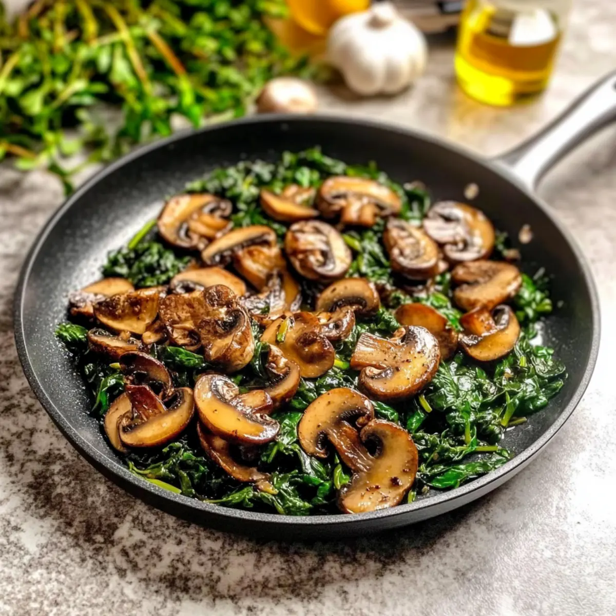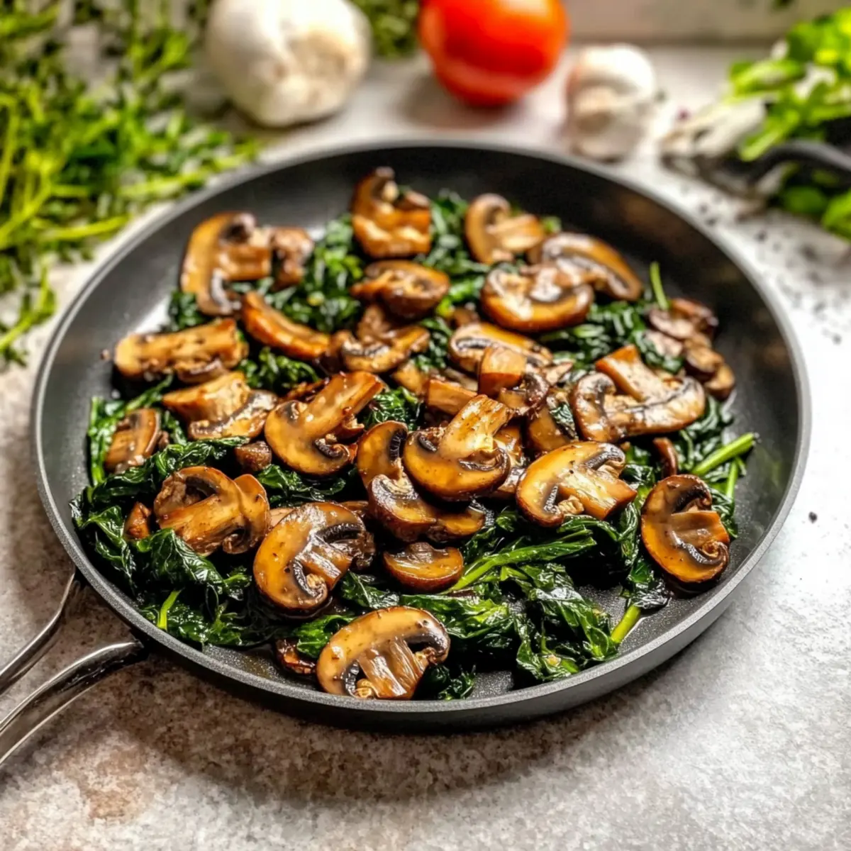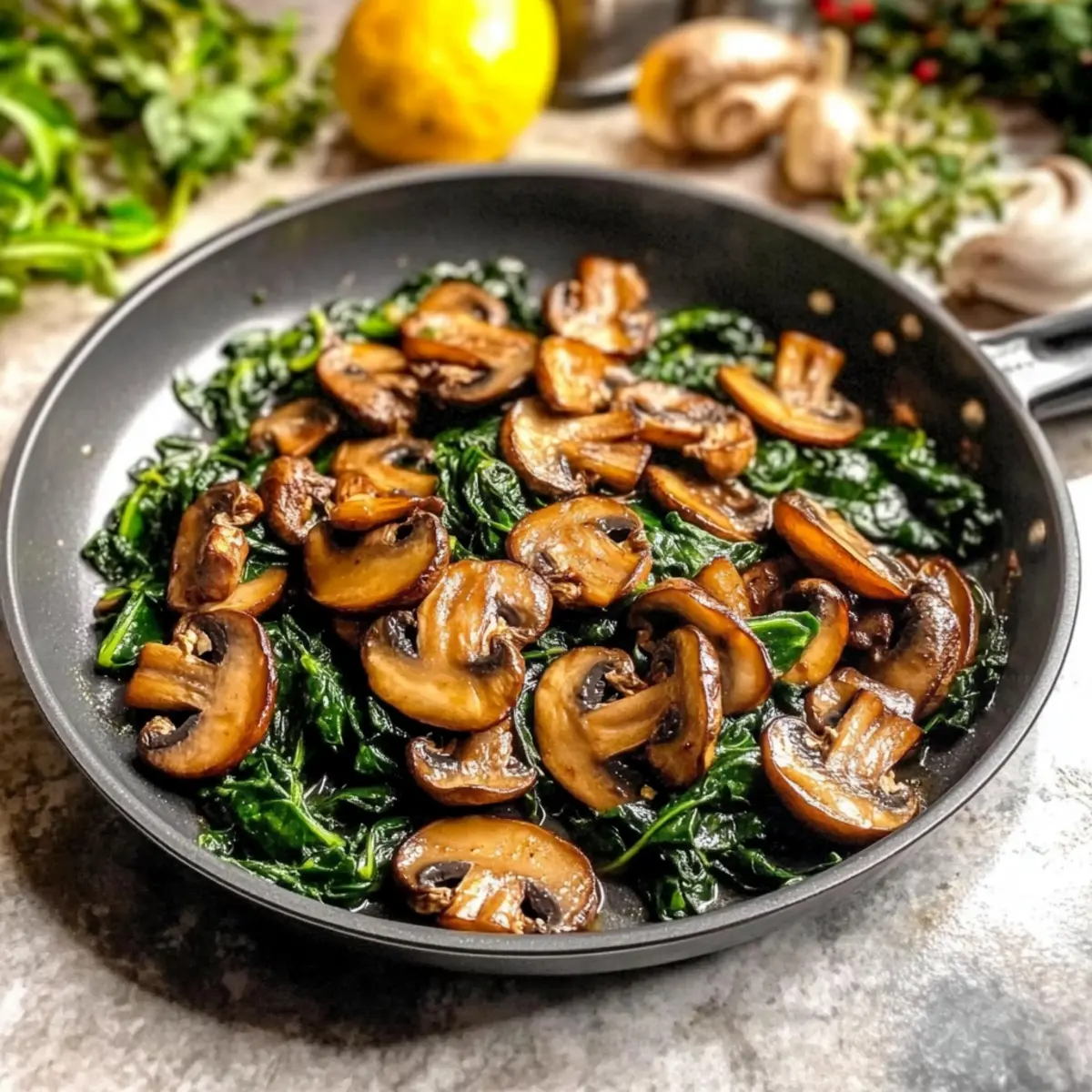 Jump to Recipe Print RecipeAs I stood in my kitchen, the aroma of sizzling garlic filled the air, instantly transporting me to a cozy Mediterranean bistro. The simplicity of sautéed mushrooms with spinach has always been a captivating choice in my cooking repertoire. It’s not just a delightful treat for the taste buds—it’s a vibrant, nutritious side dish ready in under 30 minutes! This recipe showcases the earthy richness of caramelized mushrooms paired with the bright, tender greens of fresh spinach, making it a fantastic healthy option for any meal. Whether you’re seeking a quick weeknight side or a colorful topping for your favorite grains, this dish offers unparalleled versatility and a comforting hug of flavor. Have you ever considered how this simple combination could elevate your dining experience? Let’s dive in! Why Are Sautéed Mushrooms So Irresistible? Quick to Prepare: This dish comes together in under 30 minutes, making it perfect for busy weeknights. Flavor Explosion: The caramelized mushrooms capture savory goodness that complements the tender spinach beautifully. Nutrient-Packed: Loaded with vitamins and minerals, it’s a healthy boost for any meal! Endless Variations: Feel free to add grilled chicken, tofu, or even a pinch of chili for a personal touch—it’s versatile! Don’t forget to check out our Korean Ramen with Grilled Beef for more flavorful ideas! Crowd-Pleaser: Whether as a side or a topping, it’s a guaranteed hit—perfect for sharing at dinner parties or with the family! Sautéed Mushrooms with Spinach Ingredients • Let’s gather what we need for this vibrant dish! For the Sauté Mushrooms – The main ingredient, providing deep, savory flavor; consider using cremini or button mushrooms. Spinach – Fresh and nutritious, adding vibrant color and slight bitterness; you can substitute with kale if needed. Olive Oil – Essential for cooking; enhances flavor and helps achieve that beautiful caramelization. For Aromatics Garlic – Freshly minced for aromatic depth; avoid using pre-minced garlic to prevent bitterness. Lemon Juice – Brightens the dish, balancing the richness of sautéed mushrooms; white wine vinegar works as a substitute. For Seasoning Salt – Enhances all the flavors and brings out the natural sweetness in the mushrooms. Pepper – Adds a gentle spice and complements the earthy tones of the dish. With these ingredients in hand, you’re all set to create a comforting and healthy side dish of sautéed mushrooms with spinach! Step‑by‑Step Instructions for Sautéed Mushrooms with Spinach Step 1: Prepare Your Ingredients Start by washing and gently drying 8 ounces of mushrooms, such as cremini or button. Slice them into even pieces to ensure even cooking. Next, clean about 4 cups of fresh spinach, removing any tough stems. Mince 2-3 cloves of garlic, and juice half a lemon to be ready for seasoning as you cook your sautéed mushrooms with spinach. Step 2: Heat the Skillet In a large skillet, pour in 2 tablespoons of olive oil and heat it over medium heat. Allow the oil to shimmer, which usually takes about 2 minutes, indicating it’s the right temperature to add ingredients. A well-heated pan promotes caramelization, creating that delicious golden brown crust on your sautéed mushrooms. Step 3: Sauté the Mushrooms Carefully add the sliced mushrooms in a single layer into the hot skillet. Let them cook undisturbed for 3-4 minutes, allowing them to caramelize beautifully. You’ll notice them begin to brown, which enhances their earthy flavor. Avoid stirring too soon to achieve maximum caramelization for your sautéed mushrooms with spinach. Step 4: Stir and Continue Cooking After the initial browning, stir the mushrooms occasionally for another 5-7 minutes. Watch for them to turn a deep brown color and release their moisture. This step will maximize the flavor and achieve a tender texture in your sautéed mushrooms. Once they look perfectly golden, it’s time to introduce the garlic. Step 5: Add Garlic for Flavor Sprinkle the minced garlic into the skillet with the sautéed mushrooms. Sauté for 1-2 minutes, stirring constantly to prevent the garlic from burning, as it can turn bitter. The kitchen will fill with an irresistible aroma, signaling that it’s almost time to incorporate the spinach into your dish. Step 6: Incorporate Spinach Slowly add the cleaned spinach to the skillet, using tongs to gently toss it with the mushrooms and garlic. Cook for about 2-3 minutes until the spinach wilts down and brightens up, melding beautifully with the sautéed mushrooms. This step adds vibrant color and vital nutrients, making your dish even more enticing. Step 7: Season and Finish Once the spinach is wilted, season your sautéed mushrooms with spinach generously with salt and pepper. Drizzle in the freshly squeezed lemon juice to brighten the flavors. Toss everything together for a minute, ensuring the seasonings are evenly distributed. With a burst of flavor and color, your dish is now complete and ready to serve! Storage Tips for Sautéed Mushrooms with Spinach Fridge: Store leftover sautéed mushrooms with spinach in an airtight container for up to 2-3 days. This keeps the flavors fresh and the vegetables crisp. Freezer: If you want to save them longer, freeze in a resealable bag for up to 2 months. Make sure to cool completely before freezing to maintain texture. Reheating: When ready to enjoy again, gently reheat in a skillet over medium heat until warmed through, adding a splash of olive oil to revive flavors. Room Temperature: Avoid leaving sautéed mushrooms with spinach at room temperature for more than 2 hours, as this could risk food safety. What to Serve with Sautéed Mushrooms with Spinach Pairing this vibrant dish with the right accompaniments can take your dining experience to new heights. Creamy Mashed Potatoes: The richness of creamy mashed potatoes provides a comforting contrast to the earthy flavors of the sa